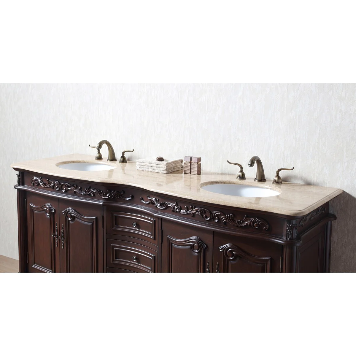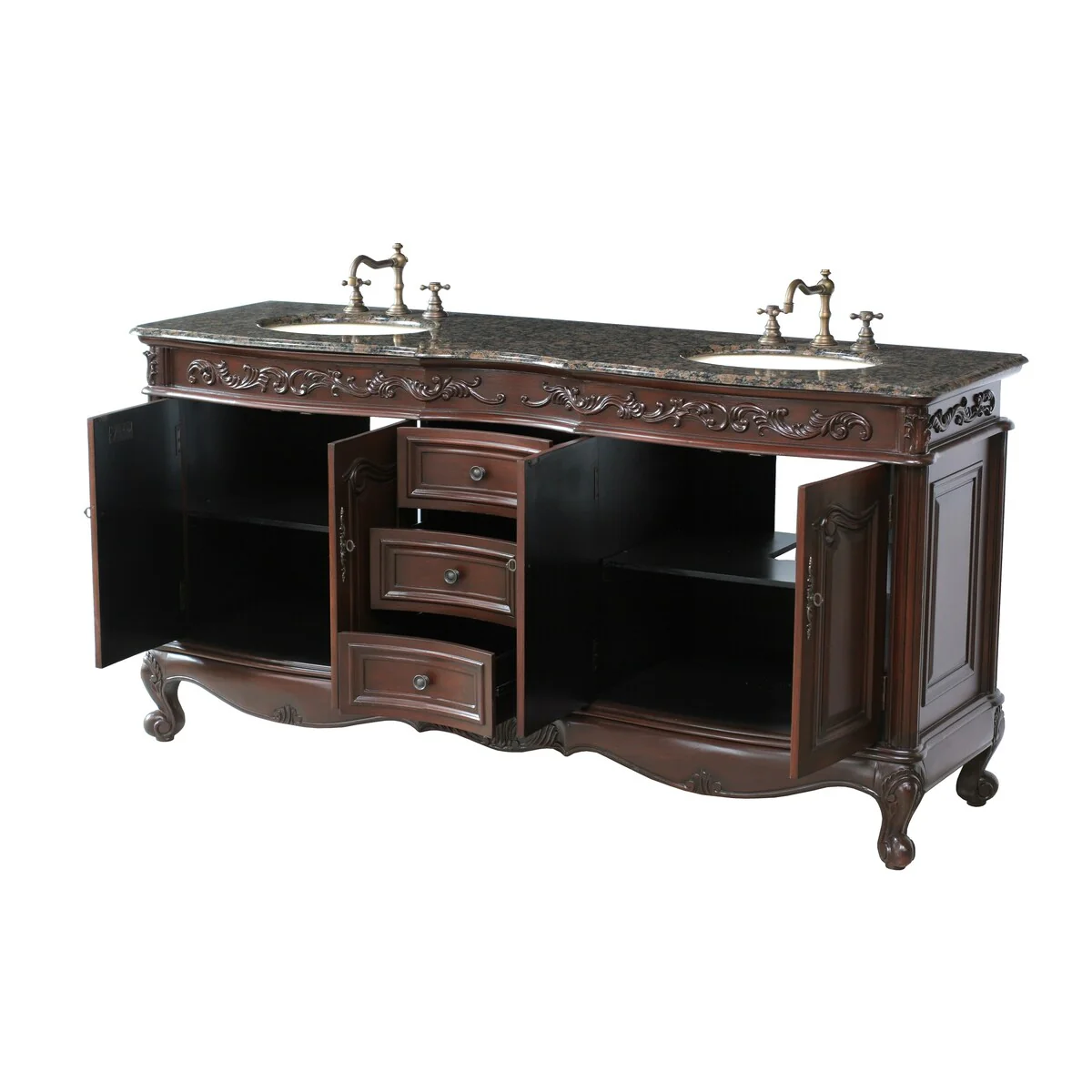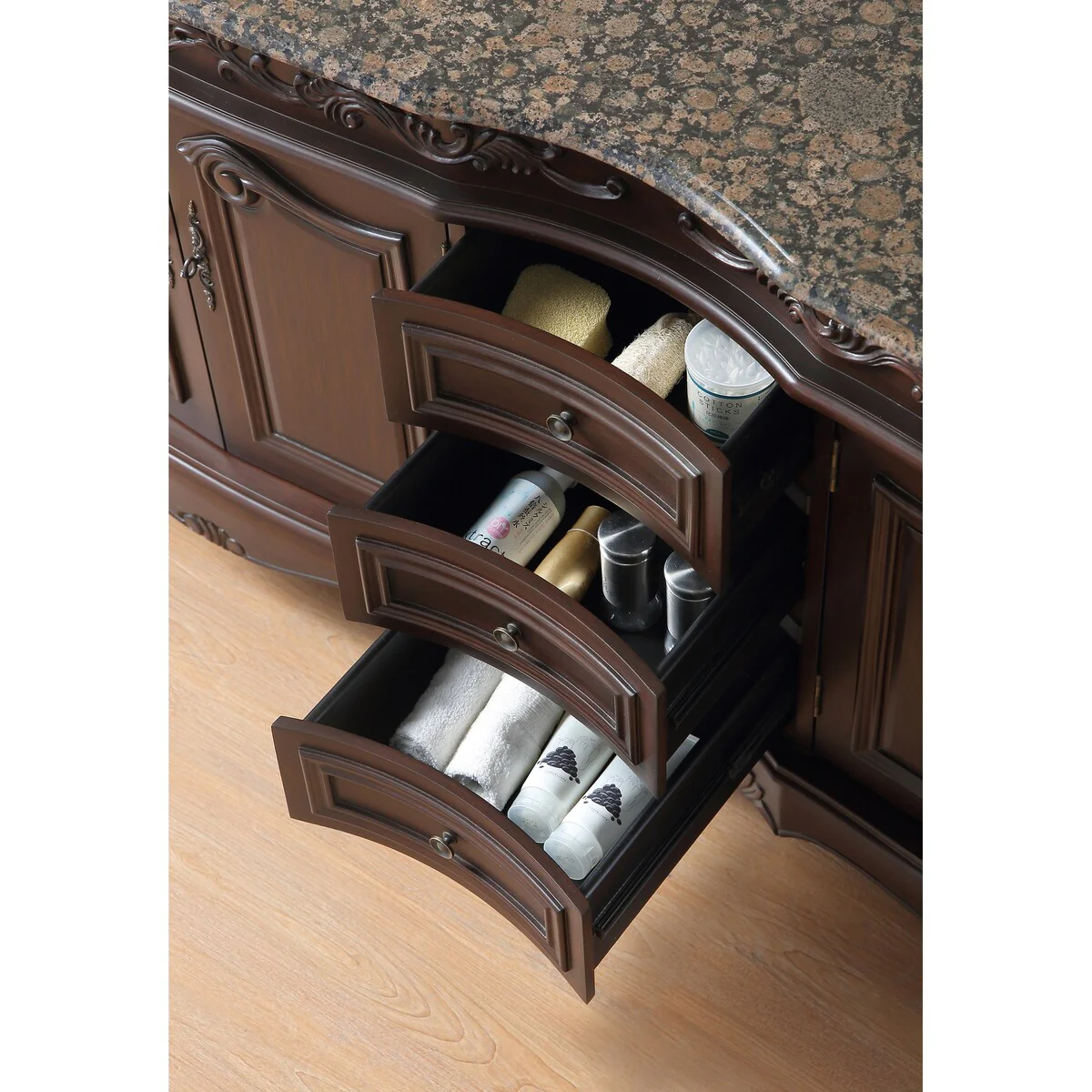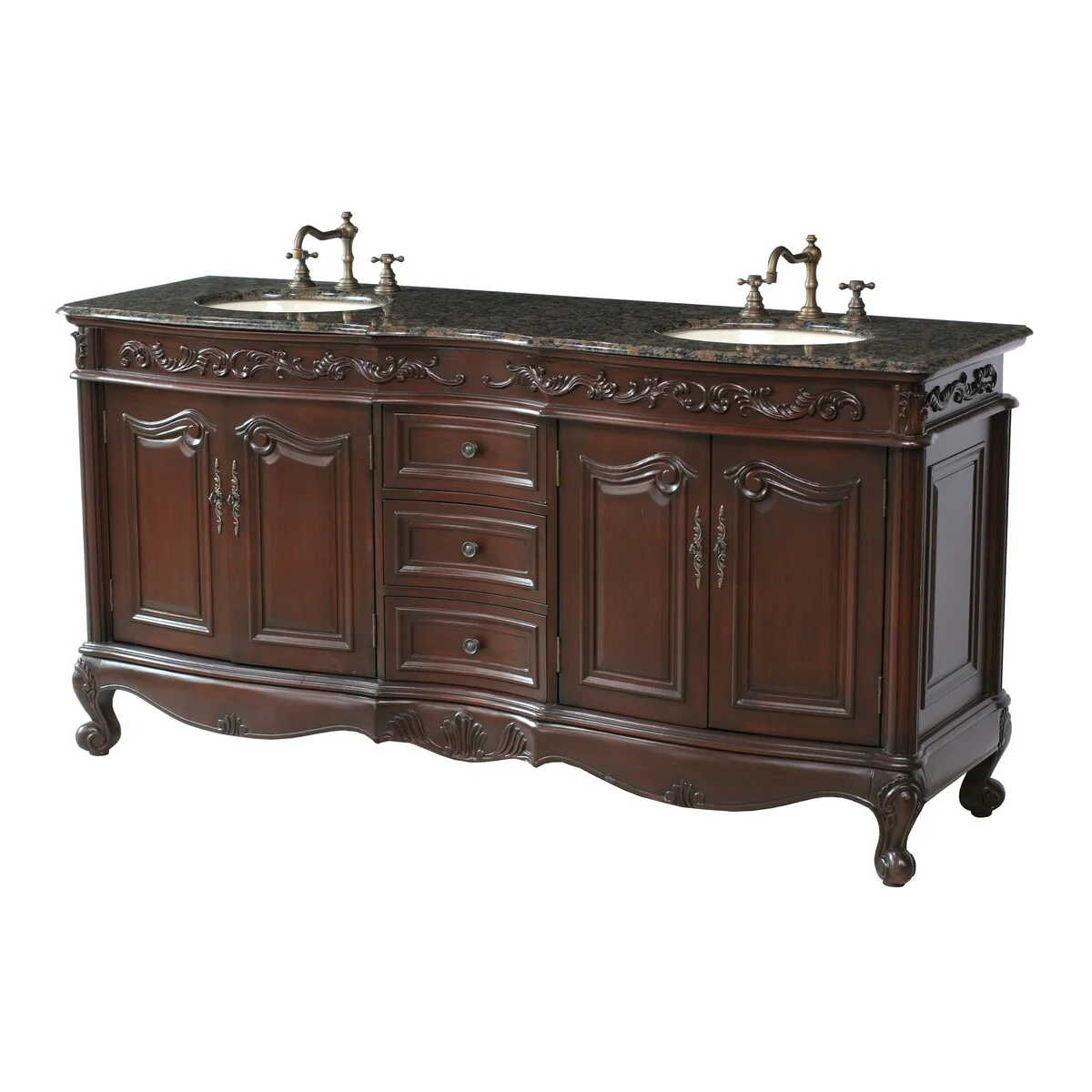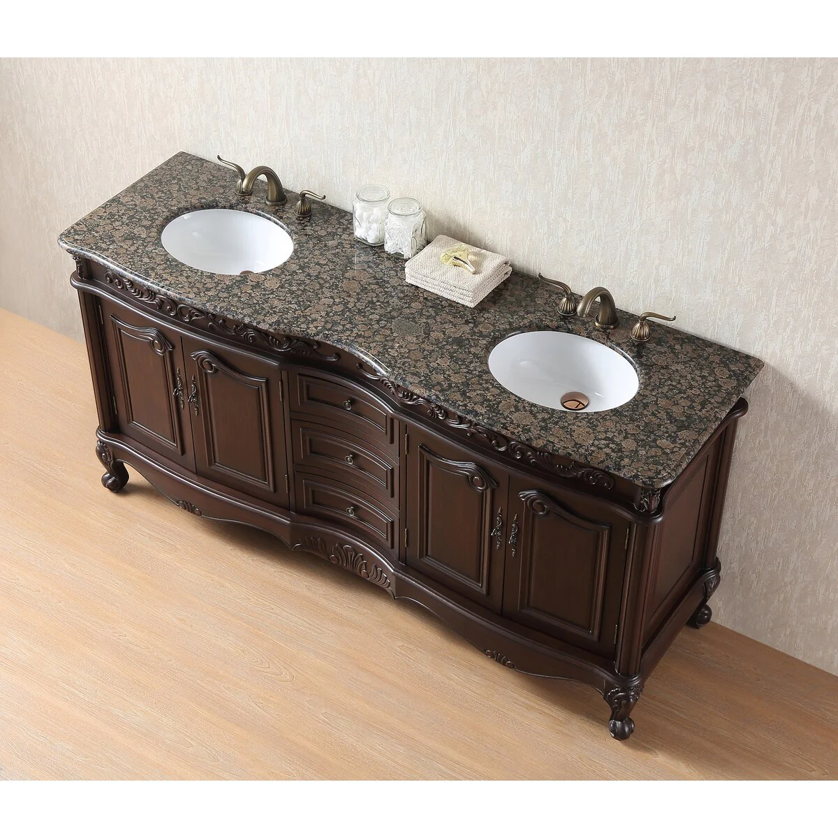 Upgrade your bathroom's style and function with the luxurious Cassandra Bathroom Vanity. This premium 72-inch double sink vanity boasts a stunning Dark Cherry finish and a spacious countertop that adds elegance to any bathroom. With pull-out drawers and cabinets, this all-in-one vanity provides ample storage space for all your essentials. Choose from Baltic Brown Granite or Travertine Marble countertop surface options to suit your unique style. Expertly crafted with heavy-duty MDF, this vanity is designed to withstand the rigors of everyday use. Faucets, drains, and backsplash not included.