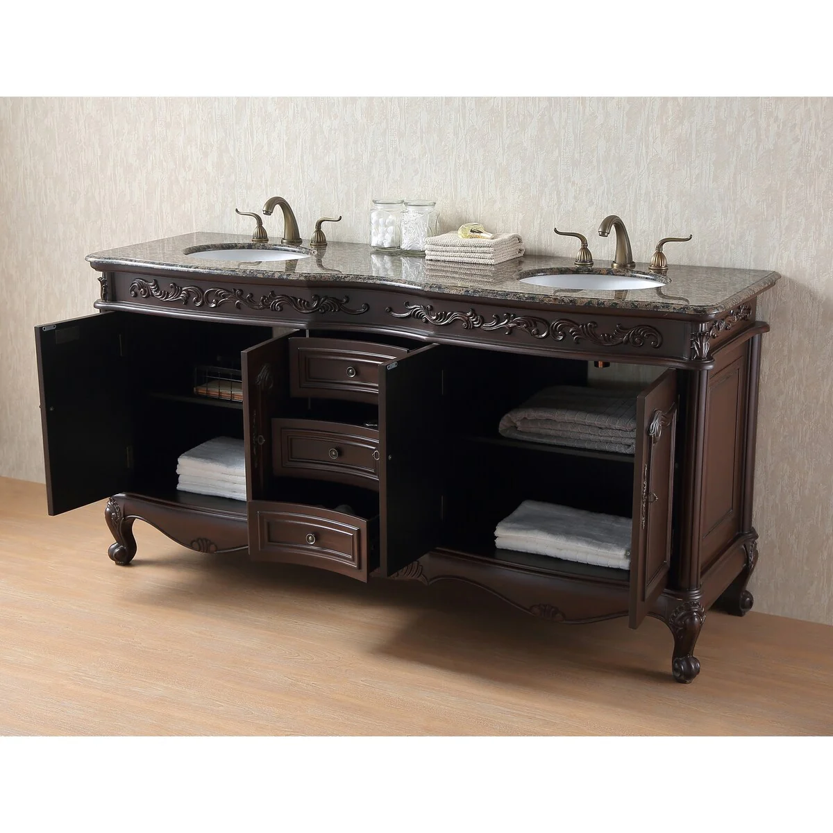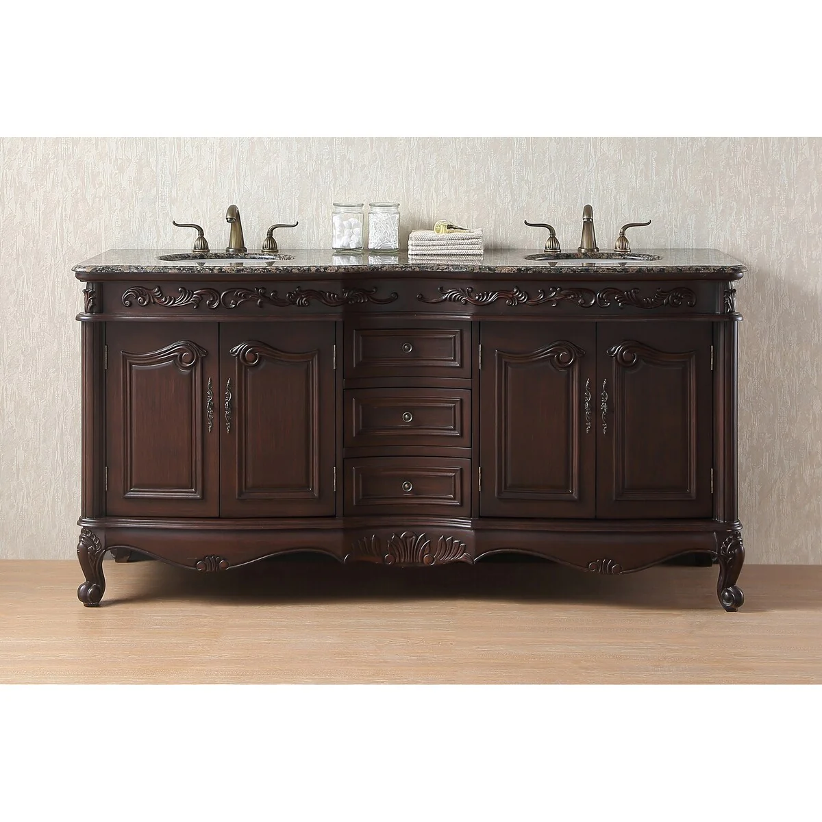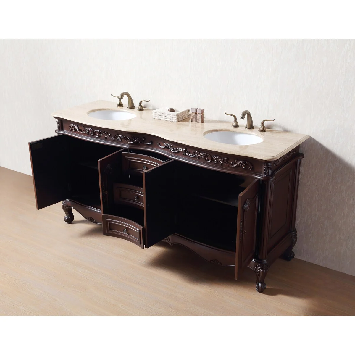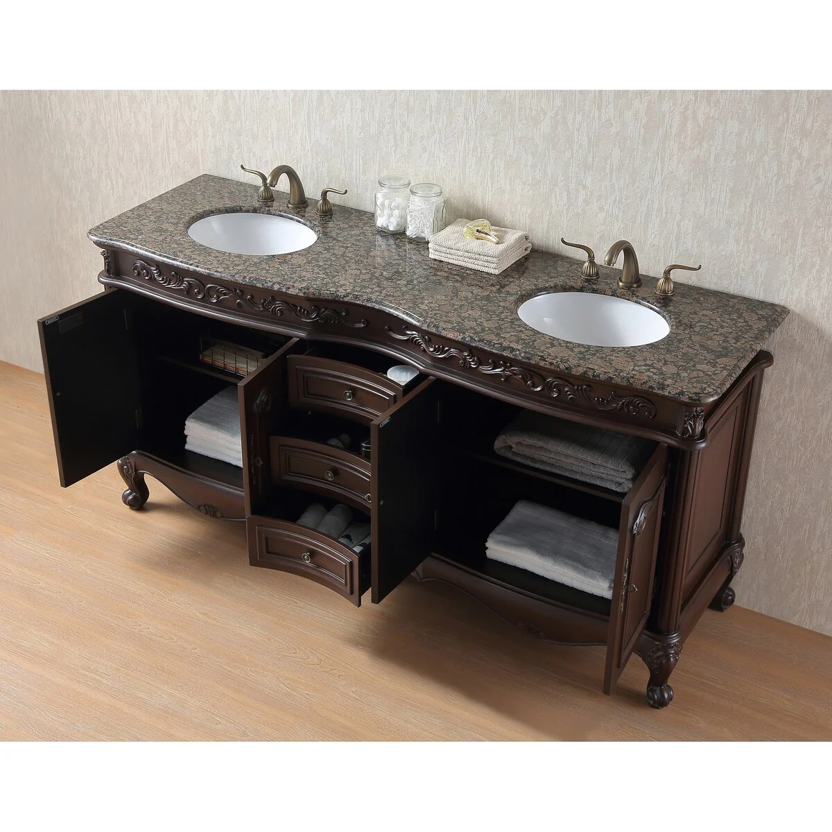 Upgrade your bathroom's style and function with the luxurious Cassandra Bathroom Vanity. This premium 72-inch double sink vanity boasts a stunning Dark Cherry finish and a spacious countertop that adds elegance to any bathroom. With pull-out drawers and cabinets, this all-in-one vanity provides ample storage space for all your essentials. Choose from Baltic Brown Granite or Travertine Marble countertop surface options to suit your unique style. Expertly crafted with heavy-duty MDF, this vanity is designed to withstand the rigors of everyday use. Faucets, drains, and backsplash not included.