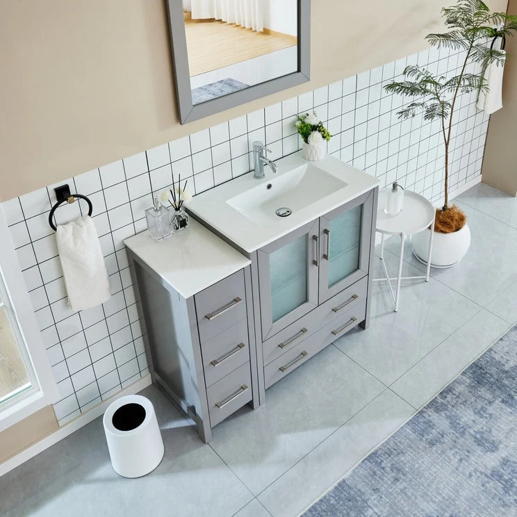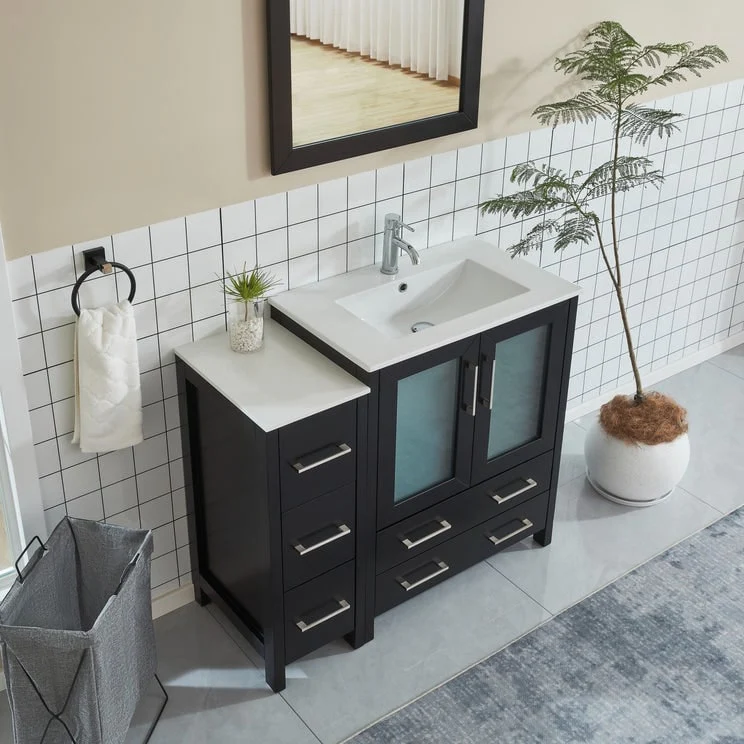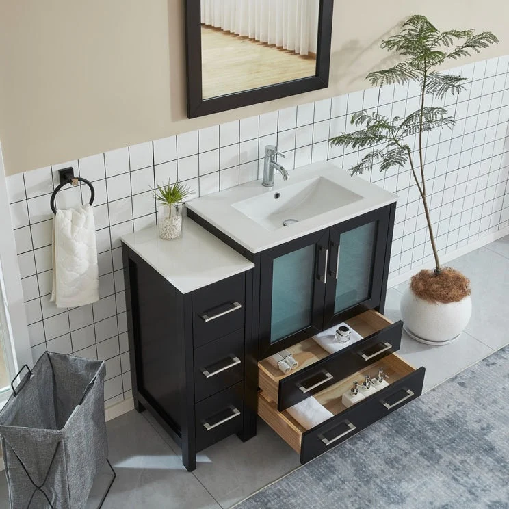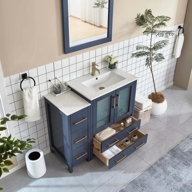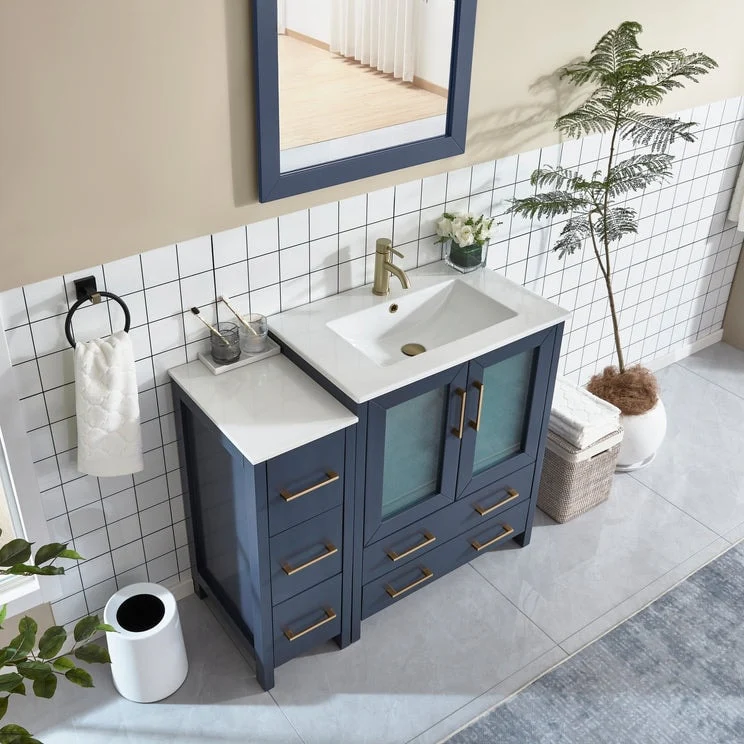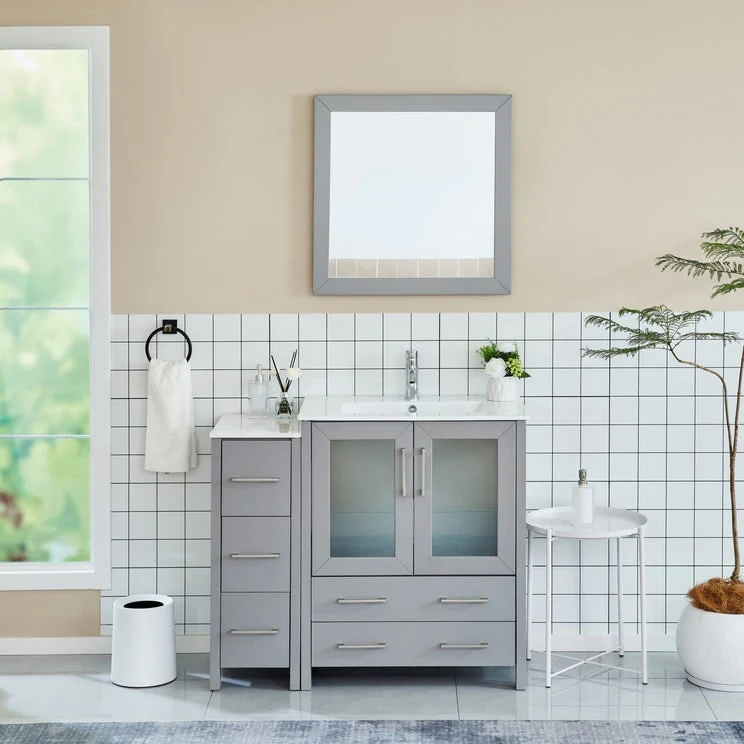 Vanity Art presents a premium Bathroom Vanity Cabinet, a must-have addition for any homeowner looking to combine functionality and style in their bathroom space. Crafted with precision, our cabinet vanity for bathroom is constructed using moisture-proof solid + manufactured wood, ensuring durability and sturdiness that will withstand the test of time. The ceramic top surface not only adds an elegant touch but also provides a reliable and easy-to-clean surface, making it perfect for daily use. Included with each cabinet is a matching wall mirror, featuring a sleek square design that complements the vanity bathroom cabinet's color, adding a cohesive and sophisticated look to your bathroom. With ample storage space, the bathroom cabinet with sink offers a convenient shelf on top of dovetail drawers and customizable options for additional drawer units. Experience the convenience of soft-closing double doors, thanks to the metal hinges, and enjoy the smooth gliding of drawers with the metal griddle and handles. These details enhance usability and add a touch of luxury and elegance to your bathroom decor.