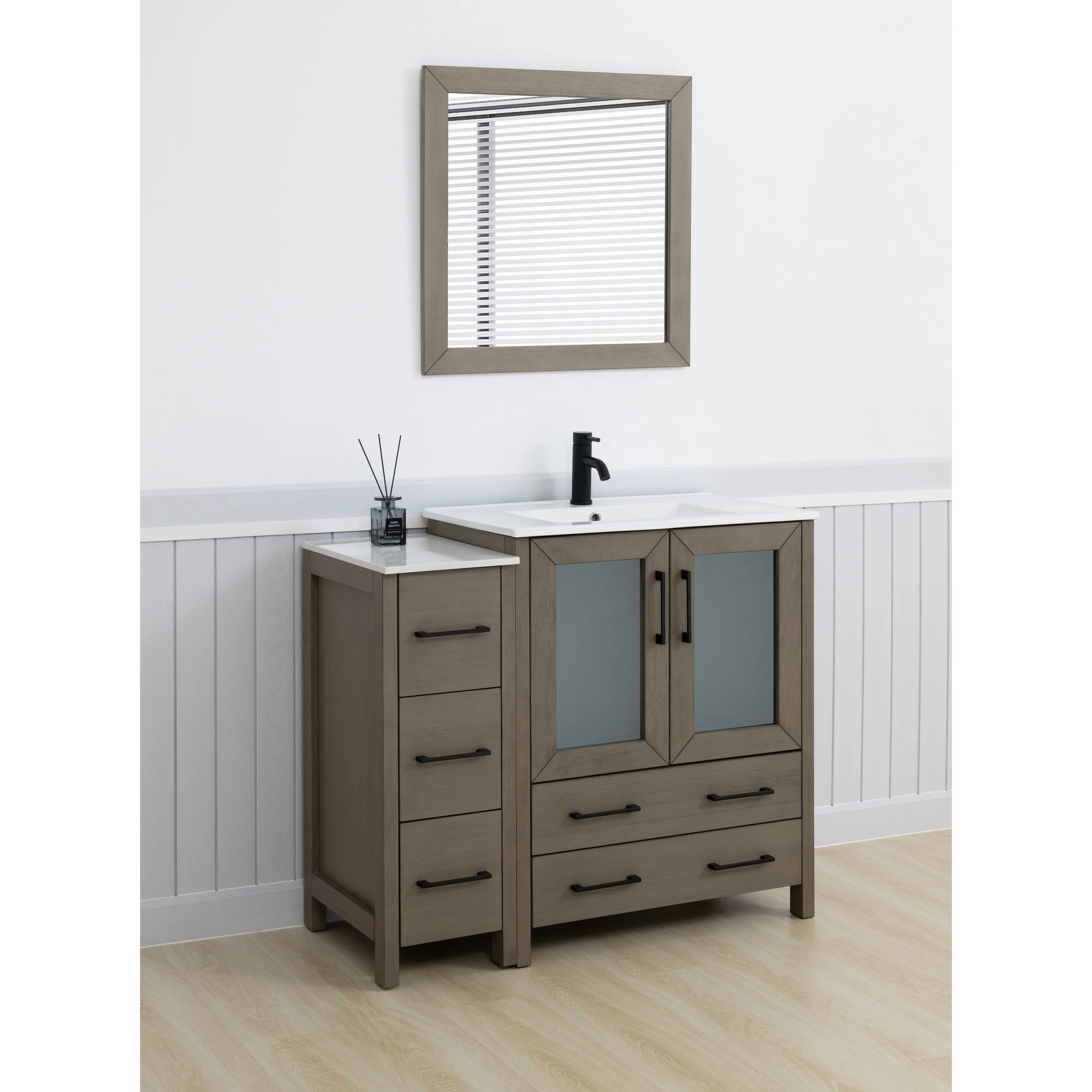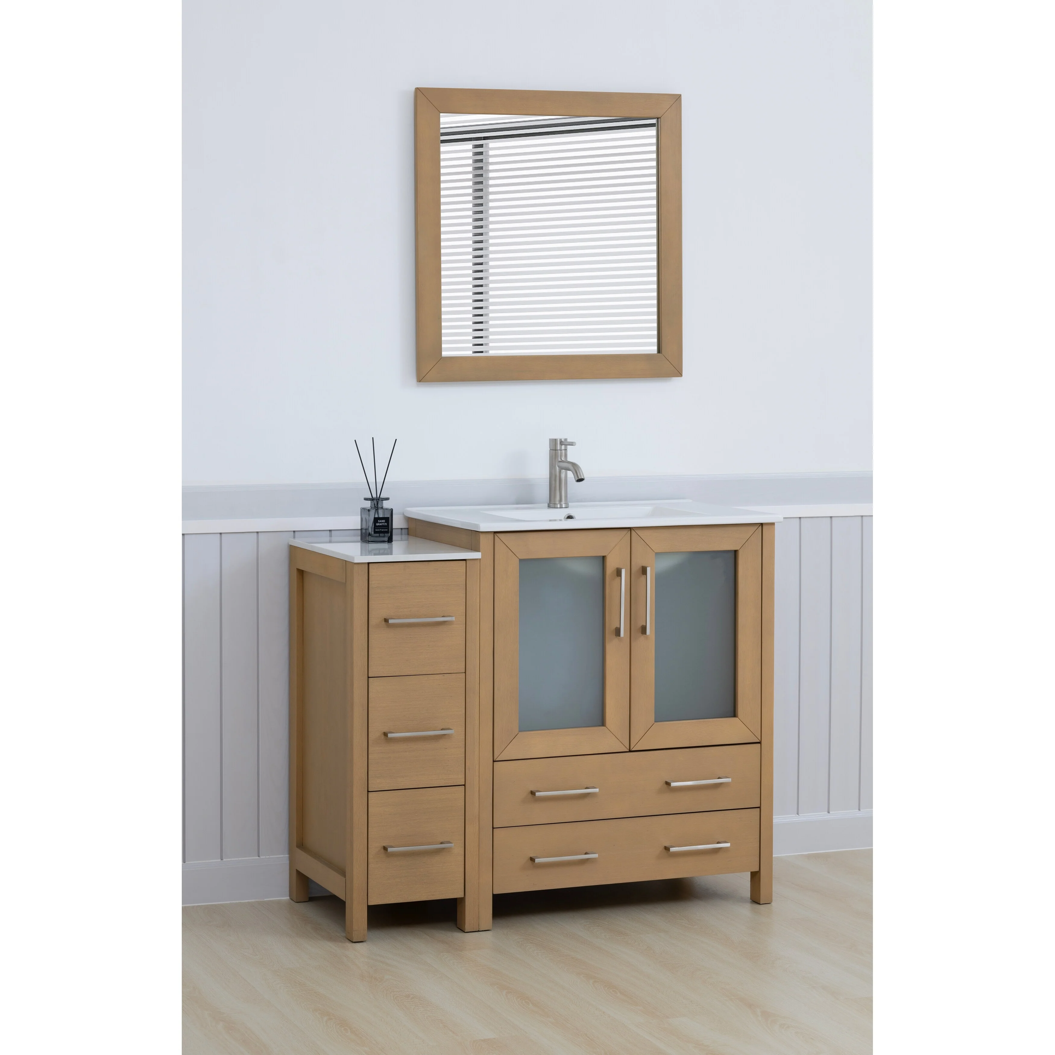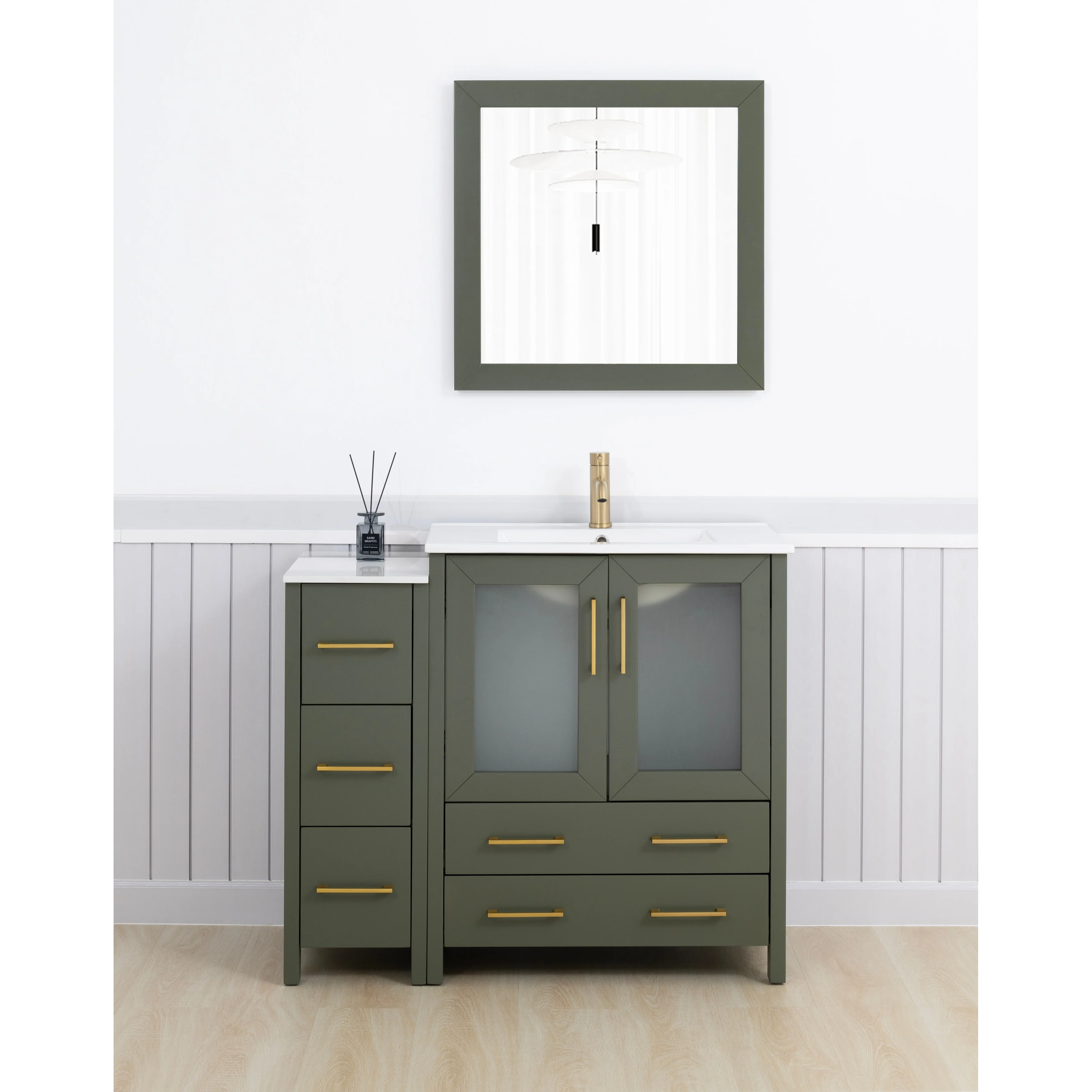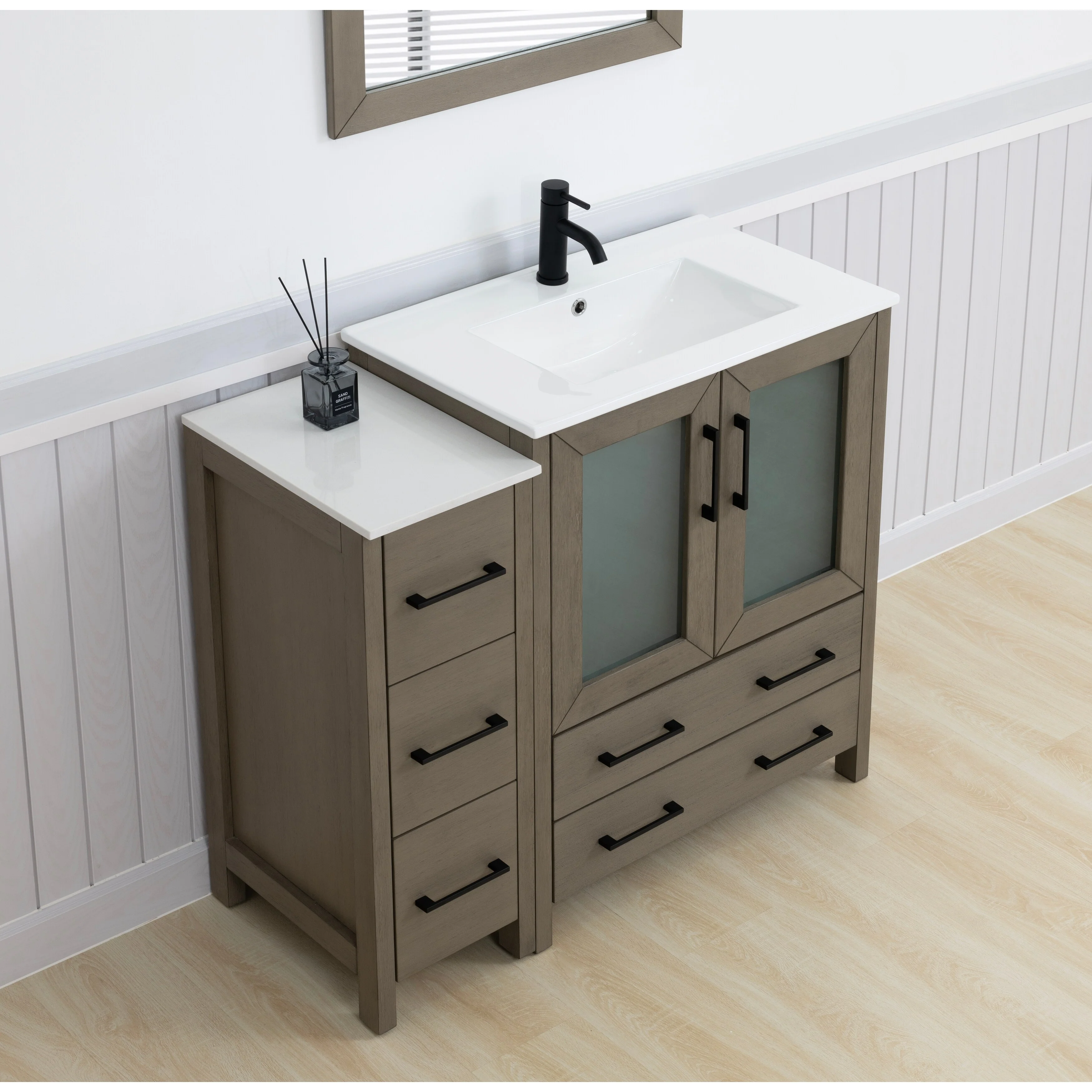 - Vanity Color: Espresso, Grey, White, Blue, Vintage Green, Natural Oak, Driftwood Gray