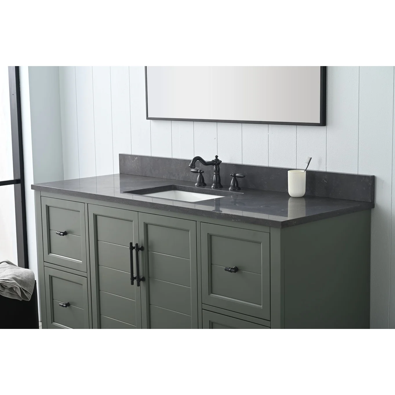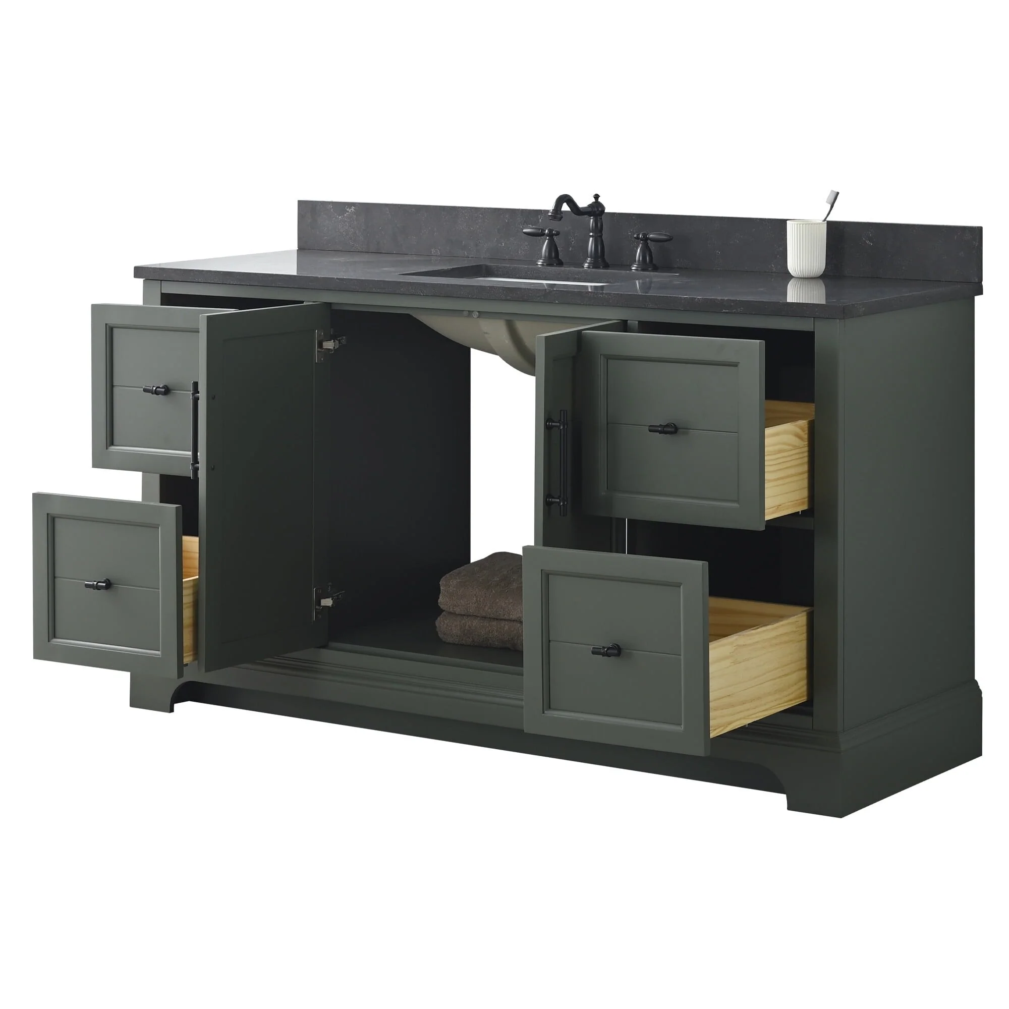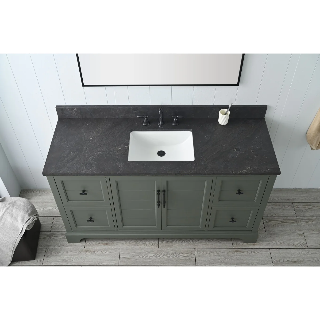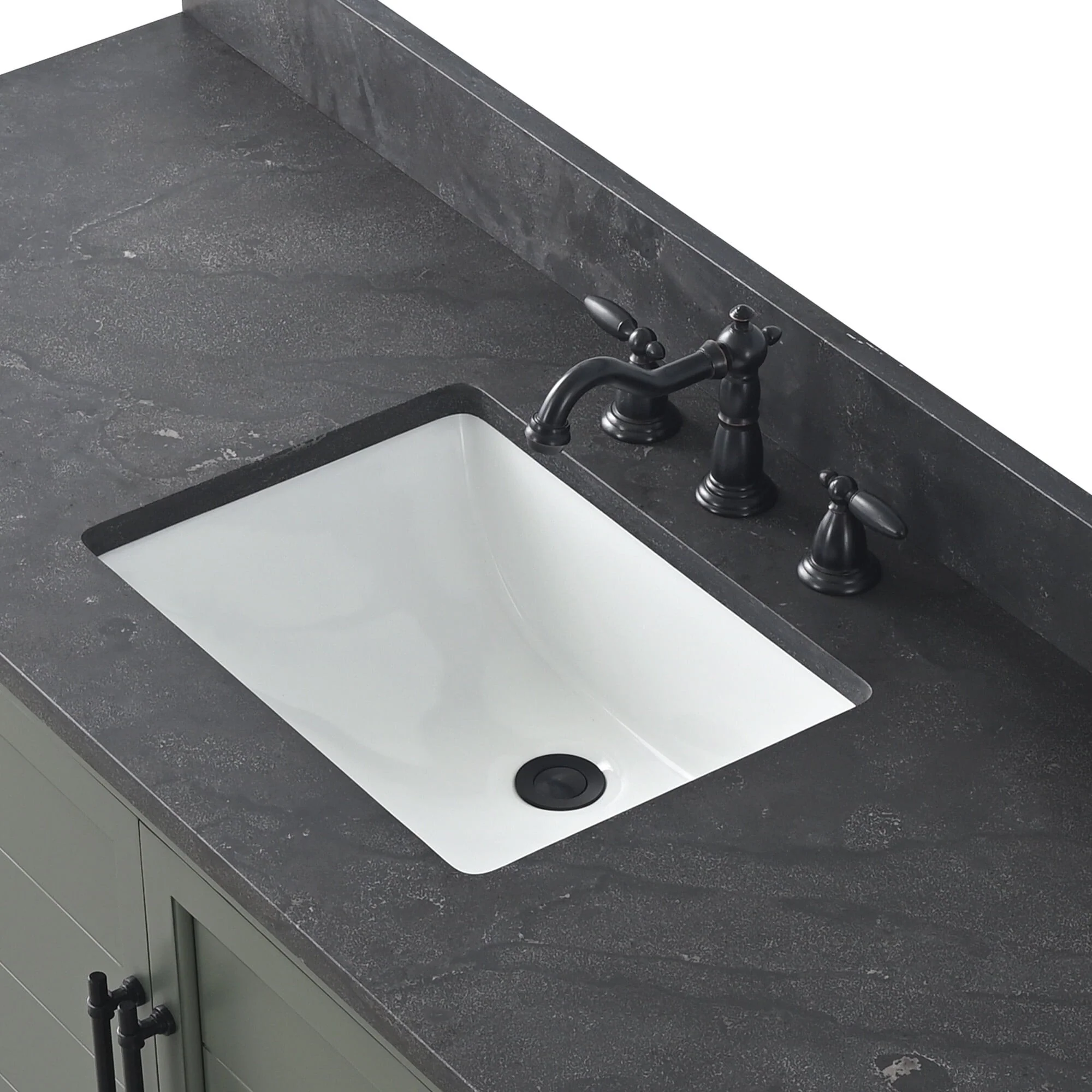 The classic clean lines and elegant styling of the 60-inch 3-hole bathroom vanity will infuse your bathroom with a calming, light, and airy feel. Designed to enhance a standard-size bathroom with a strong contemporary look with big character in a compact size. Beneath a lustrous and durable stone countertop is a beautifully integrated rectangular ceramic sink. Equipped with soft-closing cabinet doors and dovetailed drawers with gleaming black finished hardware, and silver-grey, white, and vintage green vanity finish with a lacquer coating for extra flair and stability.