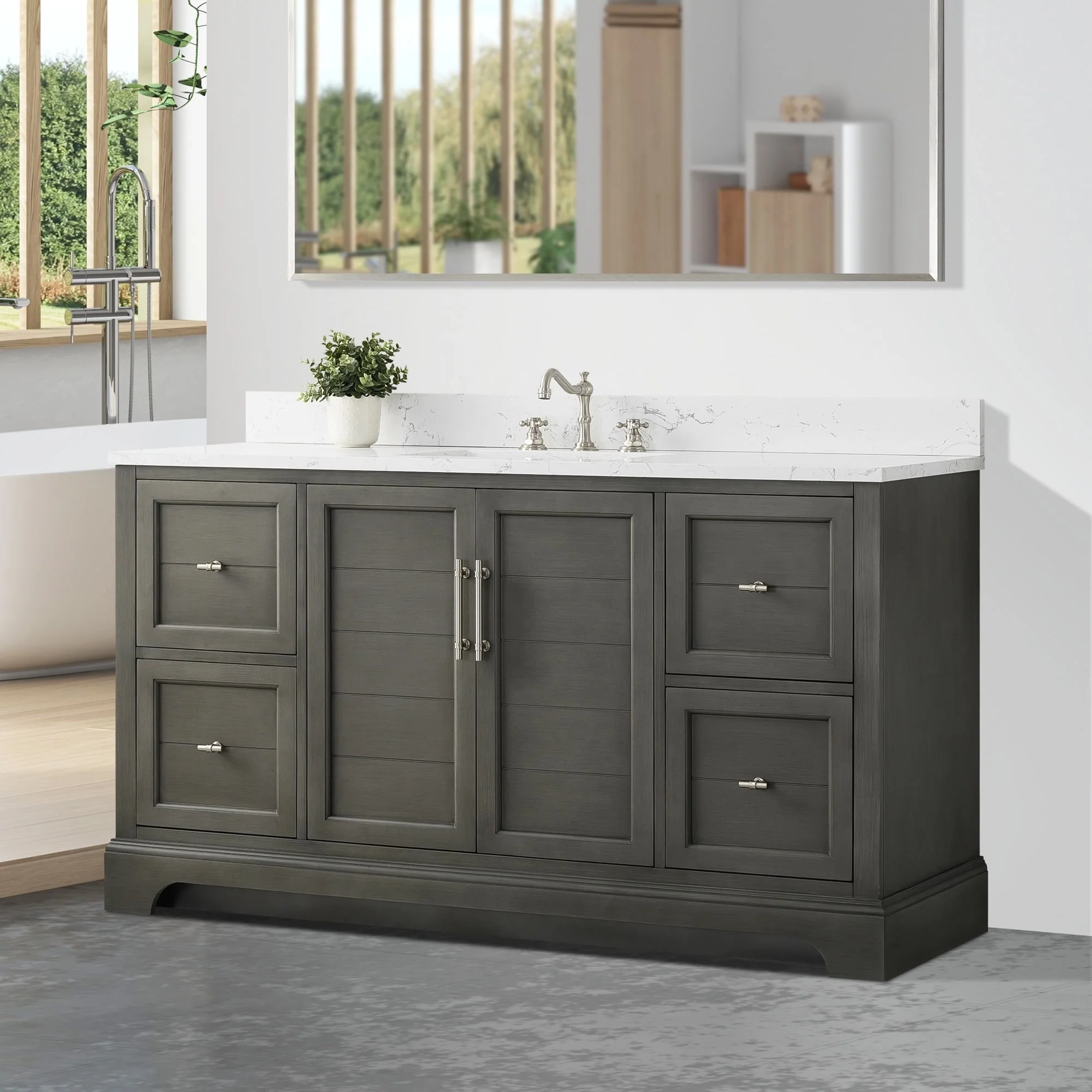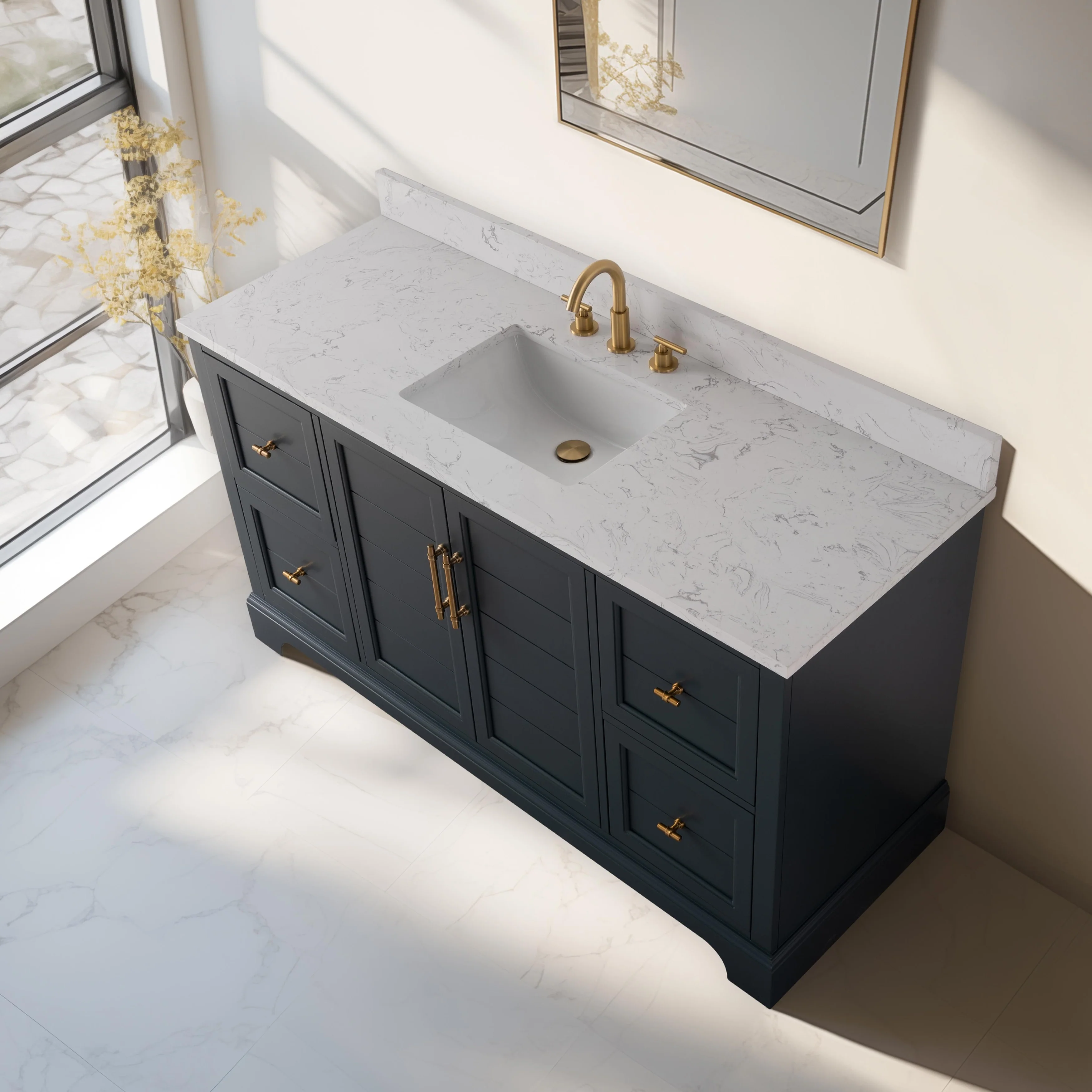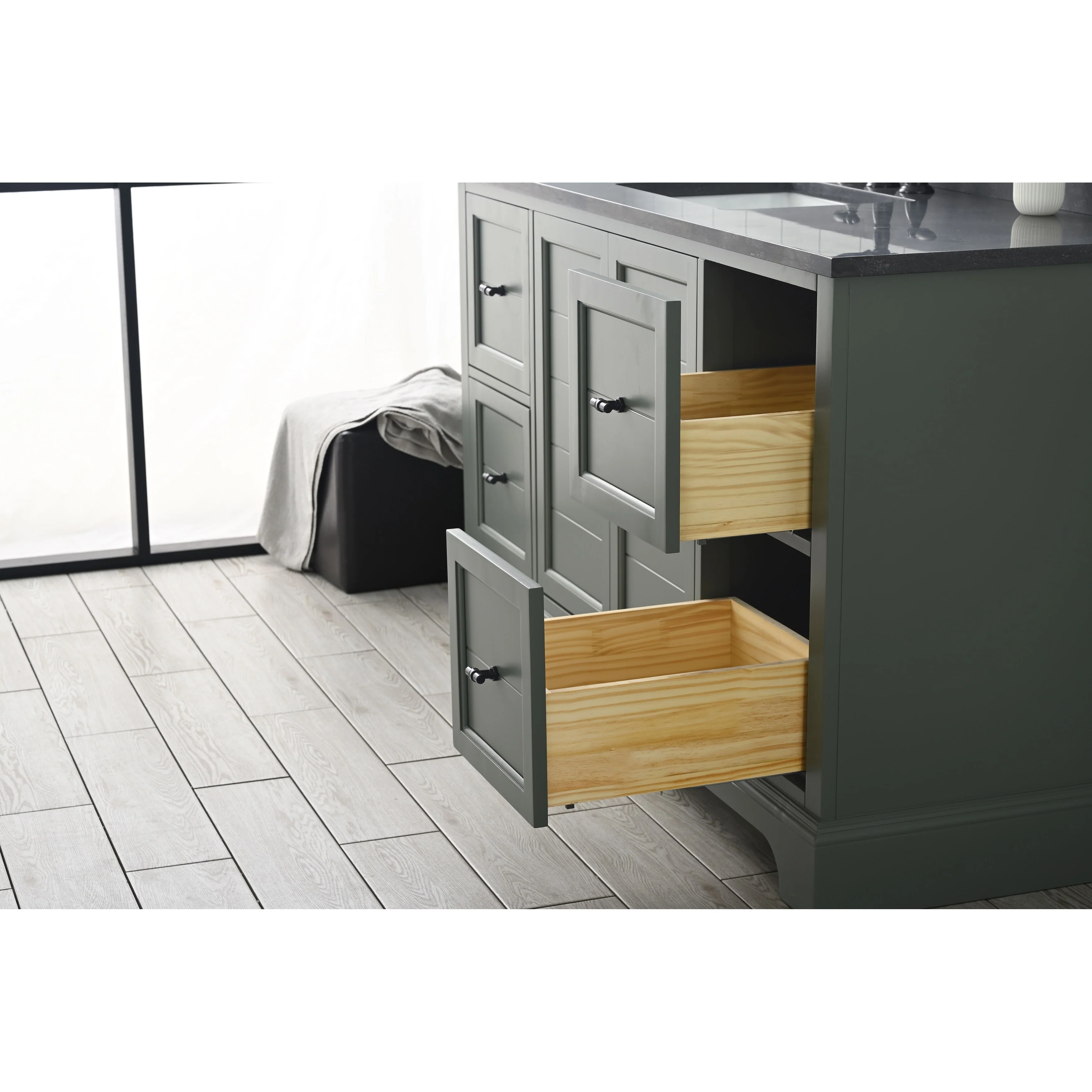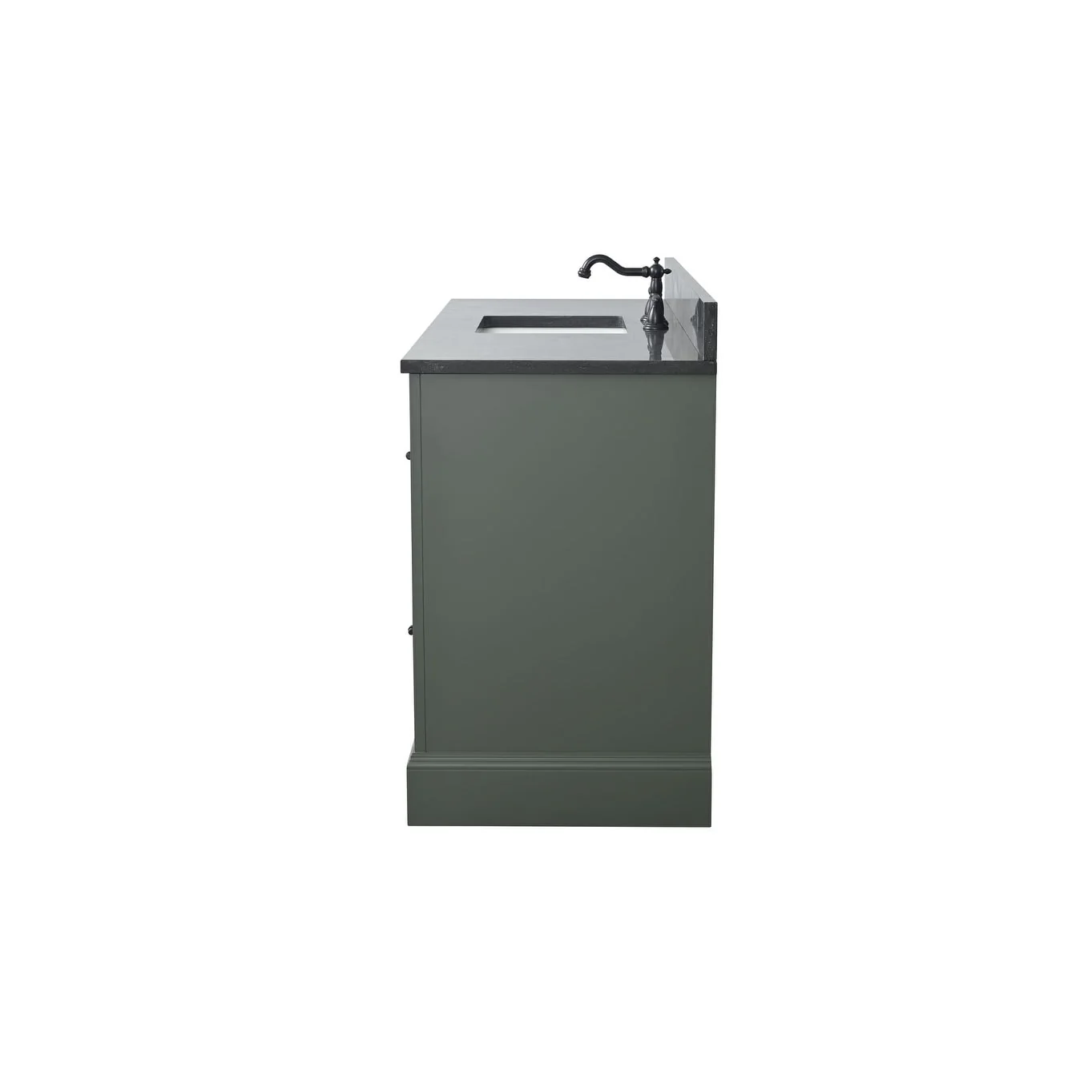 The classic clean lines and elegant styling of the 60-inch 3-hole bathroom vanity will infuse your bathroom with a calming, light, and airy feel. Designed to enhance a standard-size bathroom with a strong contemporary look with big character in a compact size. Beneath a lustrous and durable stone countertop is a beautifully integrated rectangular ceramic sink. Equipped with soft-closing cabinet doors and dovetailed drawers with gleaming black finished hardware, and silver-grey, white, and vintage green vanity finish with a lacquer coating for extra flair and stability.