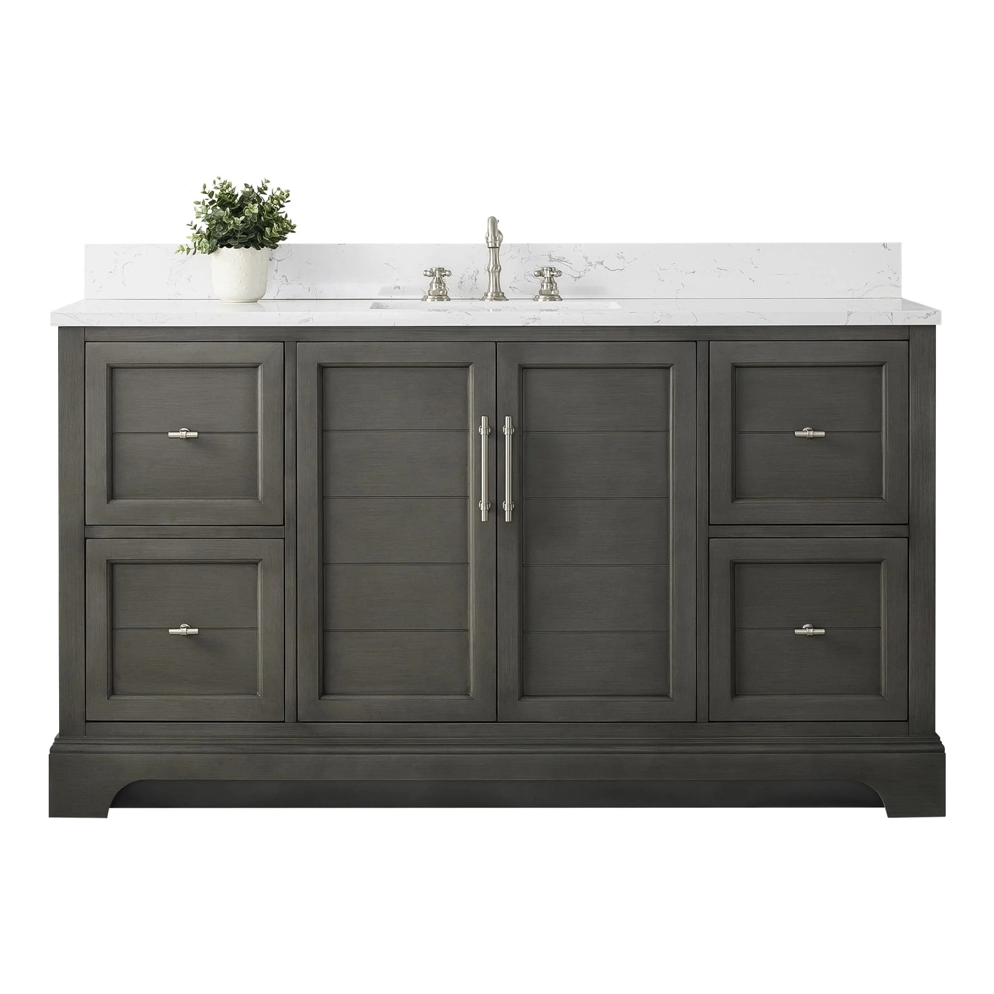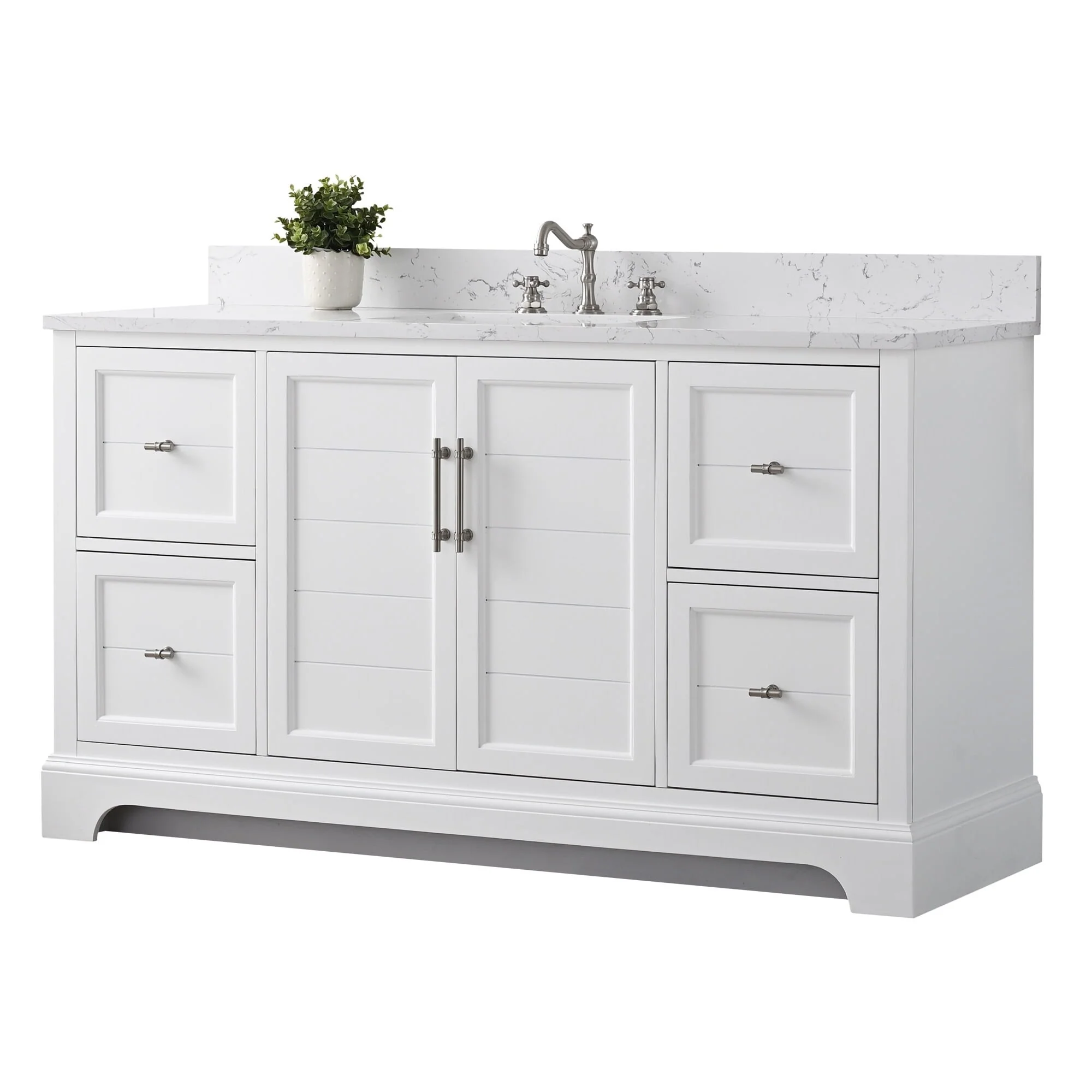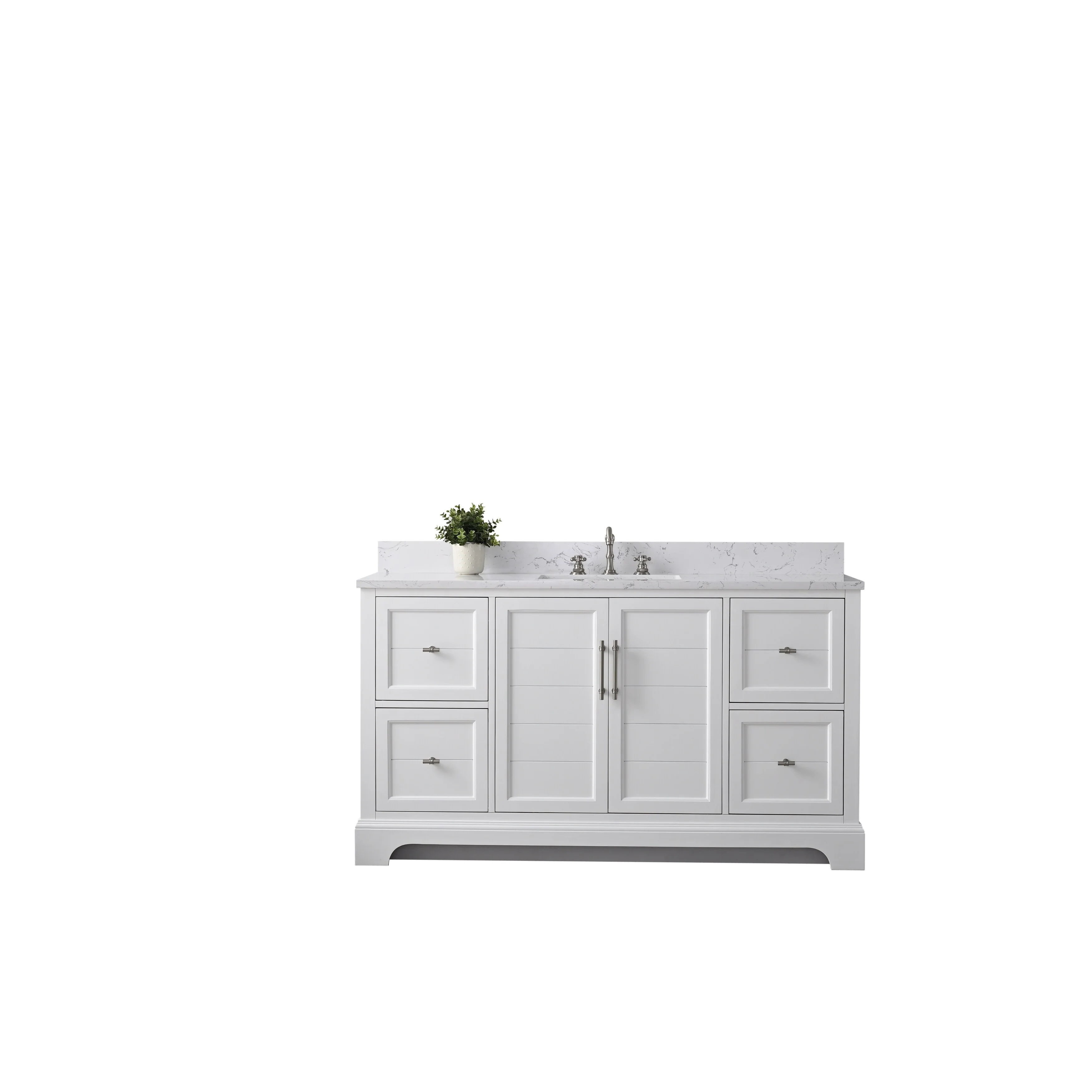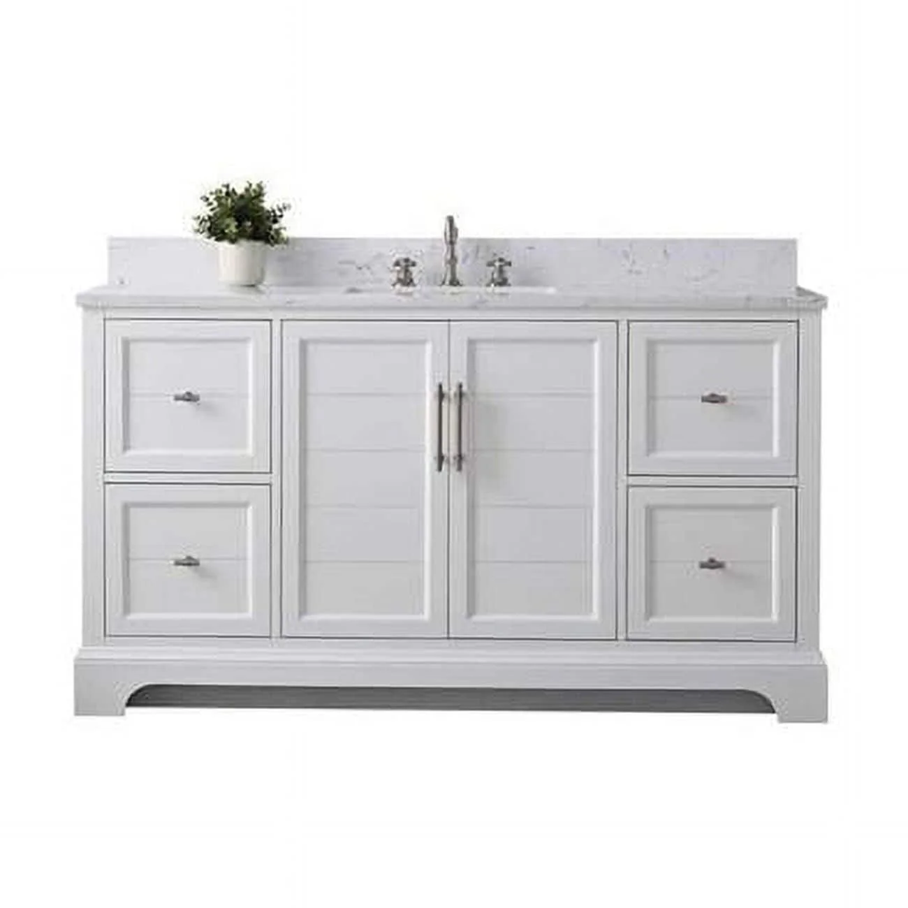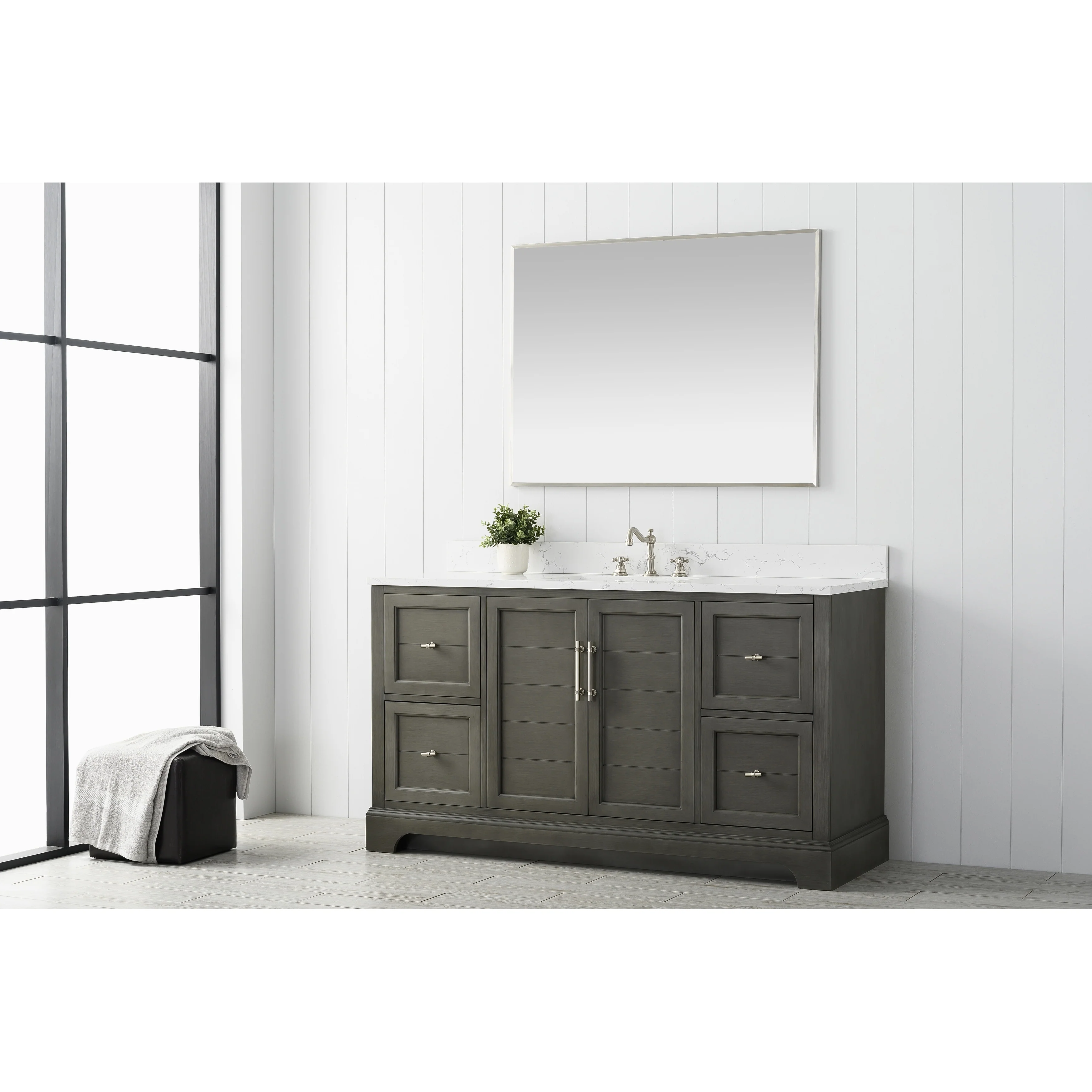 The classic clean lines and elegant styling of the 60-inch 3-hole bathroom vanity will infuse your bathroom with a calming, light, and airy feel. Designed to enhance a standard-size bathroom with a strong contemporary look with big character in a compact size. Beneath a lustrous and durable stone countertop is a beautifully integrated rectangular ceramic sink. Equipped with soft-closing cabinet doors and dovetailed drawers with gleaming black finished hardware, and silver-grey, white, and vintage green vanity finish with a lacquer coating for extra flair and stability.