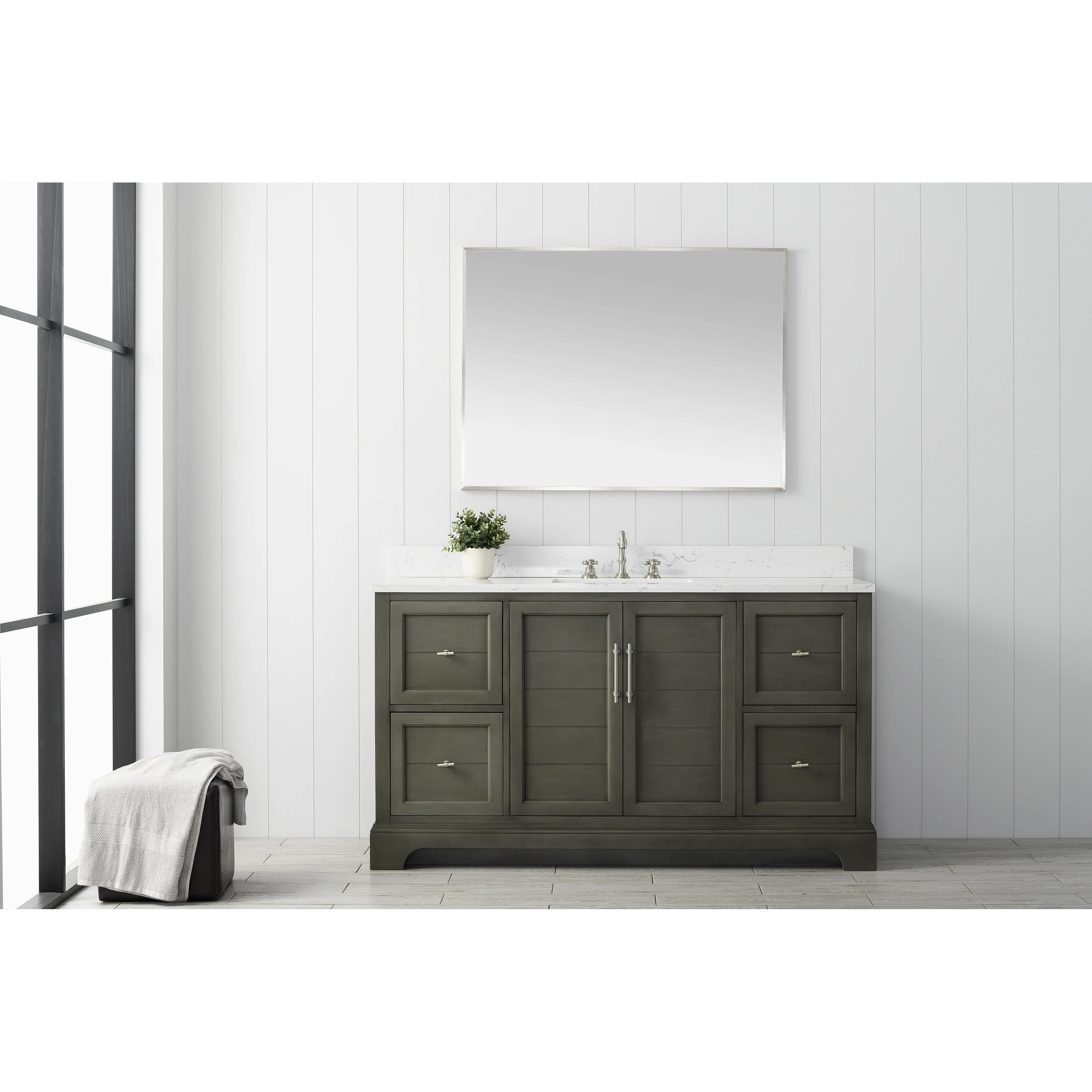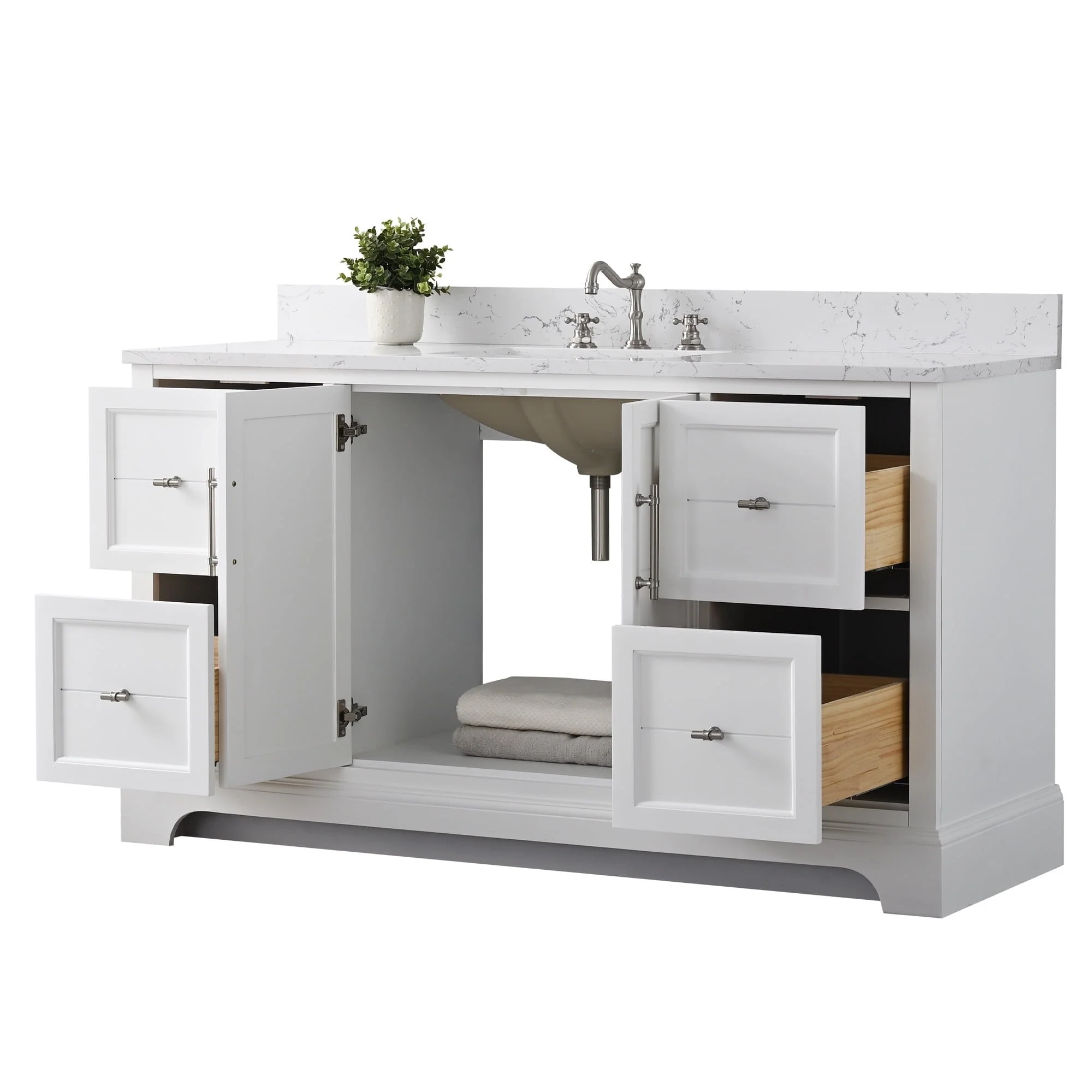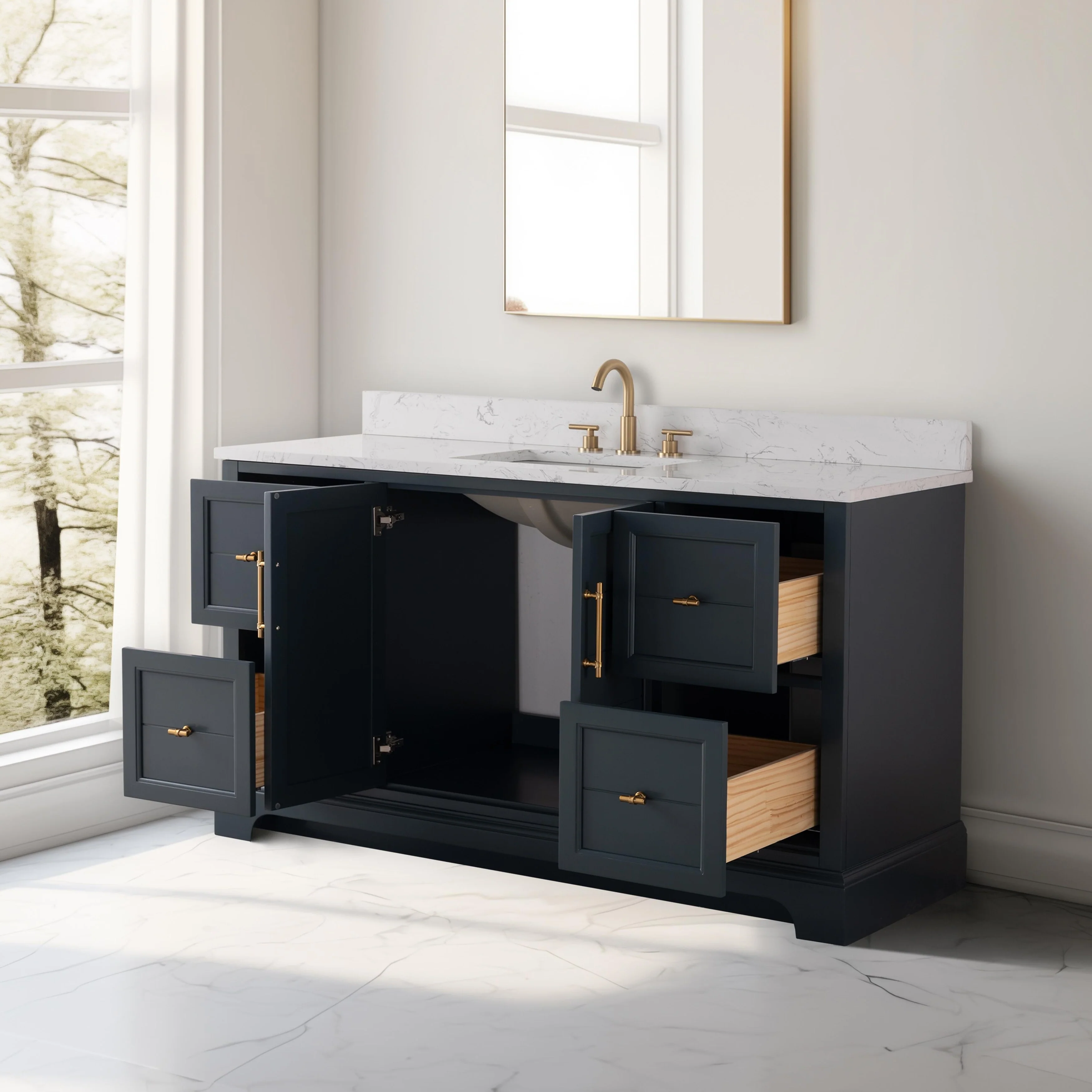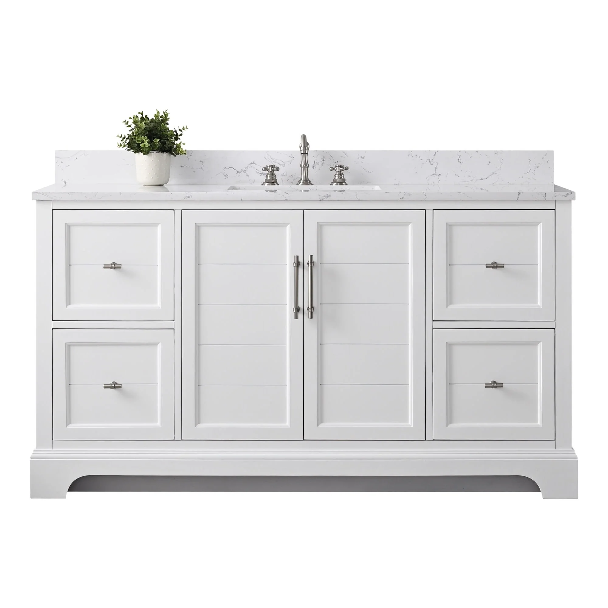 The classic clean lines and elegant styling of the 60-inch 3-hole bathroom vanity will infuse your bathroom with a calming, light, and airy feel. Designed to enhance a standard-size bathroom with a strong contemporary look with big character in a compact size. Beneath a lustrous and durable stone countertop is a beautifully integrated rectangular ceramic sink. Equipped with soft-closing cabinet doors and dovetailed drawers with gleaming black finished hardware, and silver-grey, white, and vintage green vanity finish with a lacquer coating for extra flair and stability.