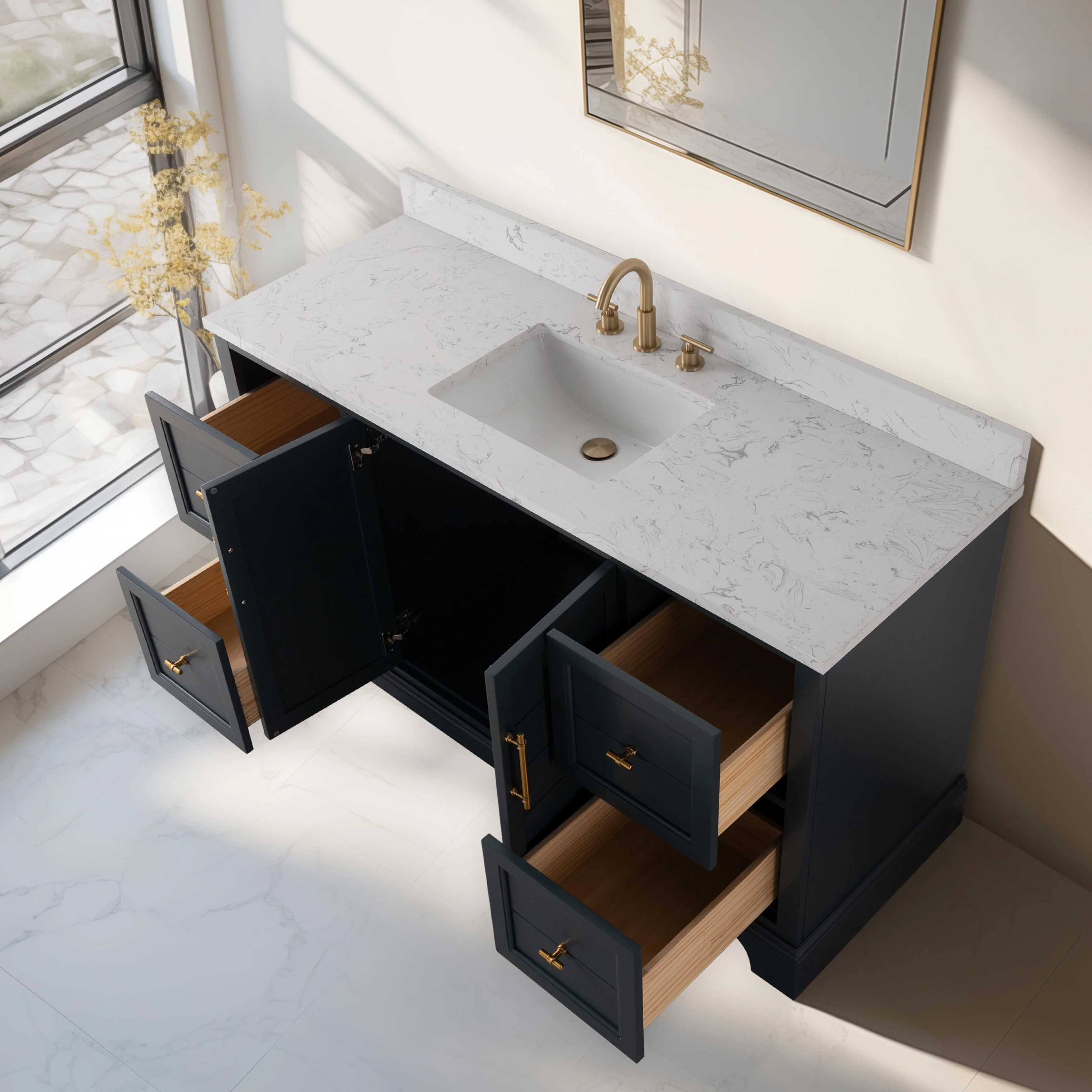 AMPLE STORAGE OPTIONS: With a combination of shelving and dovetail drawers, our vanity bathroom cabinet offers generous storage space, Customize your storage needs with optional drawer units