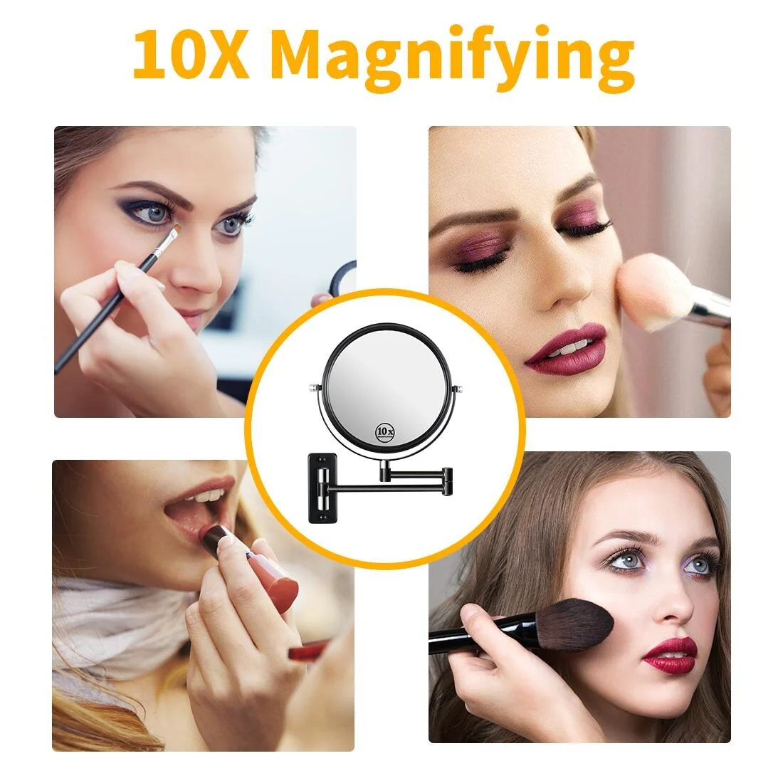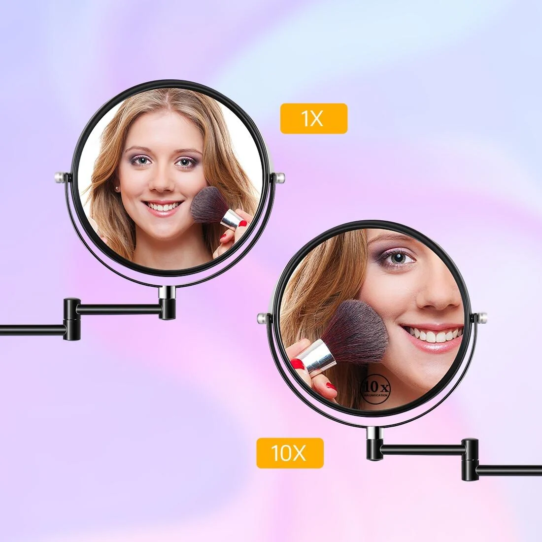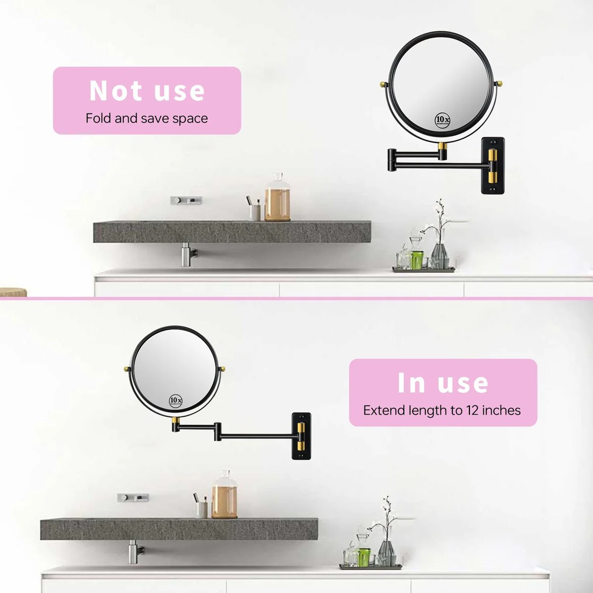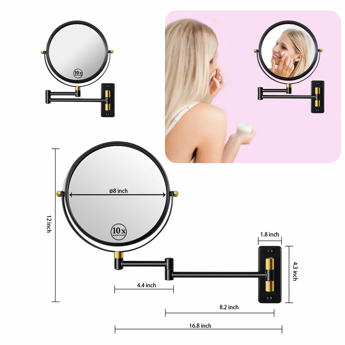 Do you often fail to illuminate your face because of insufficient distance? Like you recommend this makeup mirror with extension arm can be double-sided 1X/10X magnification, 10X magnification can clearly see the details of your face for perfect makeup; 1X face is suitable for overall observation.360掳 rotating design and extension arm make the mirror can be adjusted at any angle, convenient for you to observe. The extension arm design allows you to adjust the length as you like in the bathroom. The bottom of the mirror is equipped with a sturdy fixing device, which can be firmly mounted on the wall to ensure stability and safety when in use. Create your perfect look with this exquisite wall mirror!