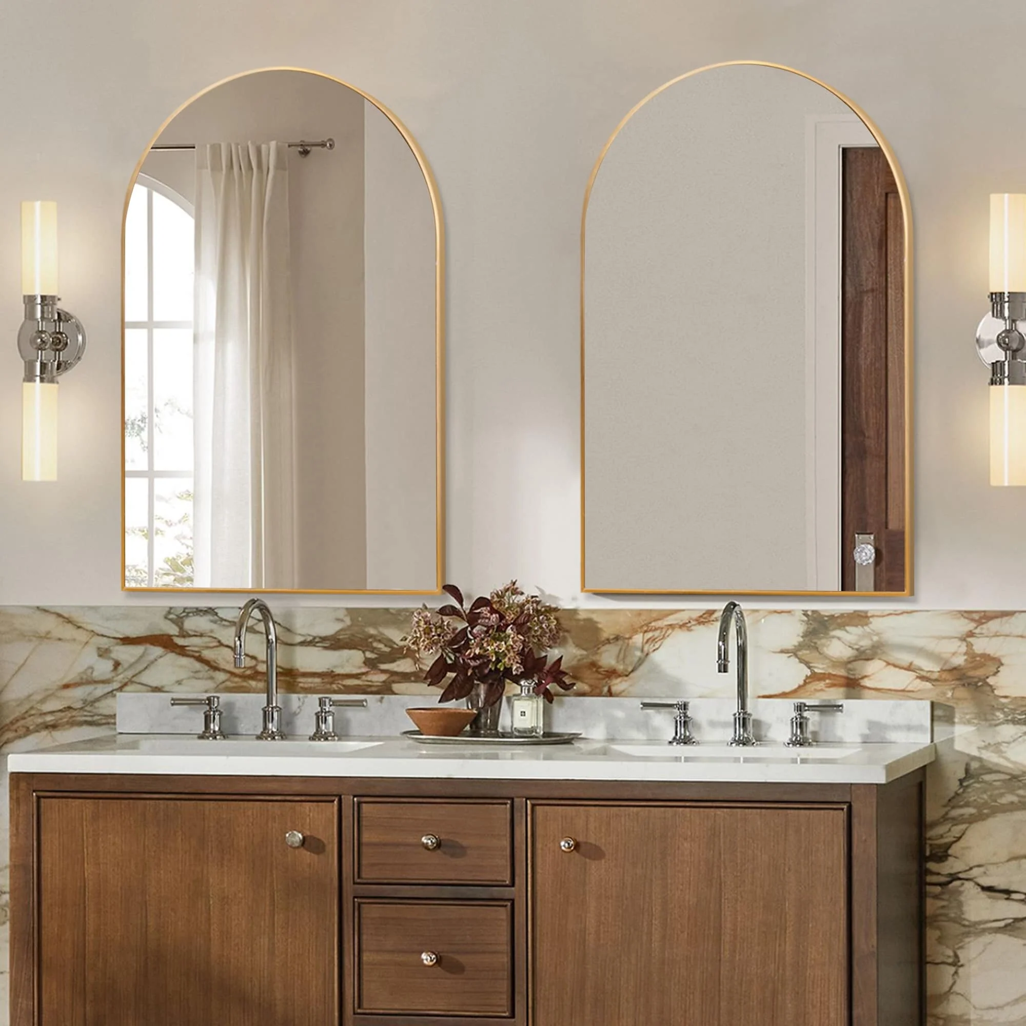 This set of 2 metal arched bathroom mirrors, packaged together, is an ideal addition to your double bathroom vanity. Installing these arched mirrors on your bathroom wall can transform the space into an elegant sanctuary that not only feels sophisticated but also enhances the perceived width and spaciousness of a smaller bathroom. Each mirror is meticulously crafted with a sleek stainless brushed aluminum frame and high-definition, distortion-free glass, ensuring both style and functionality. Beyond complementing your bathroom vanity with their modern design, these mirrors also serve as versatile accents for other areas of your home, including bedrooms, living rooms, and hallways.