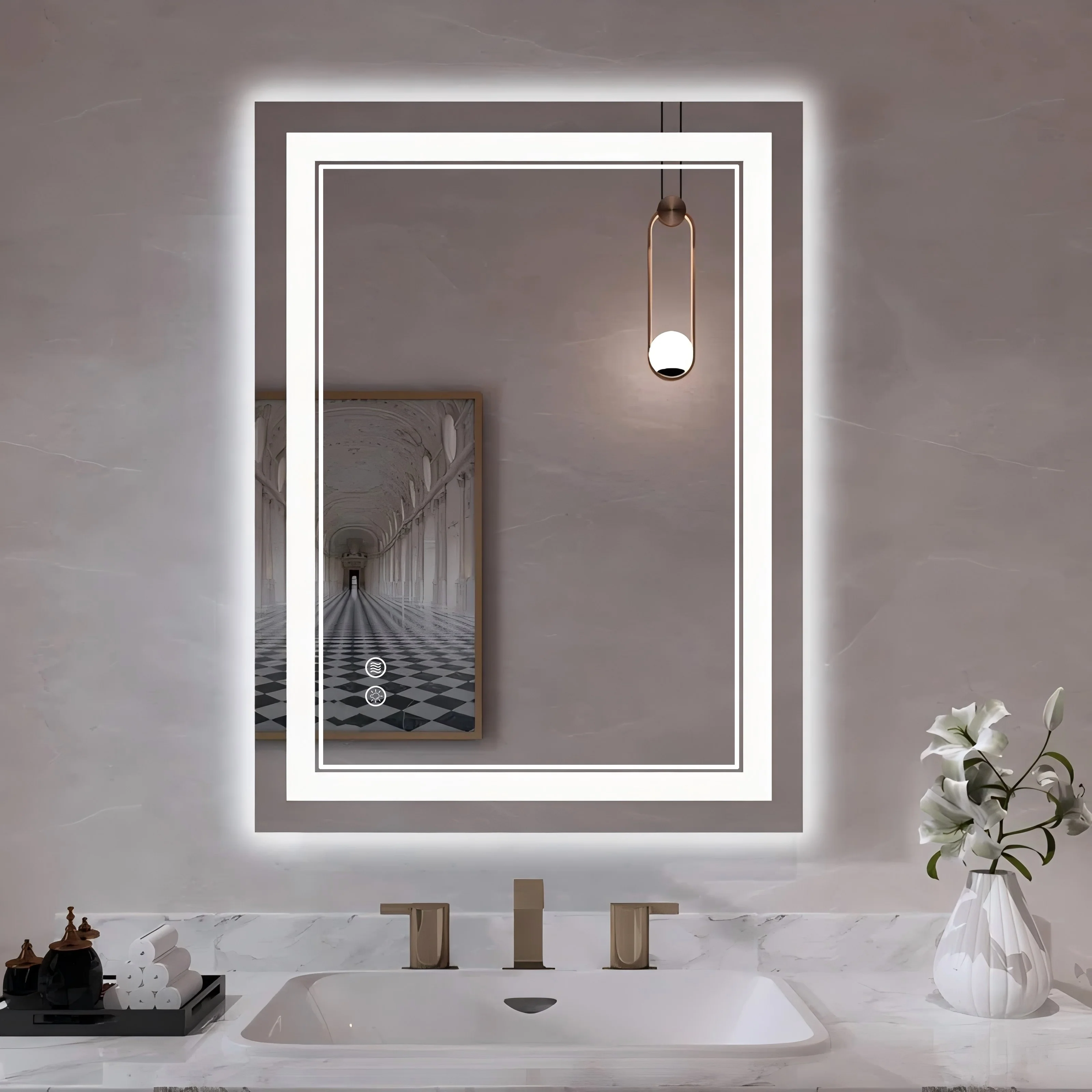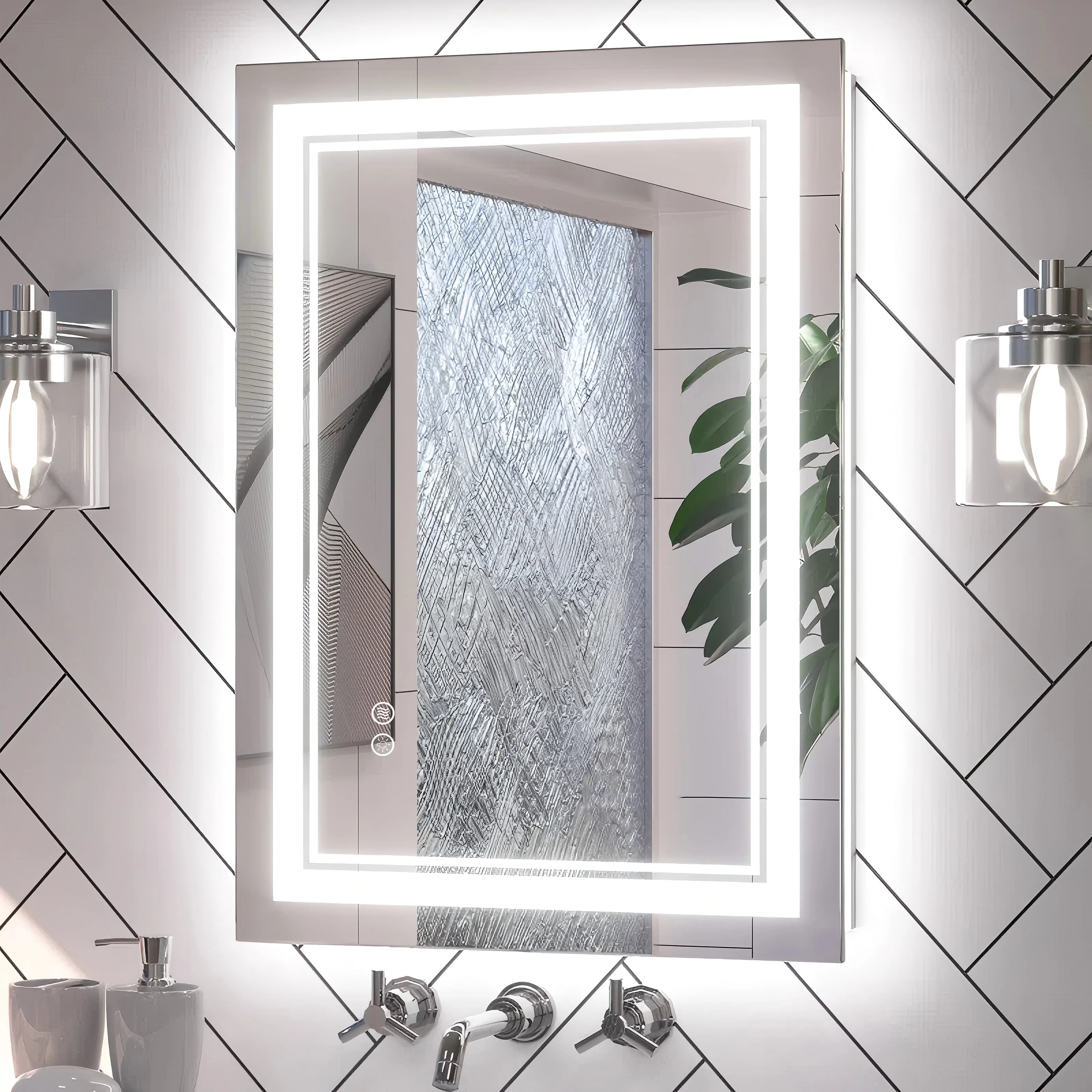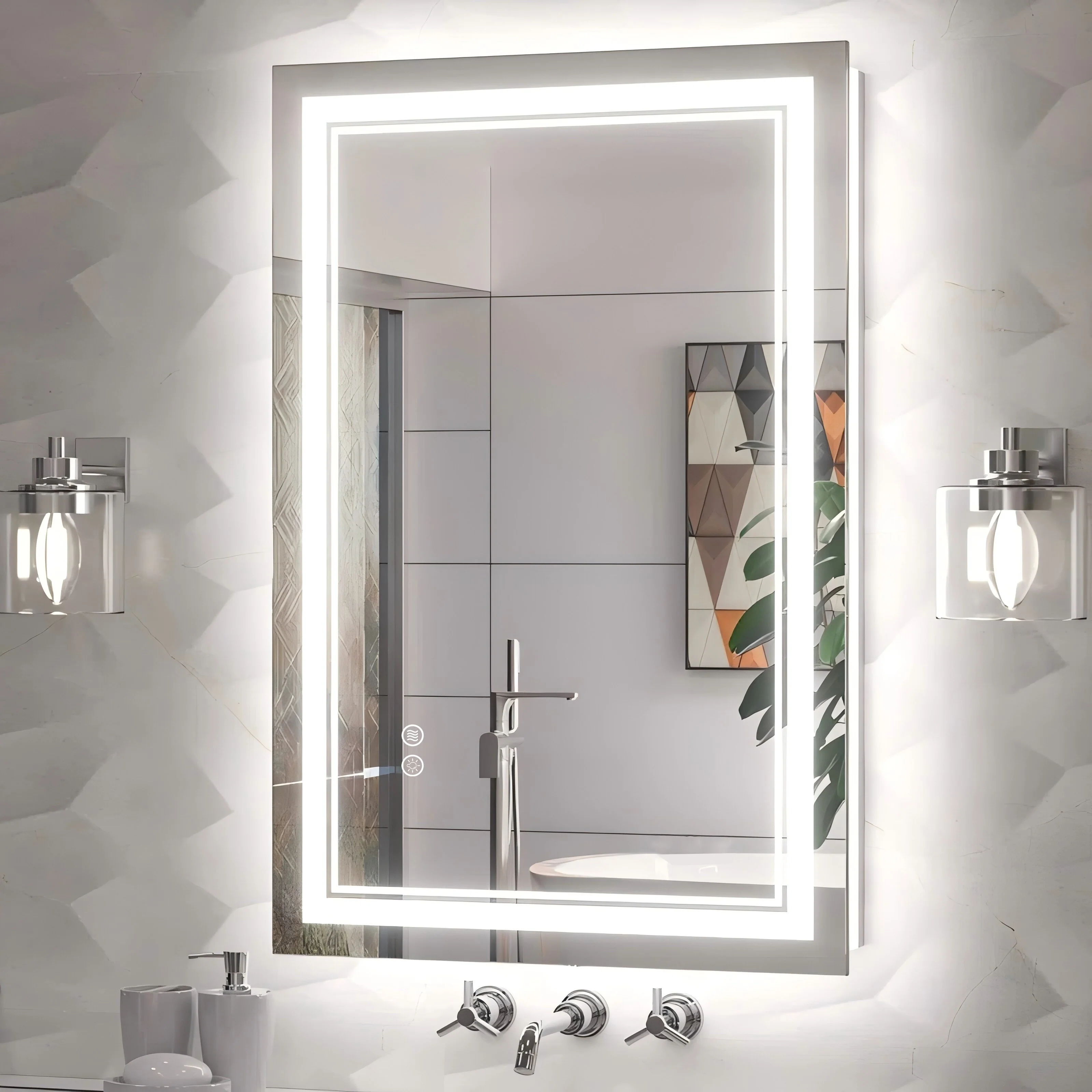 Modern frontlit LED anti-fog bathroom vanity mirror adopts 24-Volt output voltage real CRI90+ 192 LEDs/m light strip, which is bright enough for makeup, skincare,dressing up and shaving. Tempered glass and copper-free material is durabler, shatterproof and HD reflection. Two types of installation-horizontal & vertical are available with French Cleat mounting brackets. Simple and pracrical button design is easy to use. This mirror can not only makes our room appear more spacious and bright, but also infuse a unique design charm into room decor.