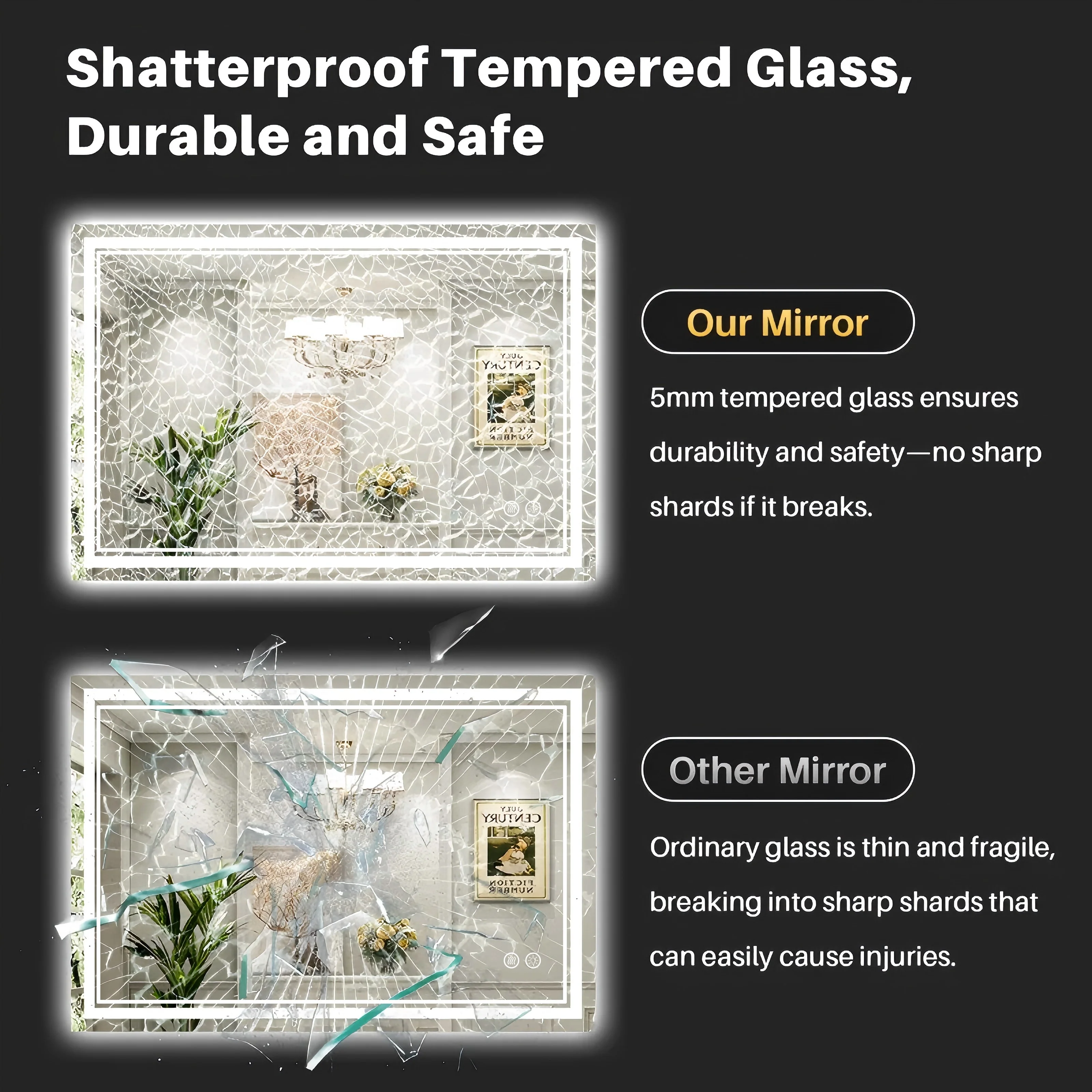 - Tempered glass mirror, shatterproof, safety