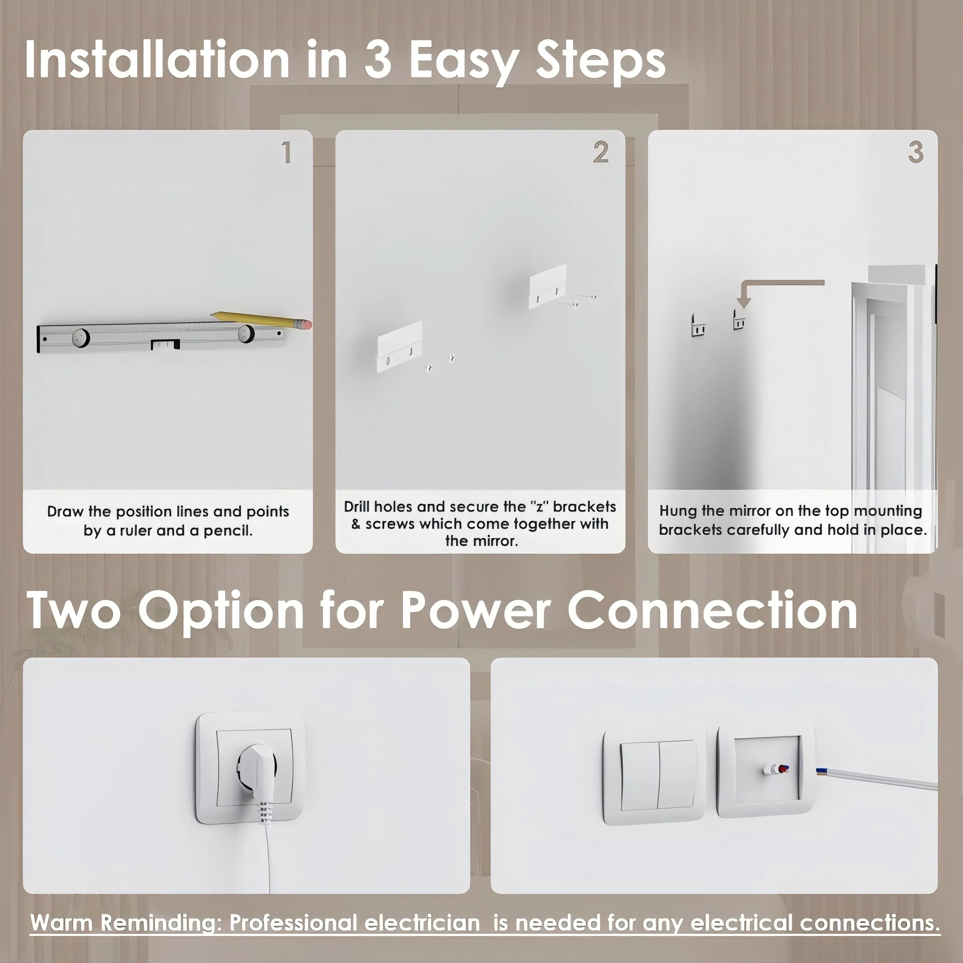 - Easy Installation: our mirrors can be wall-mounted vertically or horizontally with wall brackets and screws in the packet and can be hardwired to the wall switch or plug in the outlet. Ps:This mirror is covered with a protective film to protect its surface. Please remove the film before using the mirror.