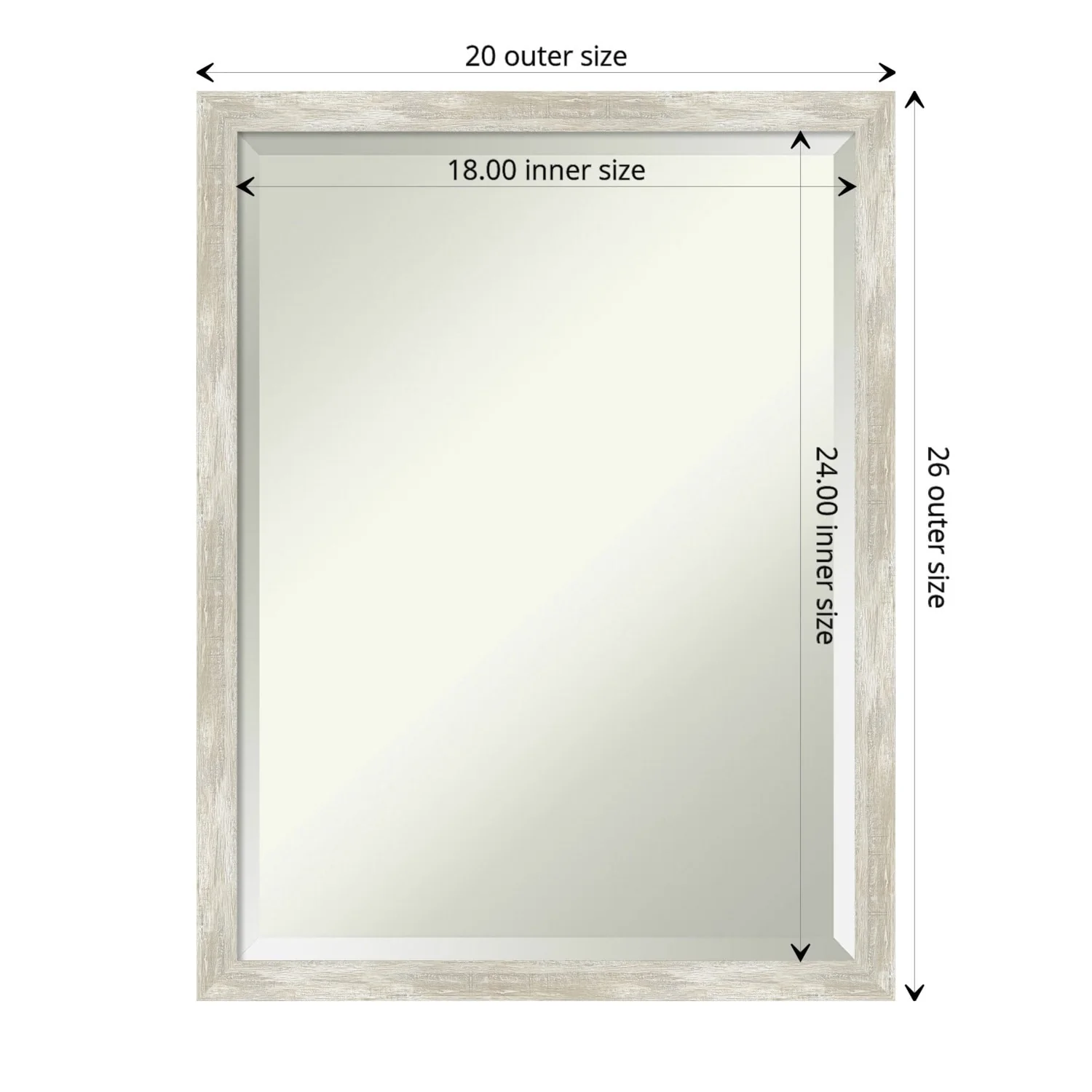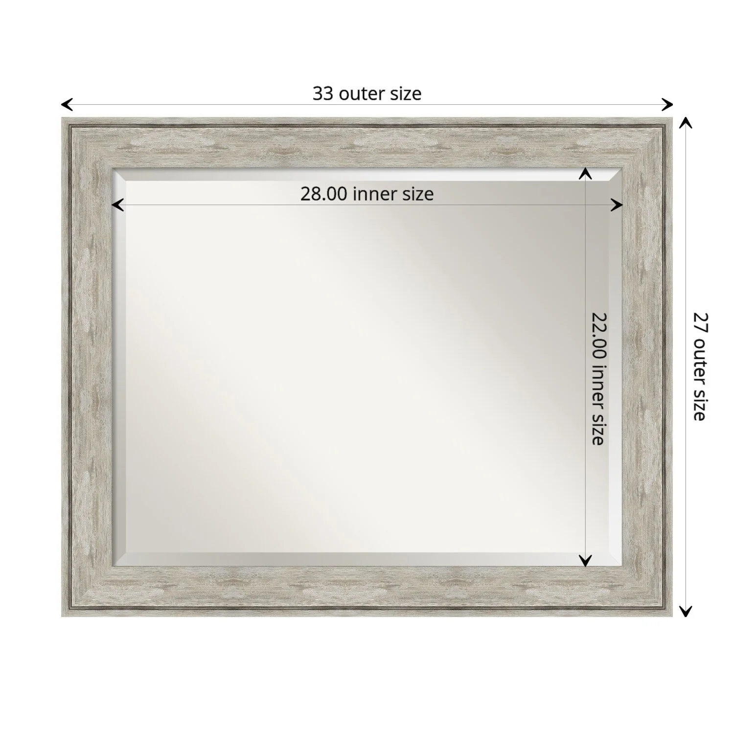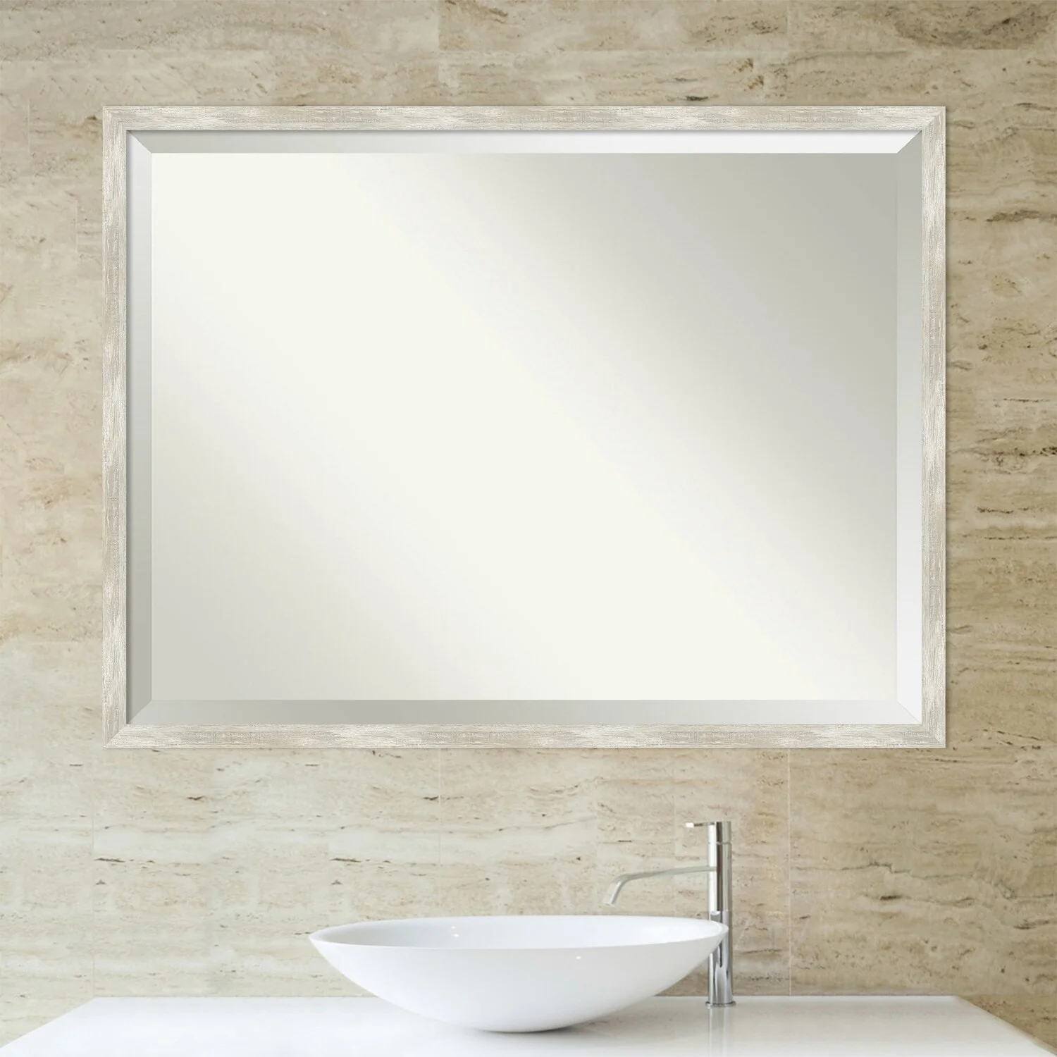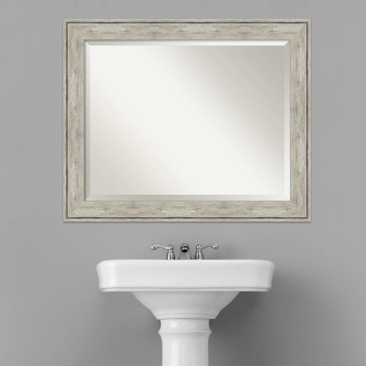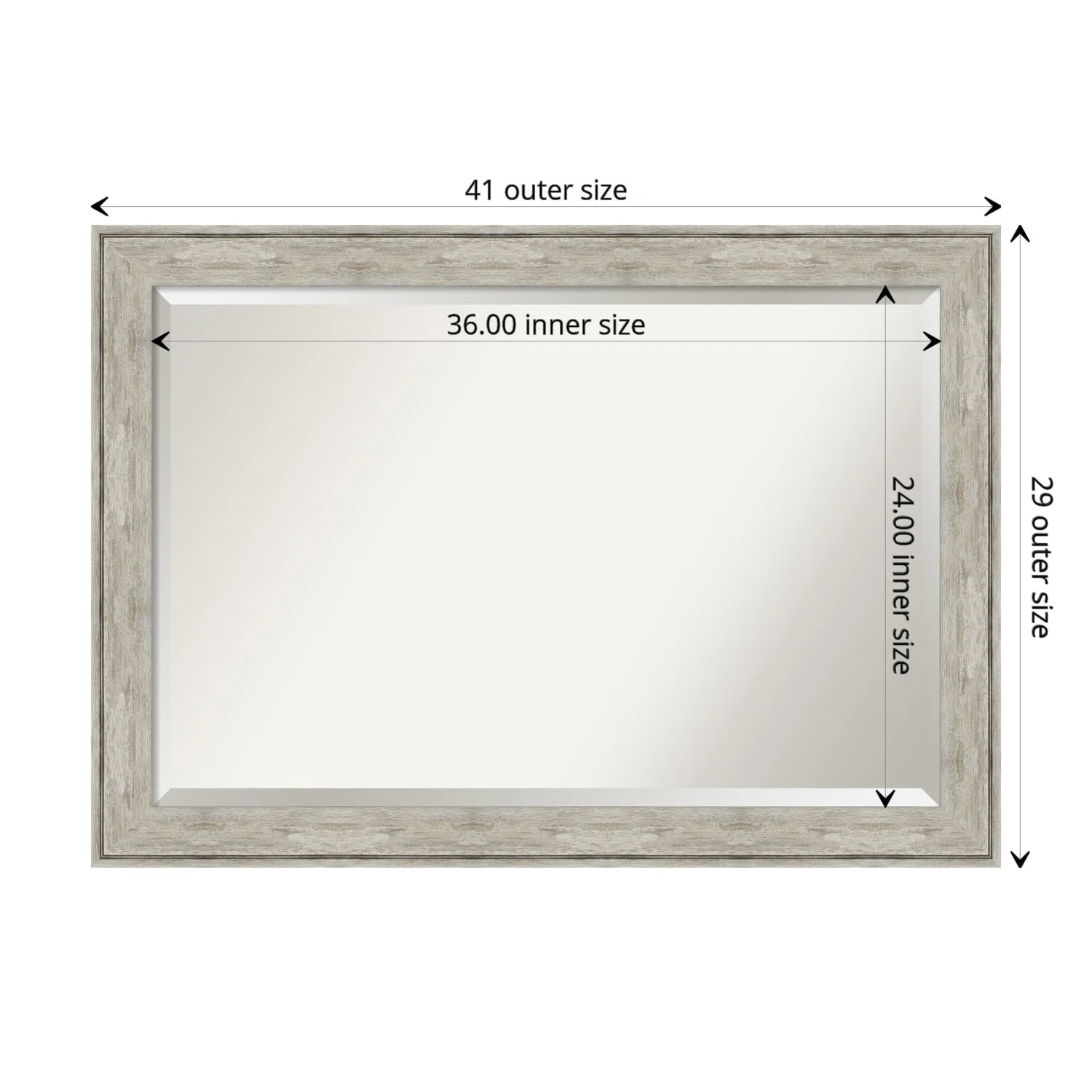 Add a touch of elegance to your bathroom with this Beveled Wall Mirror featuring a Crackled Metallic Frame. The premium glass provides a clear, undistorted reflection while the beveled edge adds a decorative touch. The frame is crafted using traditional custom framing techniques with a distressed silver and champagne panel and a neutral metallic, crackle-like finish, making it an eye-catching addition to any bathroom. Hang it vertically or horizontally with the durable hardware attached to the back. Assembled in the USA, this mirror is perfect for home or commercial use.