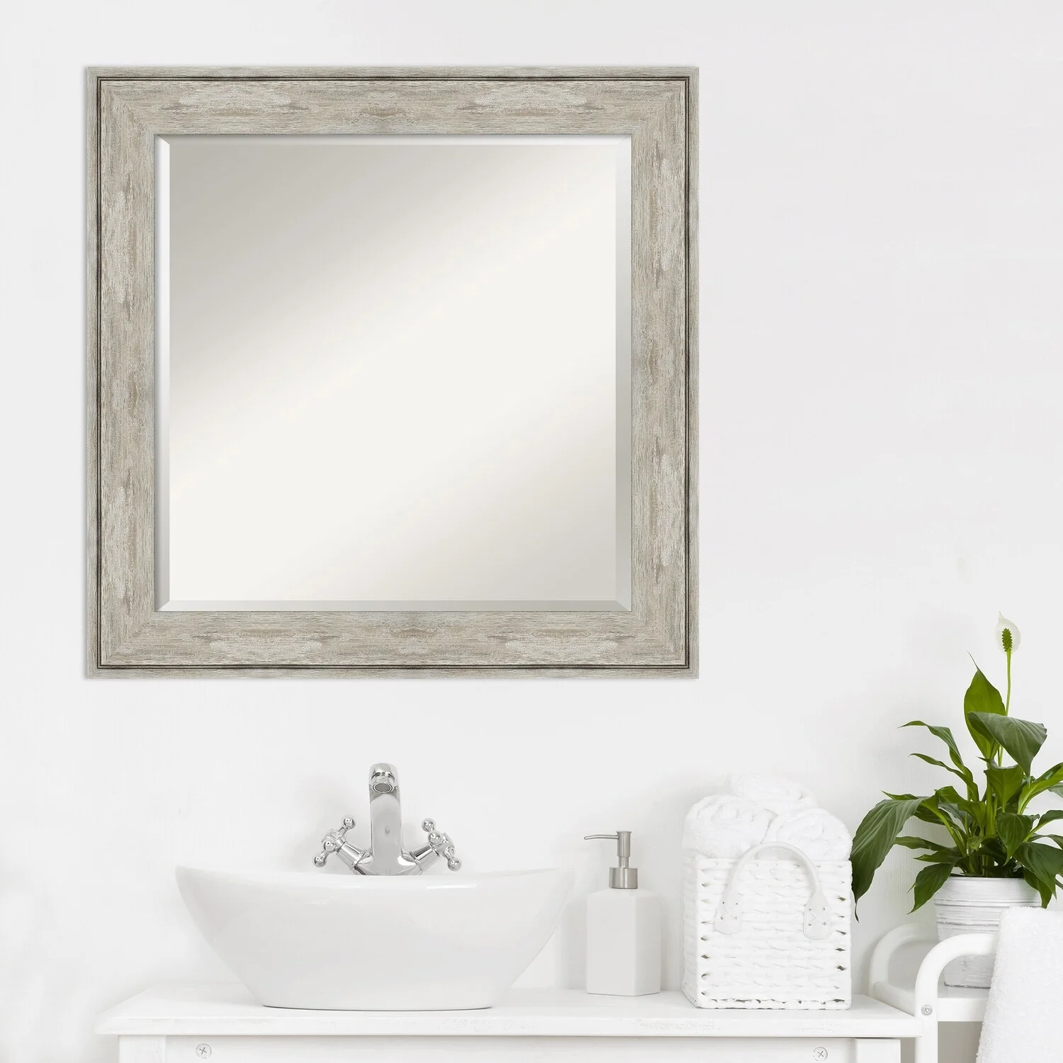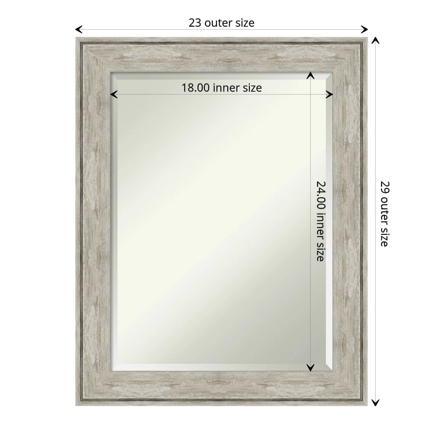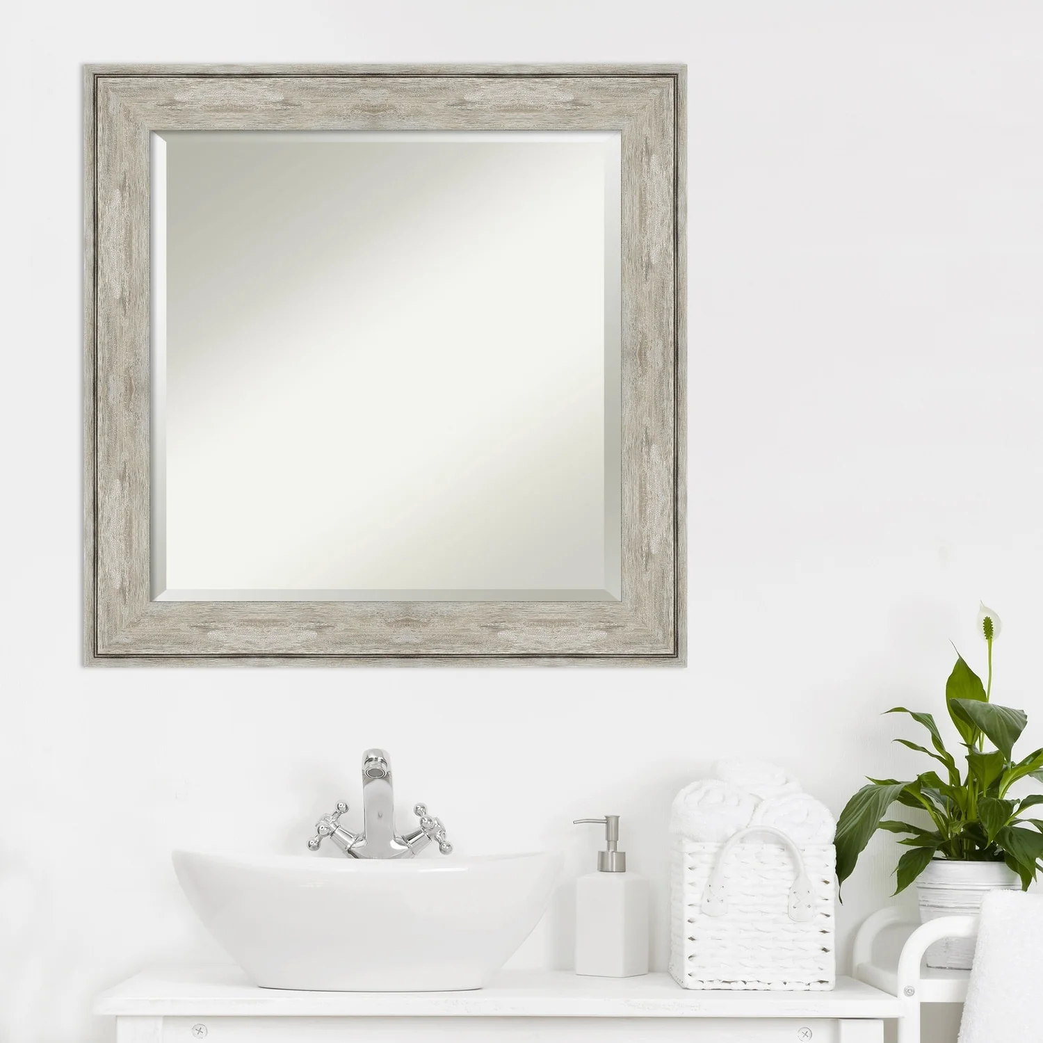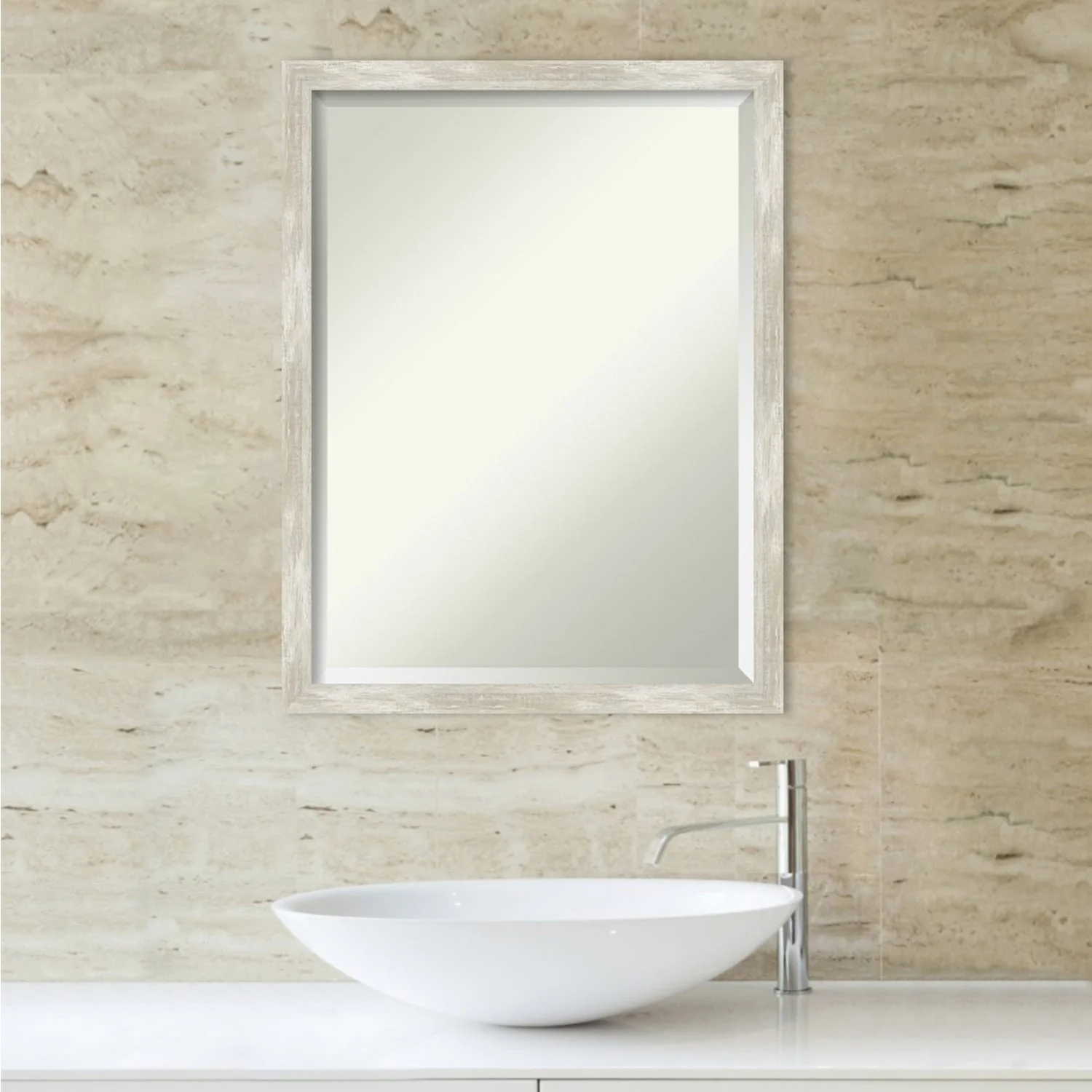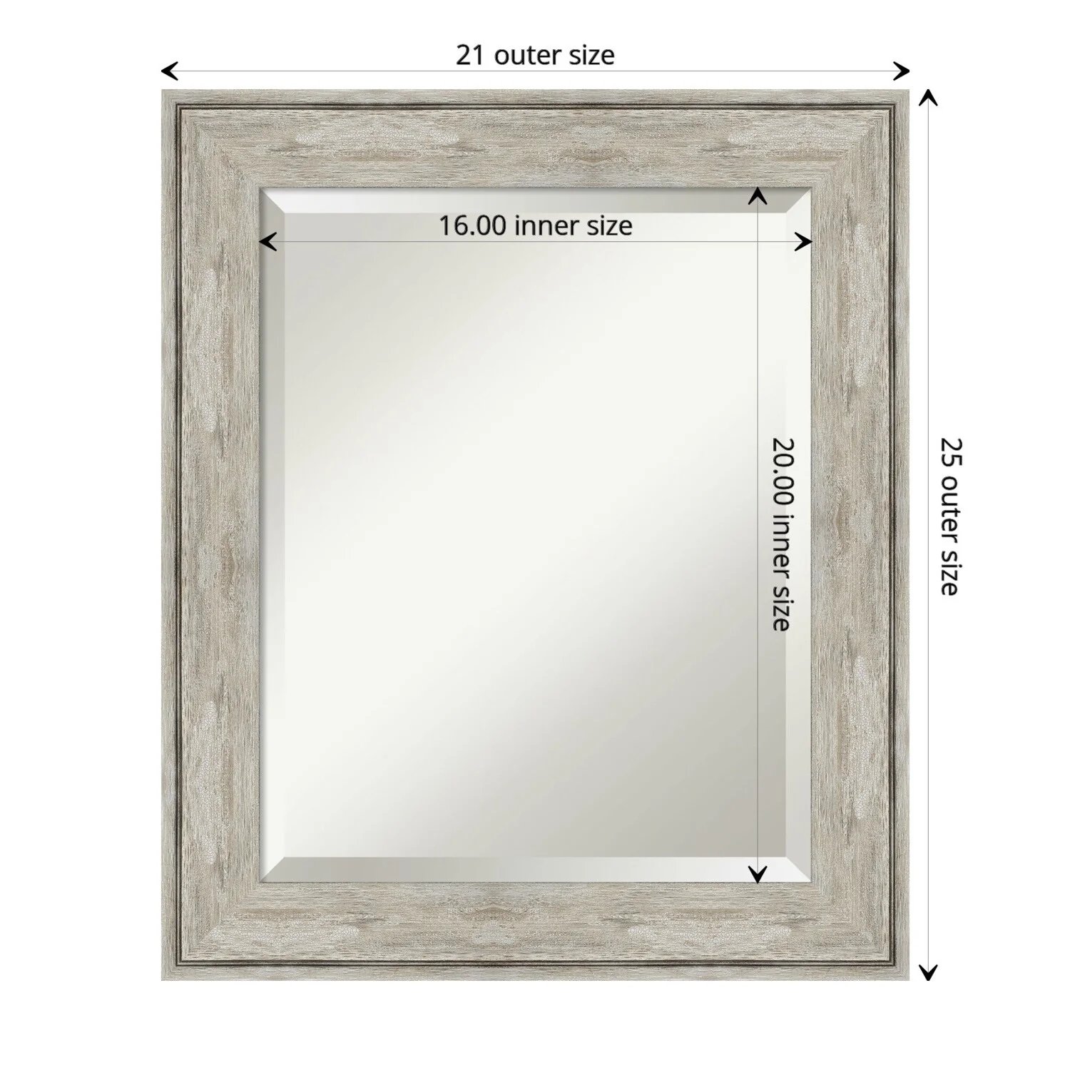Add a touch of elegance to your bathroom with this Beveled Wall Mirror featuring a Crackled Metallic Frame. The premium glass provides a clear, undistorted reflection while the beveled edge adds a decorative touch. The frame is crafted using traditional custom framing techniques with a distressed silver and champagne panel and a neutral metallic, crackle-like finish, making it an eye-catching addition to any bathroom. Hang it vertically or horizontally with the durable hardware attached to the back. Assembled in the USA, this mirror is perfect for home or commercial use.