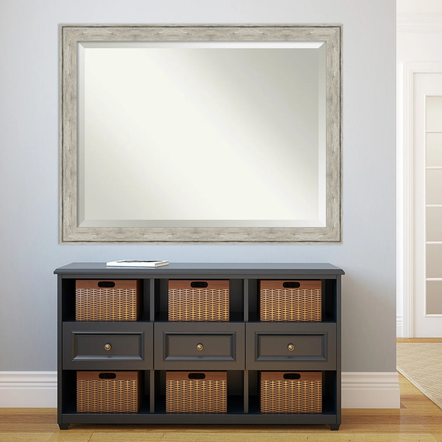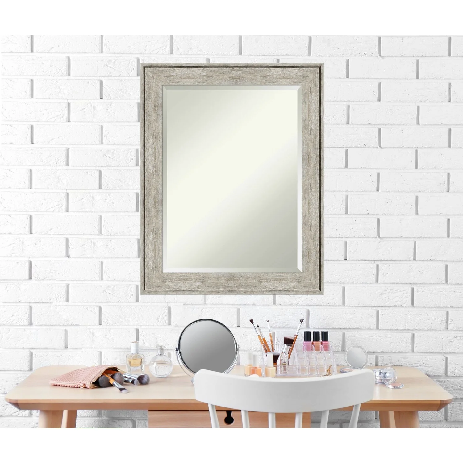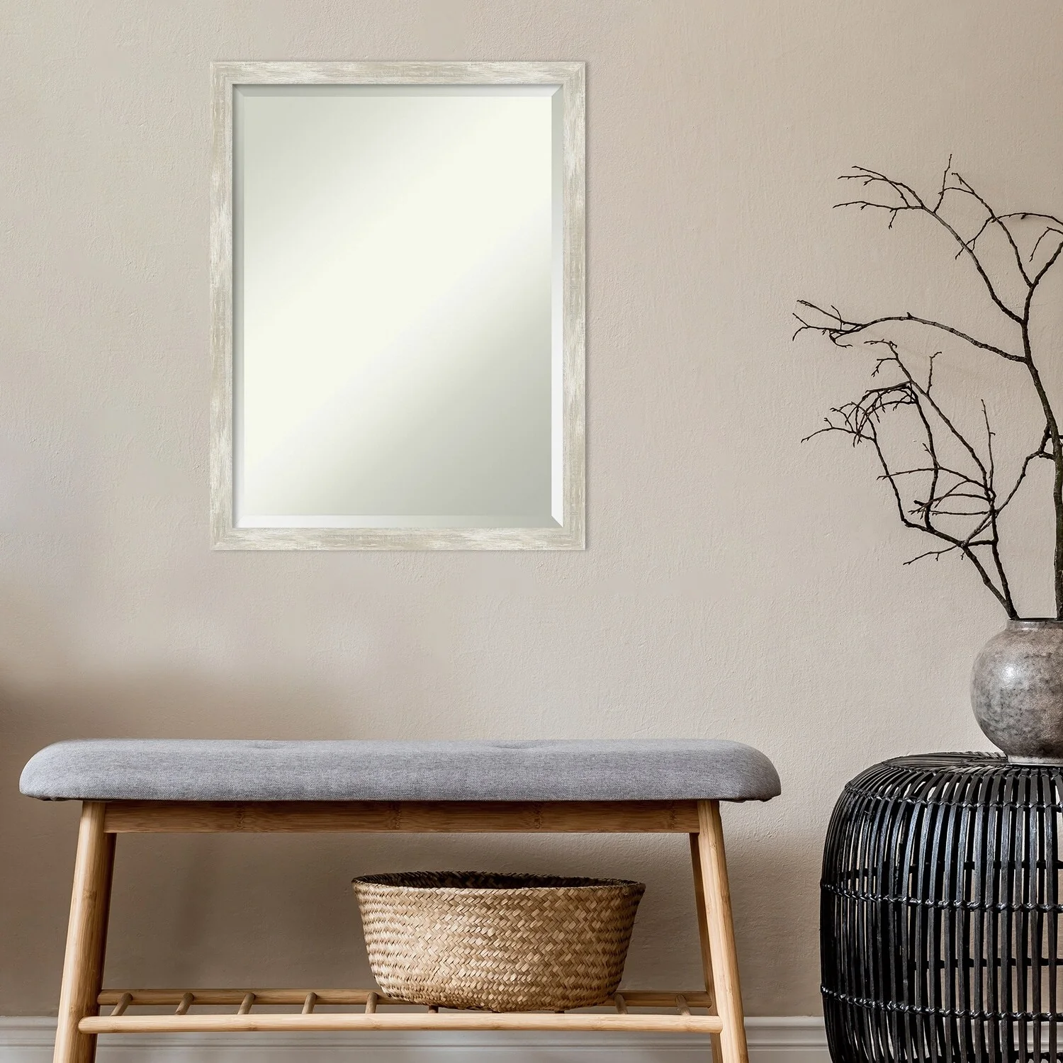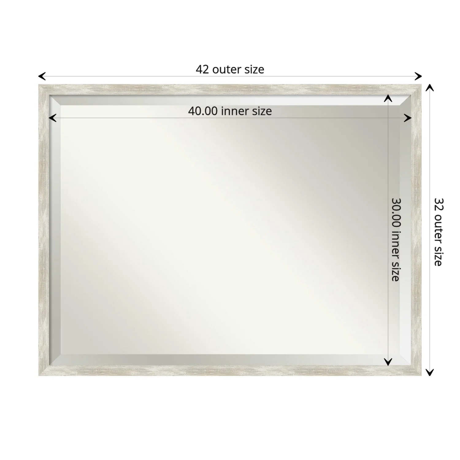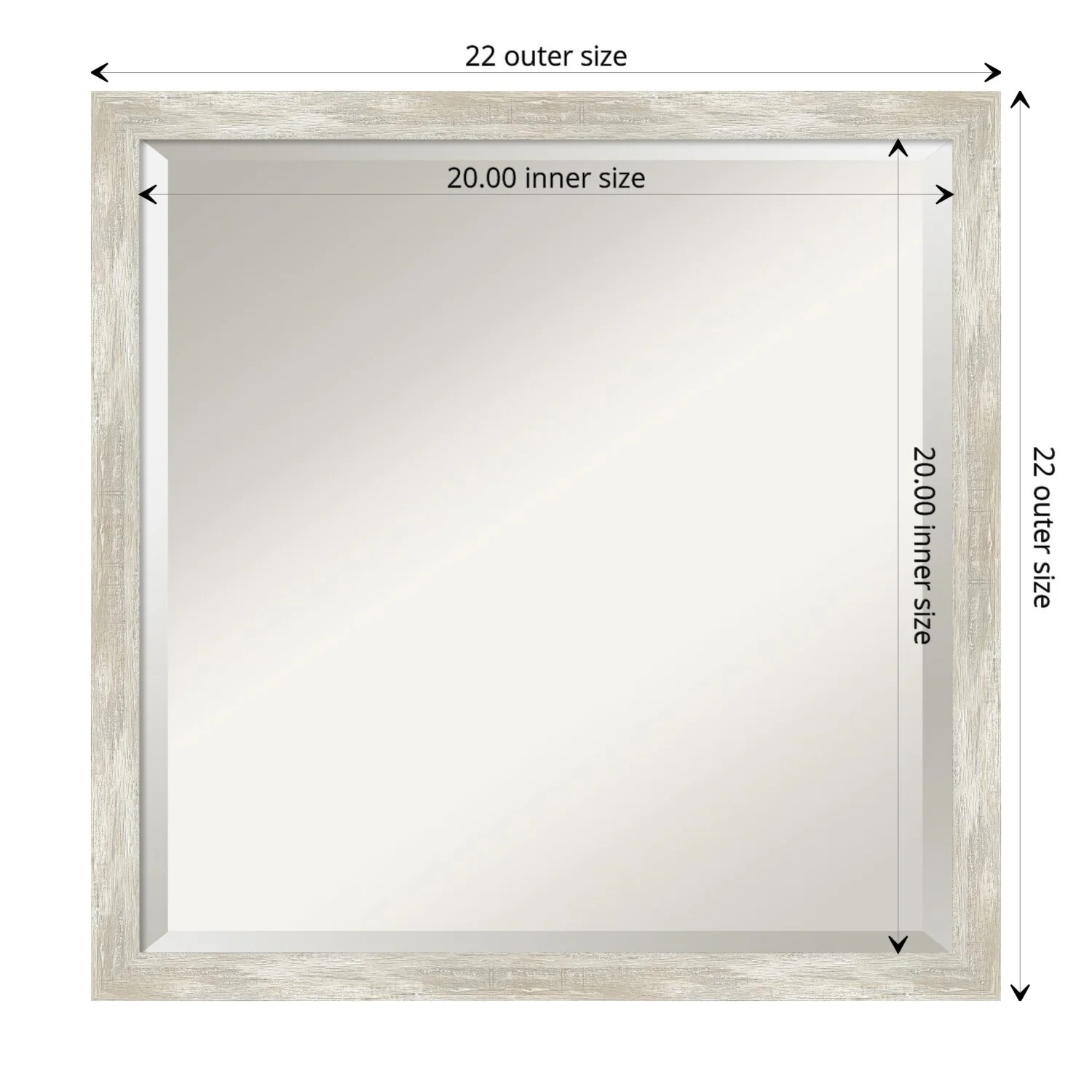 Add a touch of elegance to your bathroom with this Beveled Wall Mirror featuring a Crackled Metallic Frame. The premium glass provides a clear, undistorted reflection while the beveled edge adds a decorative touch. The frame is crafted using traditional custom framing techniques with a distressed silver and champagne panel and a neutral metallic, crackle-like finish, making it an eye-catching addition to any bathroom. Hang it vertically or horizontally with the durable hardware attached to the back. Assembled in the USA, this mirror is perfect for home or commercial use.