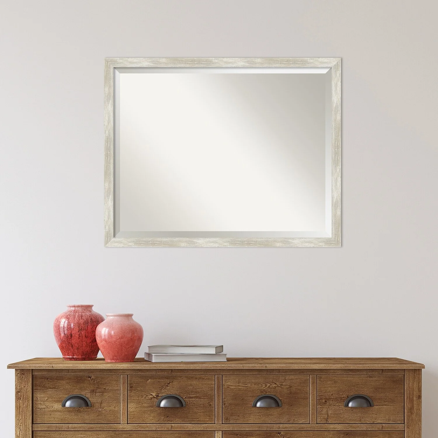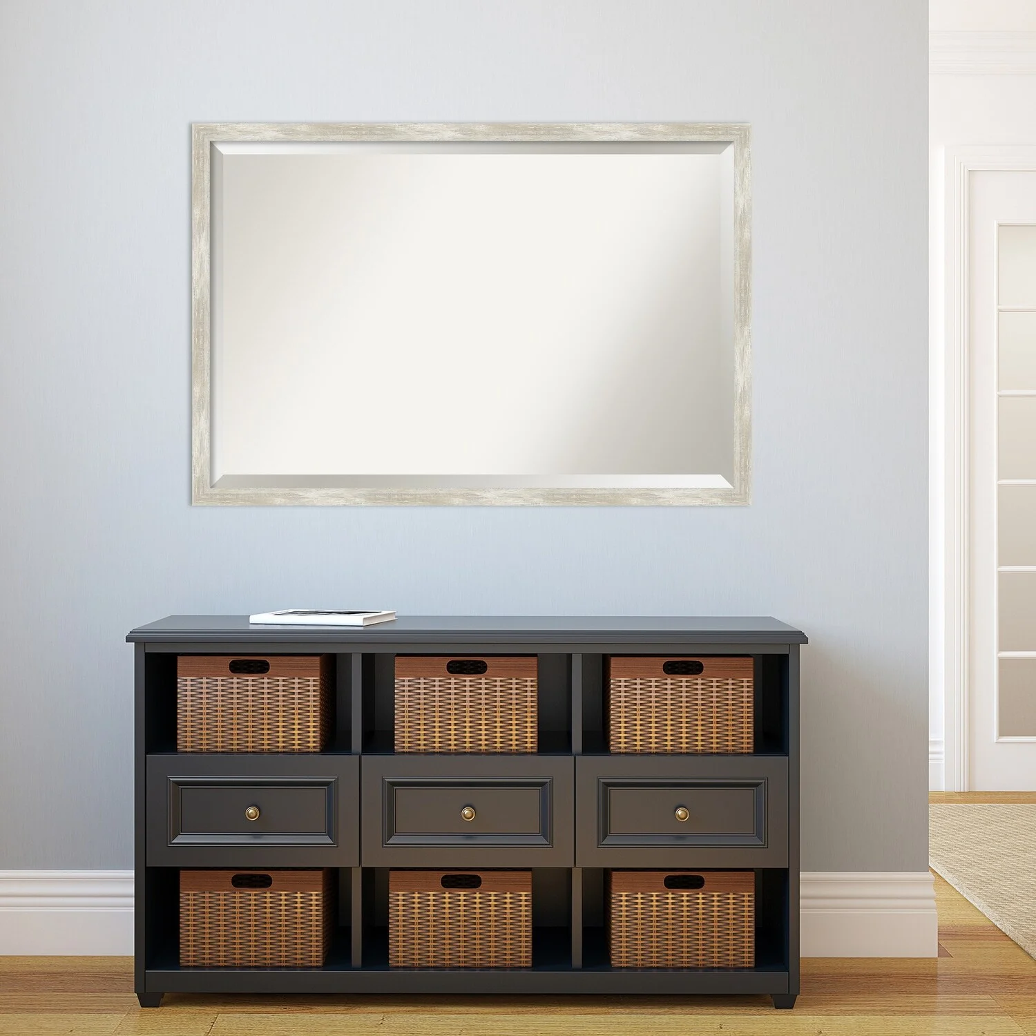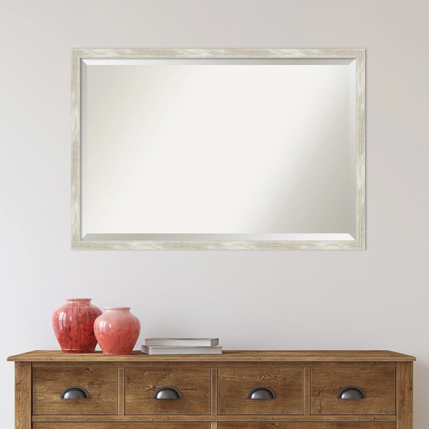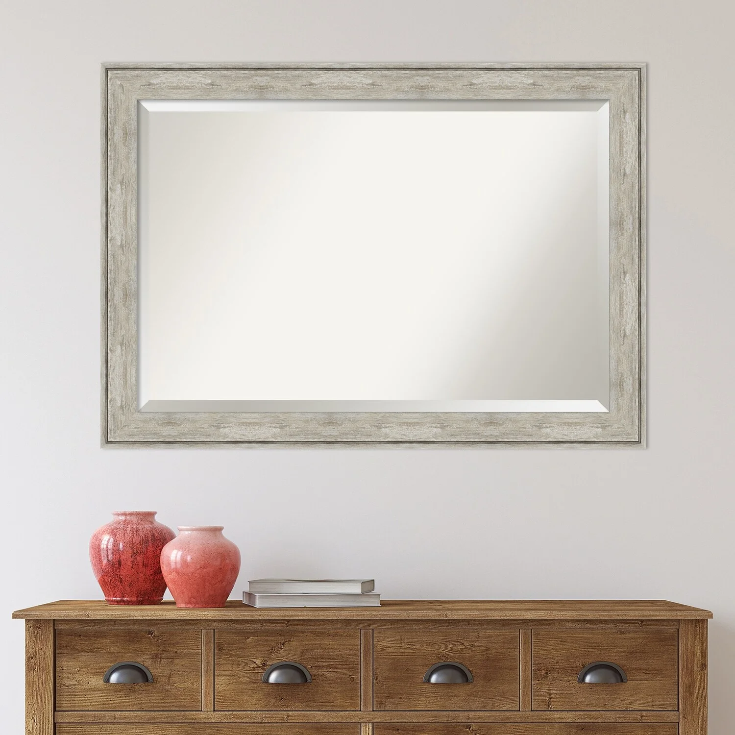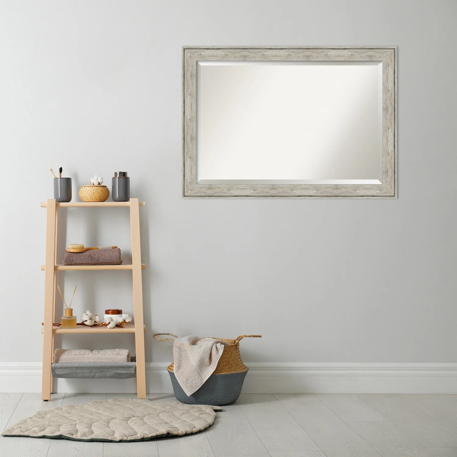 Add a touch of elegance to your bathroom with this Beveled Wall Mirror featuring a Crackled Metallic Frame. The premium glass provides a clear, undistorted reflection while the beveled edge adds a decorative touch. The frame is crafted using traditional custom framing techniques with a distressed silver and champagne panel and a neutral metallic, crackle-like finish, making it an eye-catching addition to any bathroom. Hang it vertically or horizontally with the durable hardware attached to the back. Assembled in the USA, this mirror is perfect for home or commercial use.