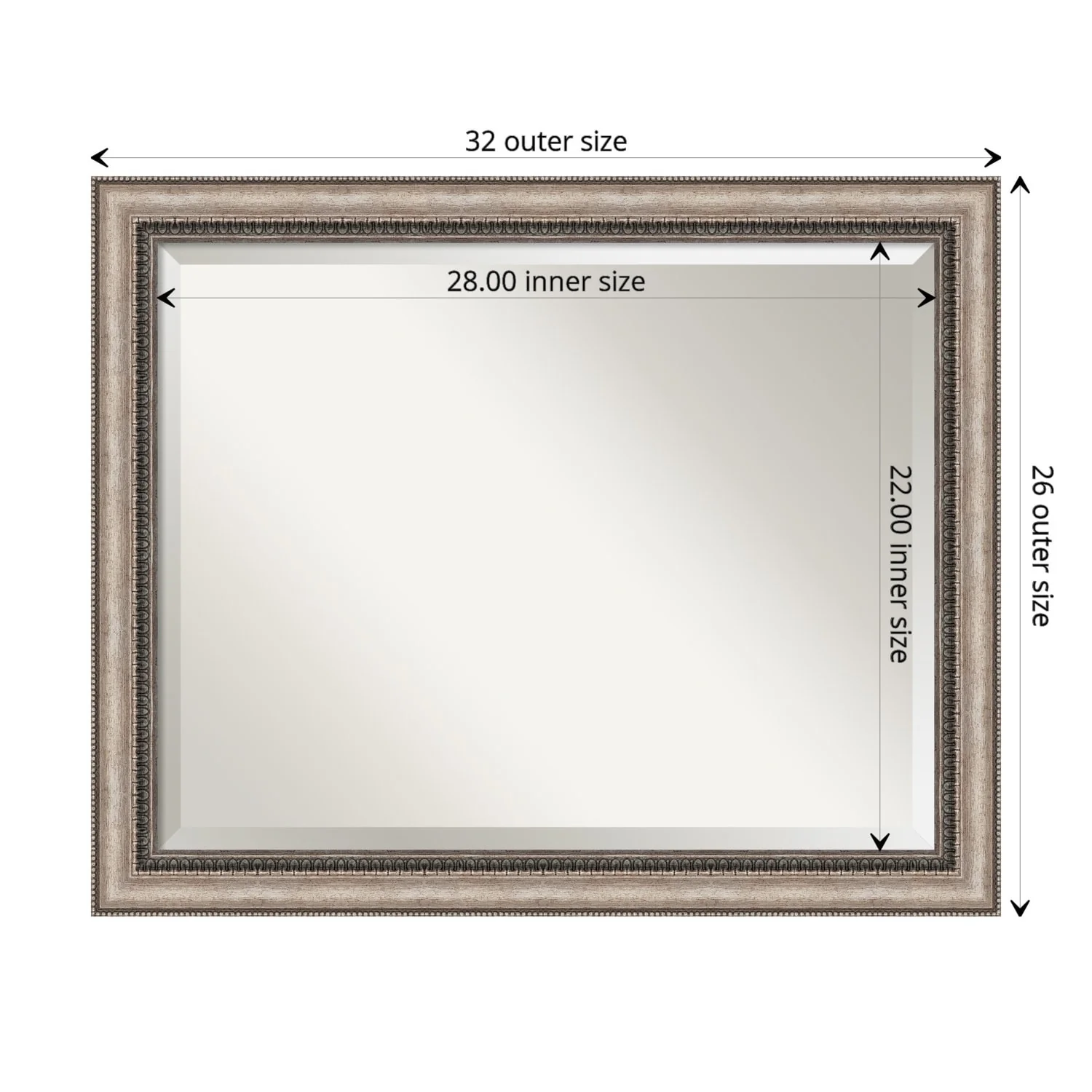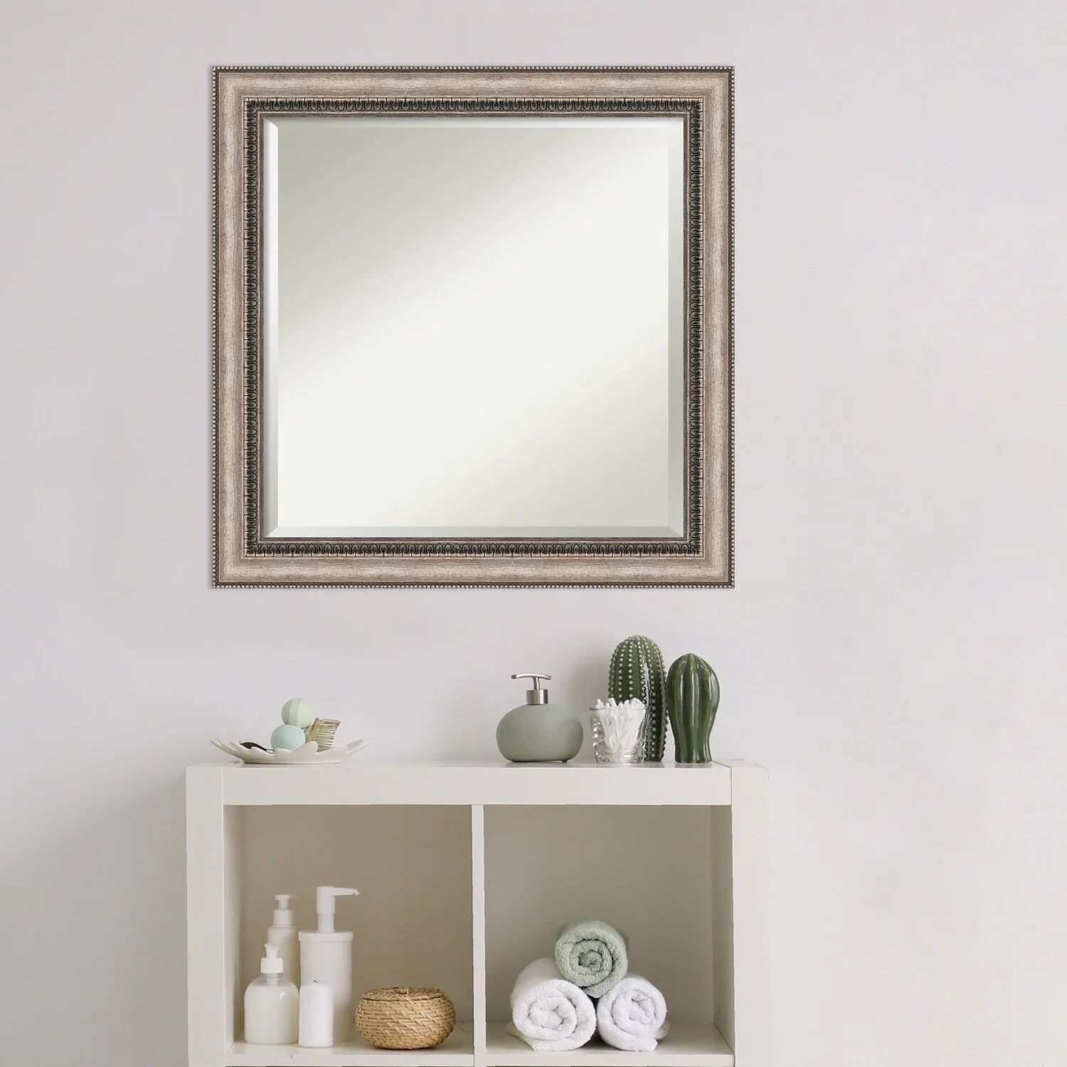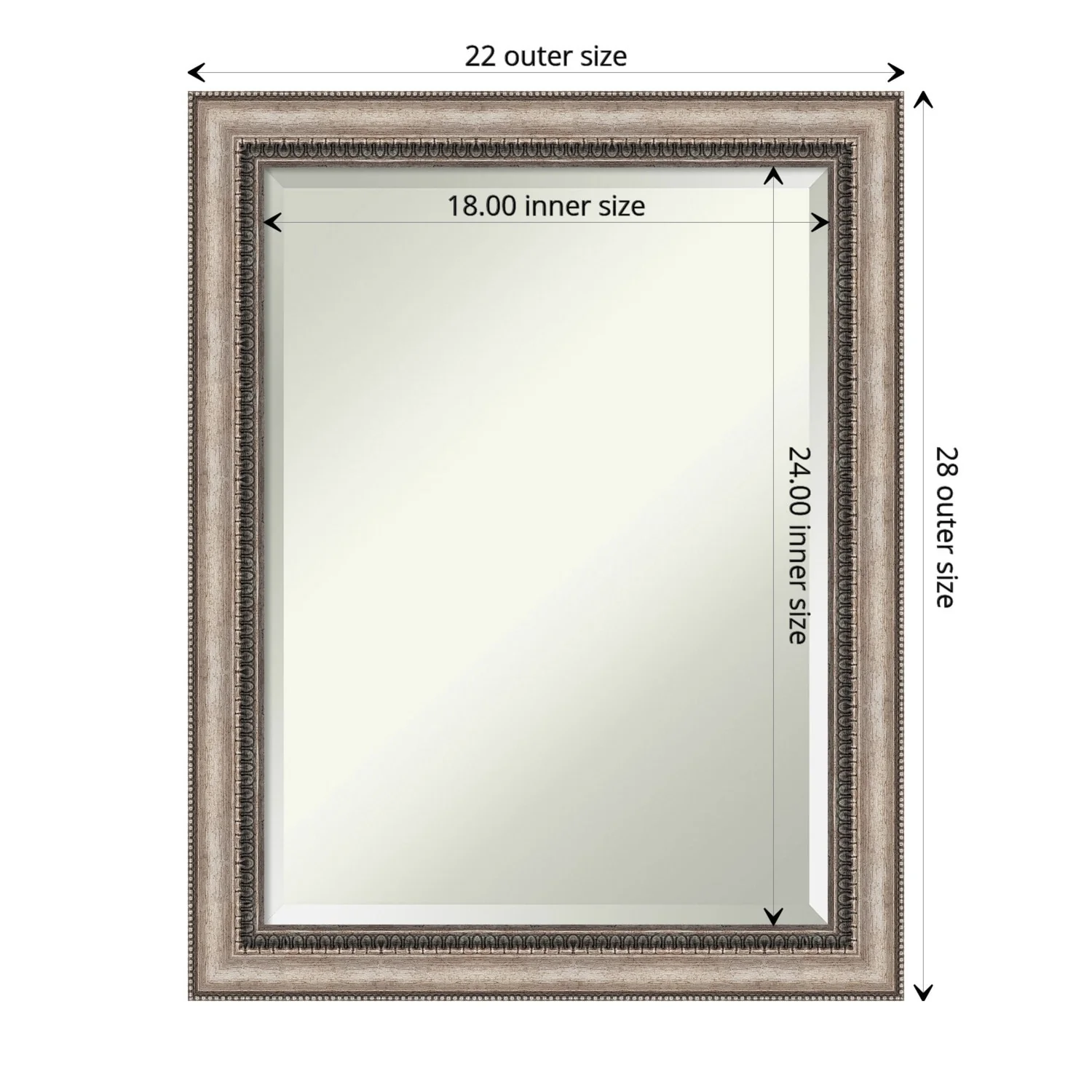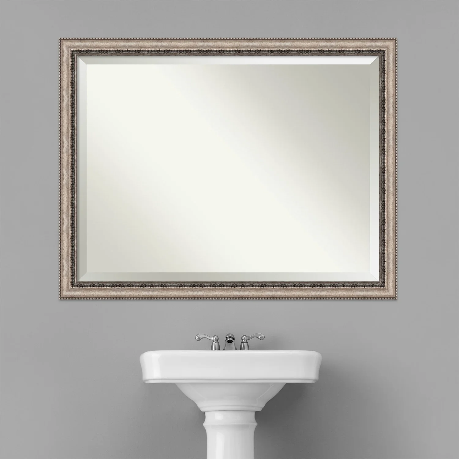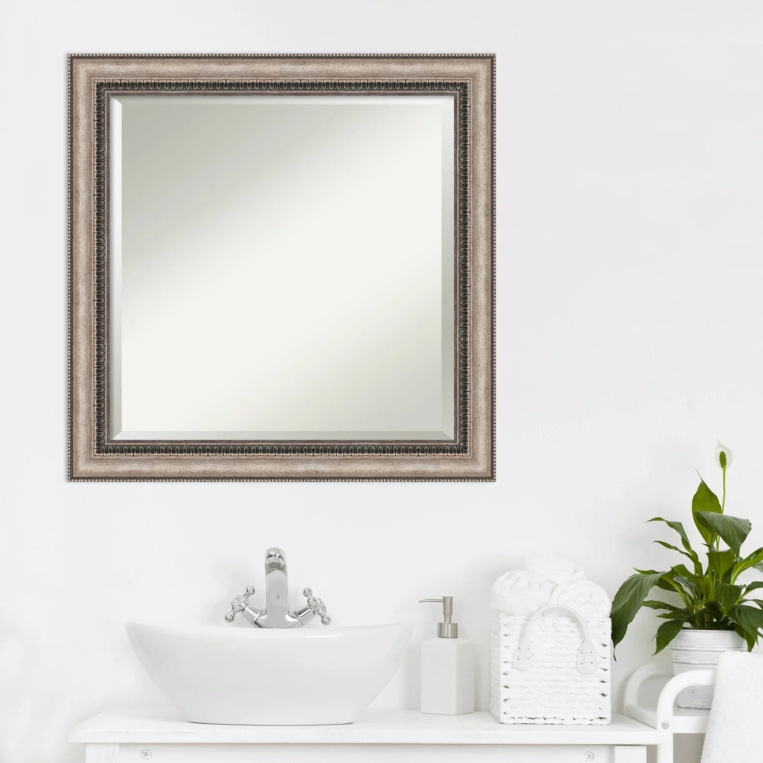 Add a touch of elegance to your bathroom with the Beveled Bathroom Wall Mirror in the Lyla Ornate Silver Frame. This premium mirror is individually crafted using traditional framing techniques and boasts exceptional quality, making it a showstopper in any space. The mirror features premium glass with a beveled edge, while the 2.25 inch wide Lyla Ornate Silver Frame adds an ornate and warm touch to your d茅cor. Hang it easily and securely with the included durable hardware. Assembled in Madison, WI USA, this mirror is a favorite of architects, interior designers, and homeowners alike.