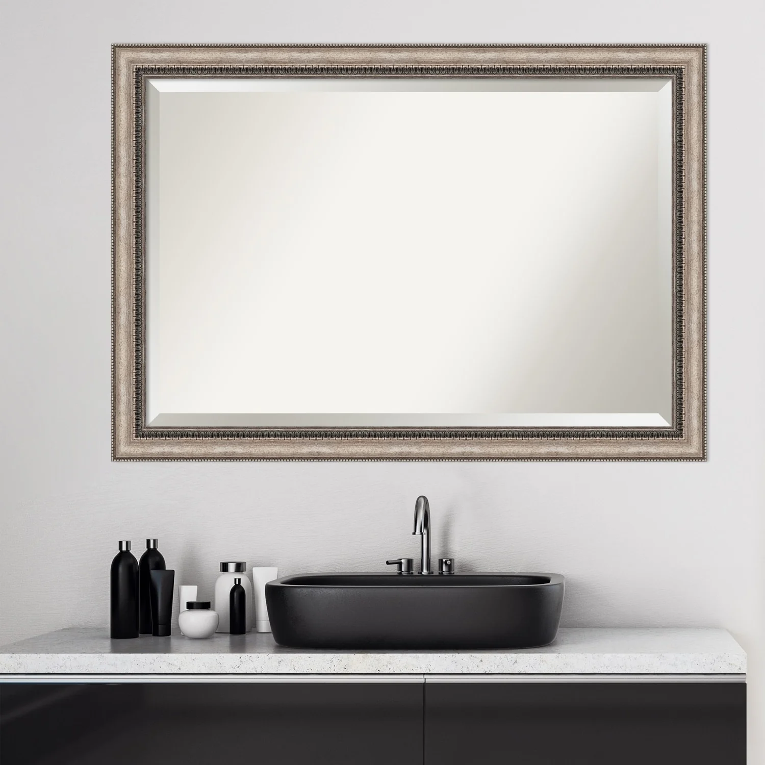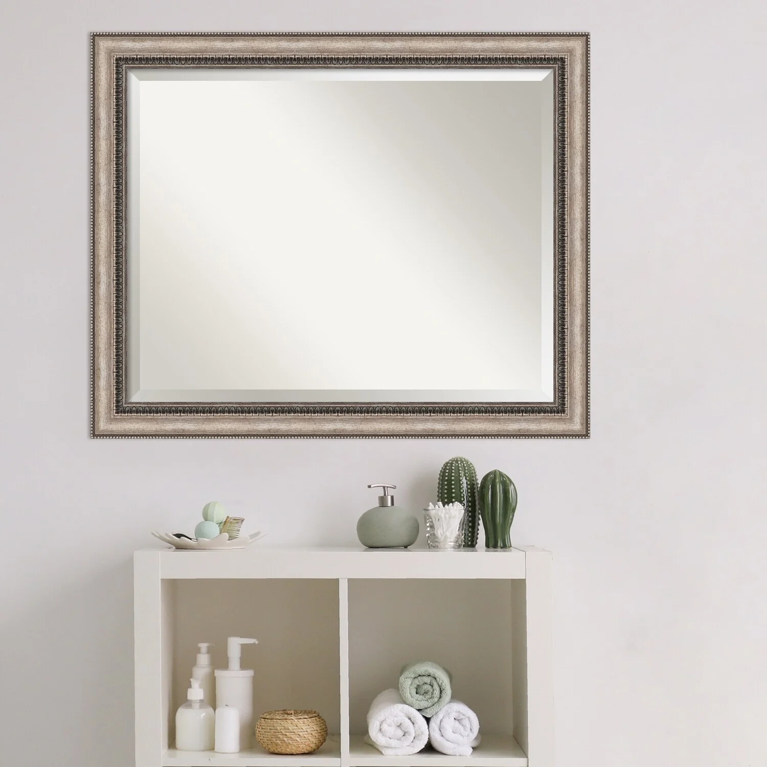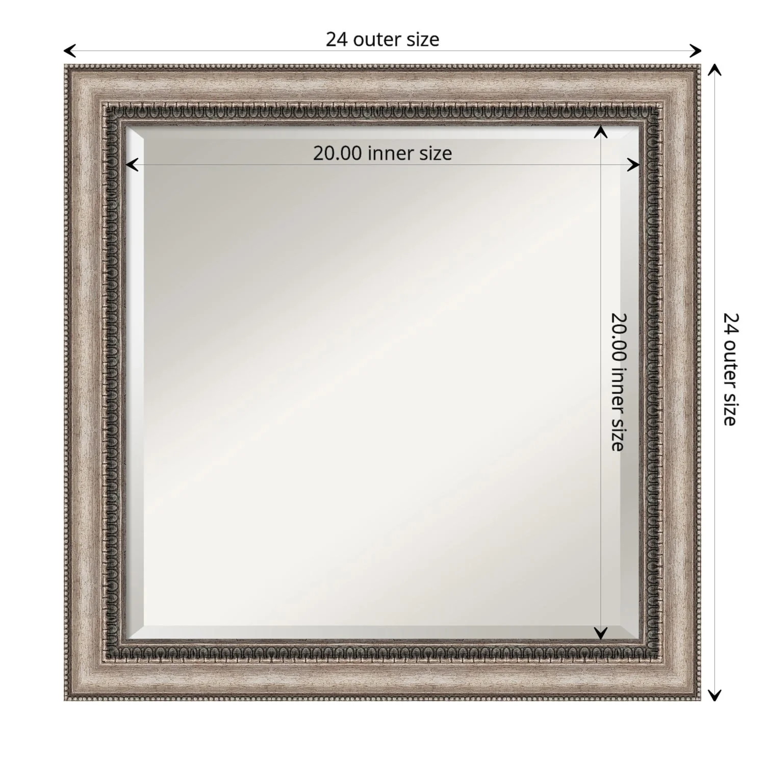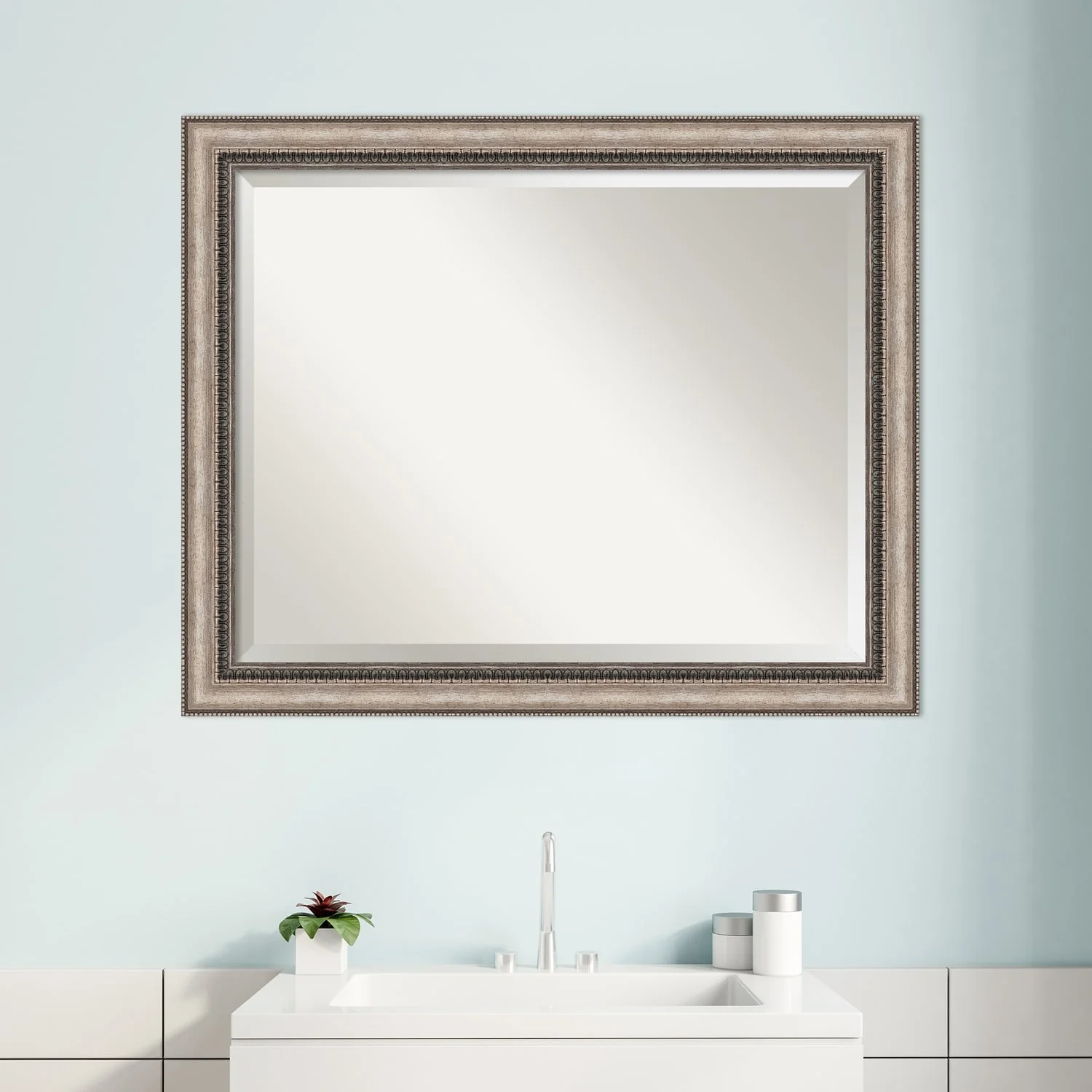Add a touch of elegance to your bathroom with the Beveled Bathroom Wall Mirror in the Lyla Ornate Silver Frame. This premium mirror is individually crafted using traditional framing techniques and boasts exceptional quality, making it a showstopper in any space. The mirror features premium glass with a beveled edge, while the 2.25 inch wide Lyla Ornate Silver Frame adds an ornate and warm touch to your d茅cor. Hang it easily and securely with the included durable hardware. Assembled in Madison, WI USA, this mirror is a favorite of architects, interior designers, and homeowners alike.