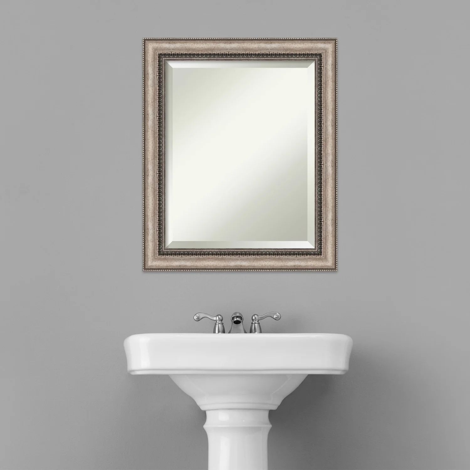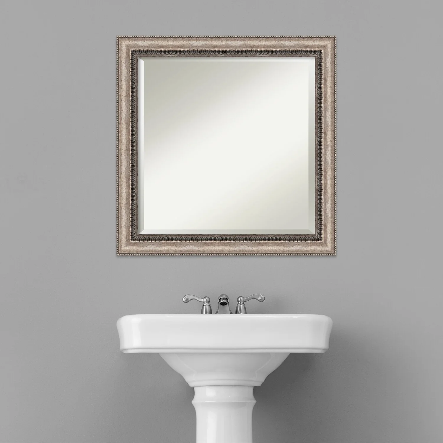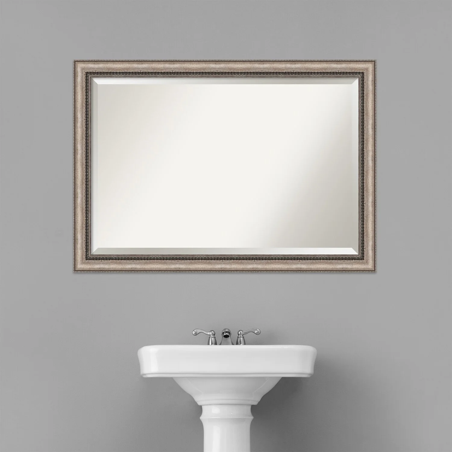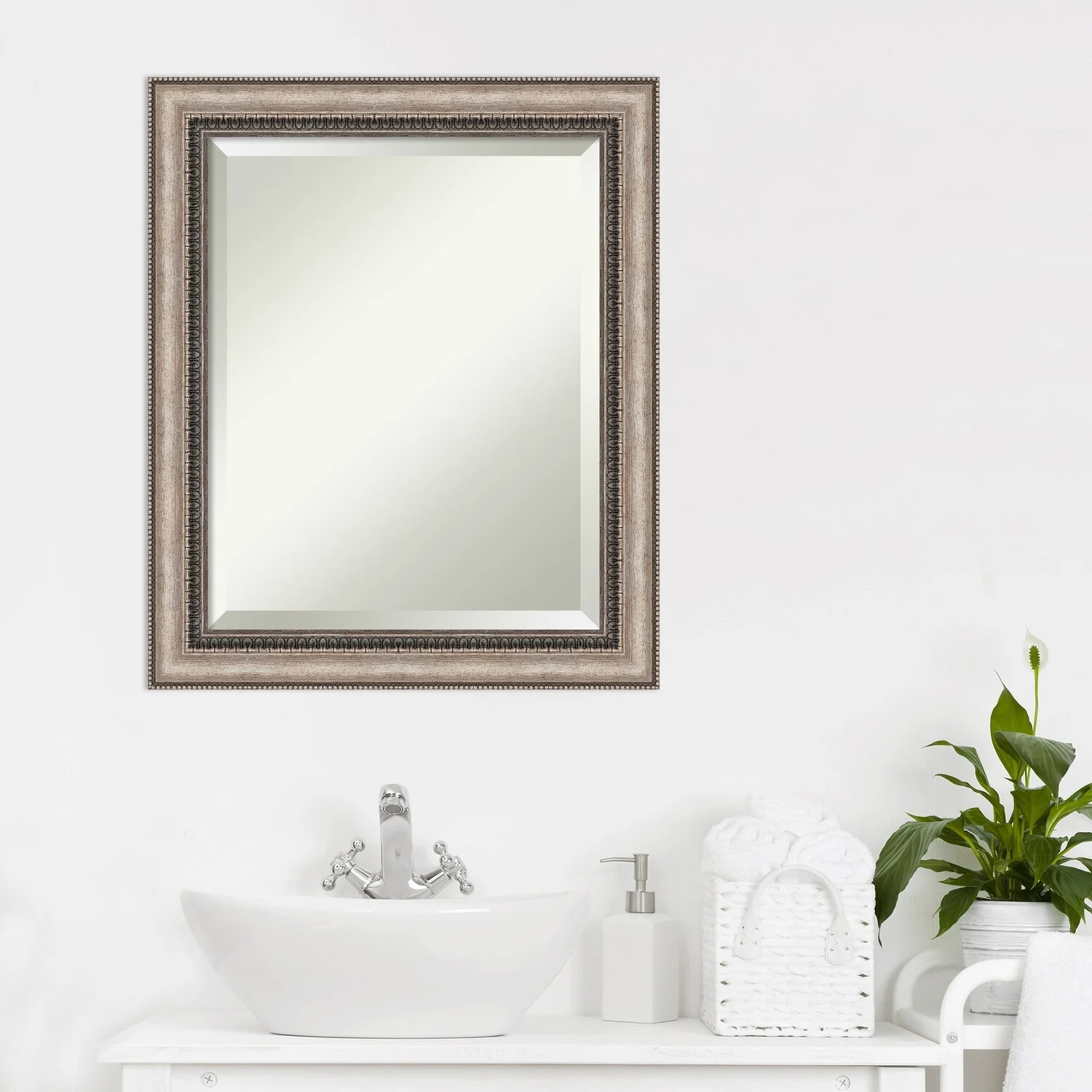 Add a touch of elegance to your bathroom with the Beveled Bathroom Wall Mirror in the Lyla Ornate Silver Frame. This premium mirror is individually crafted using traditional framing techniques and boasts exceptional quality, making it a showstopper in any space. The mirror features premium glass with a beveled edge, while the 2.25 inch wide Lyla Ornate Silver Frame adds an ornate and warm touch to your d茅cor. Hang it easily and securely with the included durable hardware. Assembled in Madison, WI USA, this mirror is a favorite of architects, interior designers, and homeowners alike.