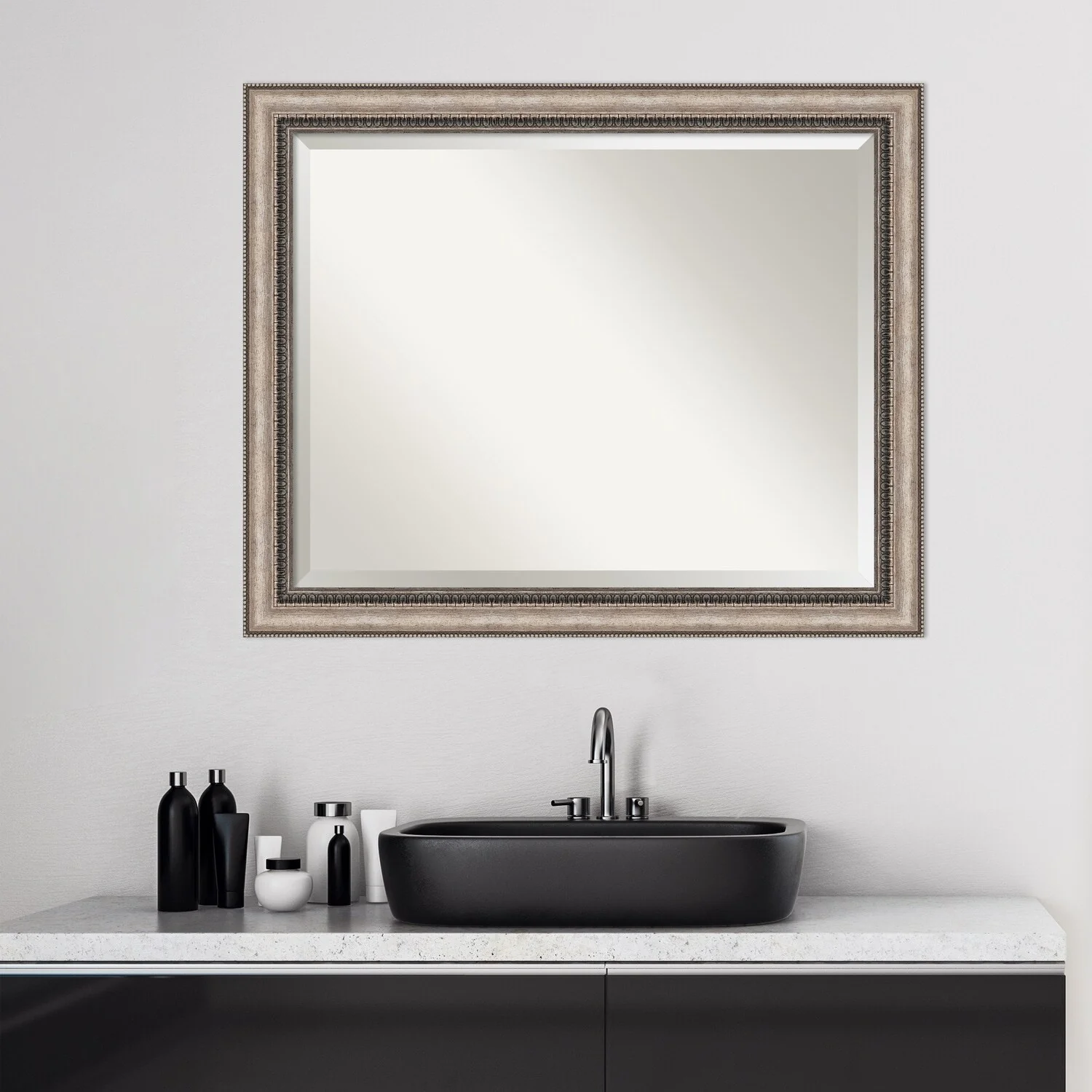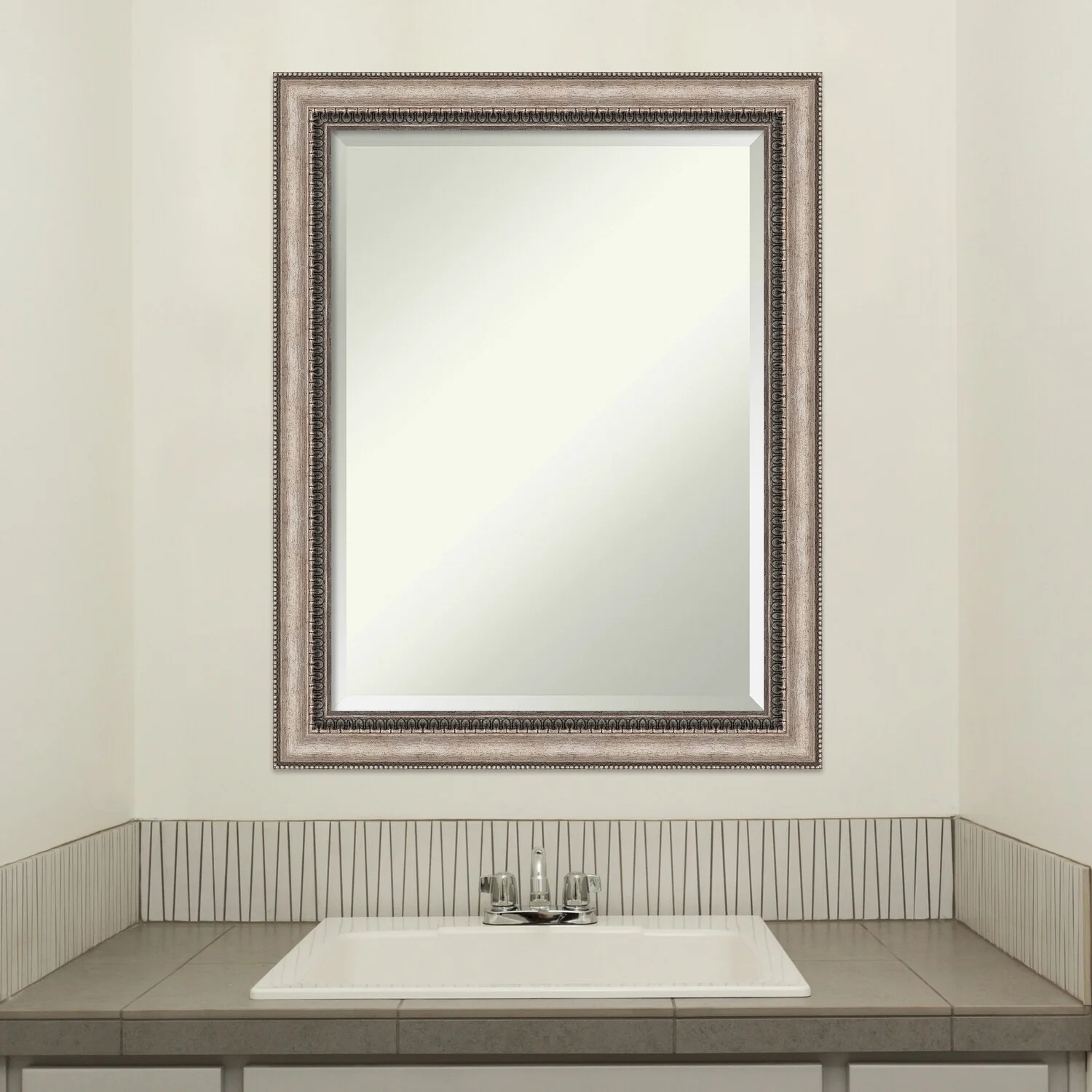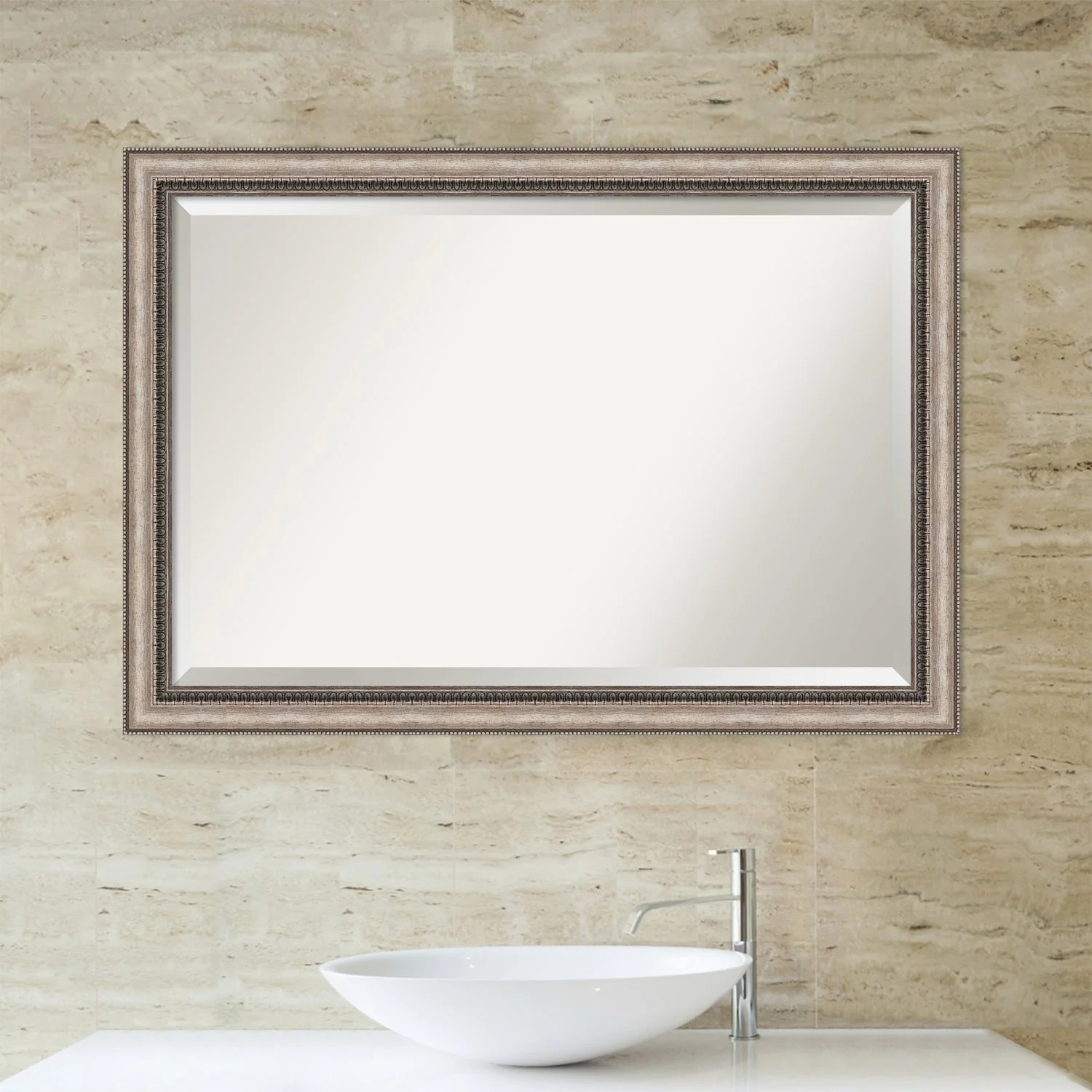 Add a touch of elegance to your bathroom with the Beveled Bathroom Wall Mirror in the Lyla Ornate Silver Frame. This premium mirror is individually crafted using traditional framing techniques and boasts exceptional quality, making it a showstopper in any space. The mirror features premium glass with a beveled edge, while the 2.25 inch wide Lyla Ornate Silver Frame adds an ornate and warm touch to your d茅cor. Hang it easily and securely with the included durable hardware. Assembled in Madison, WI USA, this mirror is a favorite of architects, interior designers, and homeowners alike.