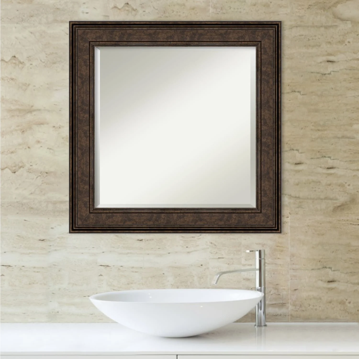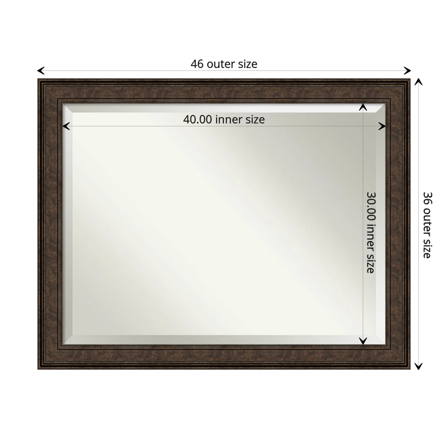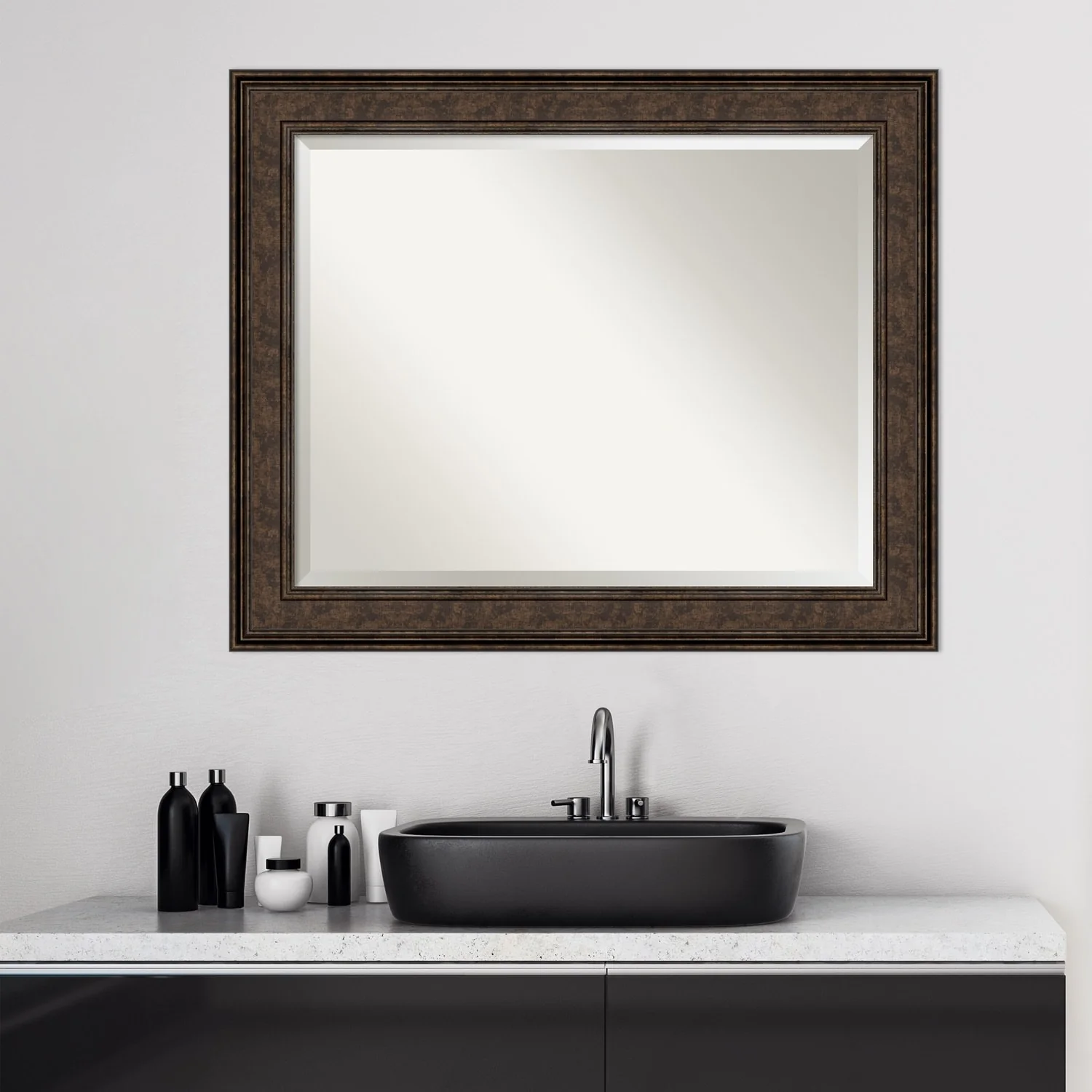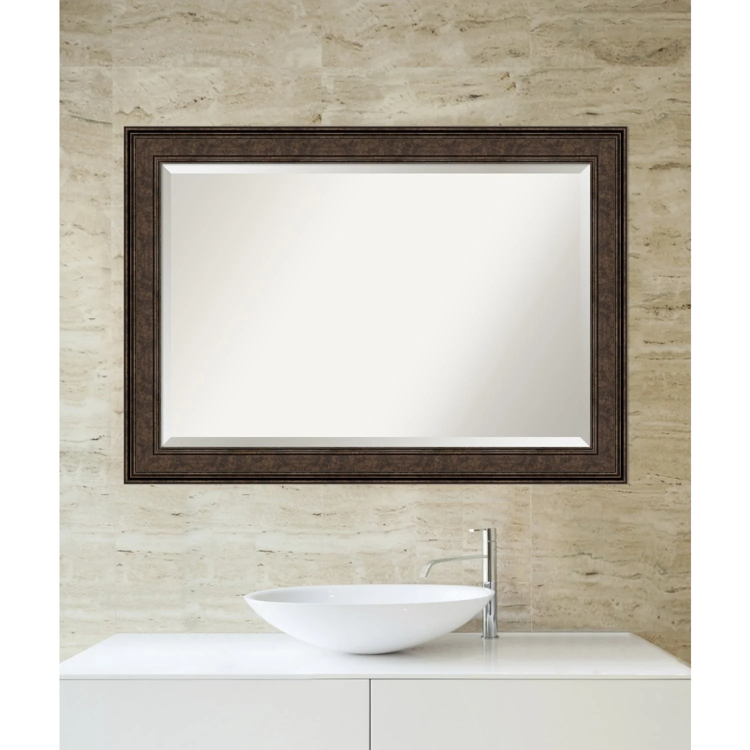 Add the perfect finishing touch to your bathroom with this Beveled Wall Mirror framed with the Ridge Bronze frame. Individually crafted using traditional custom framing techniques, it boasts the quality you would expect from your local frame shop. The premium finishing and clear, undistorted image of the mirror make it a valuable addition to your space.