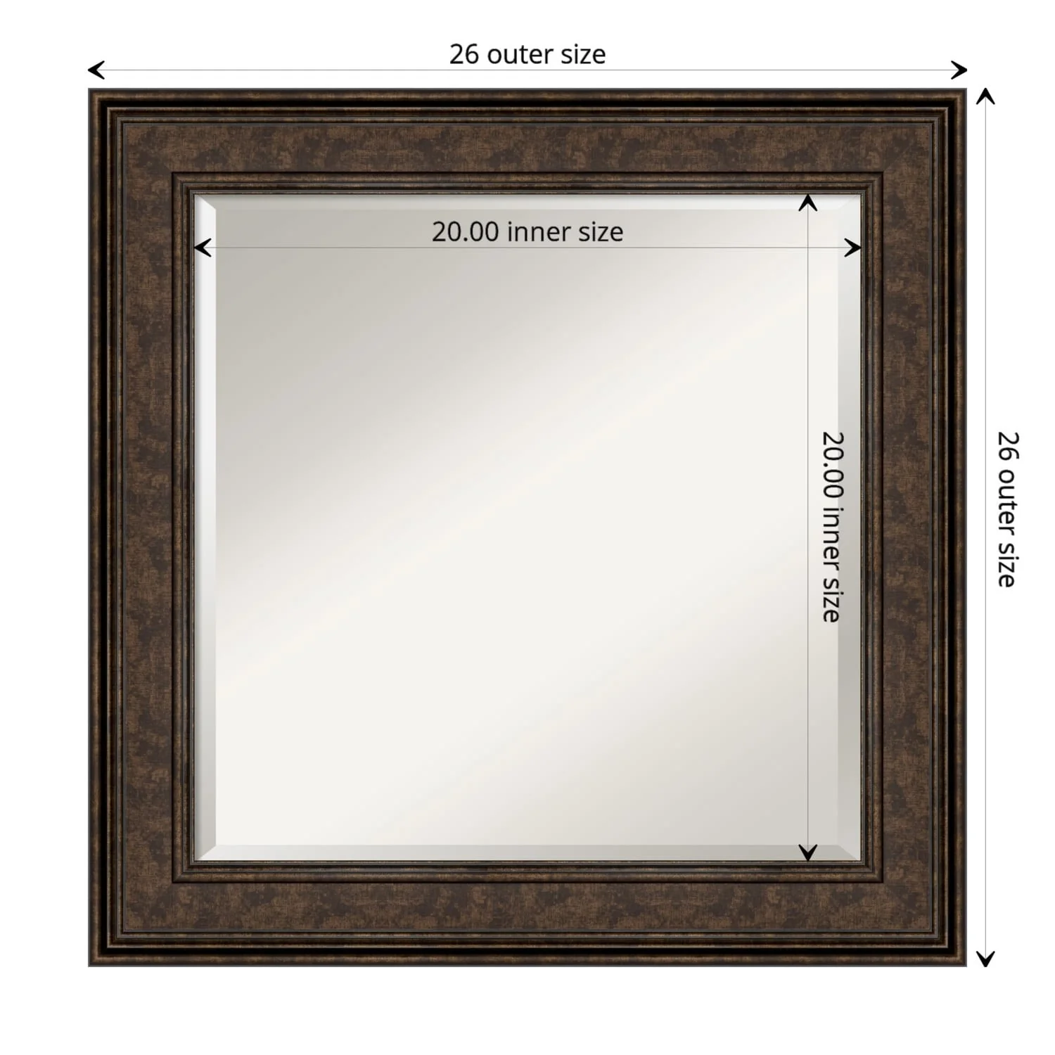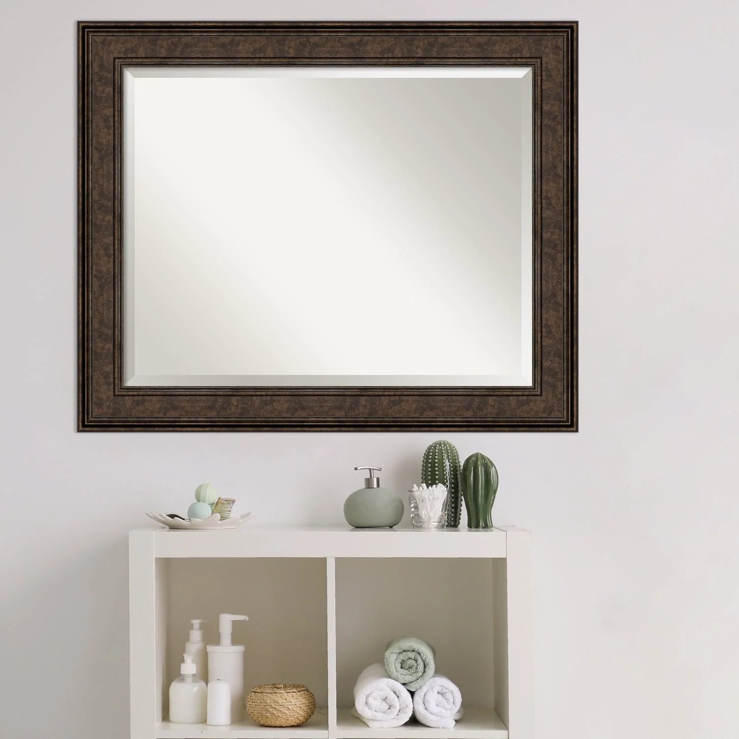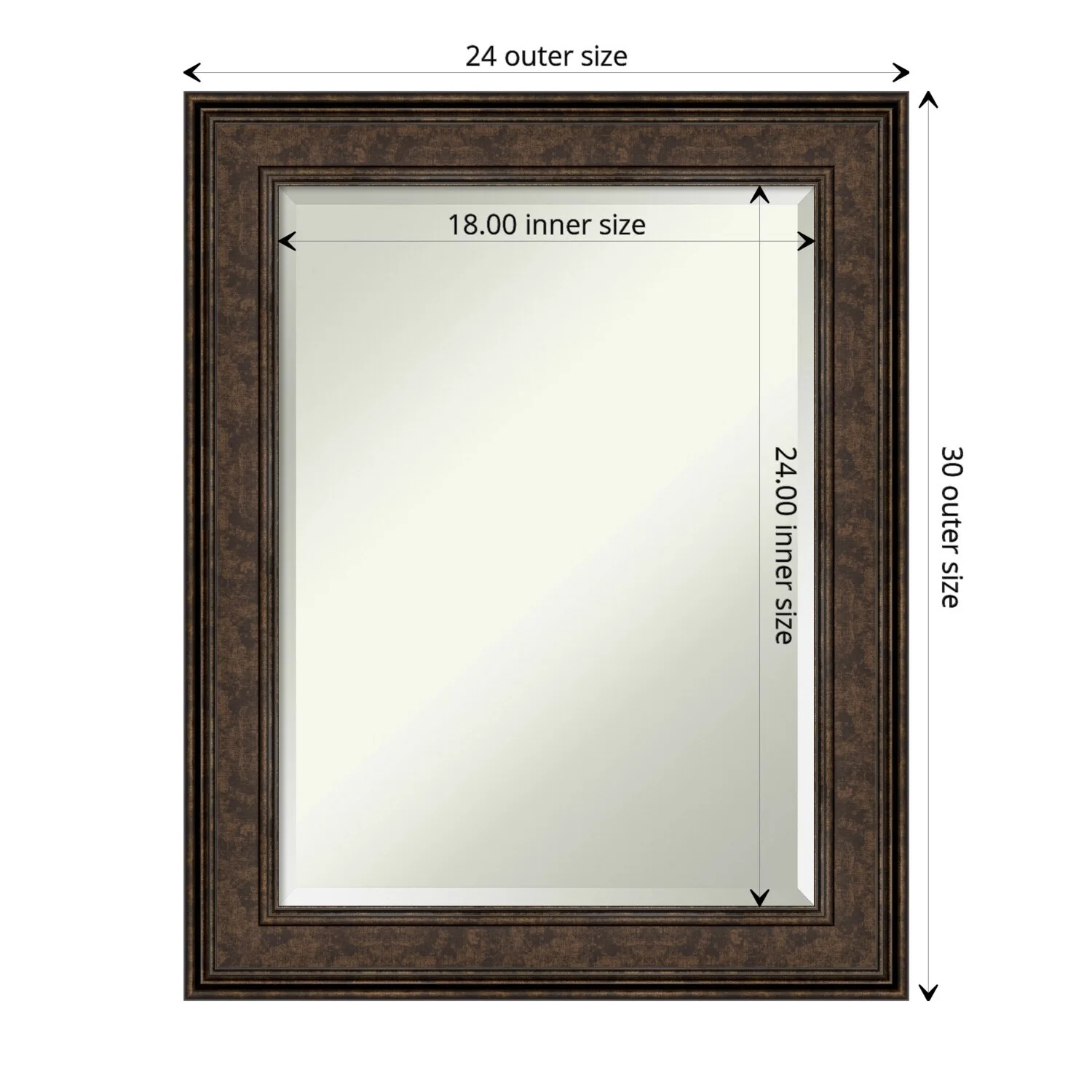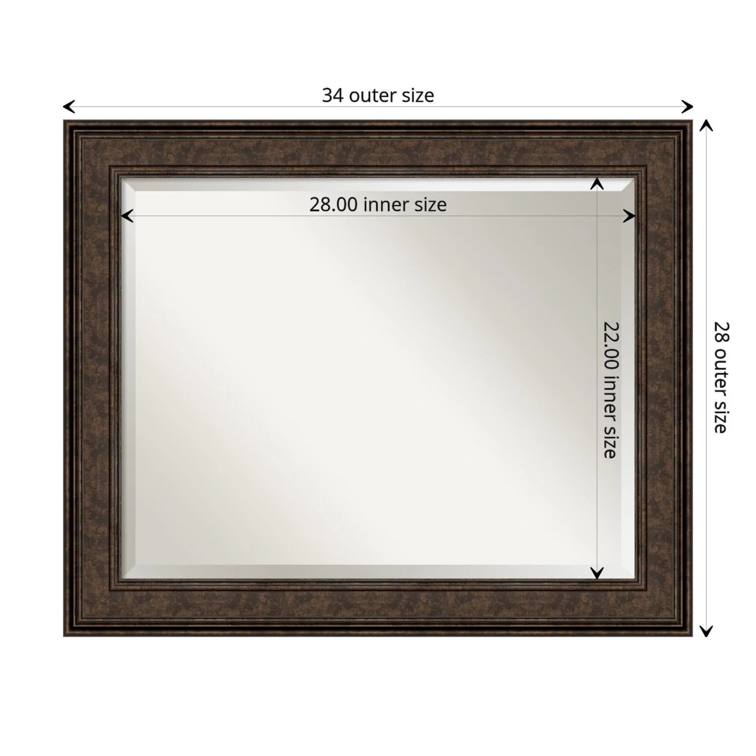 Add the perfect finishing touch to your bathroom with this Beveled Wall Mirror framed with the Ridge Bronze frame. Individually crafted using traditional custom framing techniques, it boasts the quality you would expect from your local frame shop. The premium finishing and clear, undistorted image of the mirror make it a valuable addition to your space.