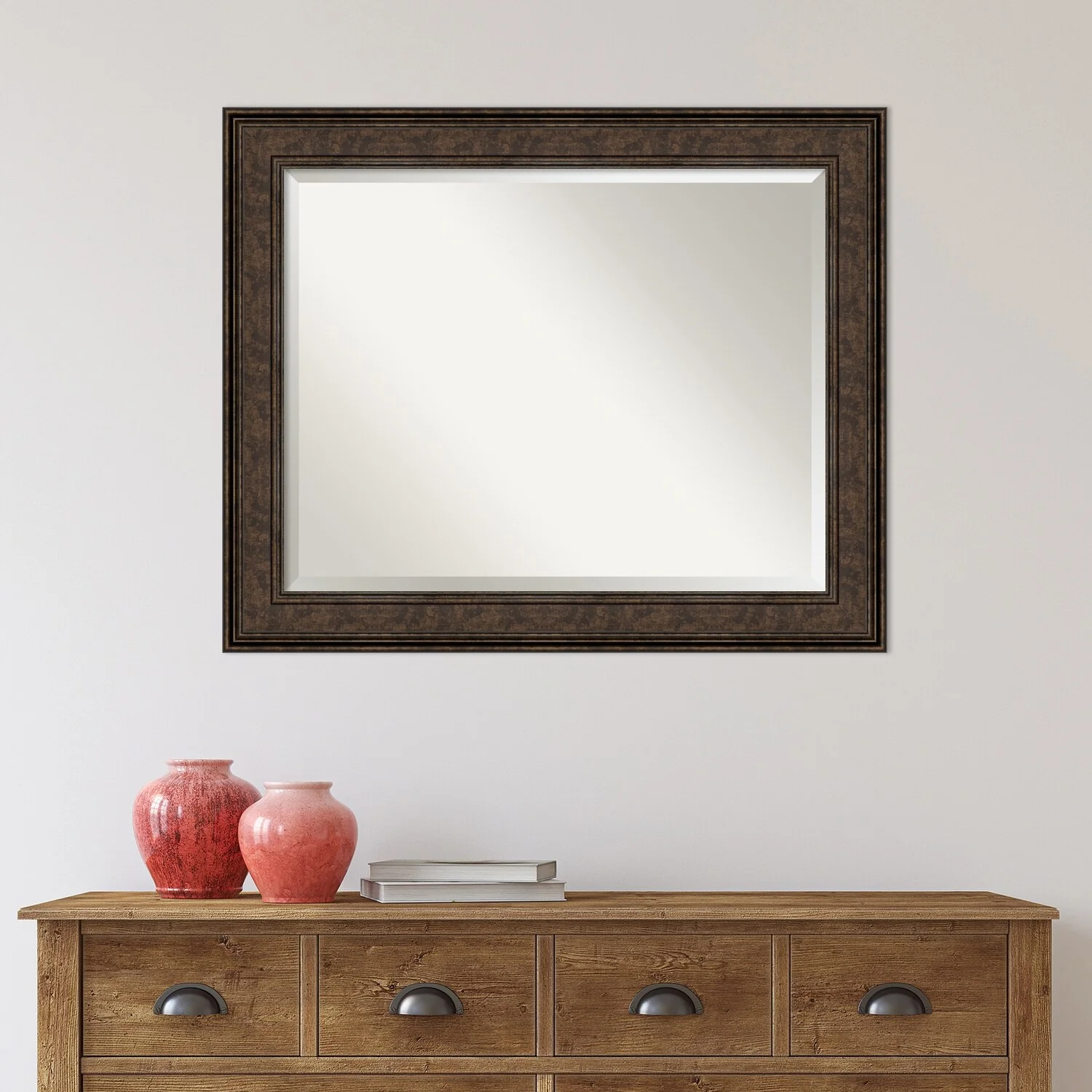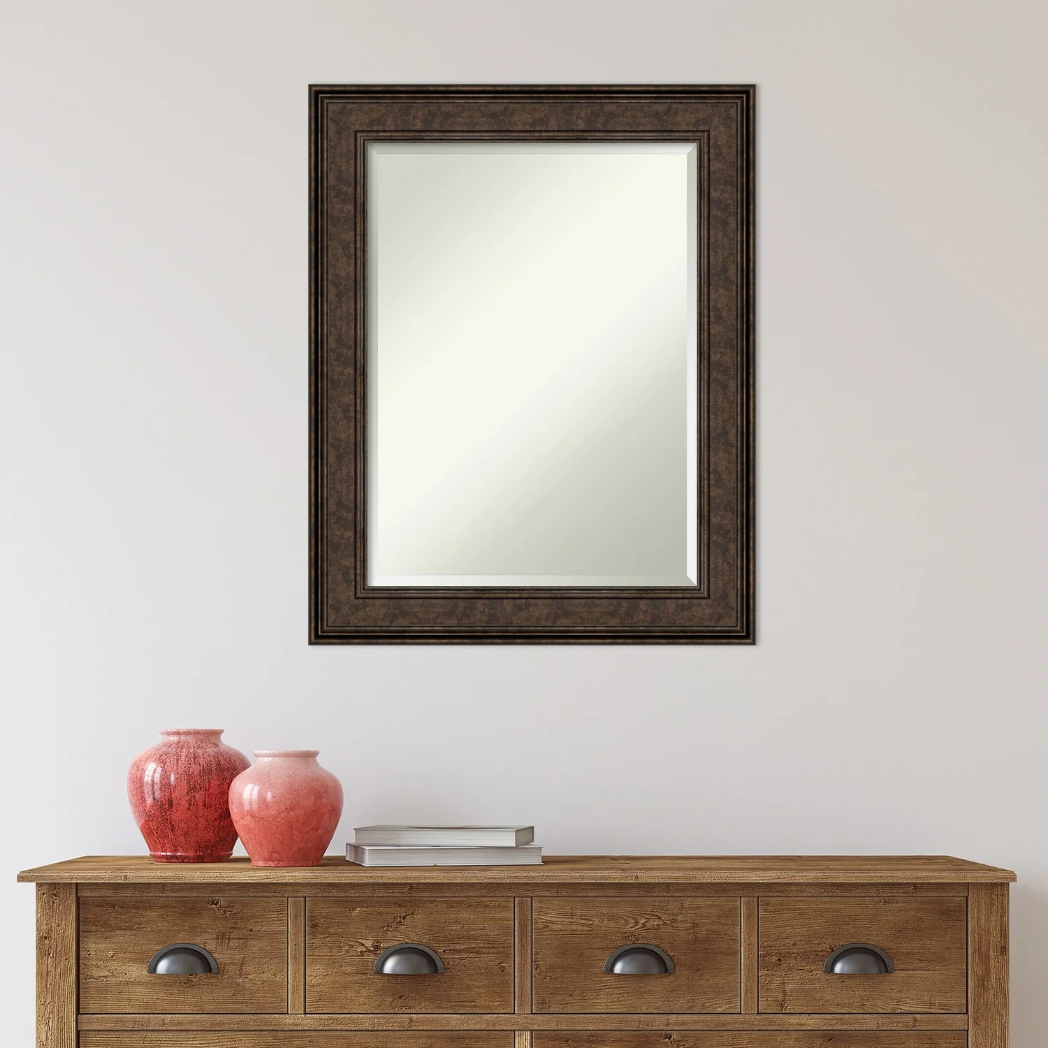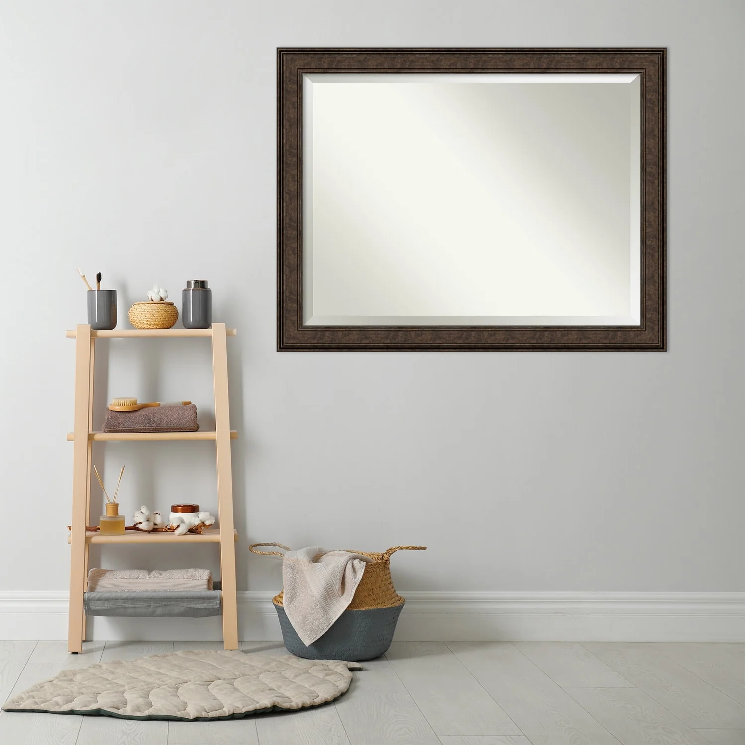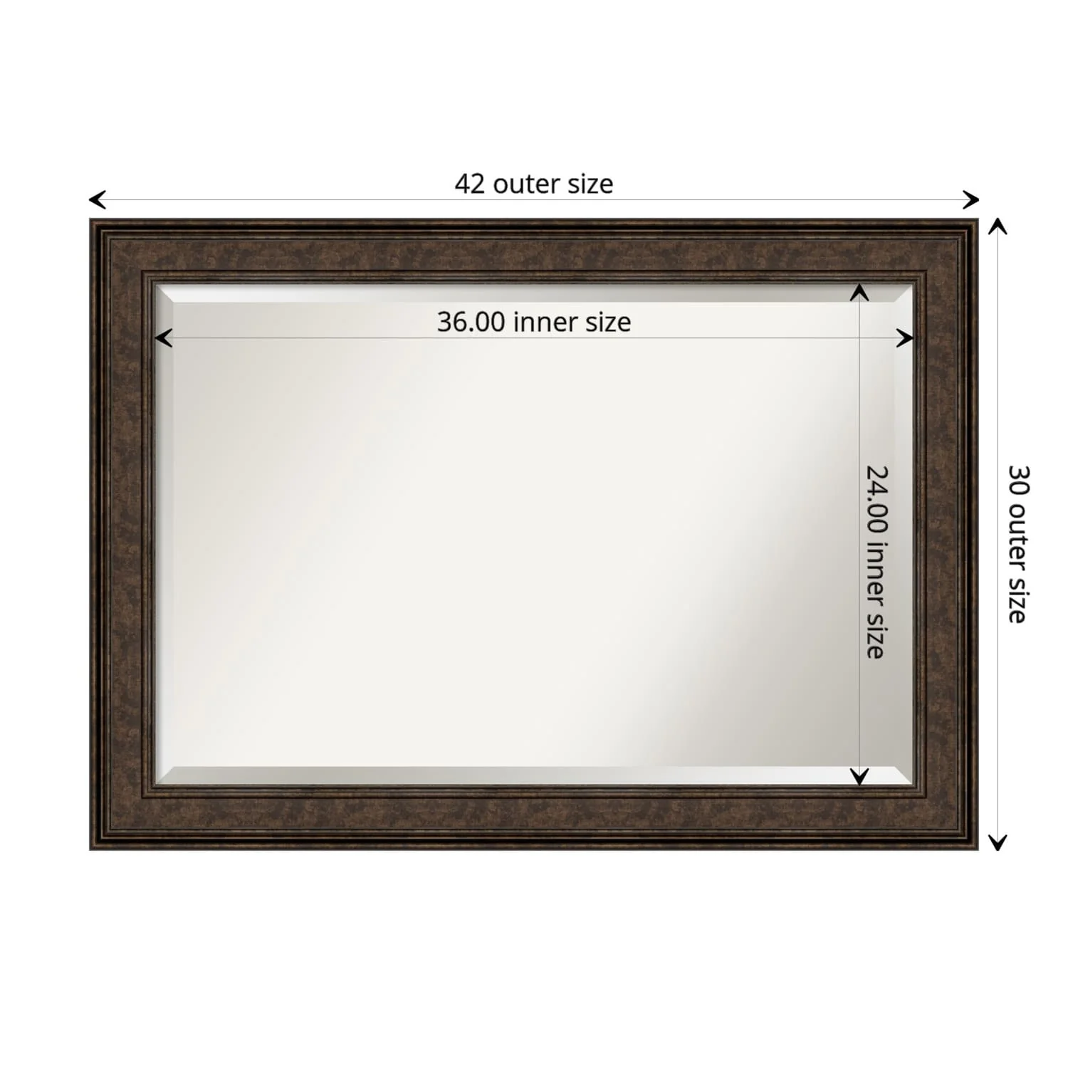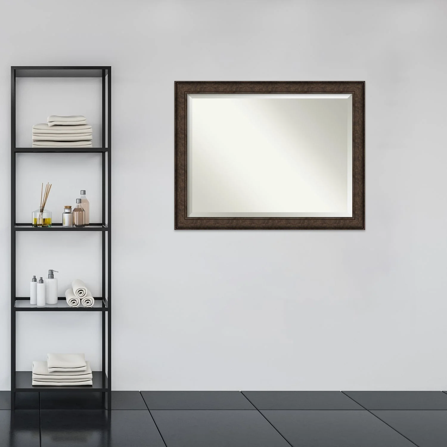 Add the perfect finishing touch to your bathroom with this Beveled Wall Mirror framed with the Ridge Bronze frame. Individually crafted using traditional custom framing techniques, it boasts the quality you would expect from your local frame shop. The premium finishing and clear, undistorted image of the mirror make it a valuable addition to your space.