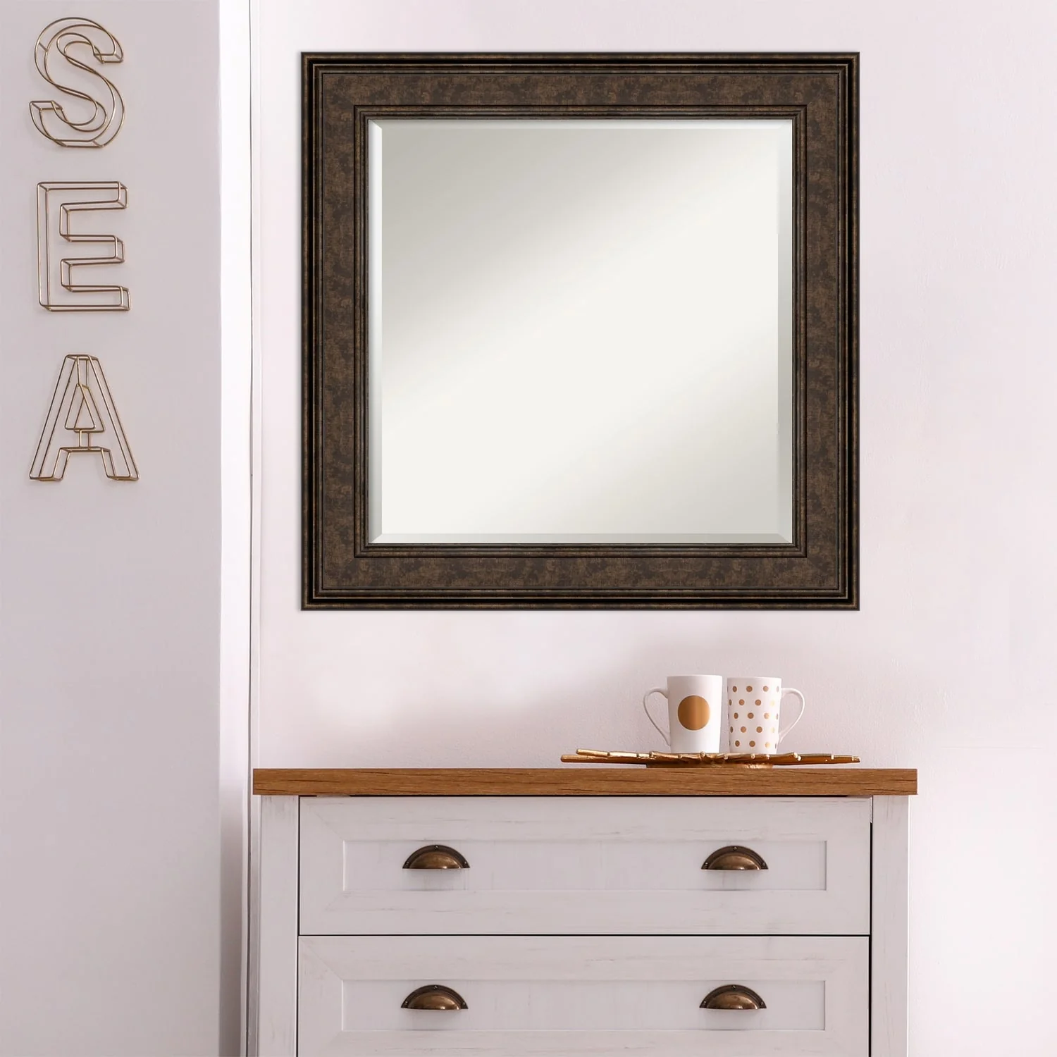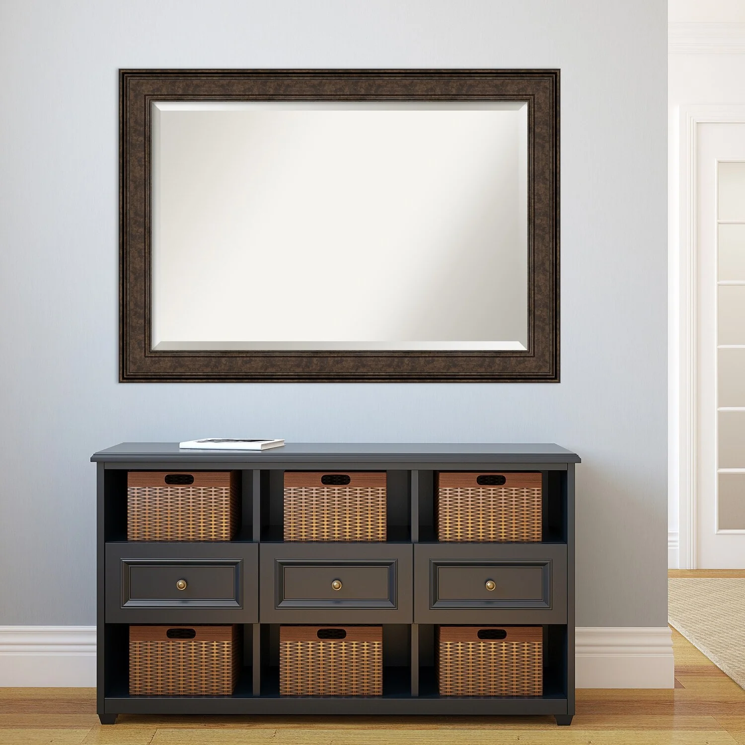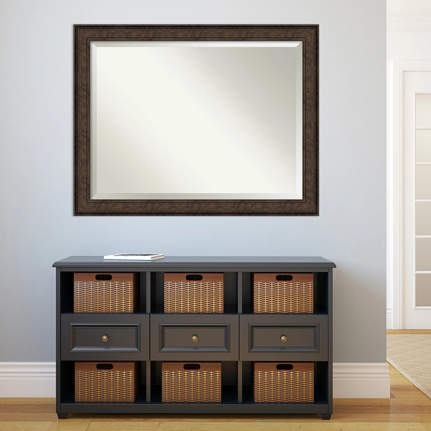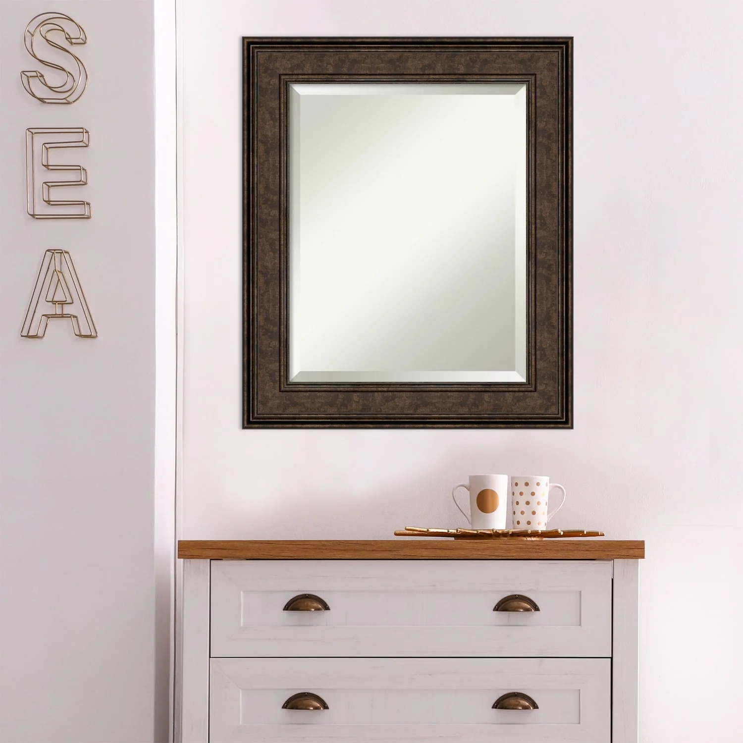 Add the perfect finishing touch to your bathroom with this Beveled Wall Mirror framed with the Ridge Bronze frame. Individually crafted using traditional custom framing techniques, it boasts the quality you would expect from your local frame shop. The premium finishing and clear, undistorted image of the mirror make it a valuable addition to your space.
