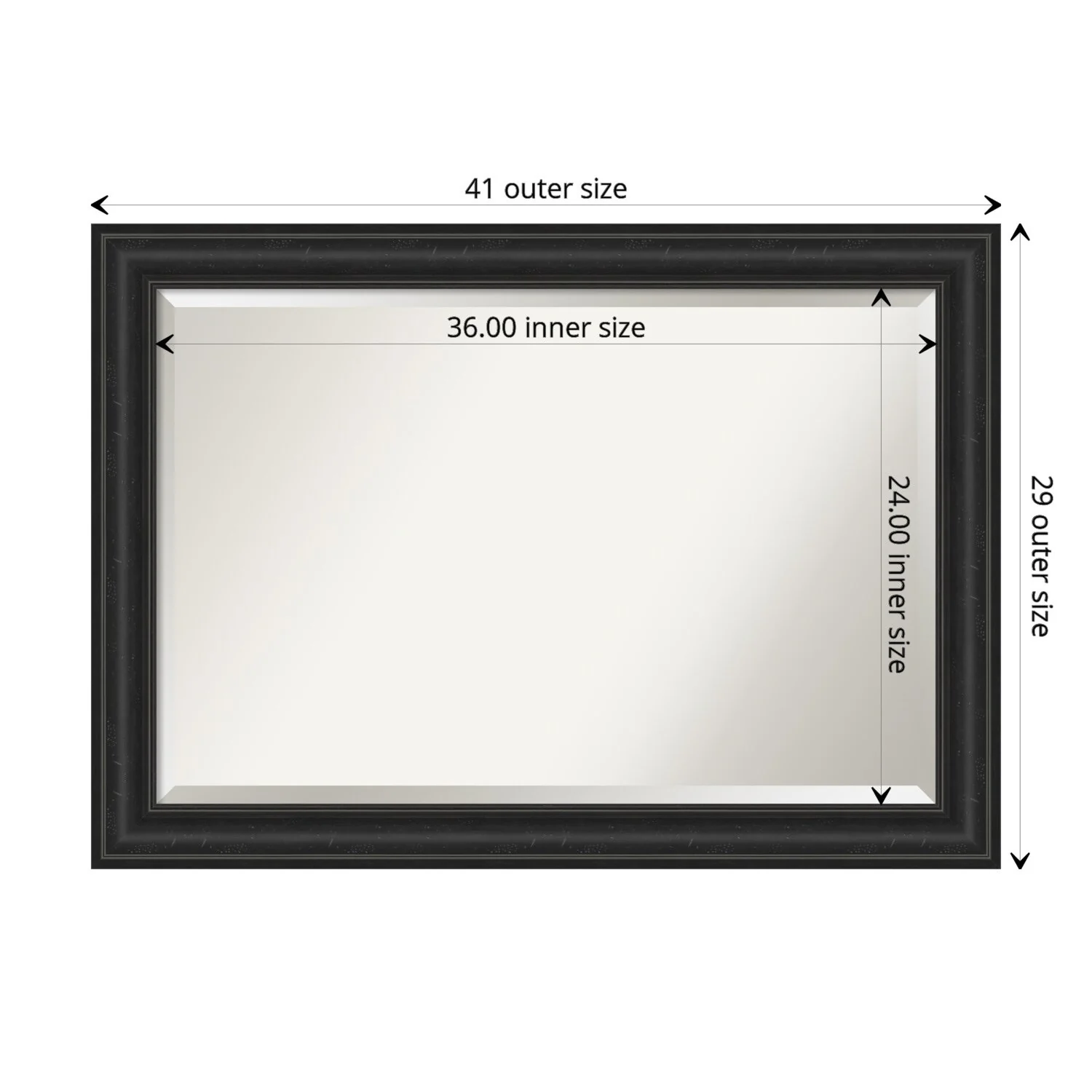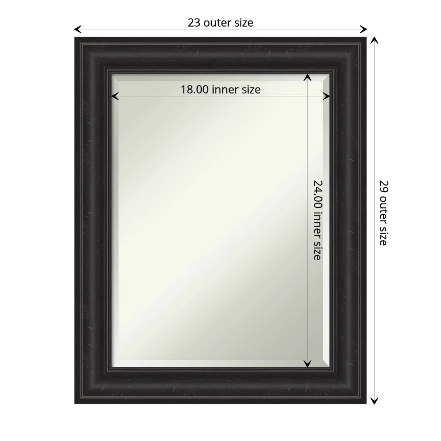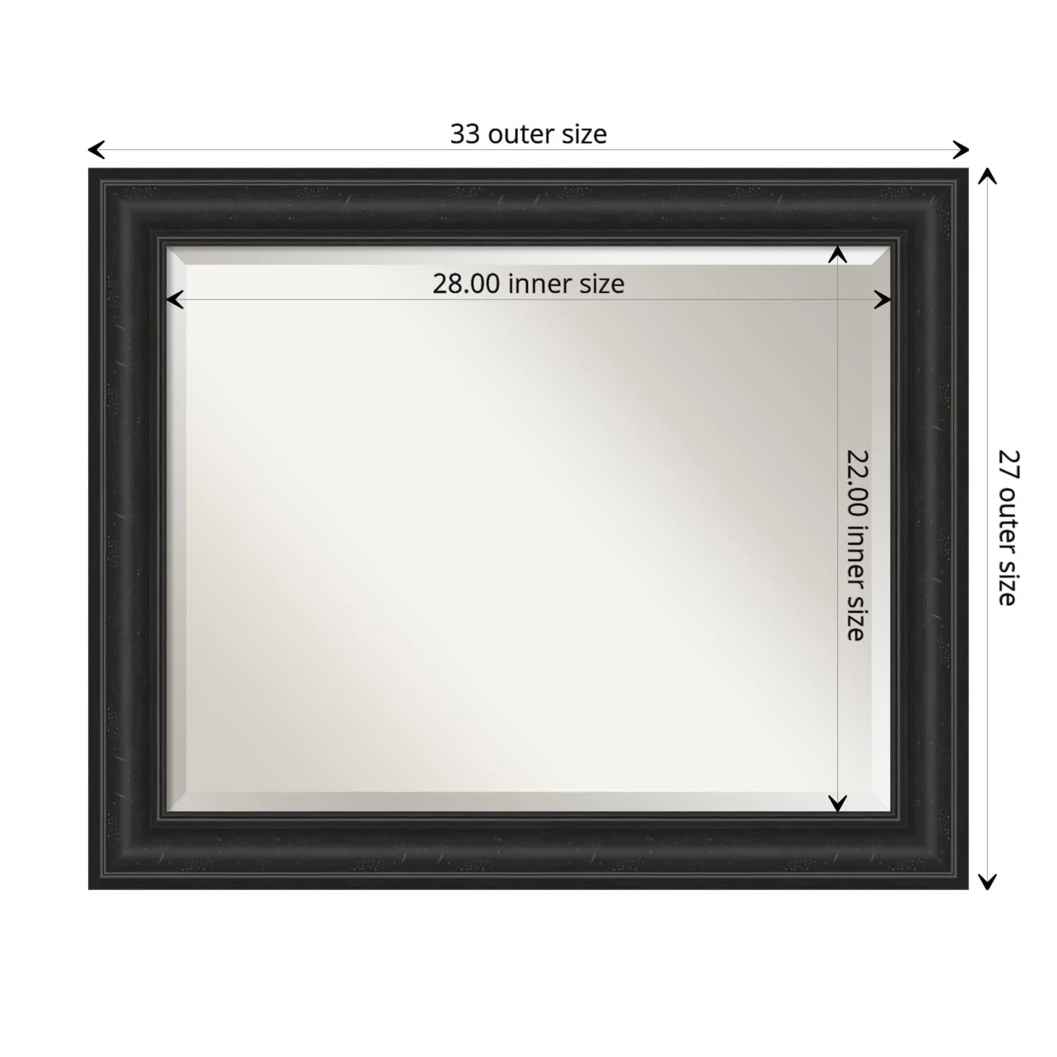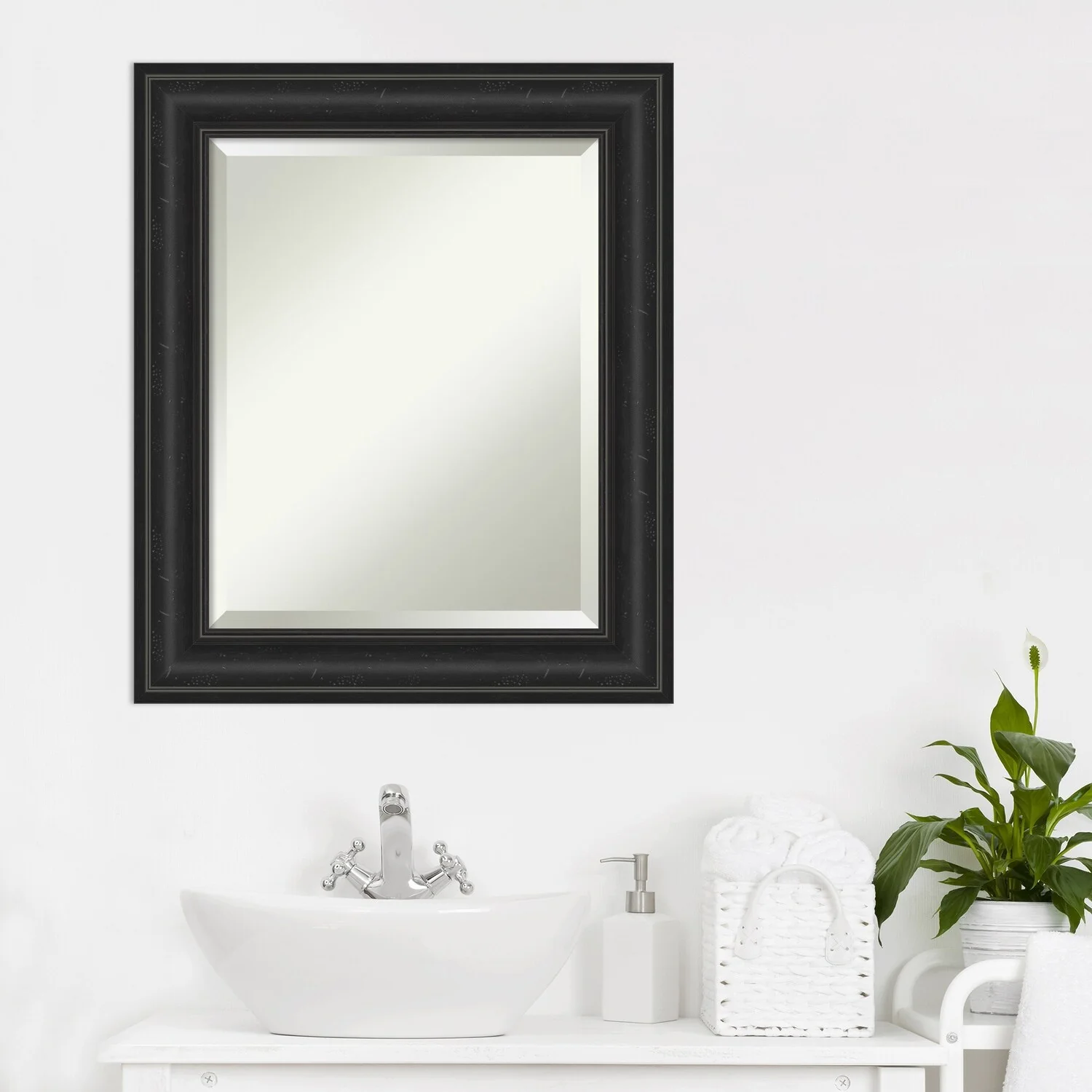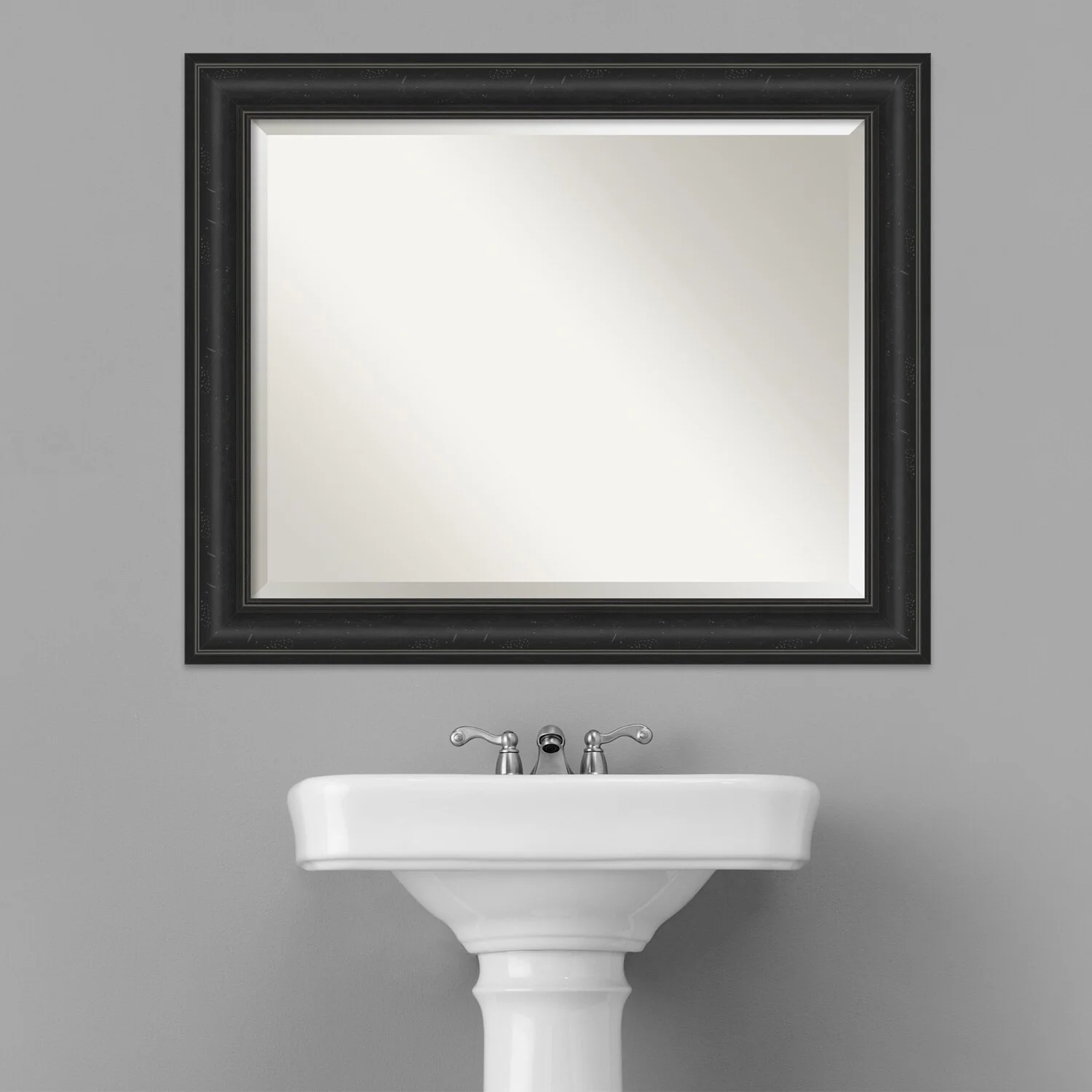 Add a touch of sophistication to your bathroom with the Beveled Bathroom Wall Mirror in a Shipwreck Black Frame. The premium glass and beveled edge provide a clear and undistorted reflection, while the wide, distressed black frame with a grey wash and weathered pockmark details adds a touch of rustic charm. This wall mirror comes with durable hanging hardware attached to the back for hassle-free vertical or horizontal installation. Proudly assembled in the USA, this mirror is perfect for both home and commercial use.