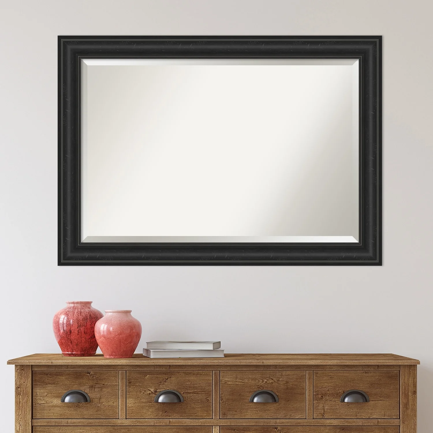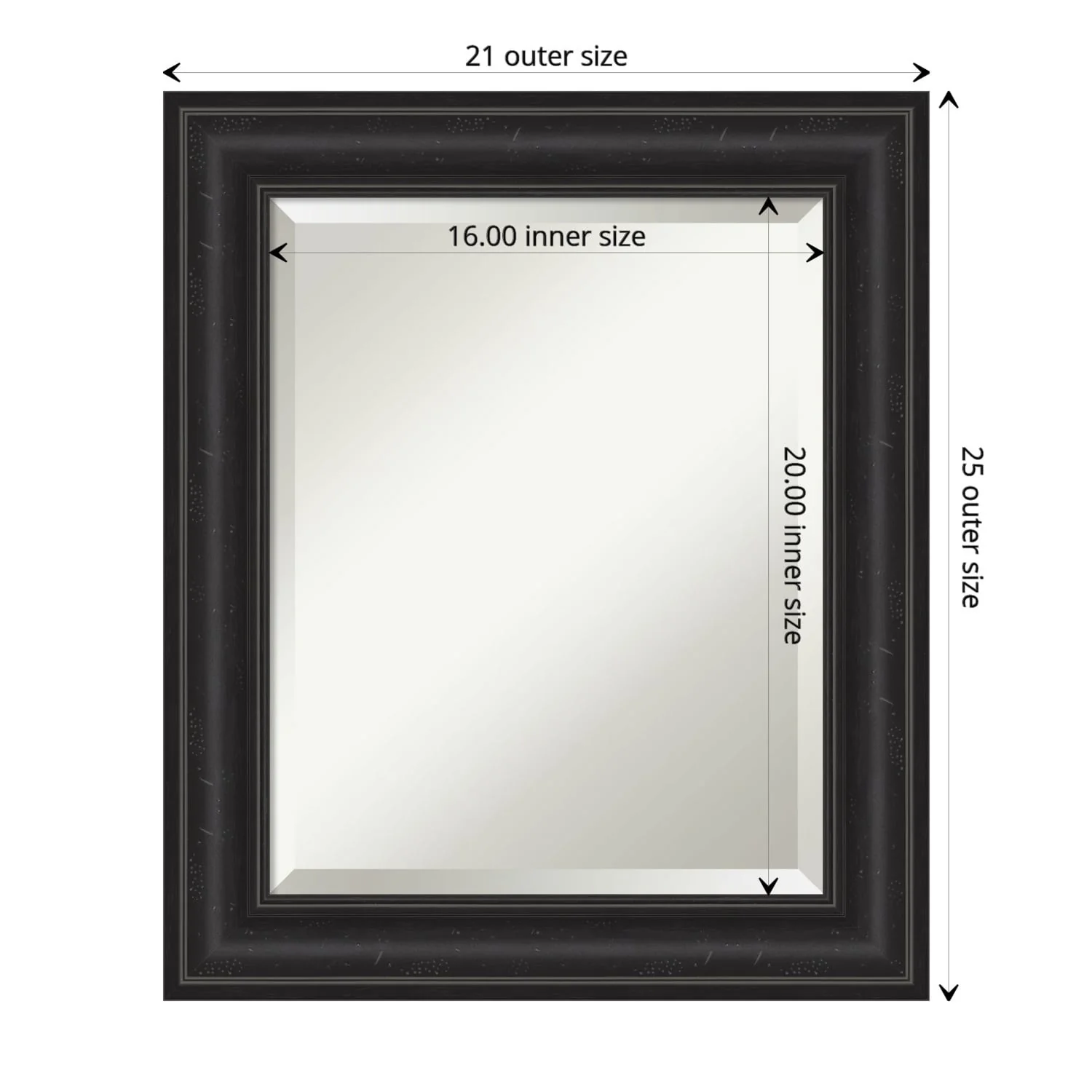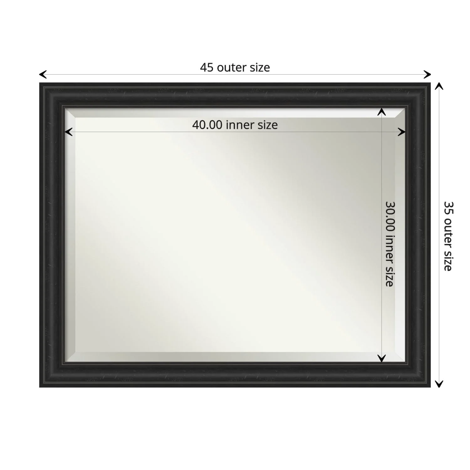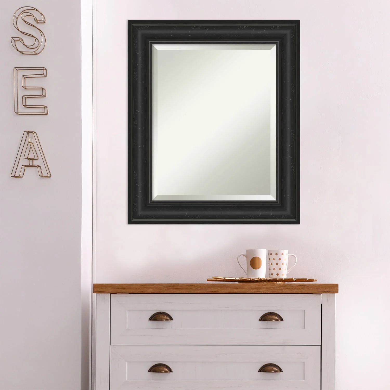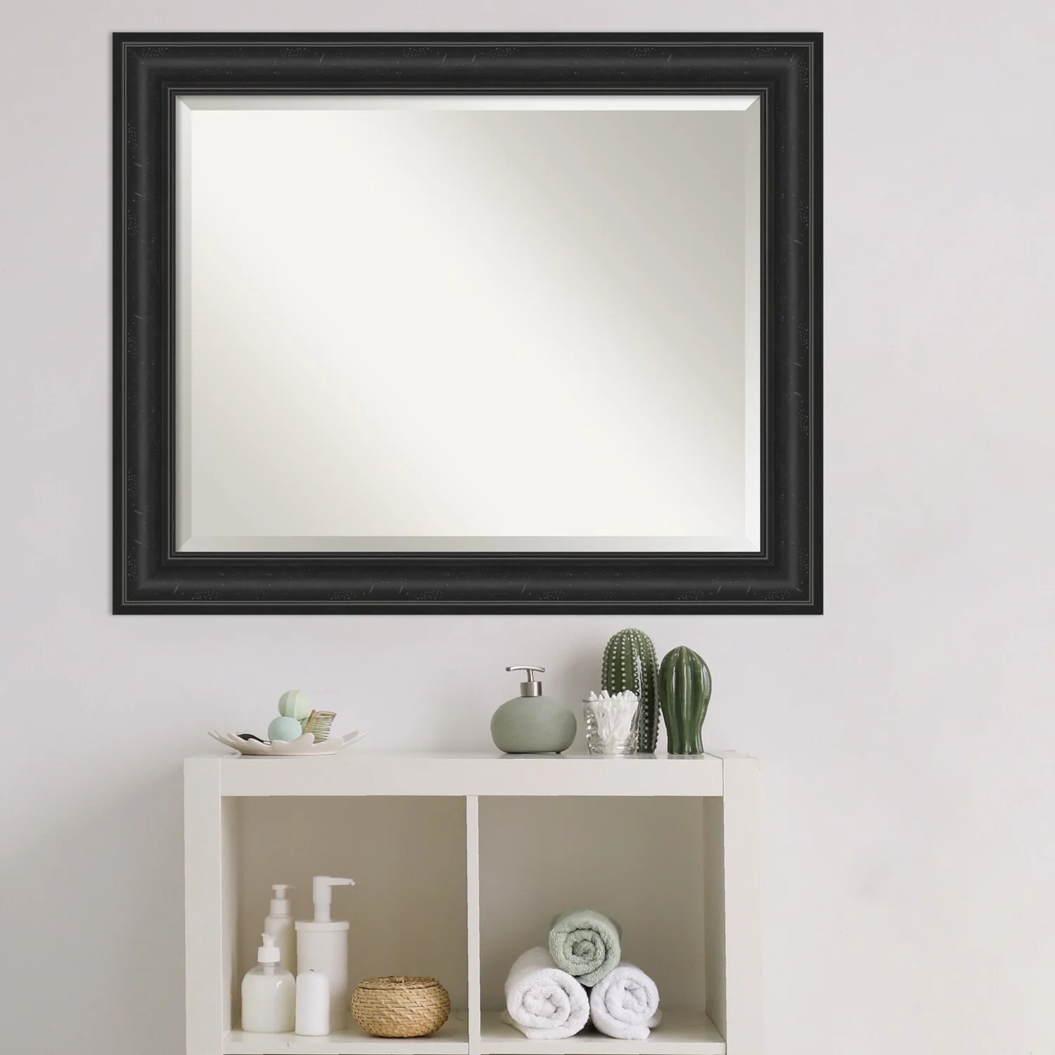 Add a touch of sophistication to your bathroom with the Beveled Bathroom Wall Mirror in a Shipwreck Black Frame. The premium glass and beveled edge provide a clear and undistorted reflection, while the wide, distressed black frame with a grey wash and weathered pockmark details adds a touch of rustic charm. This wall mirror comes with durable hanging hardware attached to the back for hassle-free vertical or horizontal installation. Proudly assembled in the USA, this mirror is perfect for both home and commercial use.