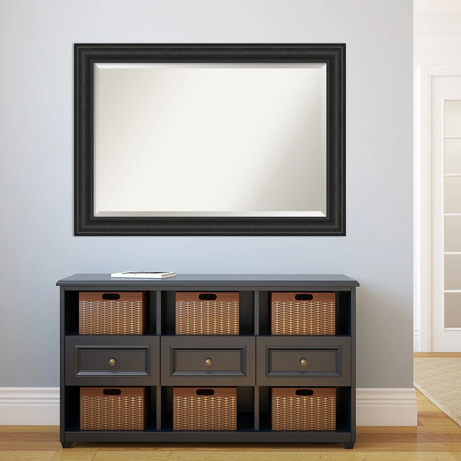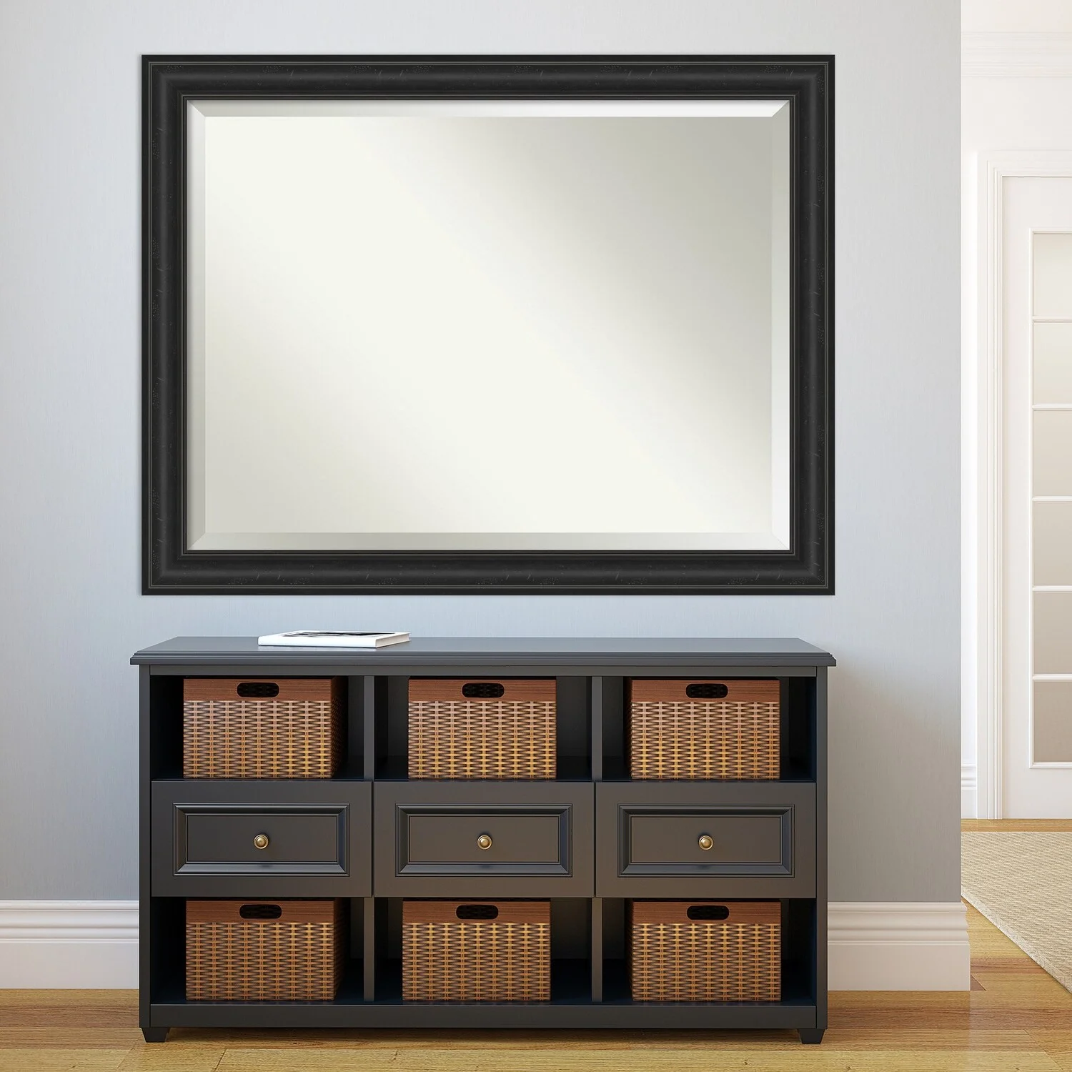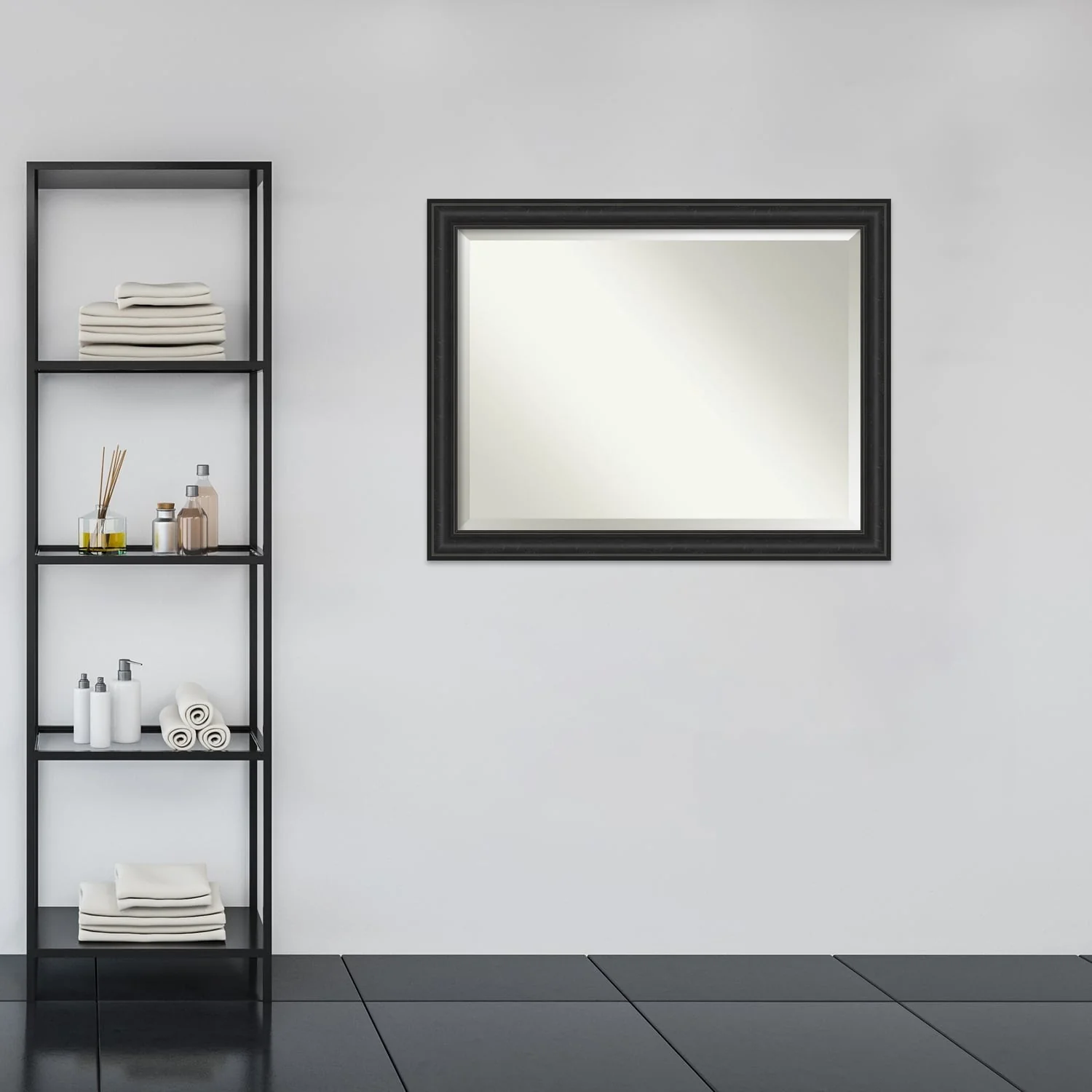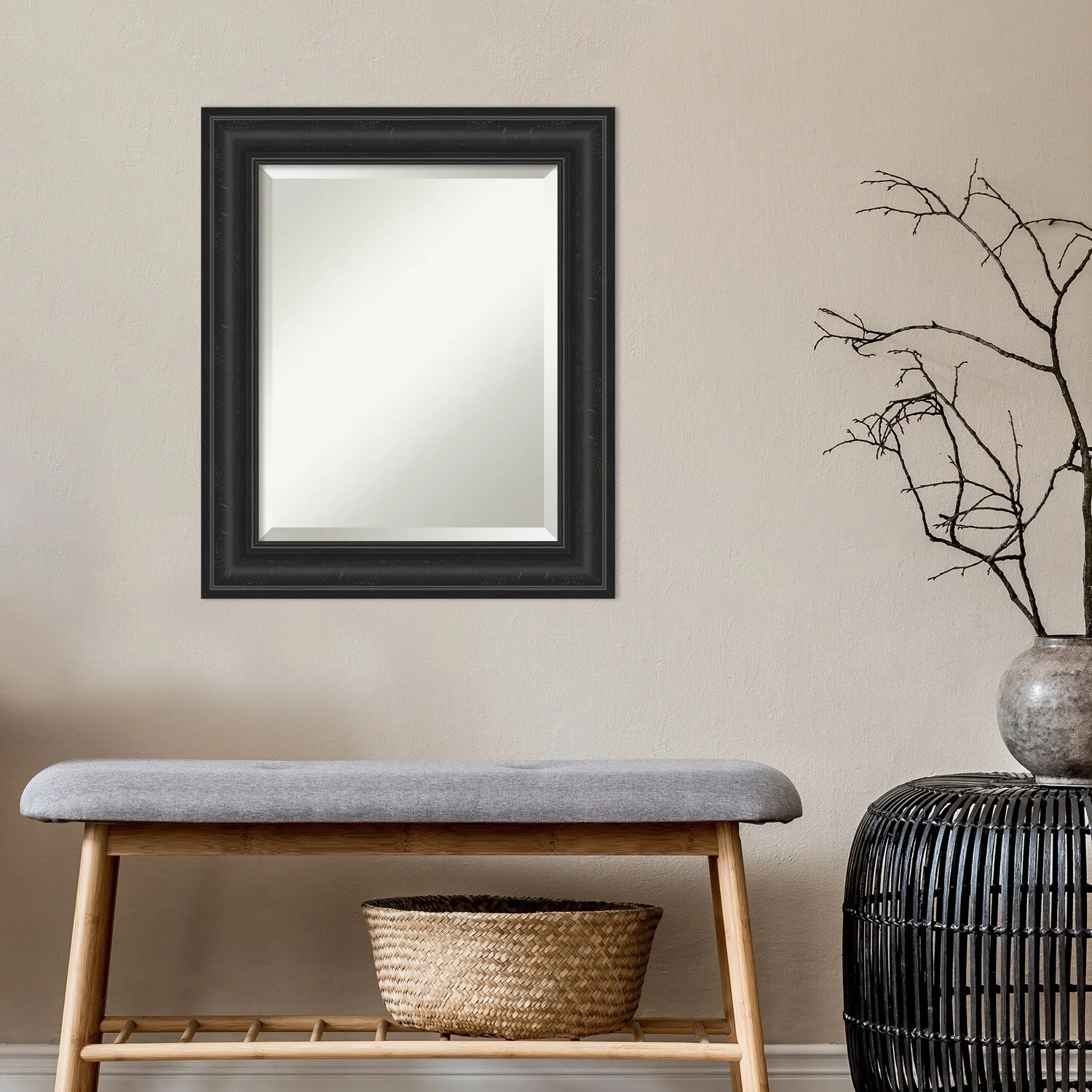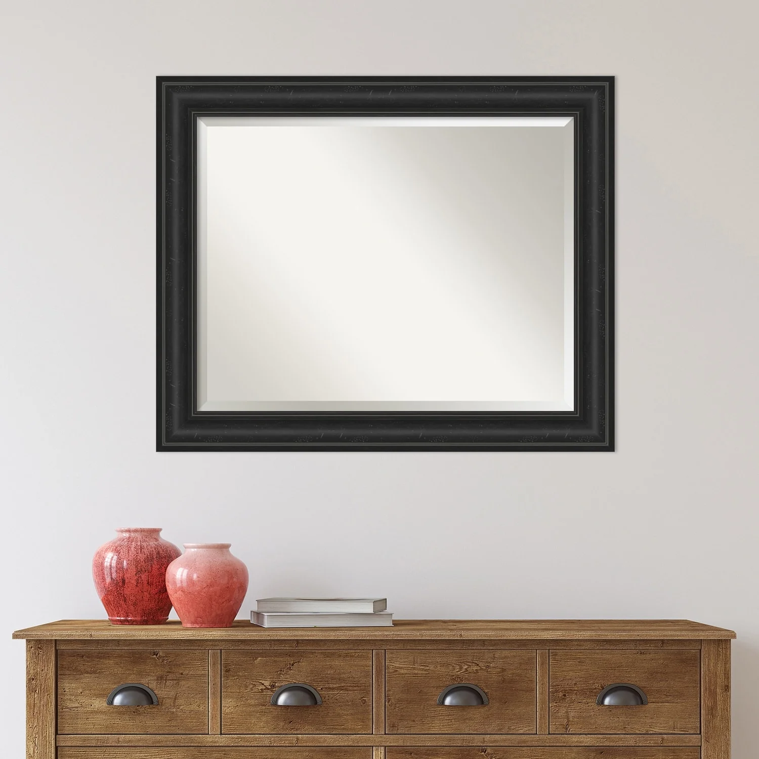 Add a touch of sophistication to your bathroom with the Beveled Bathroom Wall Mirror in a Shipwreck Black Frame. The premium glass and beveled edge provide a clear and undistorted reflection, while the wide, distressed black frame with a grey wash and weathered pockmark details adds a touch of rustic charm. This wall mirror comes with durable hanging hardware attached to the back for hassle-free vertical or horizontal installation. Proudly assembled in the USA, this mirror is perfect for both home and commercial use.