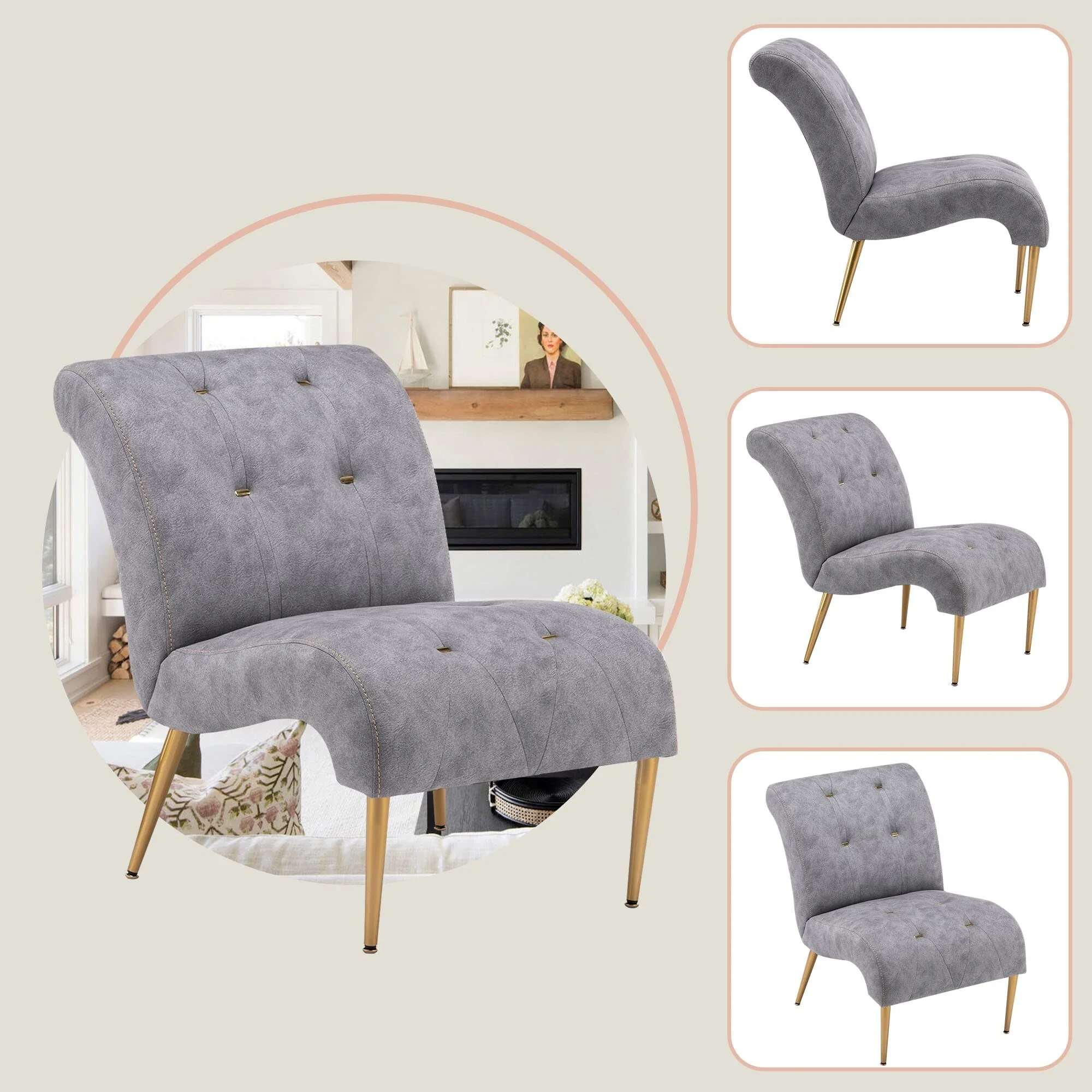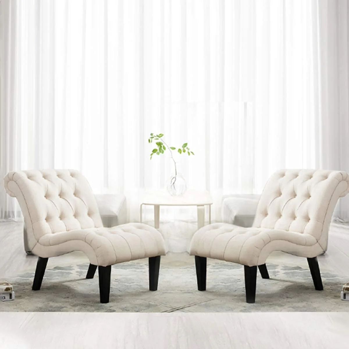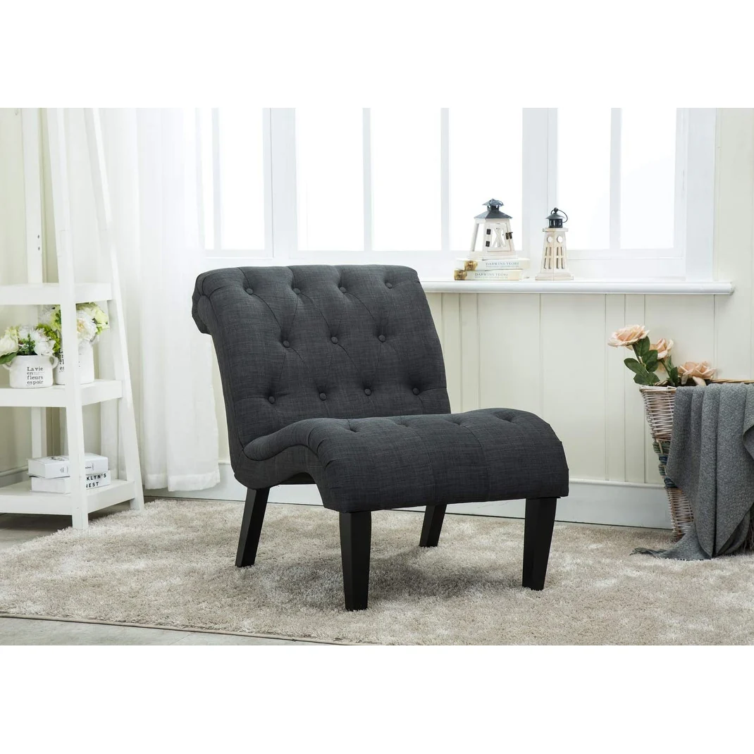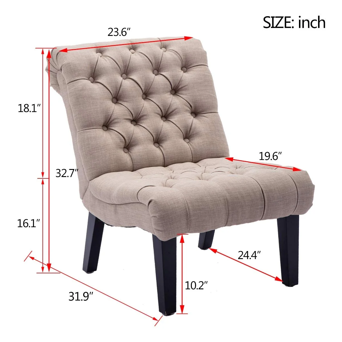Add a touch of elegance to your living room or bedroom with this modern lounge chair. The high, tufted scroll-back design and beige linen fabric add personality, while the black stained wooden legs give it a stylish finish. This versatile chair is made with fire-retardant foam for safety and durability. Assembly is easy with included hardware and installation manual.