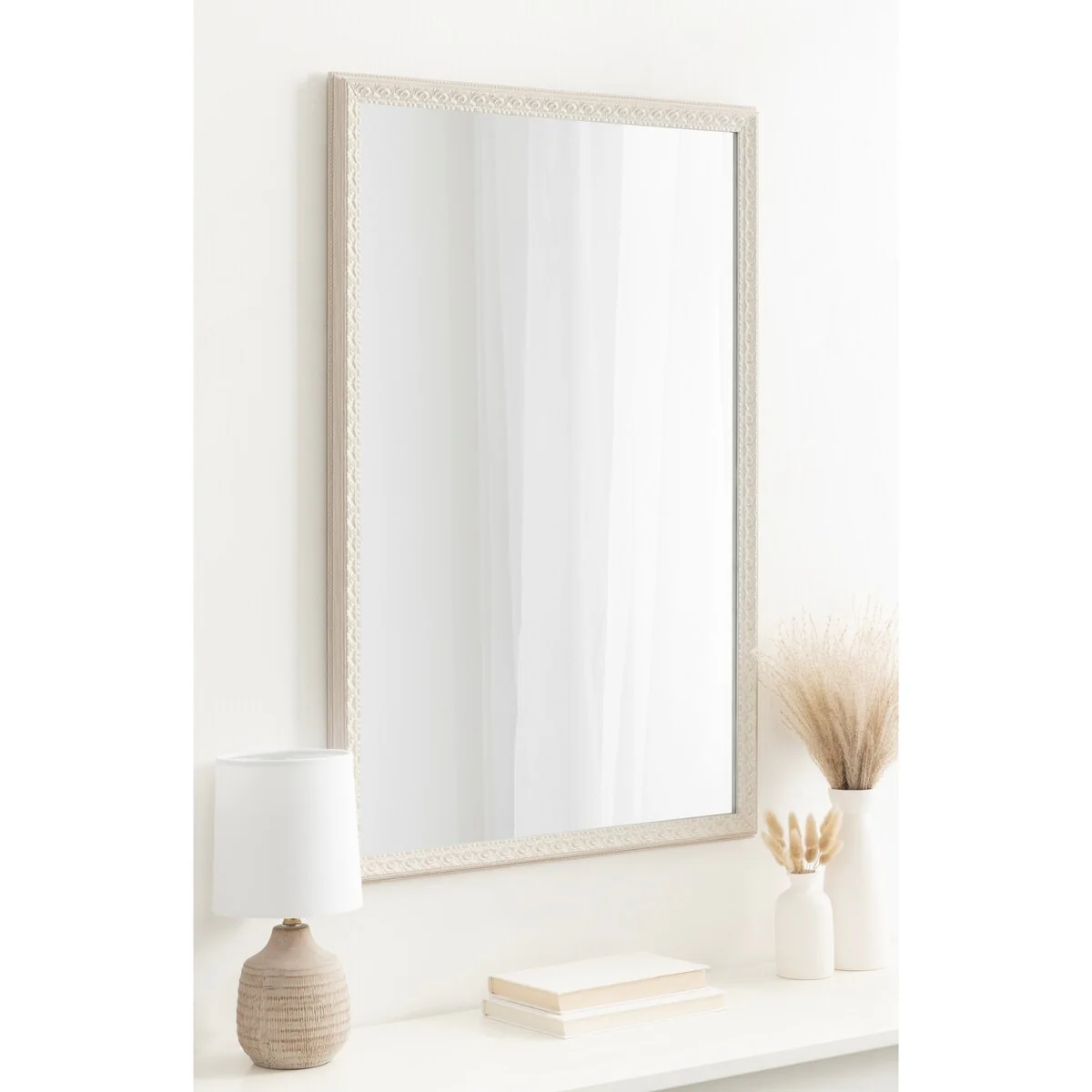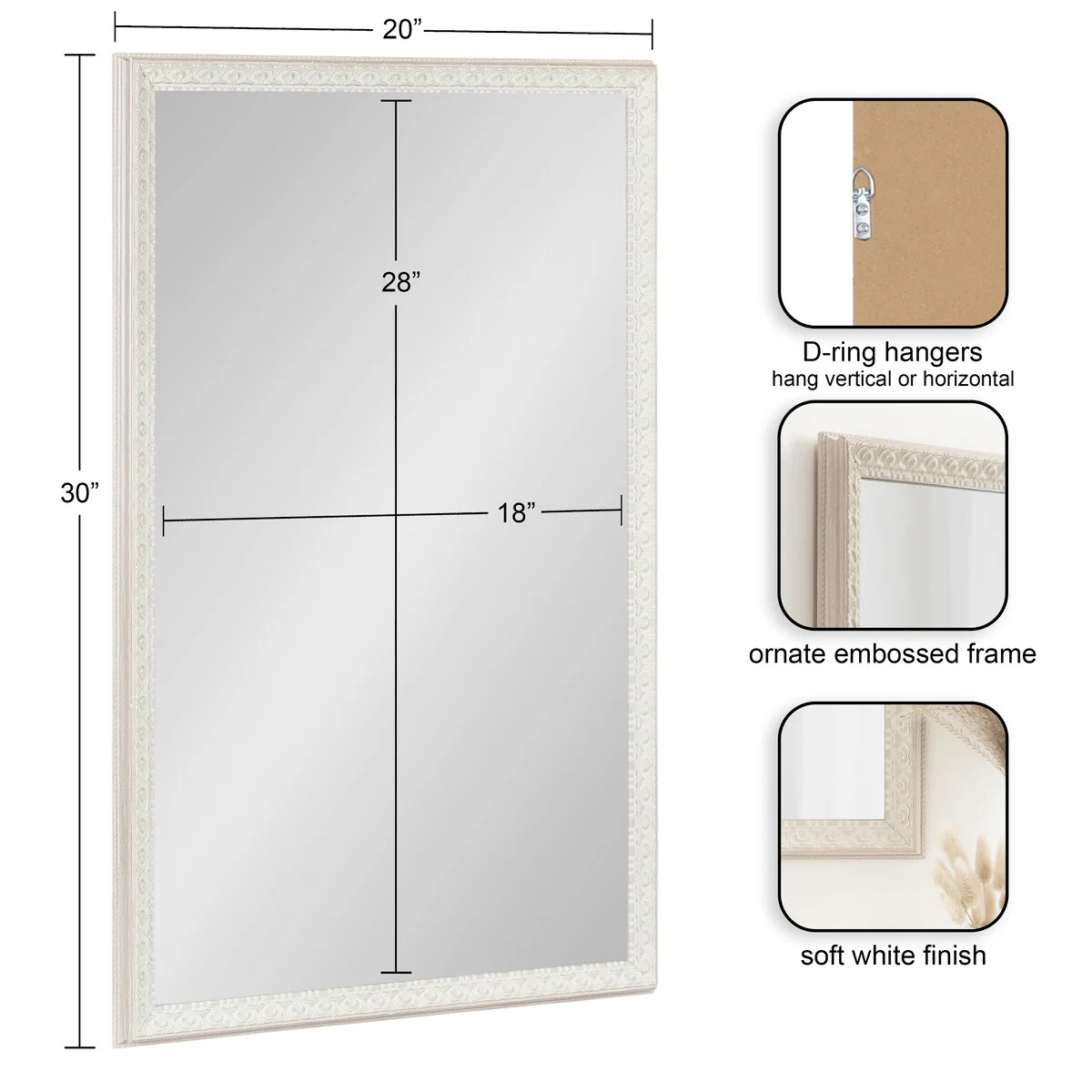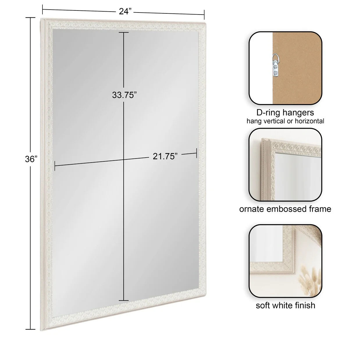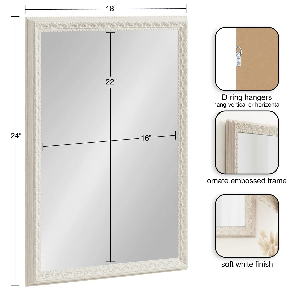 Enhance your home decor with the stunning Kate and Laurel Johann rectangle wall mirror. The rectangular shape of the mirror allows for versatile hanging options, making it the perfect addition to any room in your home. Hang it vertically in your bathroom or horizontally in your entryway to create an accent piece that is both functional and beautiful. Constructed with high-quality materials, this mirror is durable and designed to last. The intricate detailing and unique design of the frame are crafted to impress, adding a touch of sophistication to any room in your home. The mirror is easy to hang in just minutes with the attached D-ring hangers. This traditional rectangle wall mirror is perfect for adding depth, brightness, and character to your space. It is also a great gift for loved ones who appreciate timeless elegance and style. Measuring 18 inches wide by 24 inches high, this mirror boasts a vintage ornate design with an embossed frame and textured finish in a soft white hue, offering a touch of elegance to any space. This wall mirror is more than just a mirror; it is a statement piece that adds a touch of luxury and sophistication to your home decor. To protect the unique, hand-applied finish, be sure to only clean the frame with a dry cloth.