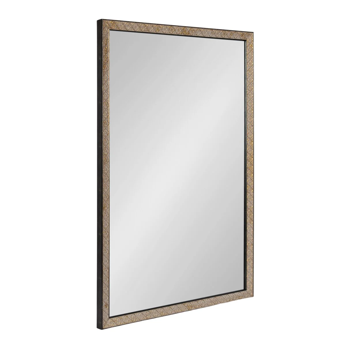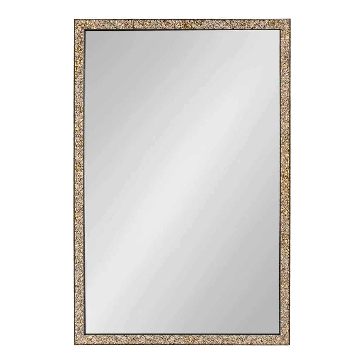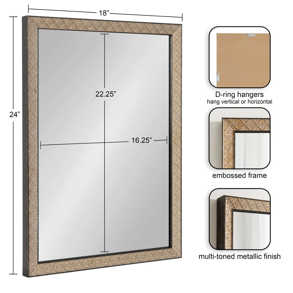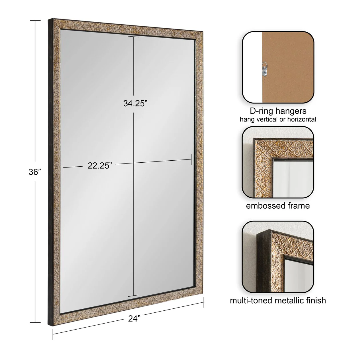 Introducing the Kate and Laurel Soniva rectangle wall mirror, the perfect addition to any fireplace mantel or entryway. This beautiful mirror boasts a charming traditional design with a unique gold finish and embossed ornate texture. Crafted with high-quality materials, the Soniva mirror is durable and long-lasting. The scrolling ornamental texture and multi-toned metallic finish add an elegant touch to the frame, making it a stylish and sophisticated addition to any room. The rectangular shape of the mirror is perfect for use as a bathroom vanity mirror, providing ample space for getting ready for the day. Measuring 24 inches wide by 36 inches high, this mirror is the perfect size for a large bathroom space. It is also a great addition to other rooms in the house, such as the bedroom or living room, where it can be used as a decorative piece. Installation of the Soniva mirror is quick and easy with the mirror's attached metal D-ring hangers. The mirror can be hung vertically or horizontally, depending on your preference and space requirements.