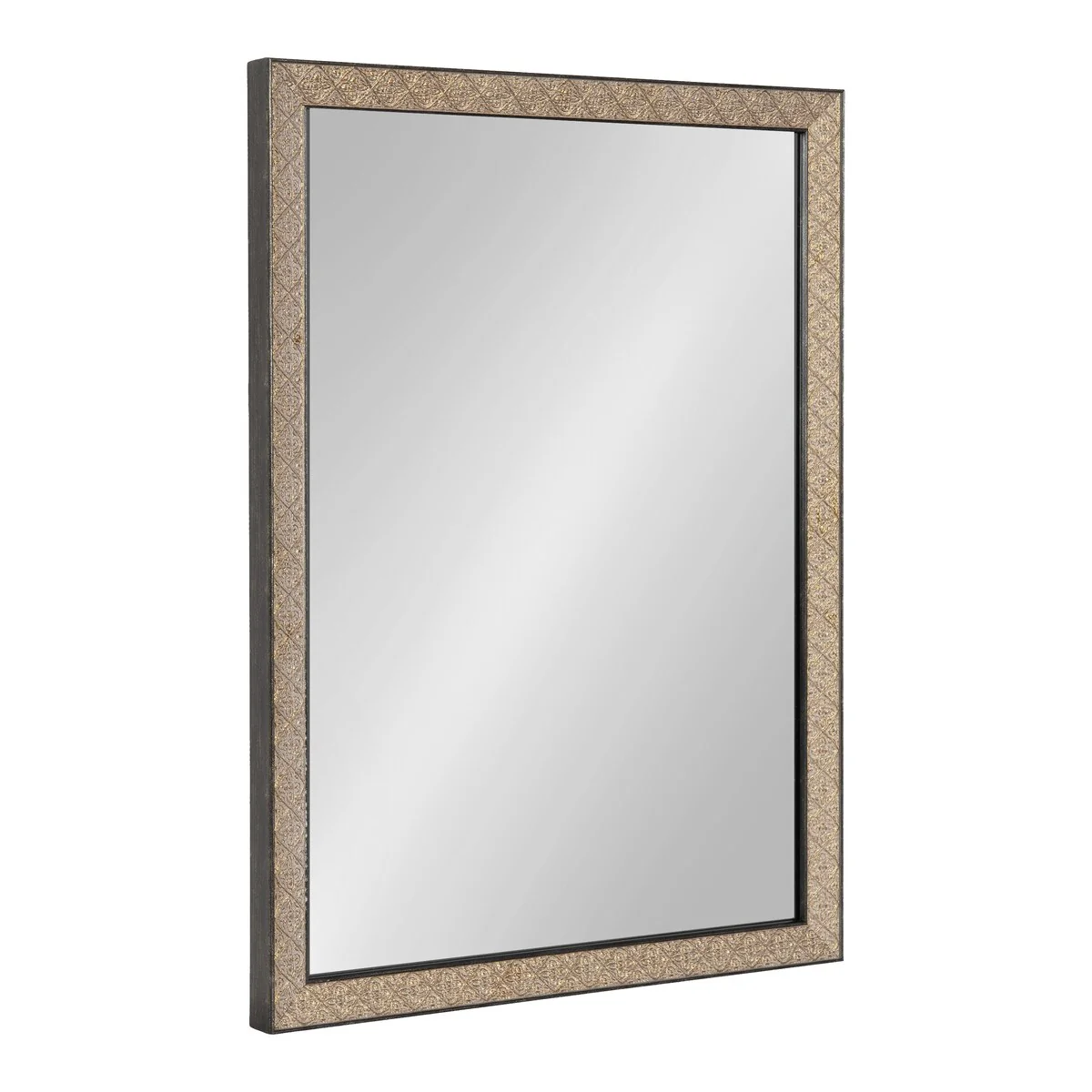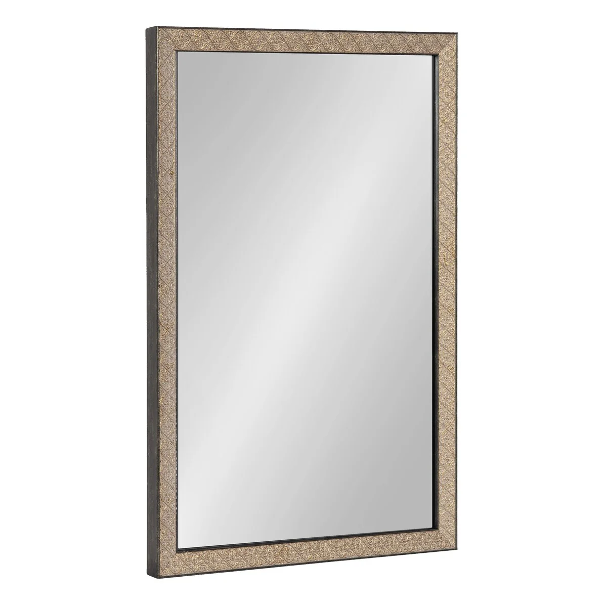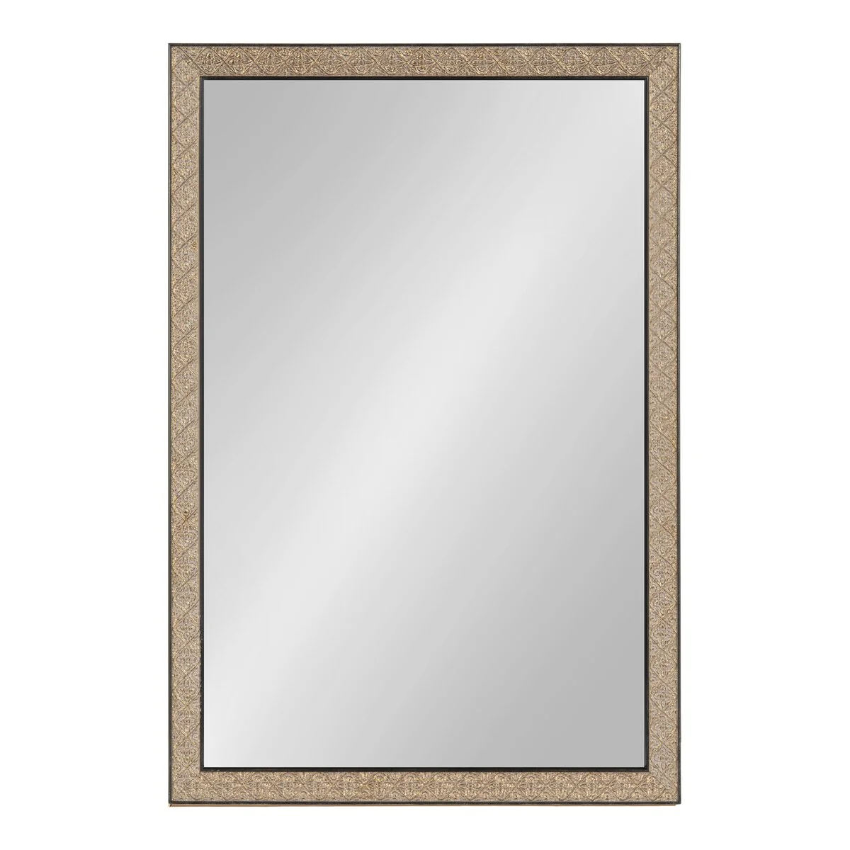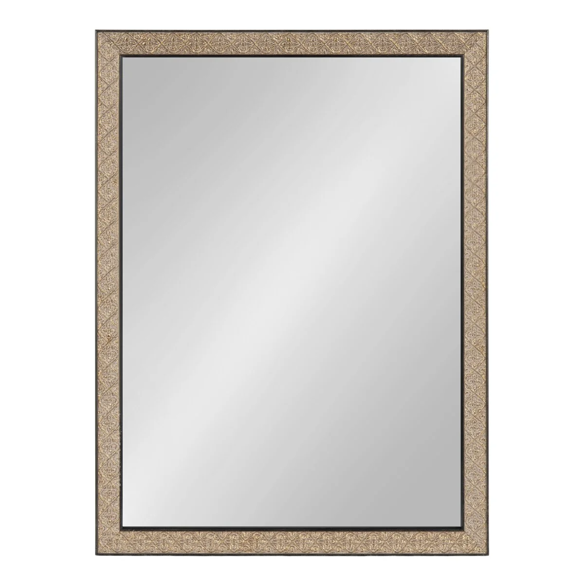 Introducing the Kate and Laurel Soniva rectangle wall mirror, the perfect addition to any fireplace mantel or entryway. This beautiful mirror boasts a charming traditional design with a unique gold finish and embossed ornate texture. Crafted with high-quality materials, the Soniva mirror is durable and long-lasting. The scrolling ornamental texture and multi-toned metallic finish add an elegant touch to the frame, making it a stylish and sophisticated addition to any room. The rectangular shape of the mirror is perfect for use as a bathroom vanity mirror, providing ample space for getting ready for the day. Measuring 24 inches wide by 36 inches high, this mirror is the perfect size for a large bathroom space. It is also a great addition to other rooms in the house, such as the bedroom or living room, where it can be used as a decorative piece. Installation of the Soniva mirror is quick and easy with the mirror's attached metal D-ring hangers. The mirror can be hung vertically or horizontally, depending on your preference and space requirements.