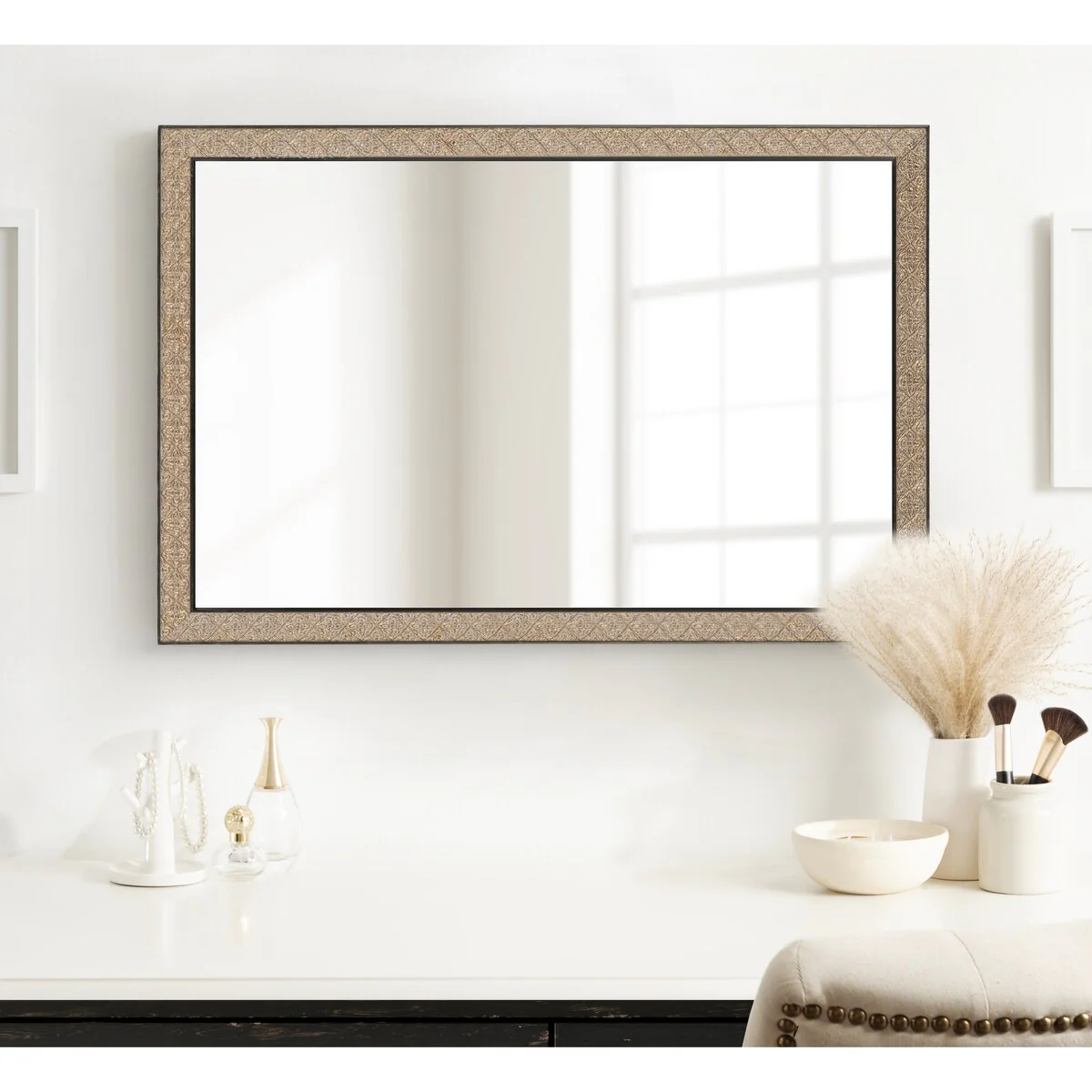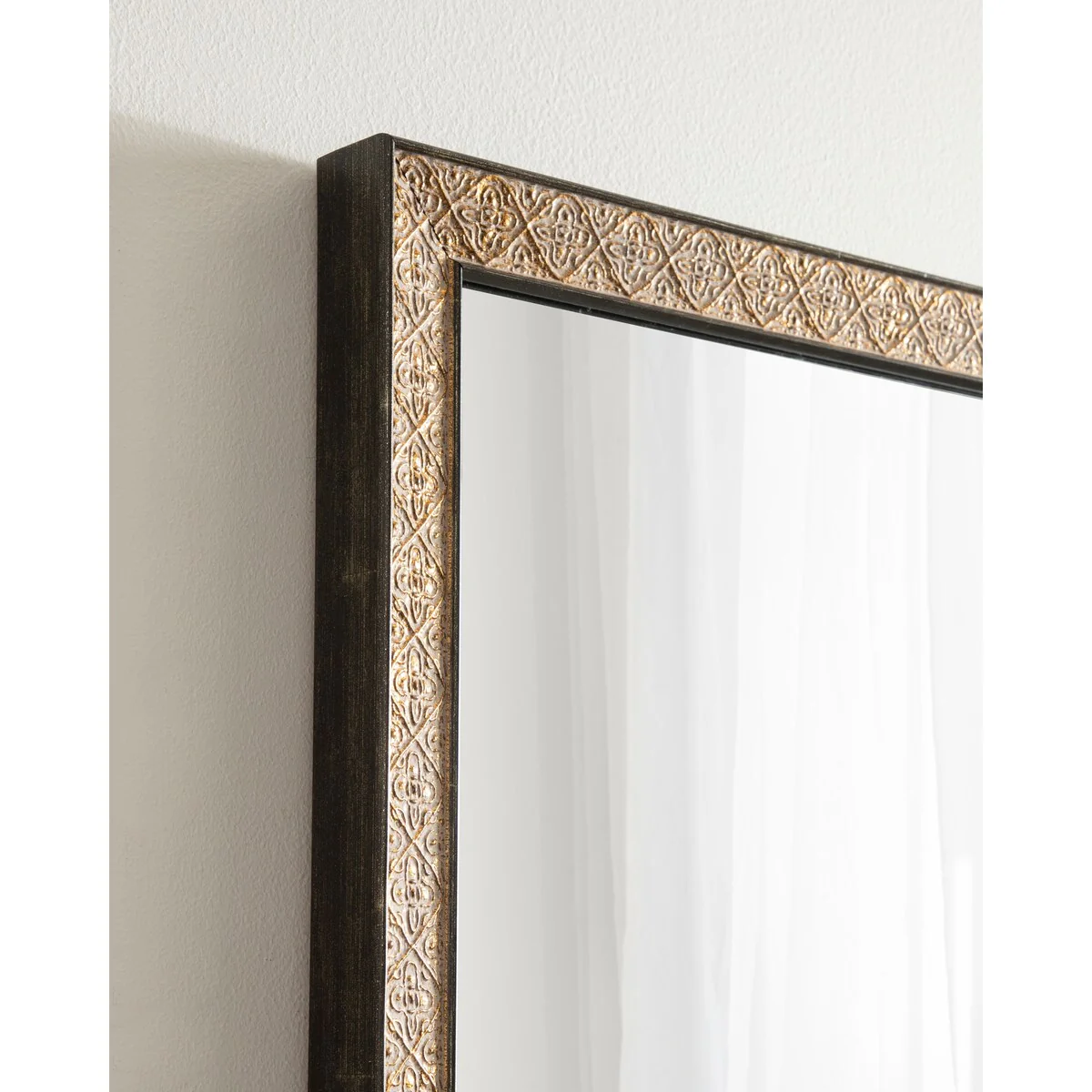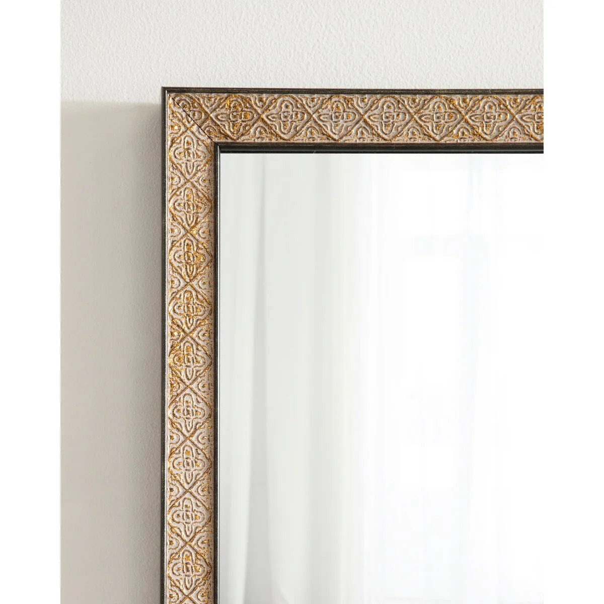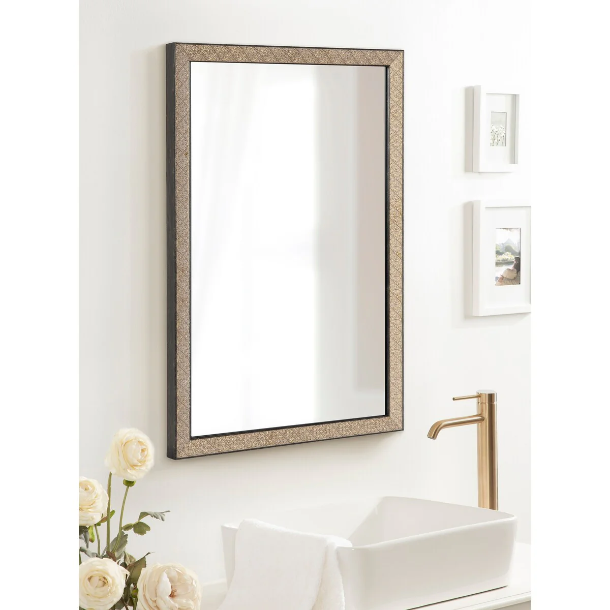 Introducing the Kate and Laurel Soniva rectangle wall mirror, the perfect addition to any fireplace mantel or entryway. This beautiful mirror boasts a charming traditional design with a unique gold finish and embossed ornate texture. Crafted with high-quality materials, the Soniva mirror is durable and long-lasting. The scrolling ornamental texture and multi-toned metallic finish add an elegant touch to the frame, making it a stylish and sophisticated addition to any room. The rectangular shape of the mirror is perfect for use as a bathroom vanity mirror, providing ample space for getting ready for the day. Measuring 24 inches wide by 36 inches high, this mirror is the perfect size for a large bathroom space. It is also a great addition to other rooms in the house, such as the bedroom or living room, where it can be used as a decorative piece. Installation of the Soniva mirror is quick and easy with the mirror's attached metal D-ring hangers. The mirror can be hung vertically or horizontally, depending on your preference and space requirements.