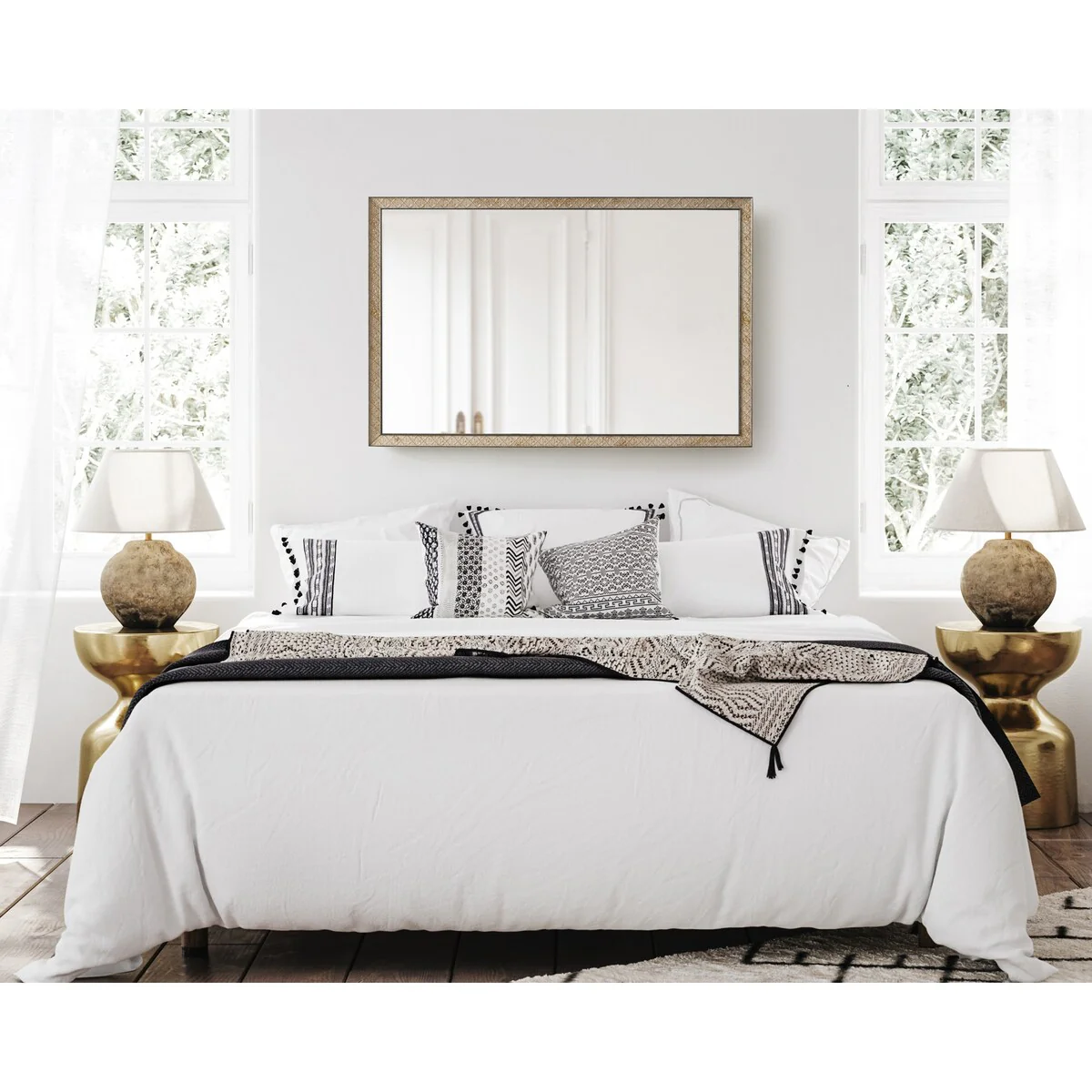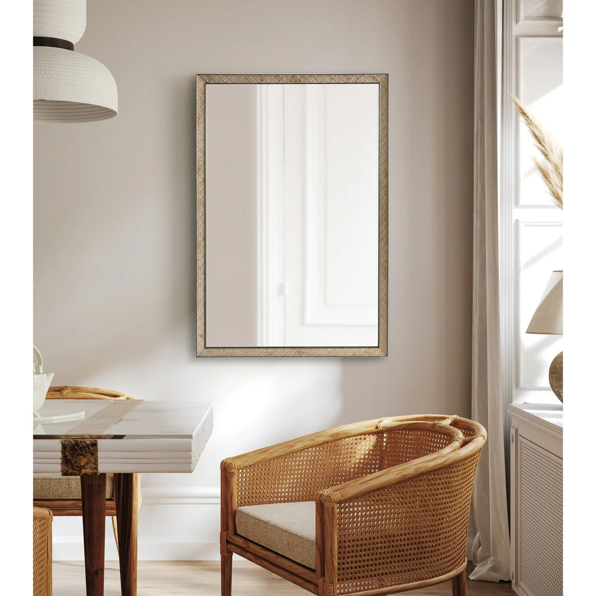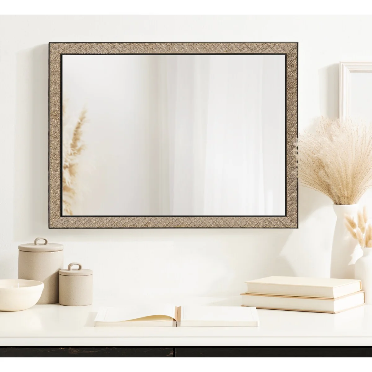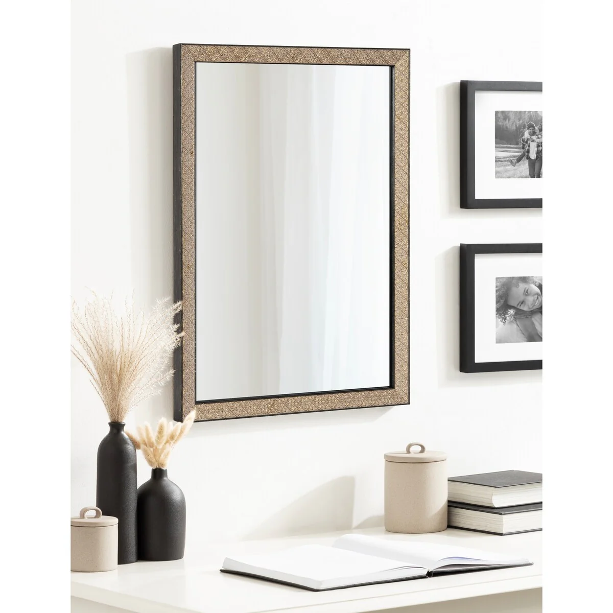 Introducing the Kate and Laurel Soniva rectangle wall mirror, the perfect addition to any fireplace mantel or entryway. This beautiful mirror boasts a charming traditional design with a unique gold finish and embossed ornate texture. Crafted with high-quality materials, the Soniva mirror is durable and long-lasting. The scrolling ornamental texture and multi-toned metallic finish add an elegant touch to the frame, making it a stylish and sophisticated addition to any room. The rectangular shape of the mirror is perfect for use as a bathroom vanity mirror, providing ample space for getting ready for the day. Measuring 24 inches wide by 36 inches high, this mirror is the perfect size for a large bathroom space. It is also a great addition to other rooms in the house, such as the bedroom or living room, where it can be used as a decorative piece. Installation of the Soniva mirror is quick and easy with the mirror's attached metal D-ring hangers. The mirror can be hung vertically or horizontally, depending on your preference and space requirements.