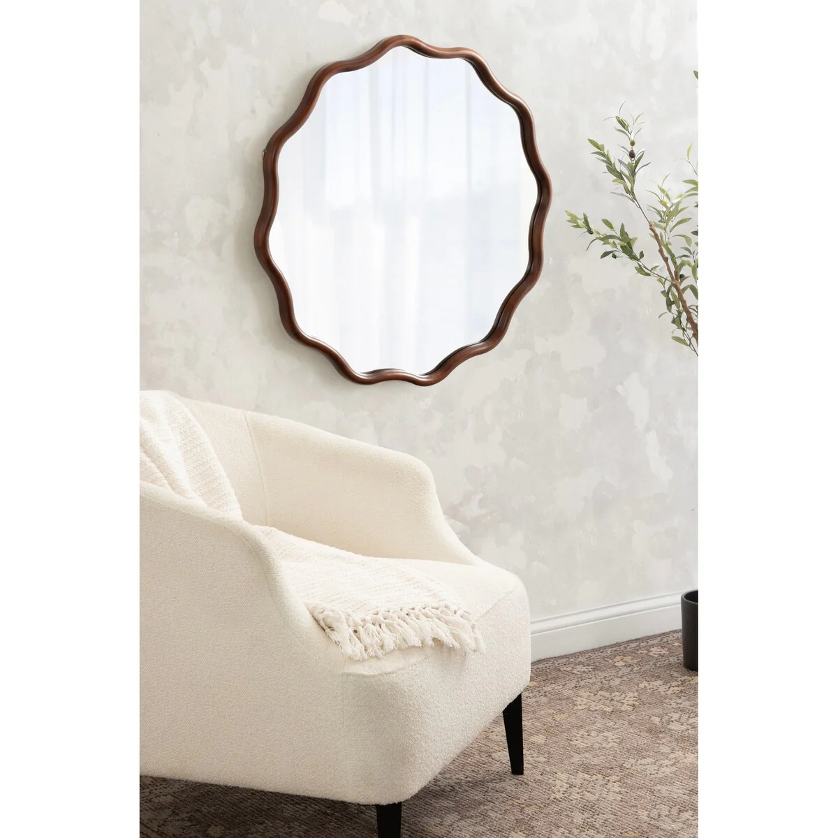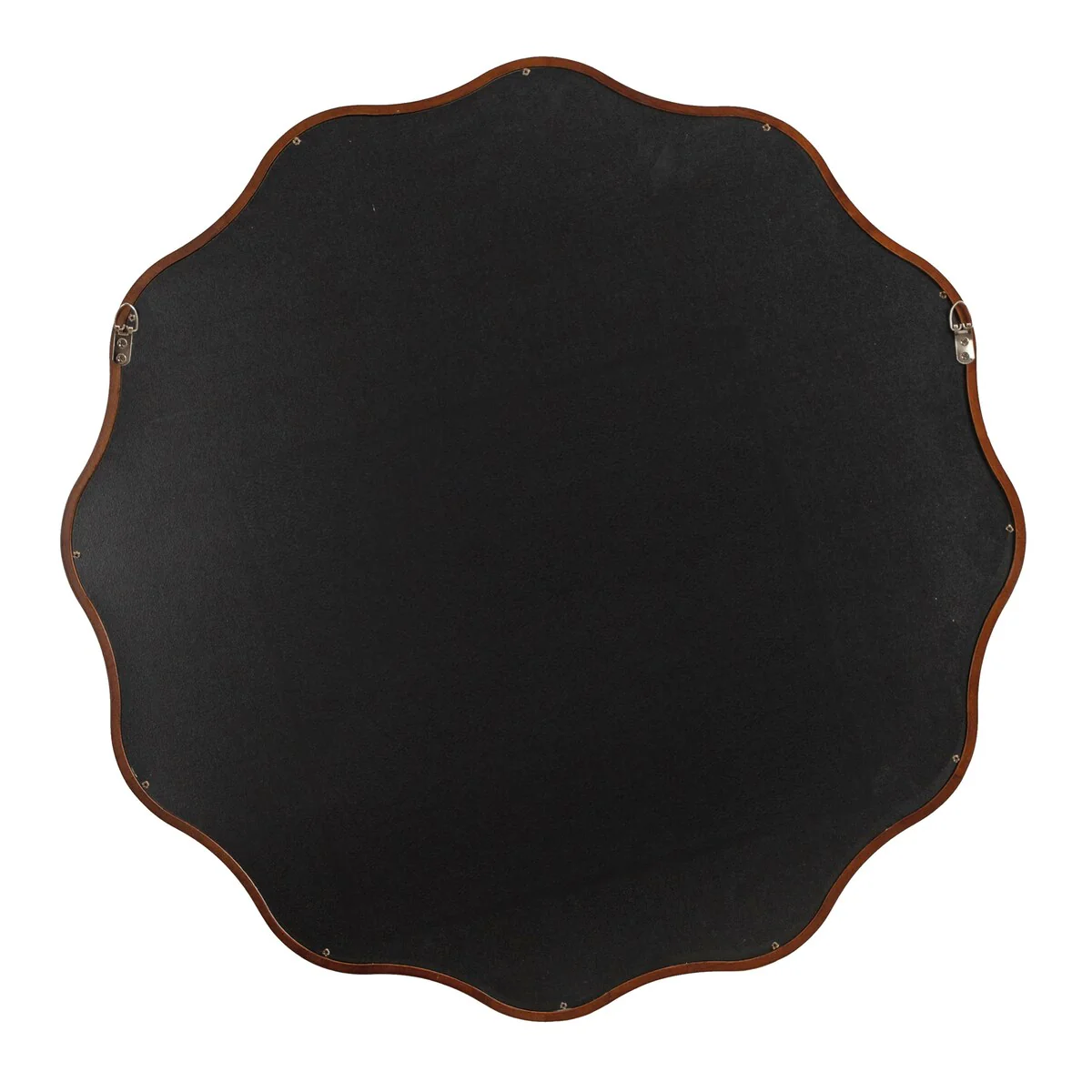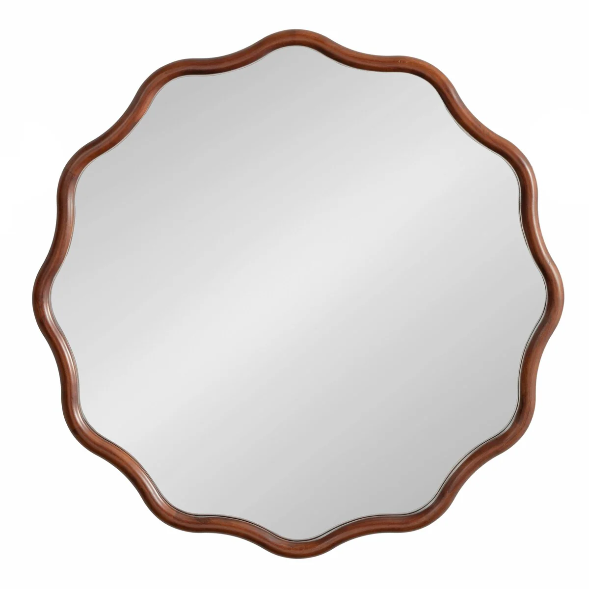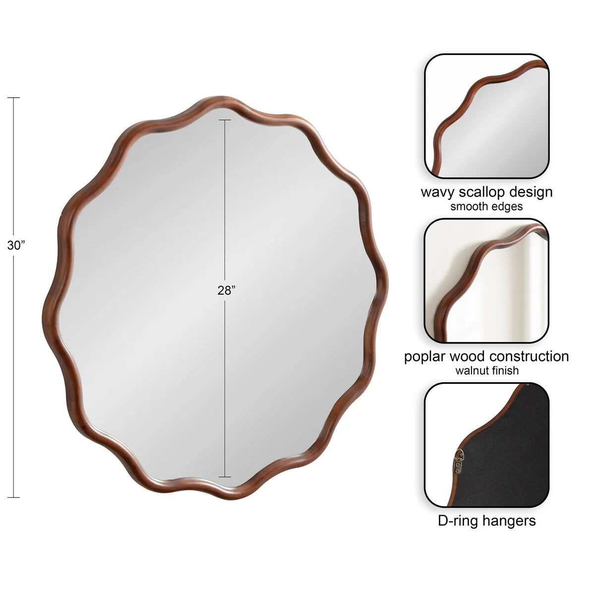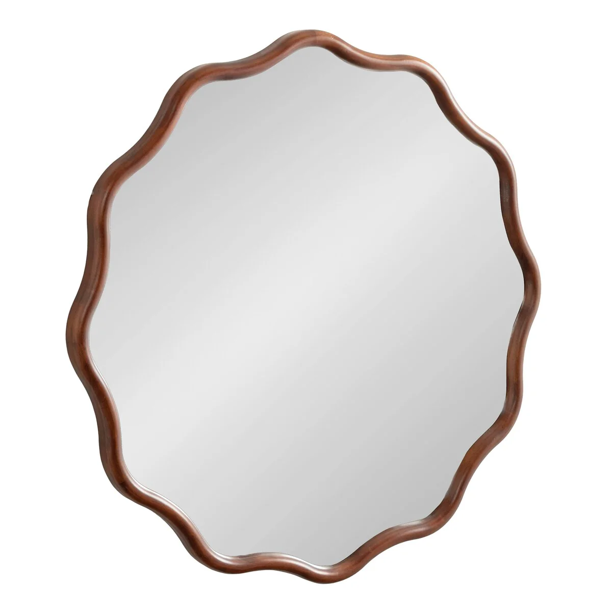 The Kate and Laurel Talma mirror features a rich walnut brown finish that adds a touch of elegance and sophistication to your space. Crafted with the utmost care, the mirror boasts a solid poplar wood frame that ensures durability and longevity. The scalloped frame profile adds to the mirror's charm, making it a perfect fit for a variety of interior styles, including modern, contemporary, and traditional. Not only is this mirror visually appealing, but it also serves a practical purpose. Hang it in your living room, bedroom, or entryway to create an illusion of a larger space, and to effortlessly check your appearance before heading out. The Talma round scallop wall mirror is designed to make your home feel brighter and more spacious. Its wavy mirror shape adds a touch of uniqueness to your wall decor, making it a focal point in any room. The mirror features convenient metal hangers to be hung easily to suit your wall decor. This exquisite mirror, measuring 30 inches in diameter, is a stunning addition to any home decor. This mirror combines organic forms with a delightful finish, ensuring that you get a stunning wall decor accent.