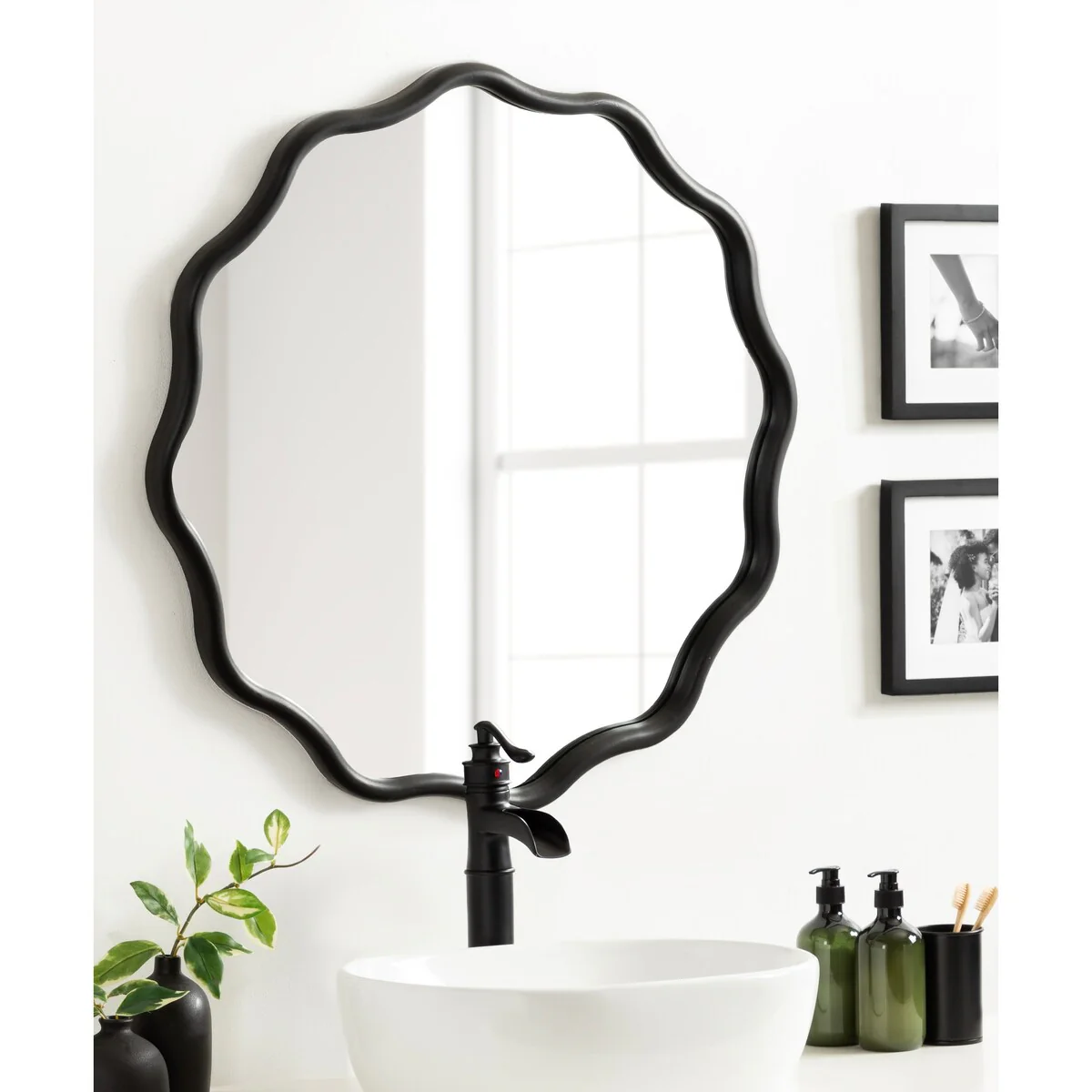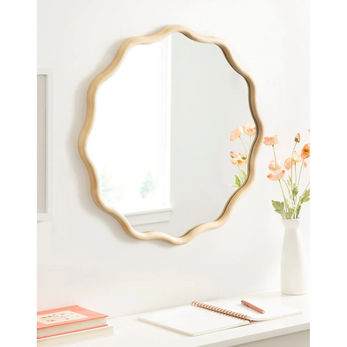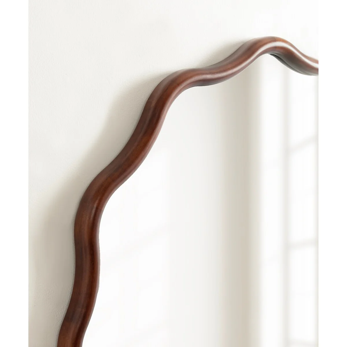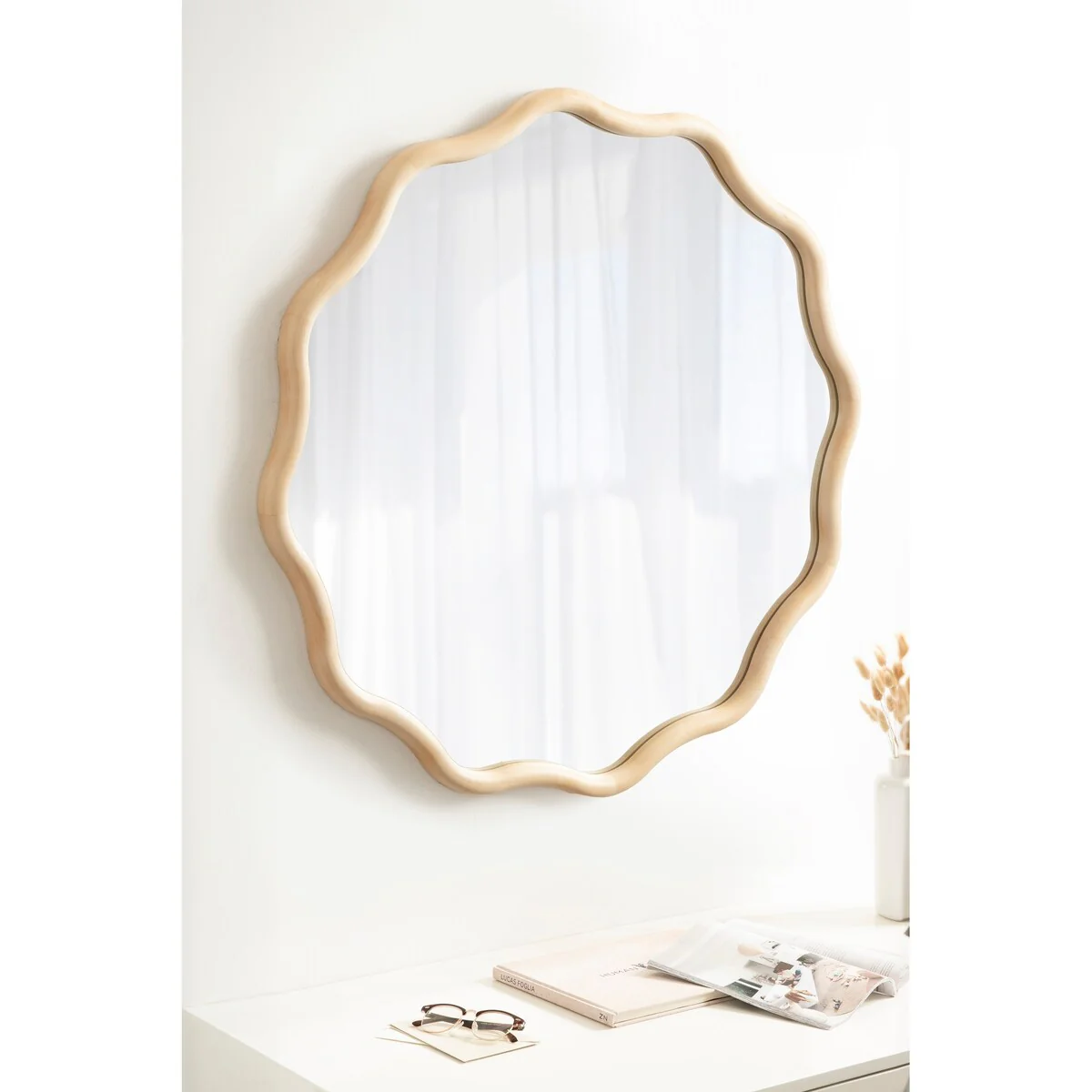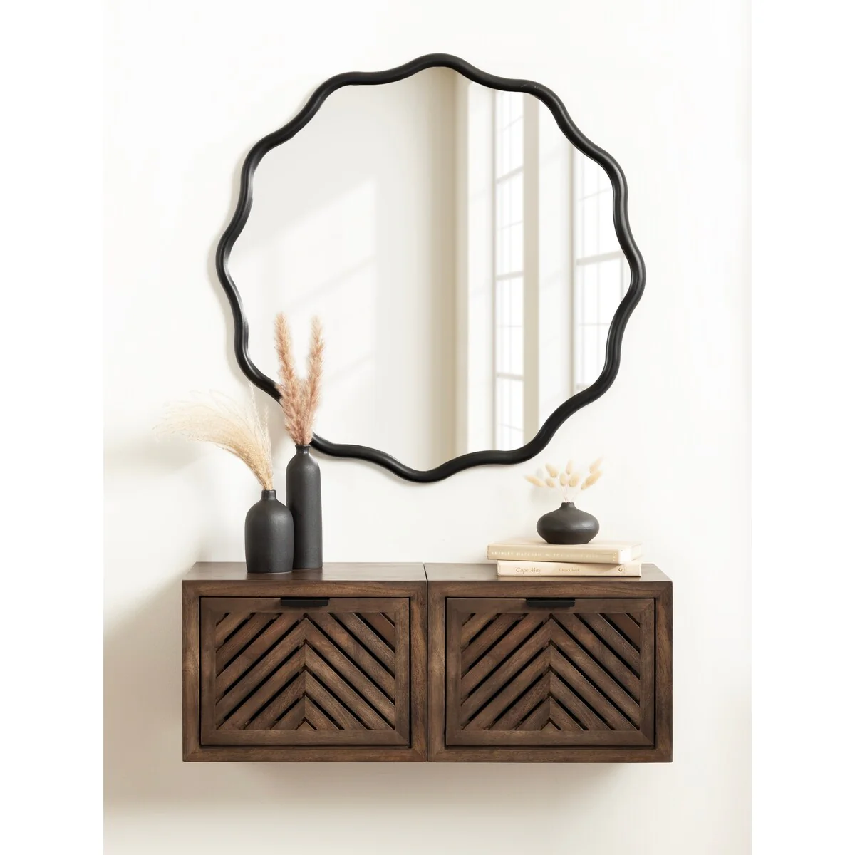 The Kate and Laurel Talma mirror features a rich walnut brown finish that adds a touch of elegance and sophistication to your space. Crafted with the utmost care, the mirror boasts a solid poplar wood frame that ensures durability and longevity. The scalloped frame profile adds to the mirror's charm, making it a perfect fit for a variety of interior styles, including modern, contemporary, and traditional. Not only is this mirror visually appealing, but it also serves a practical purpose. Hang it in your living room, bedroom, or entryway to create an illusion of a larger space, and to effortlessly check your appearance before heading out. The Talma round scallop wall mirror is designed to make your home feel brighter and more spacious. Its wavy mirror shape adds a touch of uniqueness to your wall decor, making it a focal point in any room. The mirror features convenient metal hangers to be hung easily to suit your wall decor. This exquisite mirror, measuring 30 inches in diameter, is a stunning addition to any home decor. This mirror combines organic forms with a delightful finish, ensuring that you get a stunning wall decor accent.