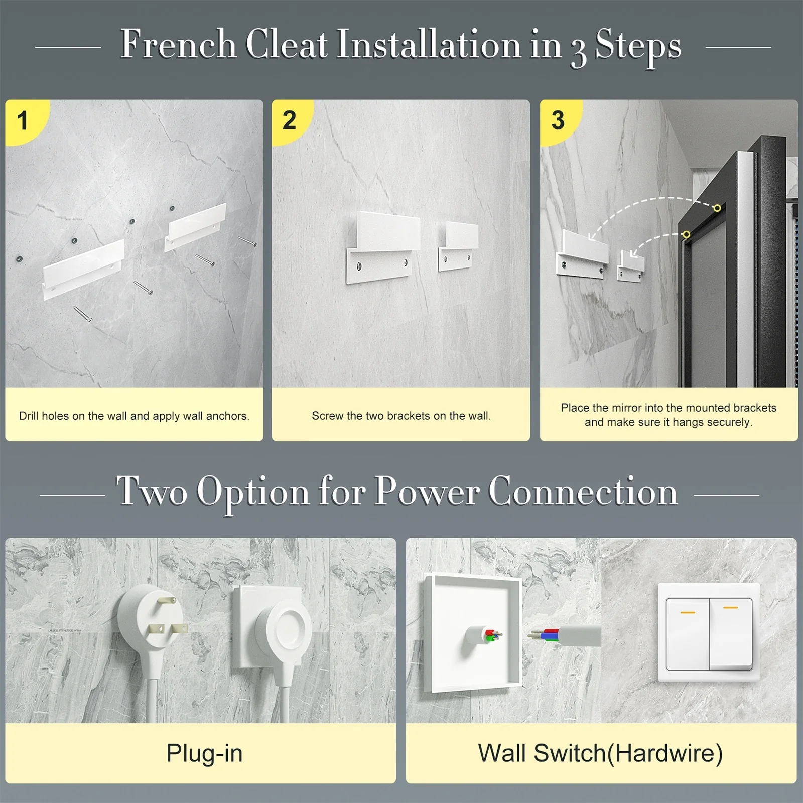 - French Cleat Mounting: Wall-mounted�vertically or horizontally with French cleat brackets�and screws. Plug in or hardwired to a wall switch to turn on the mirror light and defogger.