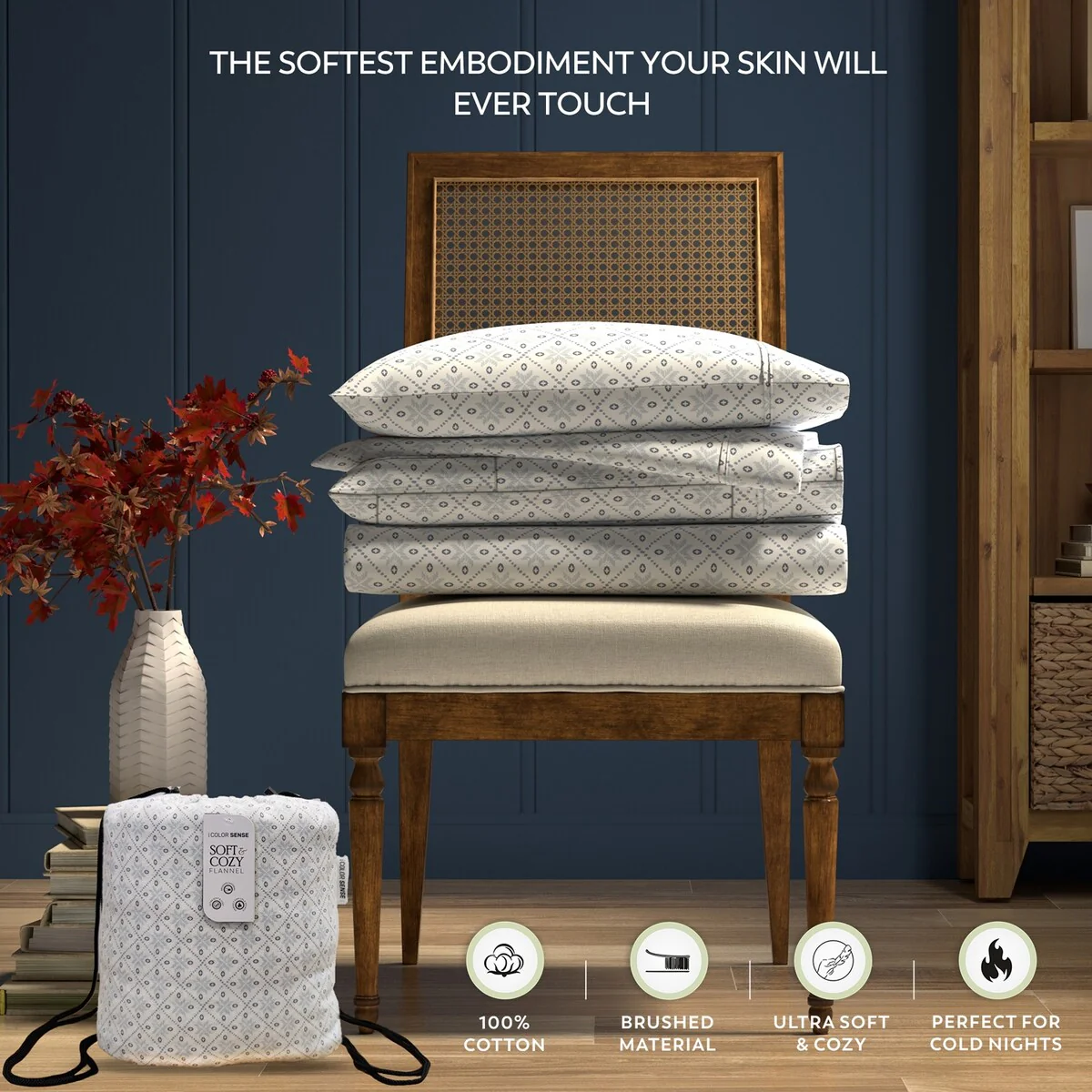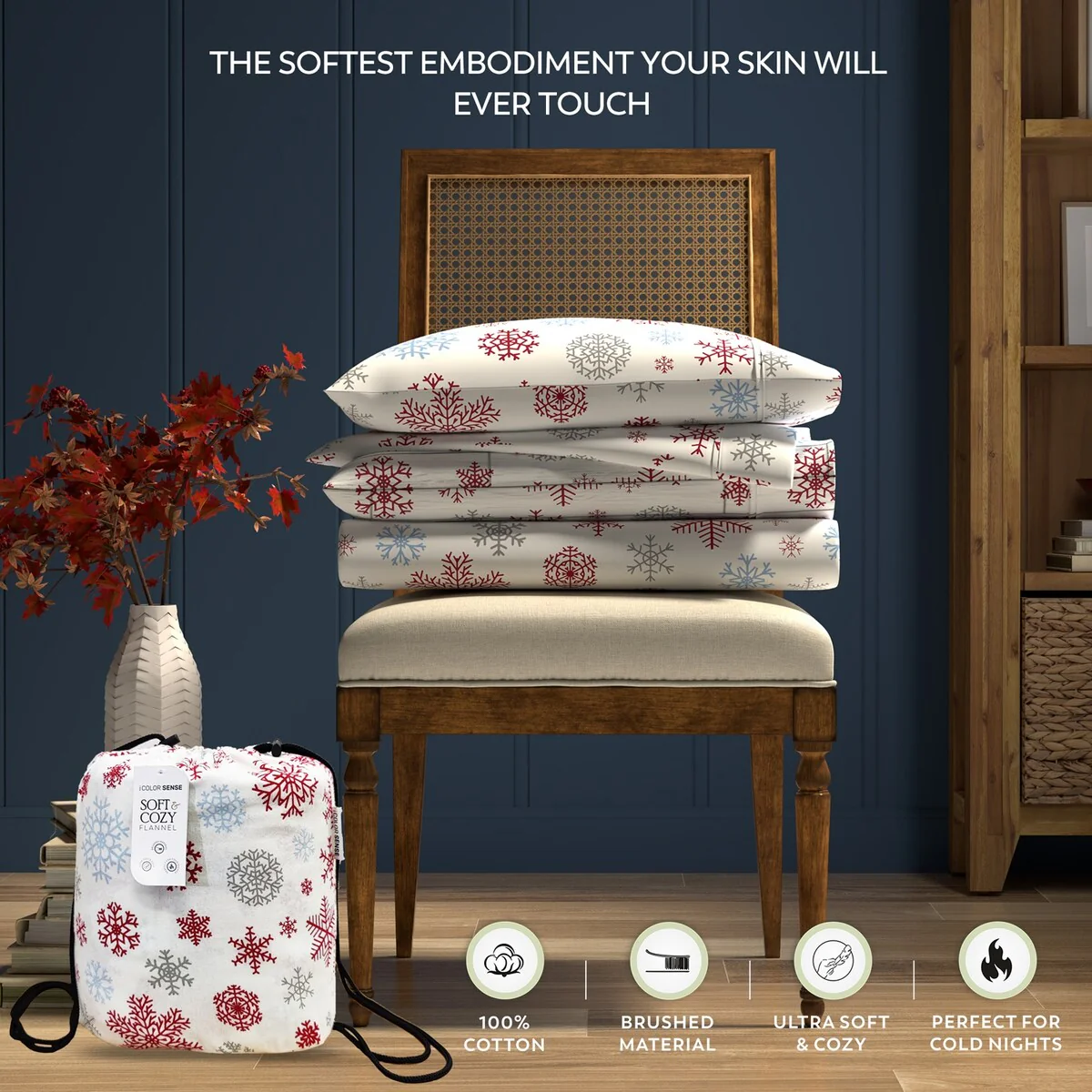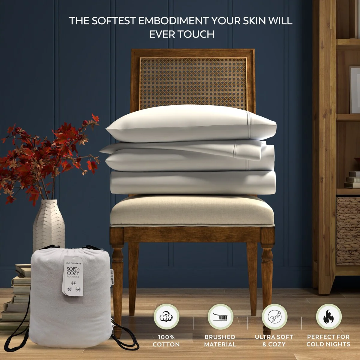 Unwind in pure bliss with the Color Sense 100% cotton 160GSM flannel sheet set. Featuring a brushed percale weave, this super-soft and cozy sheet set comes with a fuzzy/napped finish that is sure to keep you warm and comfortable all winter long. Also, these sheets come packed in a reusable drawstring bag, which is made of the same materials as sheets, making it a sustainable alternative for your storage needs. This high-quality sheet set is STANDARD 100 by OEKO-TEX certified which means it is made in environmentally friendly facilities under safe and socially responsible working conditions for credible safety and reliability. It comes in two sizes - Queen and King to best suit your need.