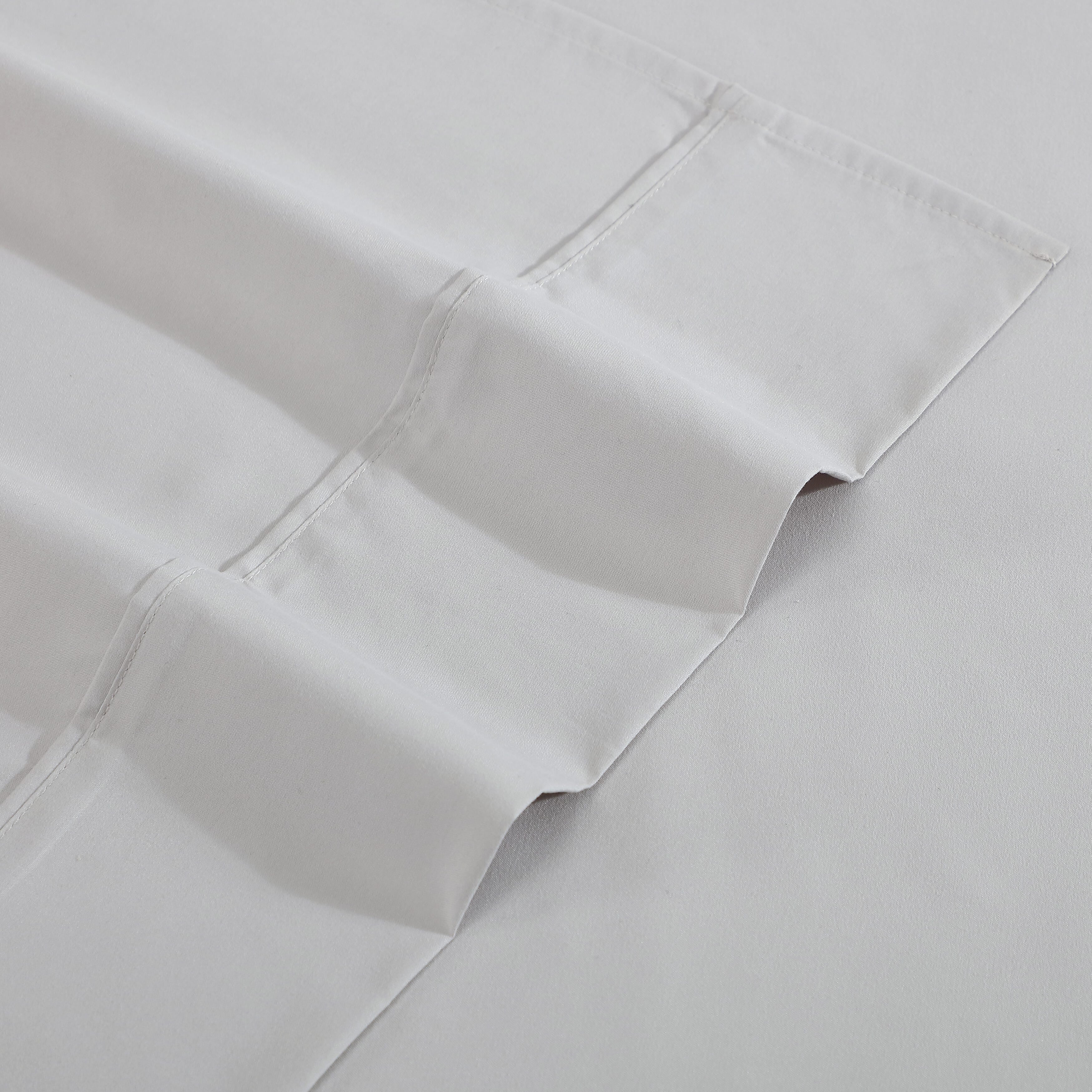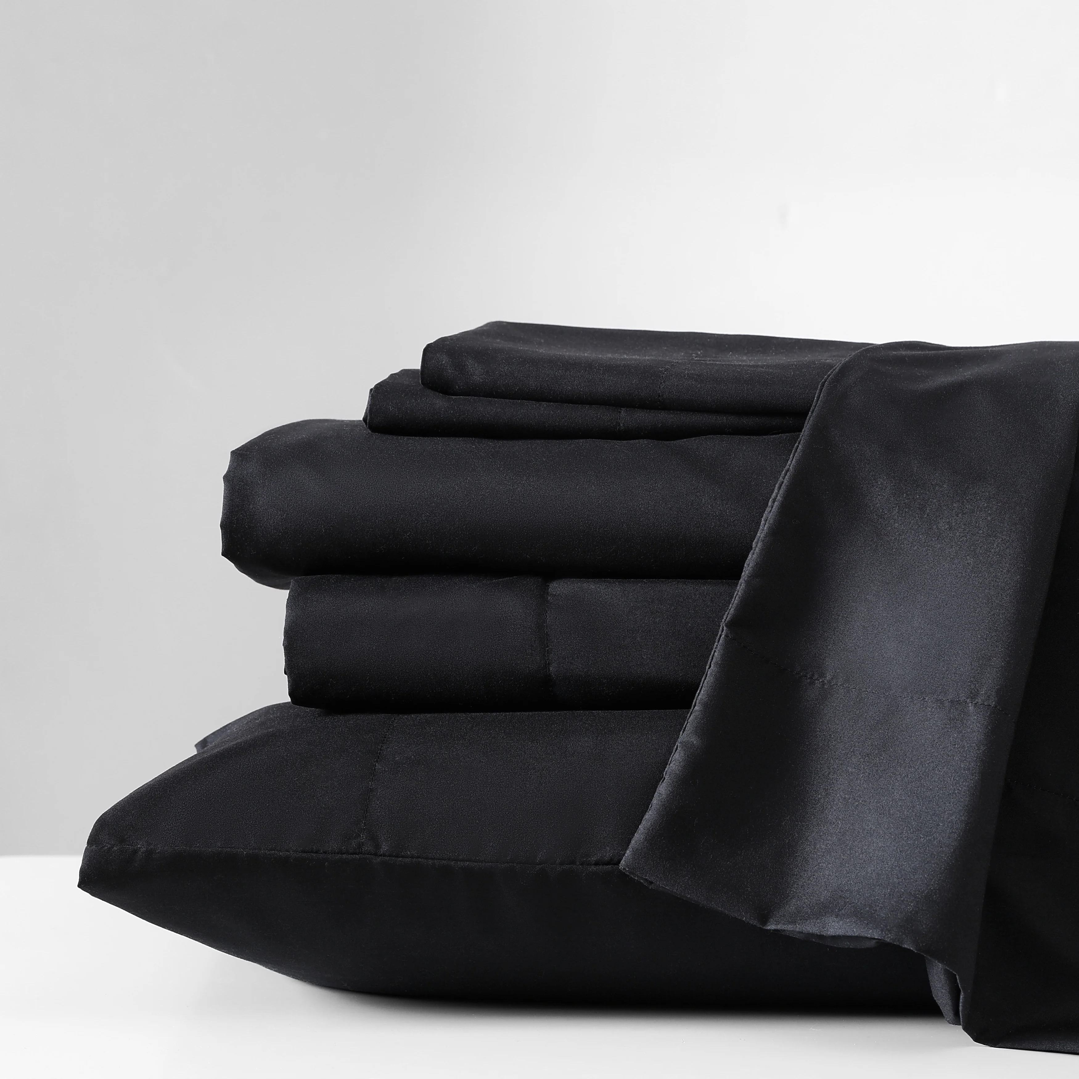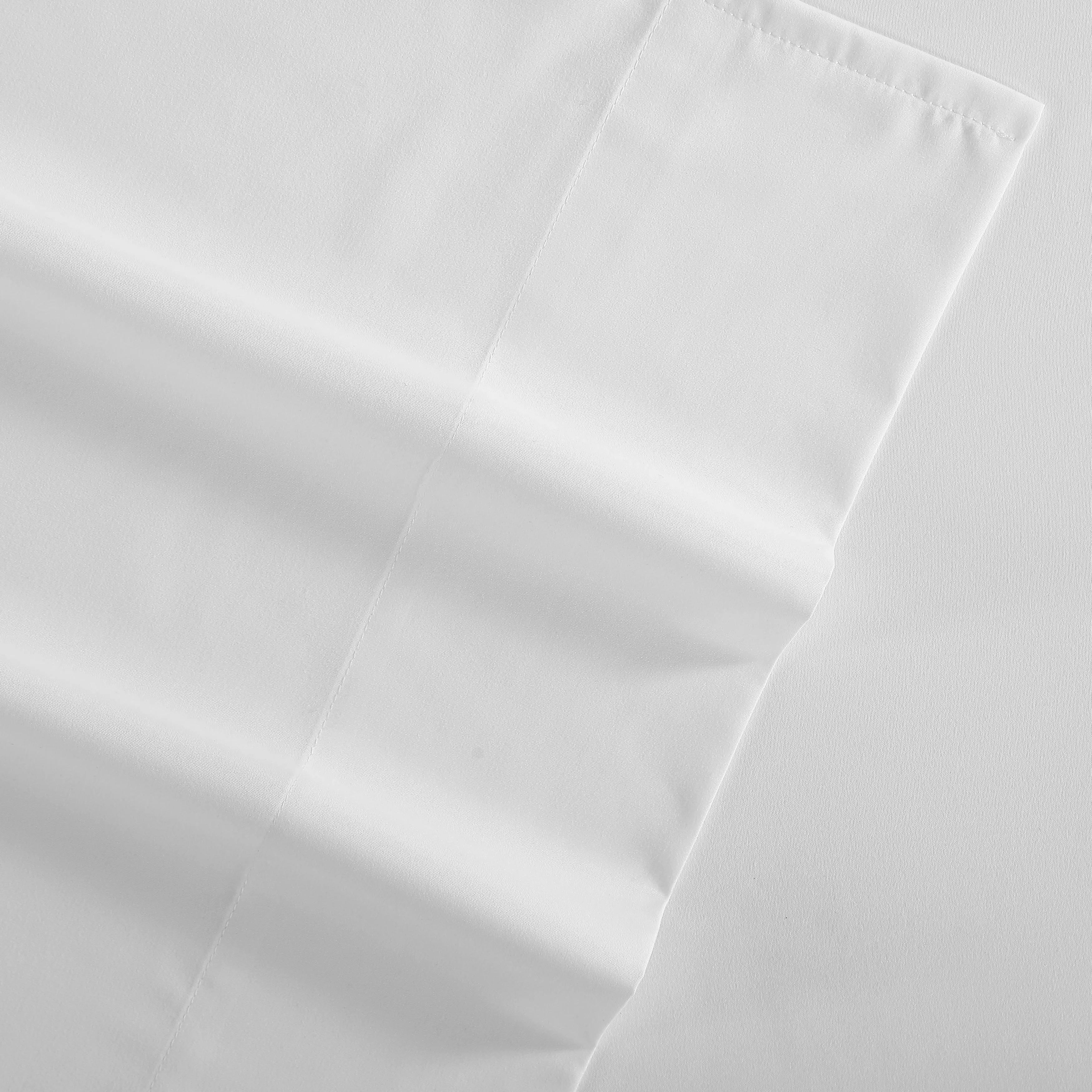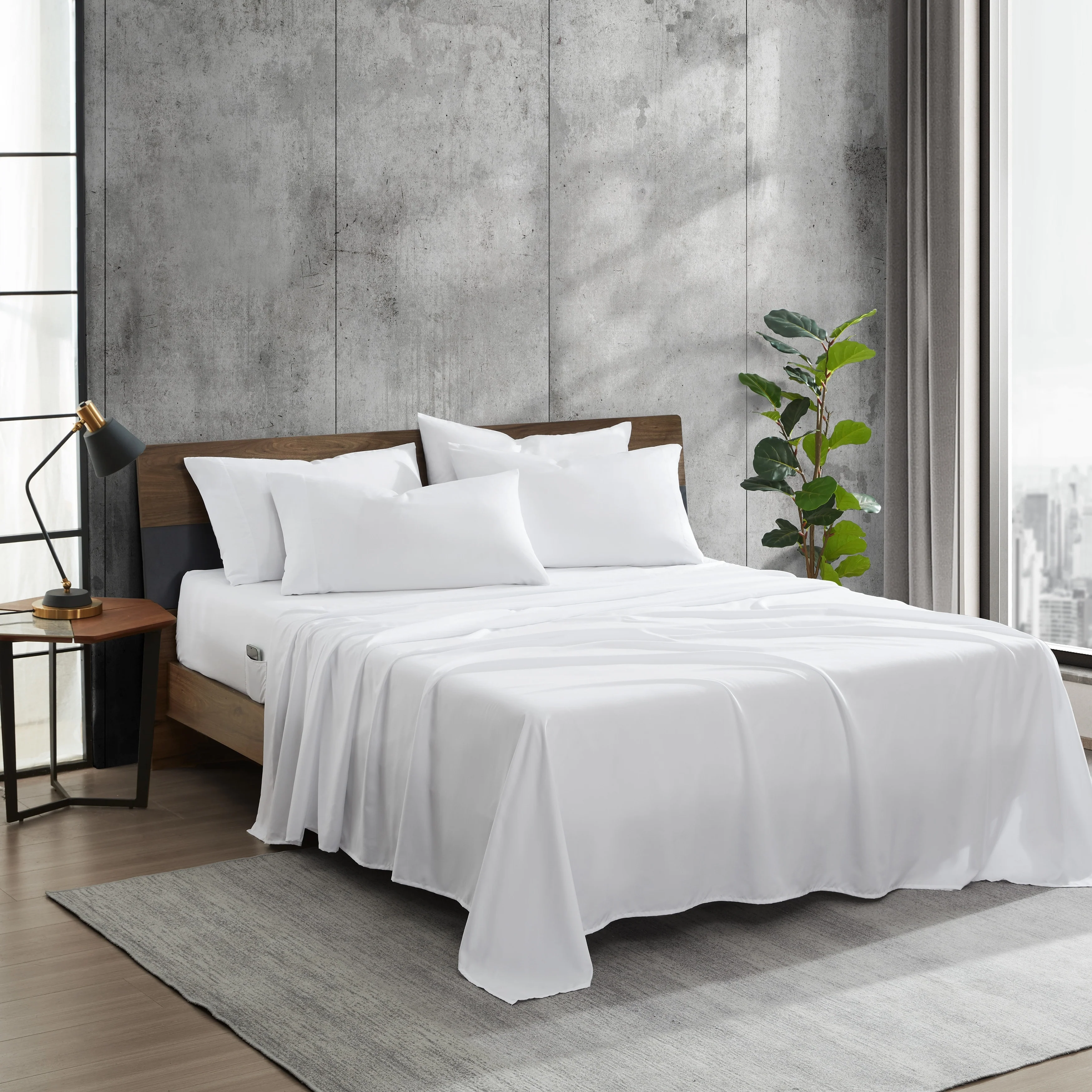 Meet the Solution Sheet from Kenneth Cole - the only sheet you'll ever need. Sustainably made using 100% recycled polyester and Oeko-tex certified, this stylish solid sheet set is the perfect update to any home. The 6-piece sheet set includes one fitted sheet, one flat sheet and four pillowcases (twin size includes two pillowcases). The fitted sheet features all around exposed elastic and is finished with Kenneth Cole's iconic white jacquard logo. This set is benzoyl peroxide resistant, with both a cooling and wrinkle resistant finishes. Fitted sheet features long and short labels for easy on, easy off. Set is machine washable for easy care and available in four solid colors.