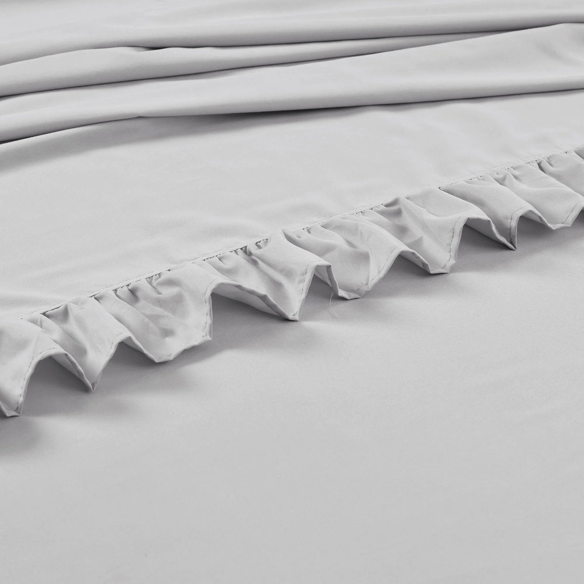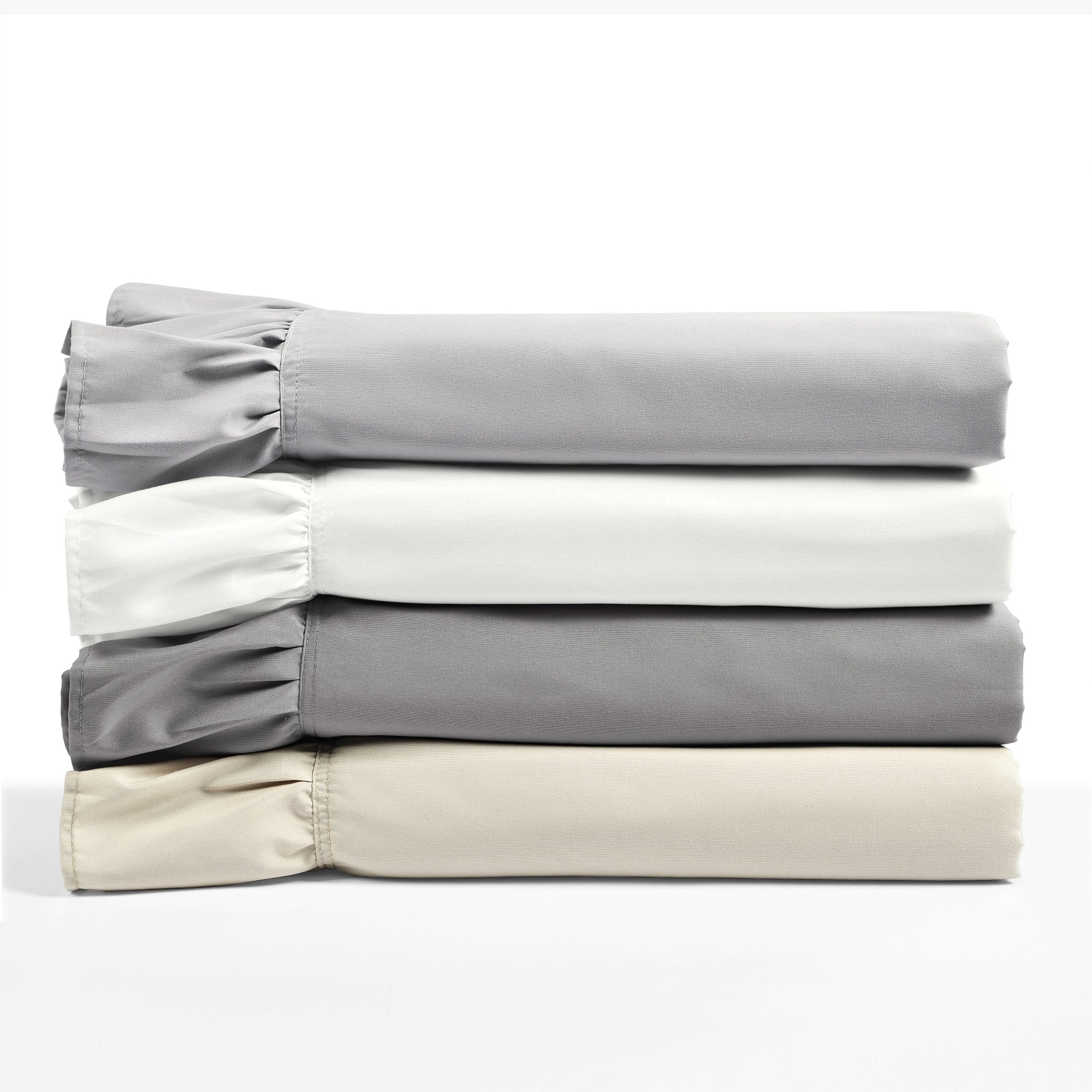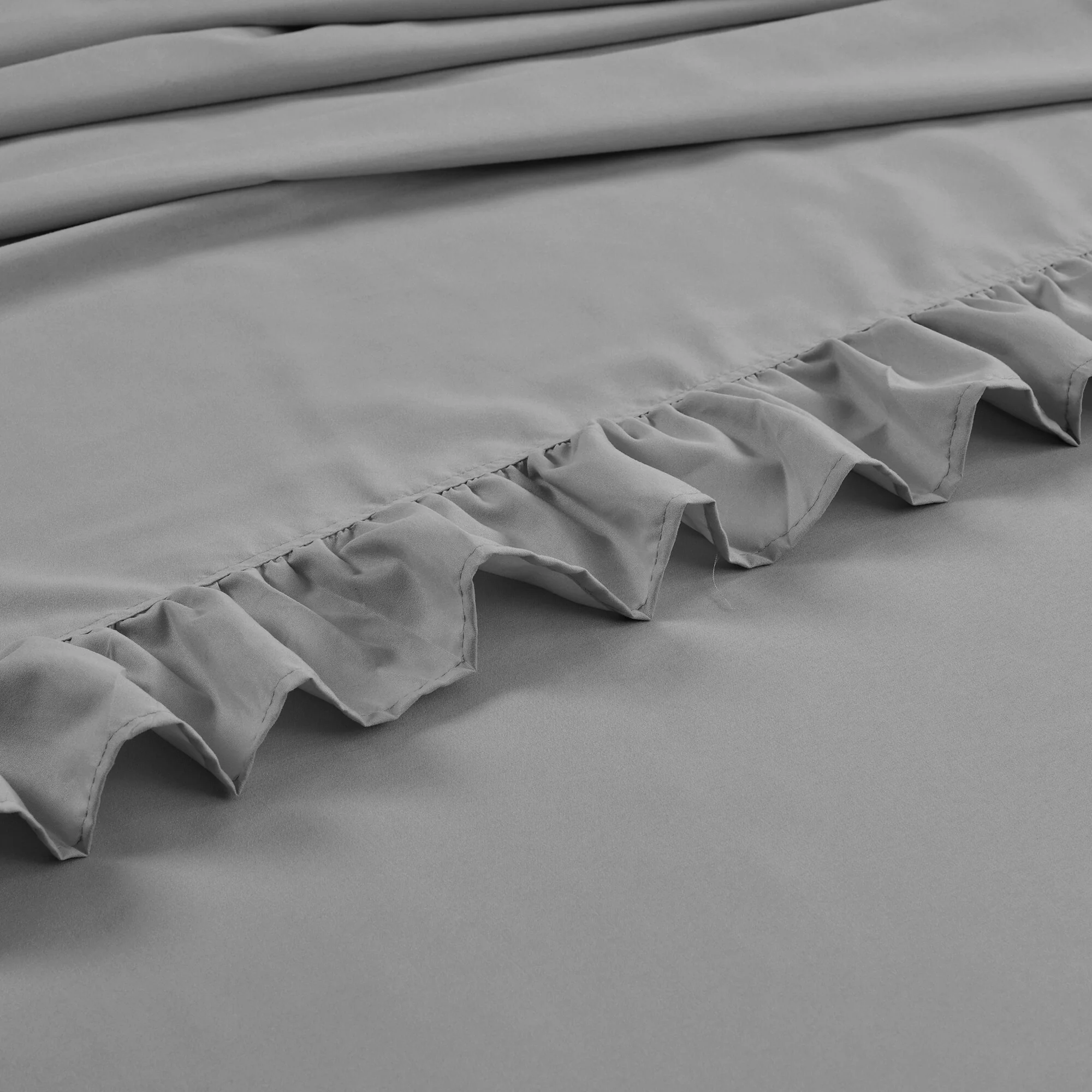 Pair your bedding with our lovely ruffled sheet sets which include a flat sheet, fitted sheet and two pillow cases. The soft micro fiber breathes easy to keep you cool and comfortable throughout the night. This set is machine washable for easy cleaning.