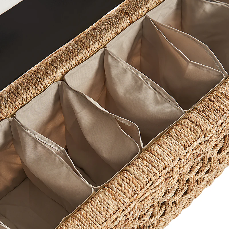 Elevate your bedroom with the rattan storage bench, blending boho, coastal, and farmhouse aesthetics. Crafted from water hyacinth, its natural and sustainable appeal resonates with a bohemian design. The hollow-carved detail and cylindrical armrest add an artisanal touch, creating a unique look. Wrapped in imitation linen fabric, it complements various interior styles. Open the flip-top lid to reveal ample internal storage, perfect for stowing away blankets, pillows, or other bedroom essentials. Supported by solid wood legs, the bench exudes sturdiness and reliability. Enhanced by comfortable high-density foam, it ensures a delightful seating experience. Enjoy your leisure time with this storage bench, a chic storage solution for the modern bedroom.