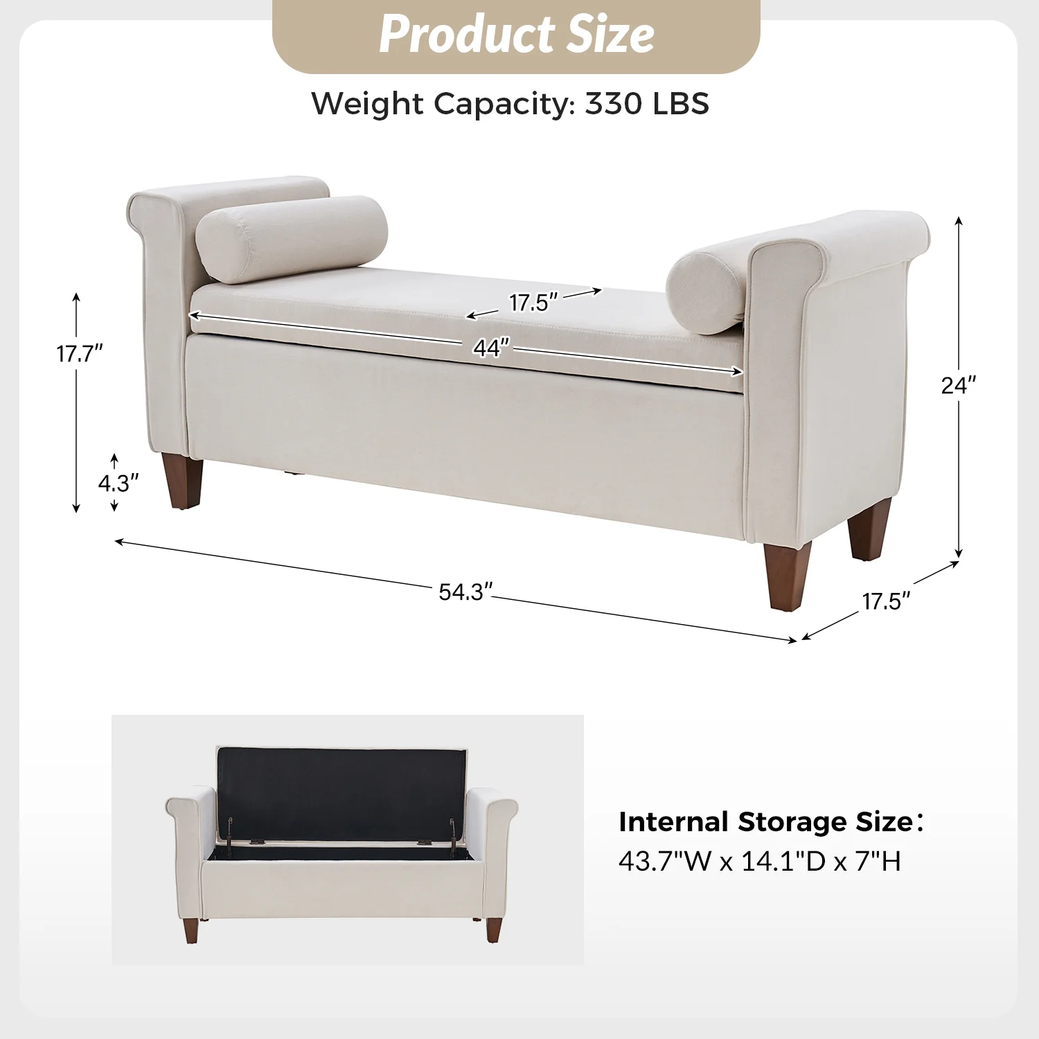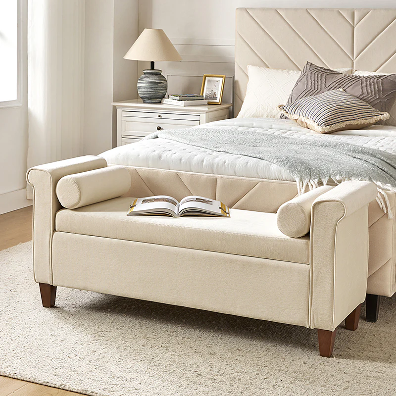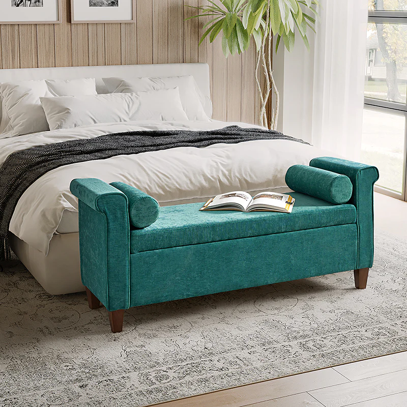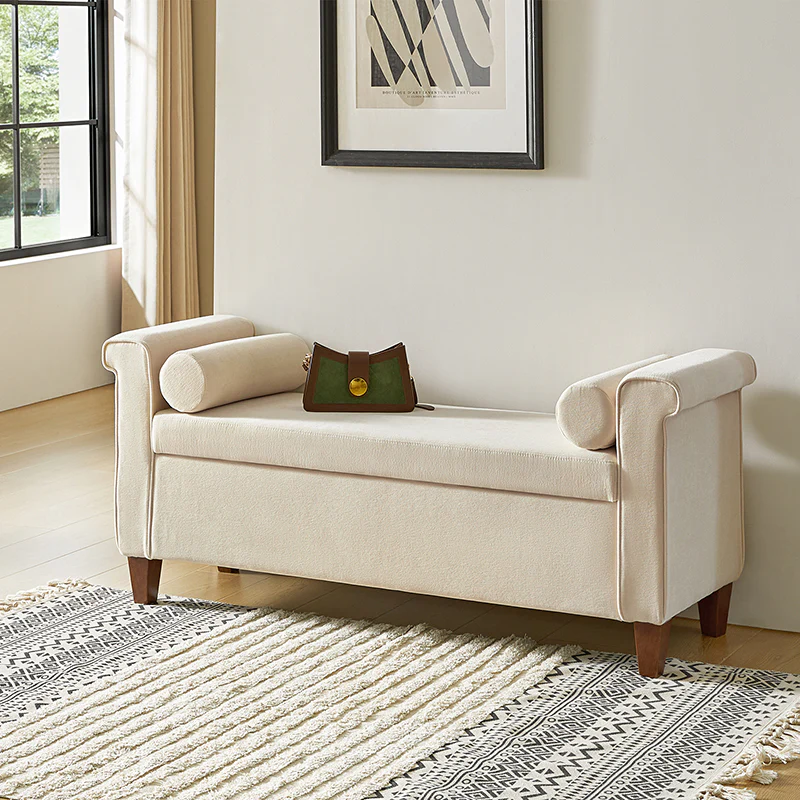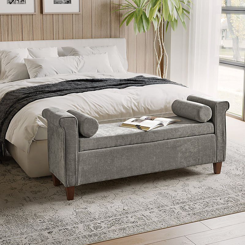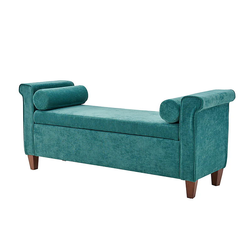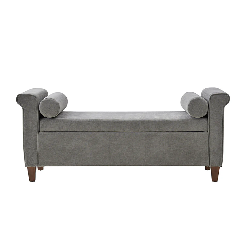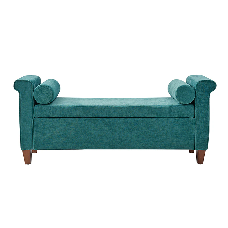 The 54-inch wide storage bench boasts a traditional allure, adorned with a charming armrest in a lovely shade, ensuring it effortlessly complements any decor. The bench not only exudes style but also offers ample storage space within its well-crafted frame. This traditional style bench comes complete with two round pillows, enhancing both comfort and visual appeal. Its versatility knows no bounds, making it a perfect addition to your living room, bedroom, or entryway. Crafted with durability in mind, the bench stands firmly on solid wood legs, adding a touch of sturdiness to its classic charm. Elevate your home with this storage bench that transcends mere functionality, embodying the perfect blend of traditional elegance and contemporary convenience.