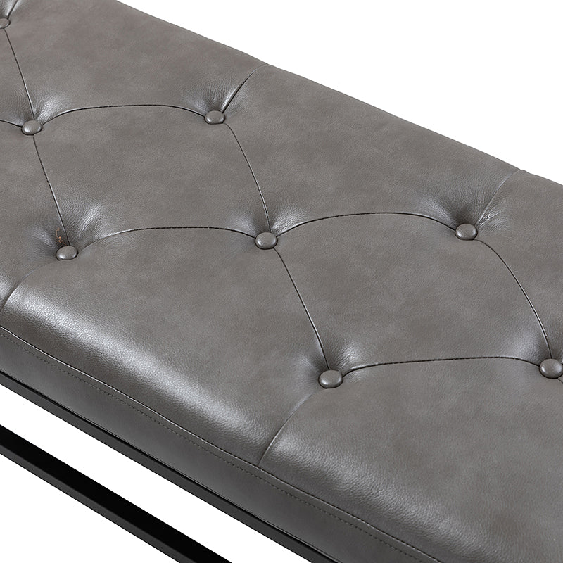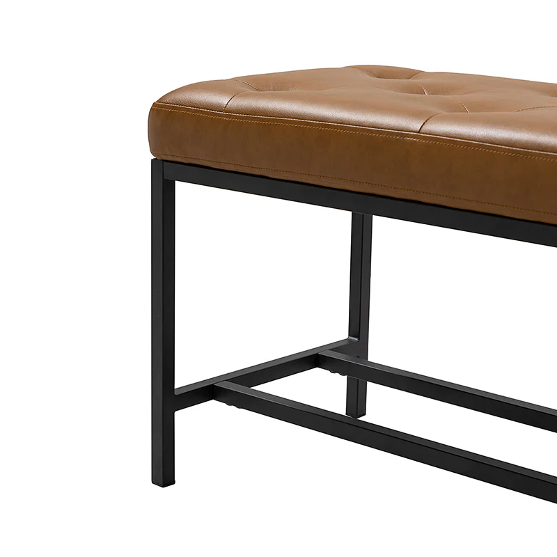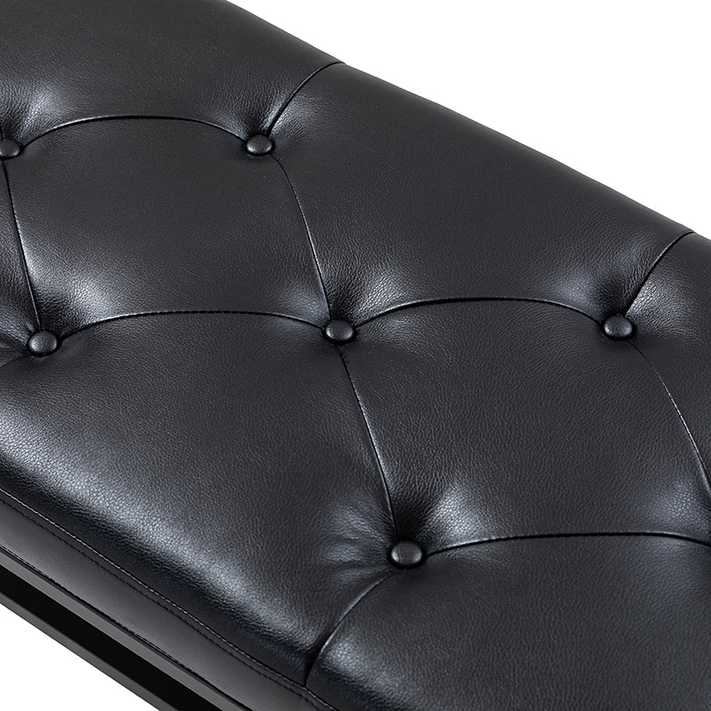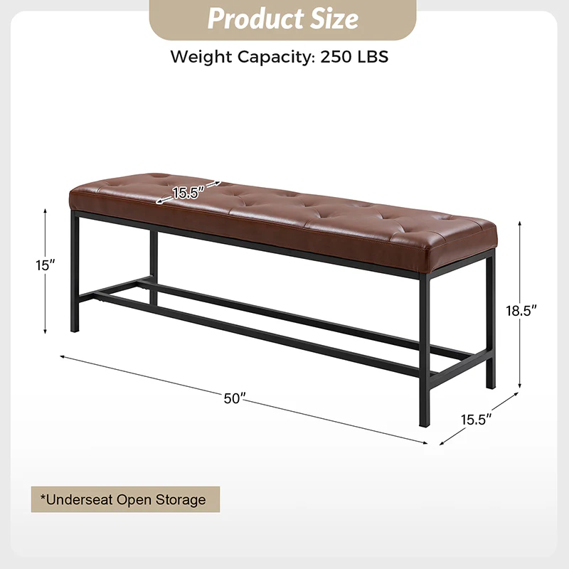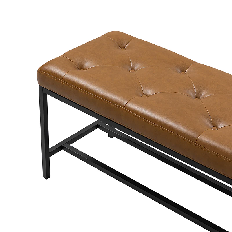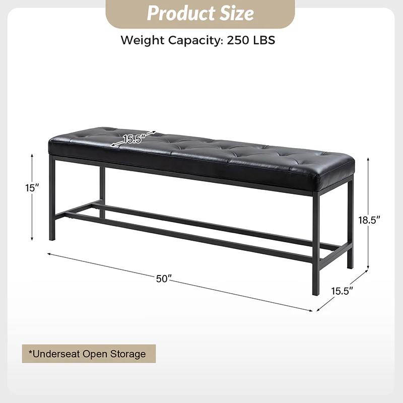 Presenting the epitome of elegance, behold this exquisite bench that flawlessly combines the finest elements of industrial, contemporary, transitional, vintage, and modern styles. Crafted with meticulous precision, its vegan leather upholstery showcases its timeless beauty and ensures effortless cleaning. With its versatile placement options, this bench becomes a dining companion, an end-of-bed luxury, a comfy footrest, or even a makeshift coffee table, adapting effortlessly to your ever-changing needs. The inclusion of a storage shelf adds practicality to its charm, while the button-tufted accents elevate its sophistication. Embrace the ease of maintenance and revel in its multifunctional design, as this remarkable bench enhances your home with its aesthetics and functionality.