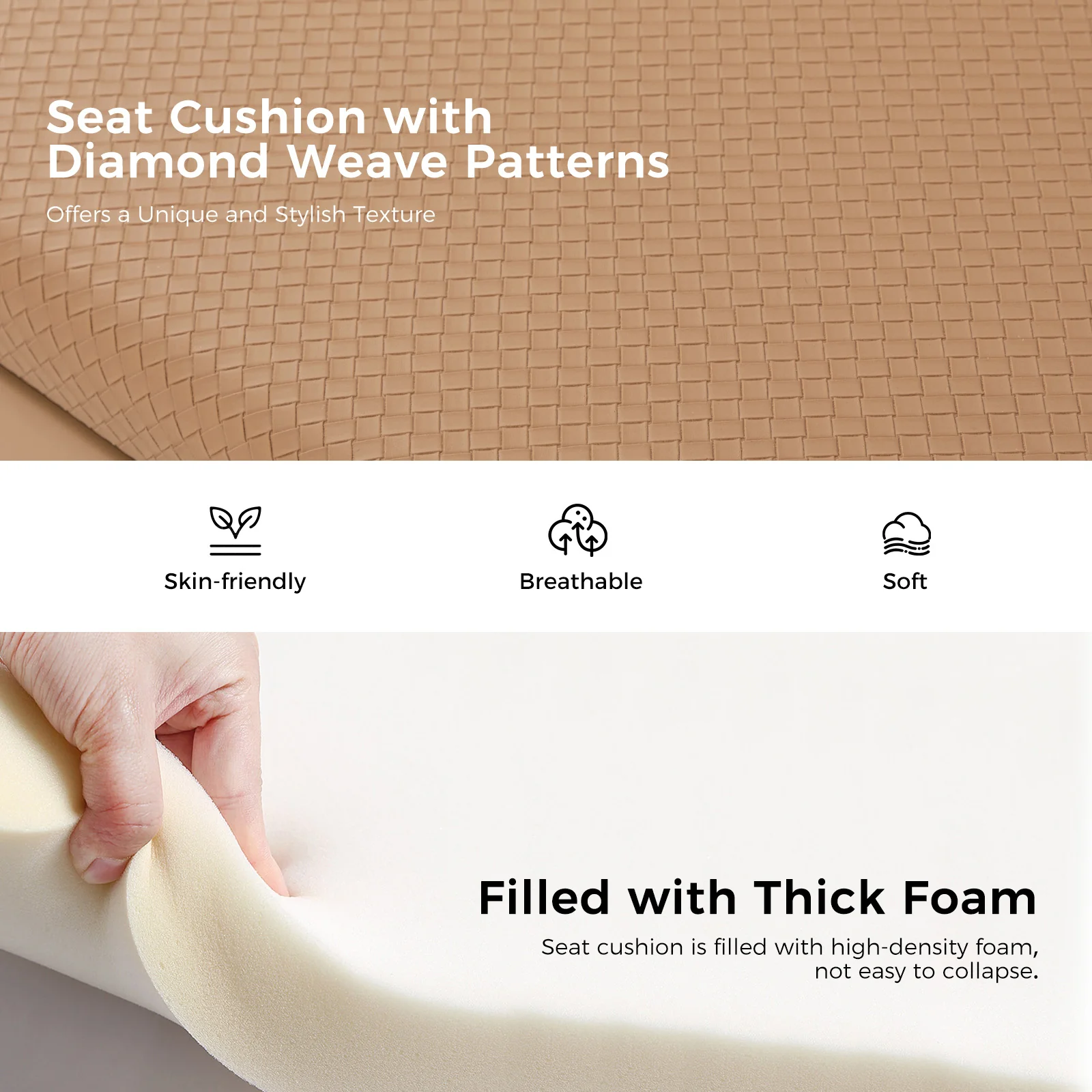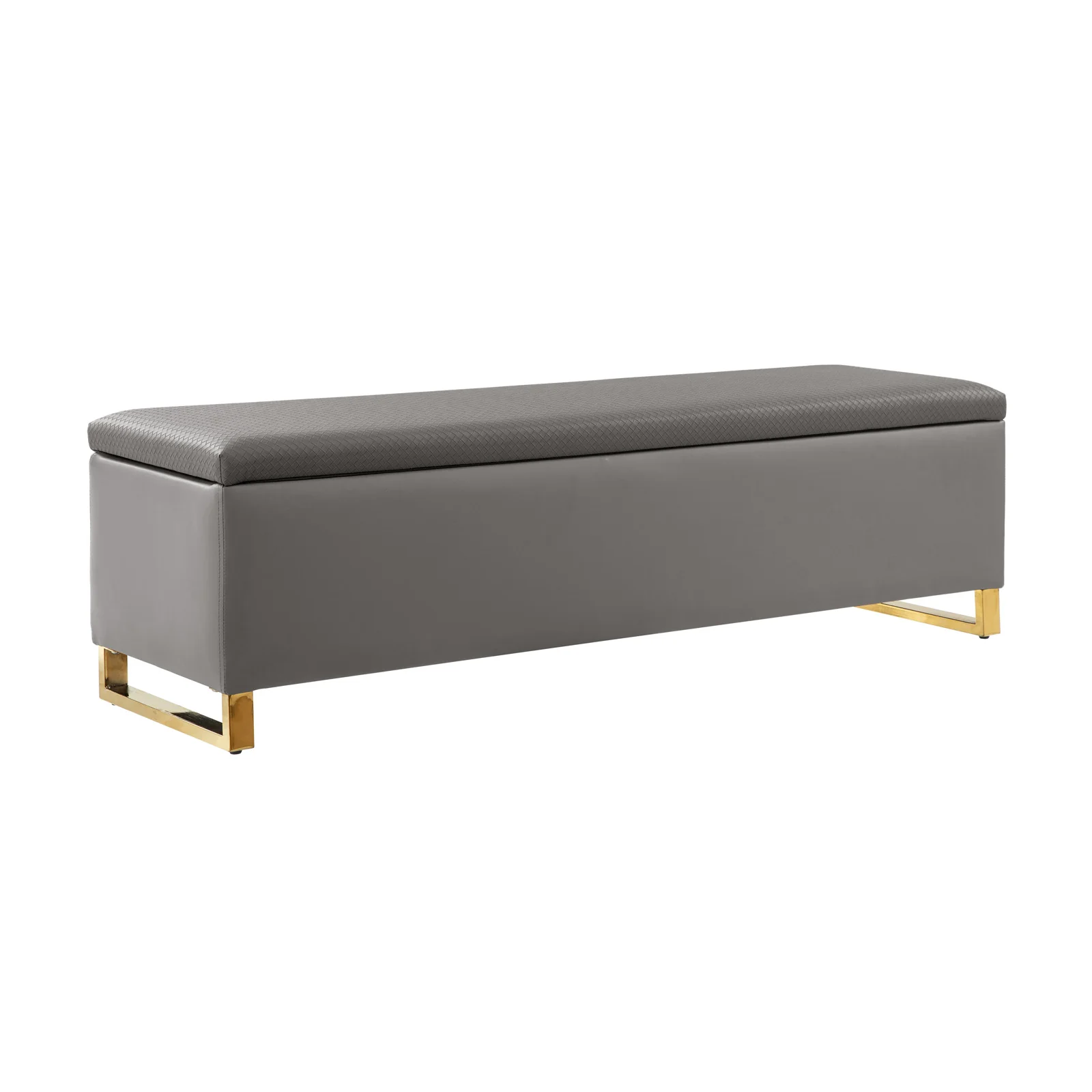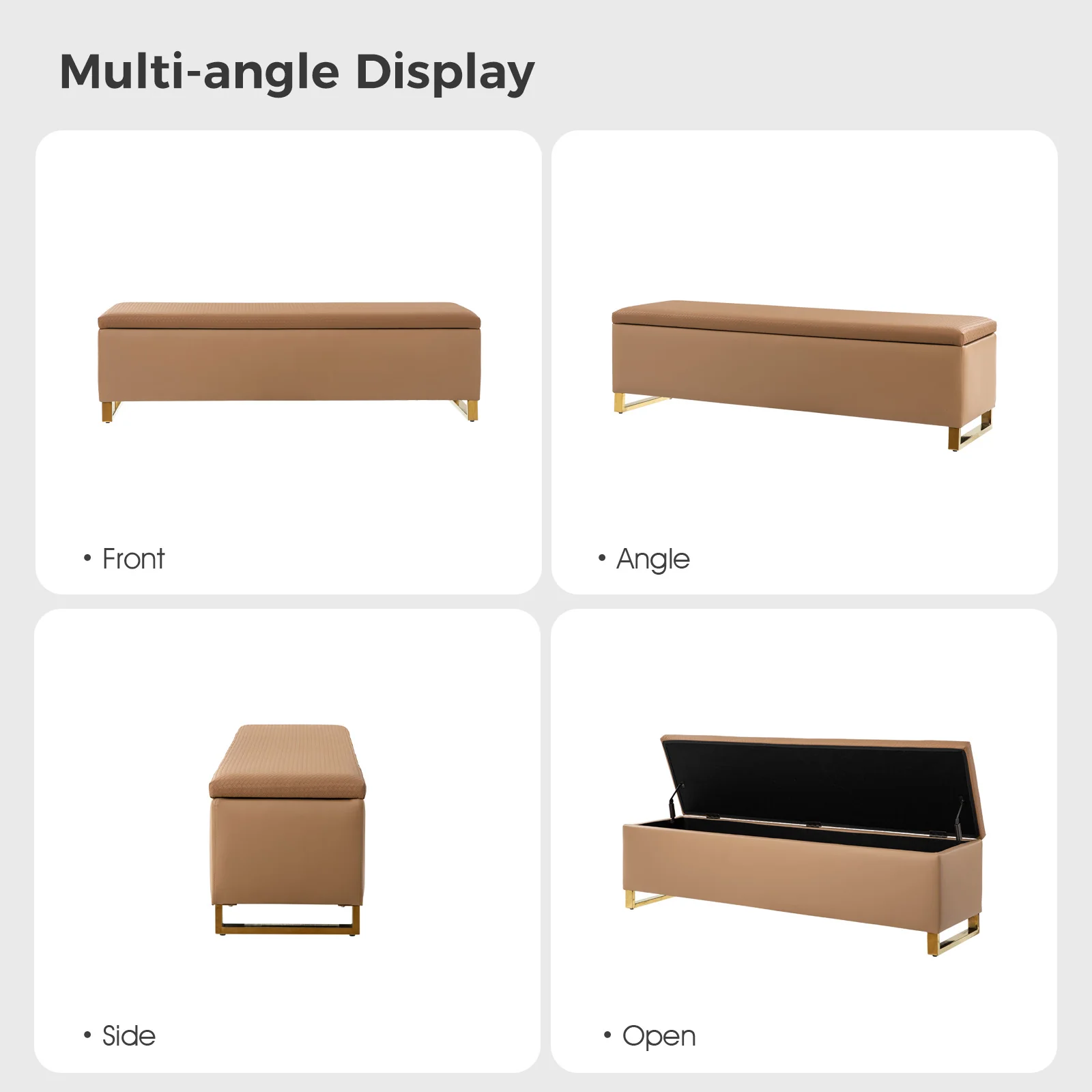 This elegant storage bench combines functionality with style, making it an addition to your room. The bench features a spacious compartment beneath the seat, suitable for storing blankets, pillows, or other household items, helping you keep your space tidy and organized. Included are two small ottomans, conveniently tucked away when not in use, and are perfect for additional seating or as footrests. The bench stands on sturdy stainless steel electroplated legs, adding a touch of modern sophistication and ensuring durability. The seat cushion is crafted with a diamond weave pattern, offering a unique and stylish texture. Its rectangular shape provides ample seating space, while the comfortable padding ensures a pleasant sitting experience. Whether placed in a living room, bedroom, or hallway, this storage bench enhances the decor and adds practical storage and seating solutions to your living space.