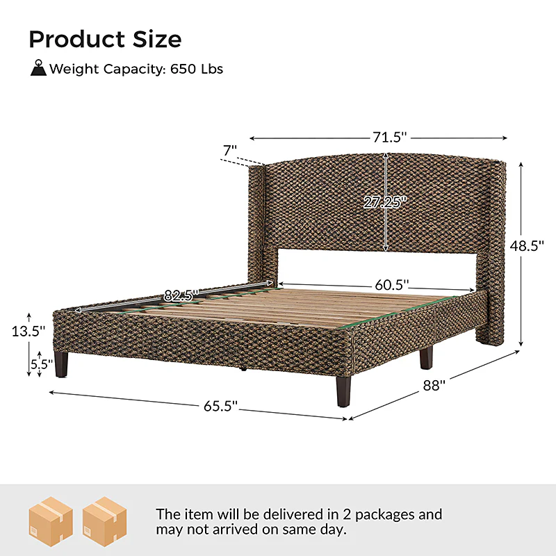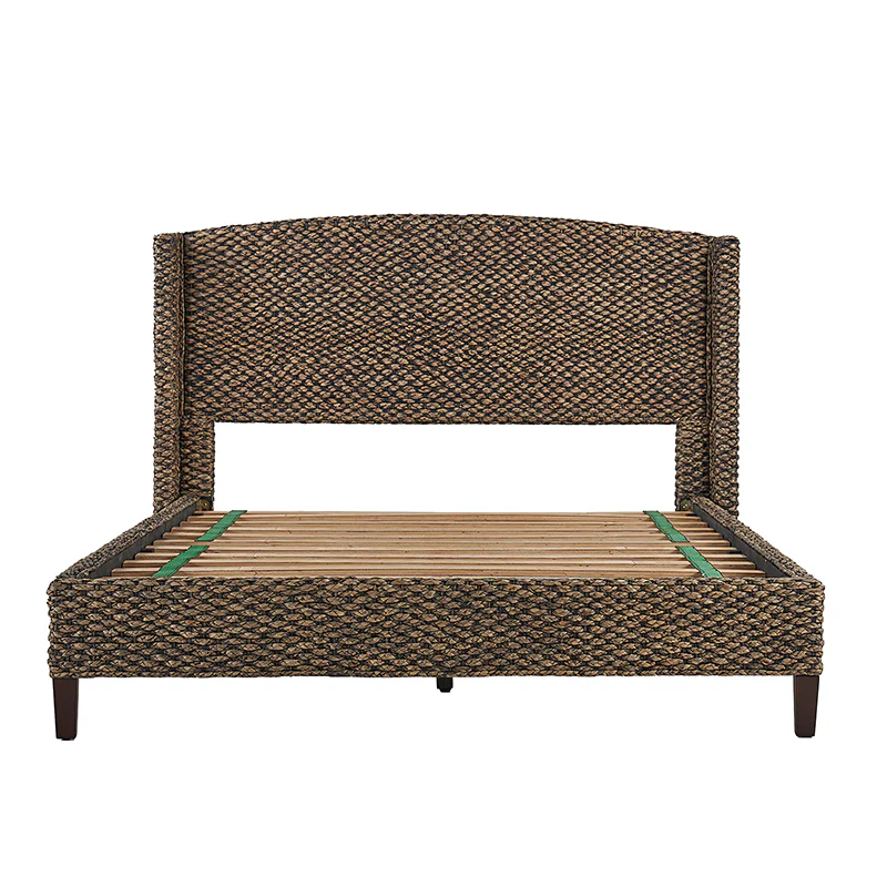 Introducing a captivating bed that exudes coastal charm and beach house style. The camber panel headboard of the bed is adorned with a braided design, evoking a rugged yet alluring feel. Its wingback design adds a touch of elegance and complements coastal and rustic decor seamlessly. Crafted with natural materials like woven grass rope, this bed effortlessly combines farmhouse, traditional, coastal, sea house, beach house, tropical, rustic, lodge, and French Country aesthetics. With its versatile appeal and timeless allure, this bed becomes a statement piece in any bedroom, inviting you to relax and unwind in a serene coastal ambiance.