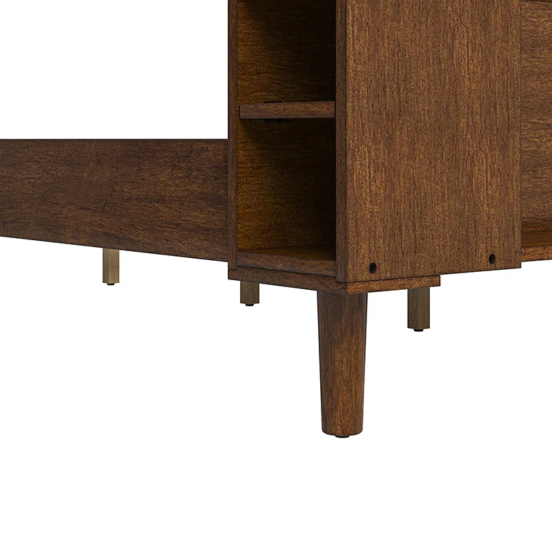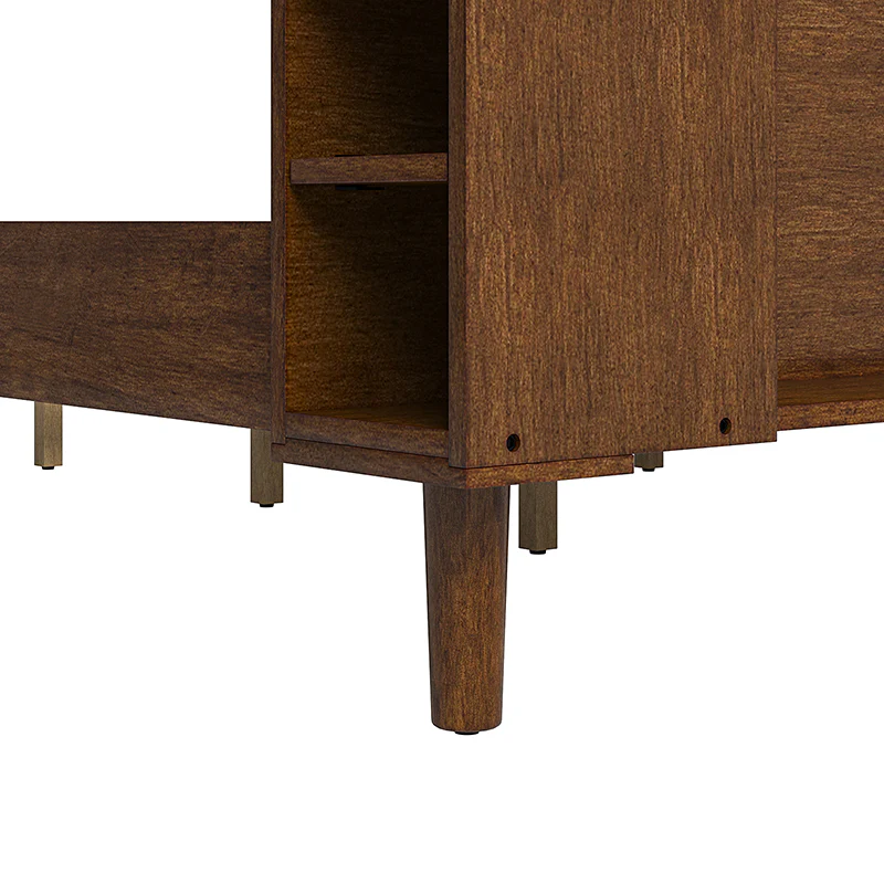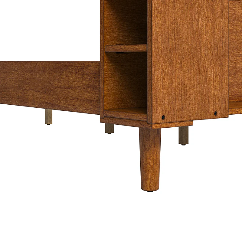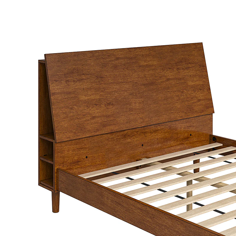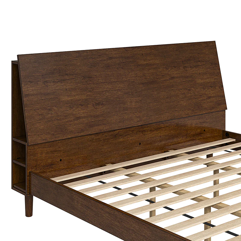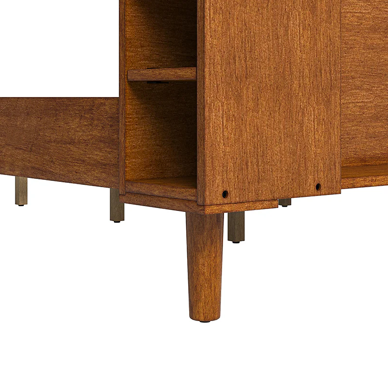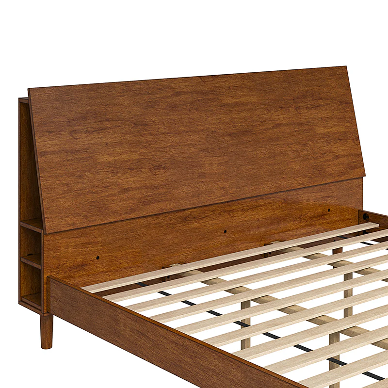 Experience the timeless charm of a bed with mid-century modern aesthetics. The bed features a 2-tier storage headboard with storage shelves on both sides, perfect for housing small items like books and art catalogs. This spacious 2-tier storage headboard equals nightstands. Enhancing functionality includes a power socket for convenient use of a bedside lamp or charging devices like the iPad and smartphone while in bed. The inclined headboard provides ergonomic support, allowing for comfortable reading or relaxation. The adjustable feet ensure stability, and the bed is crafted from MDF for durability. Enjoy a tranquil sleeping environment with a noise-free design, making this bed a stylish and practical choice for a sophisticated bedroom.