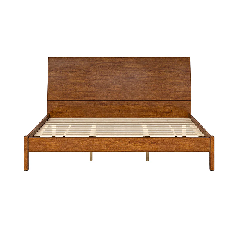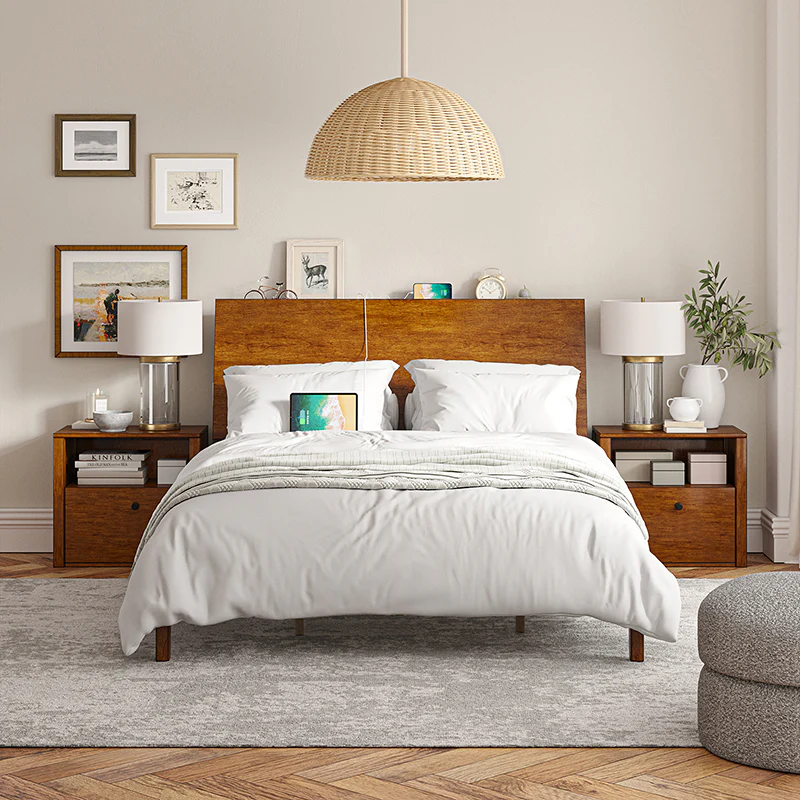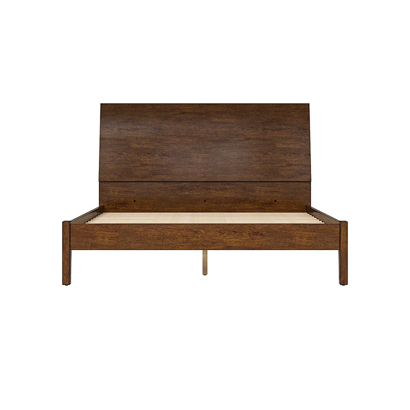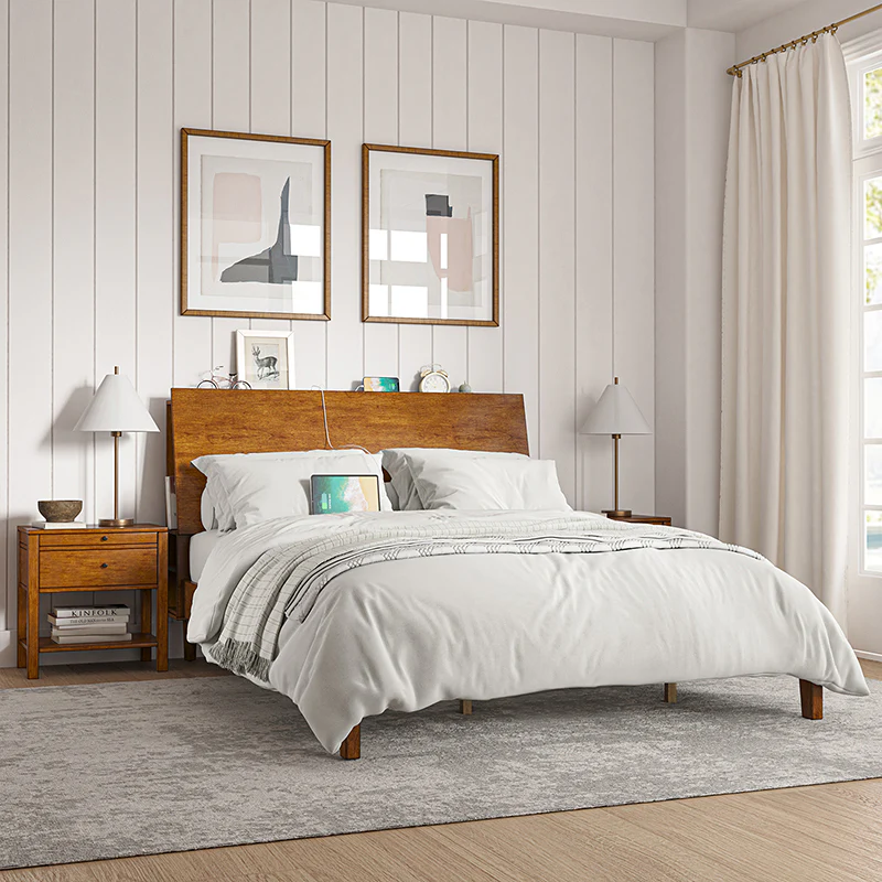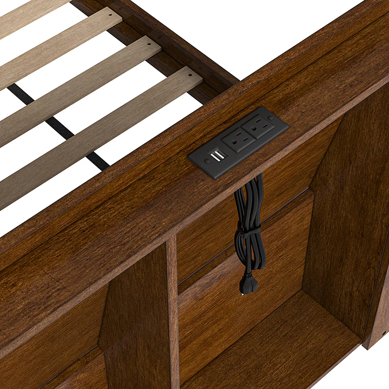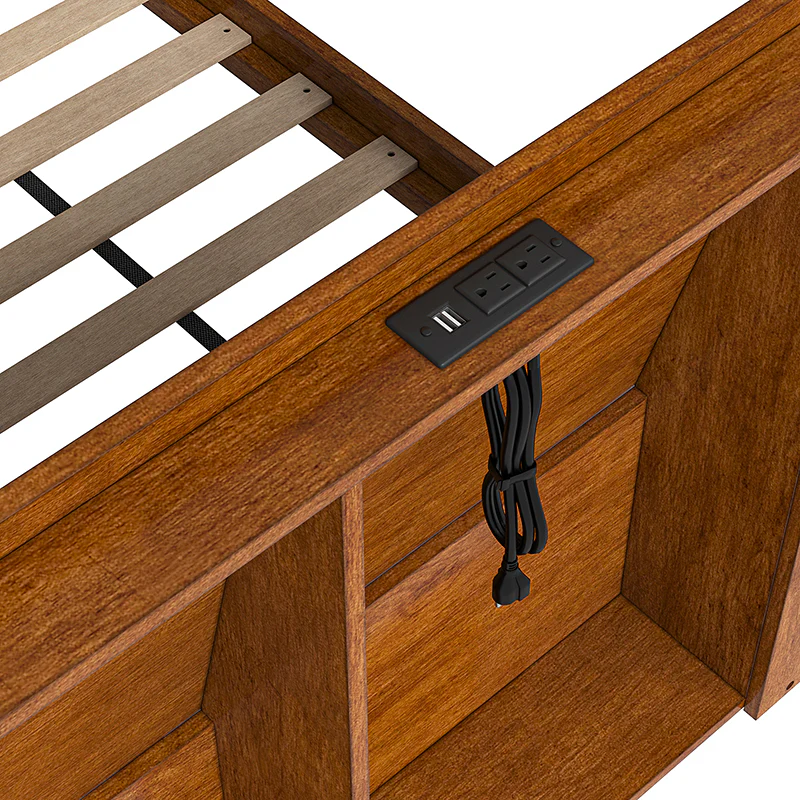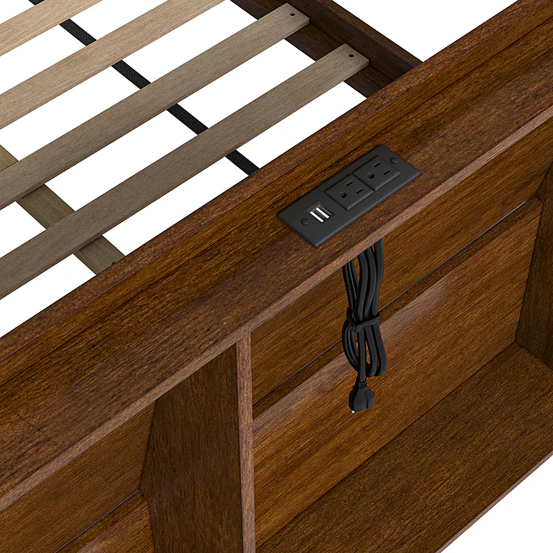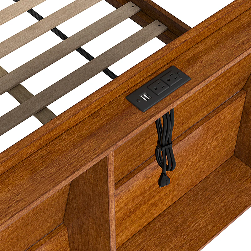 Experience the timeless charm of a bed with mid-century modern aesthetics. The bed features a 2-tier storage headboard with storage shelves on both sides, perfect for housing small items like books and art catalogs. This spacious 2-tier storage headboard equals nightstands. Enhancing functionality includes a power socket for convenient use of a bedside lamp or charging devices like the iPad and smartphone while in bed. The inclined headboard provides ergonomic support, allowing for comfortable reading or relaxation. The adjustable feet ensure stability, and the bed is crafted from MDF for durability. Enjoy a tranquil sleeping environment with a noise-free design, making this bed a stylish and practical choice for a sophisticated bedroom.