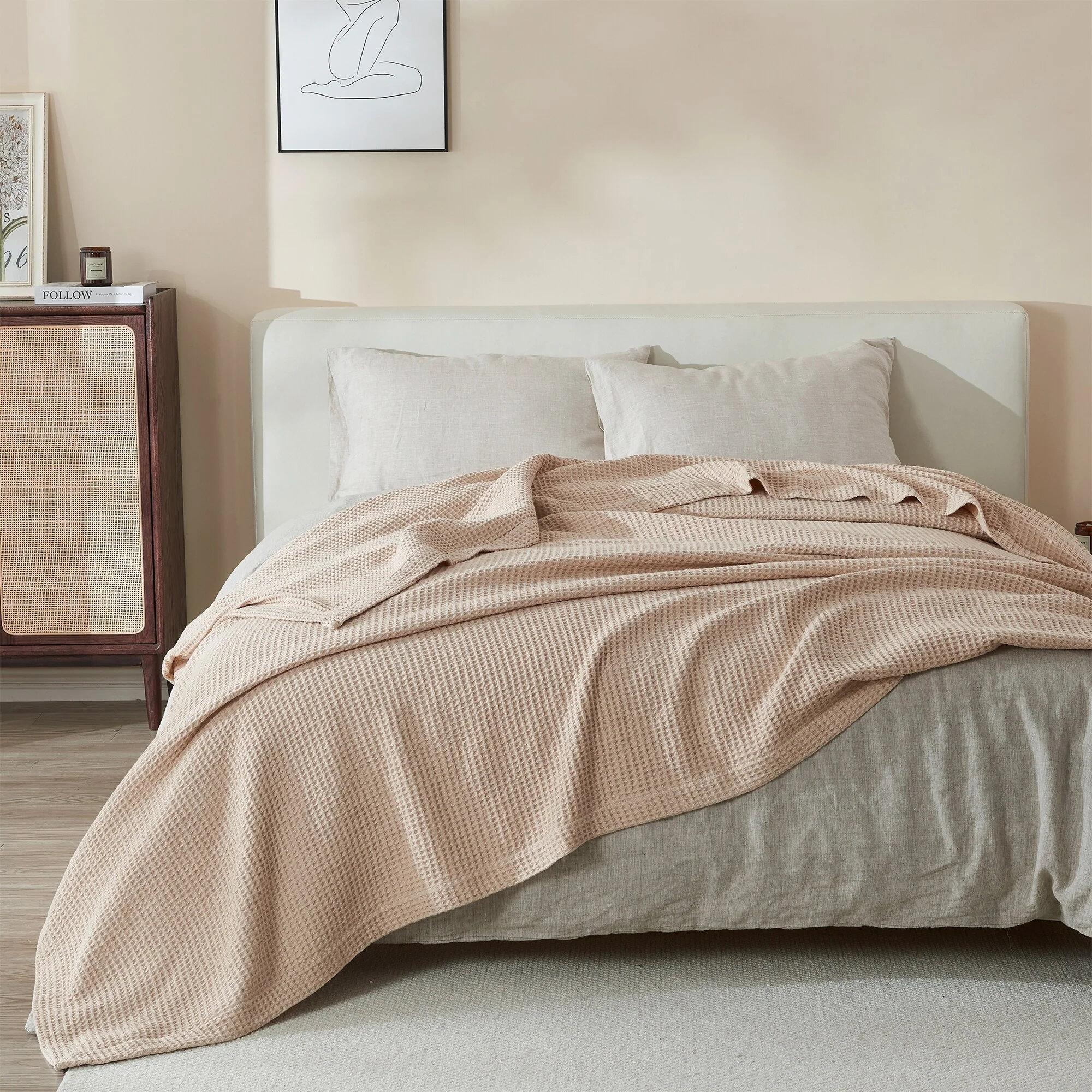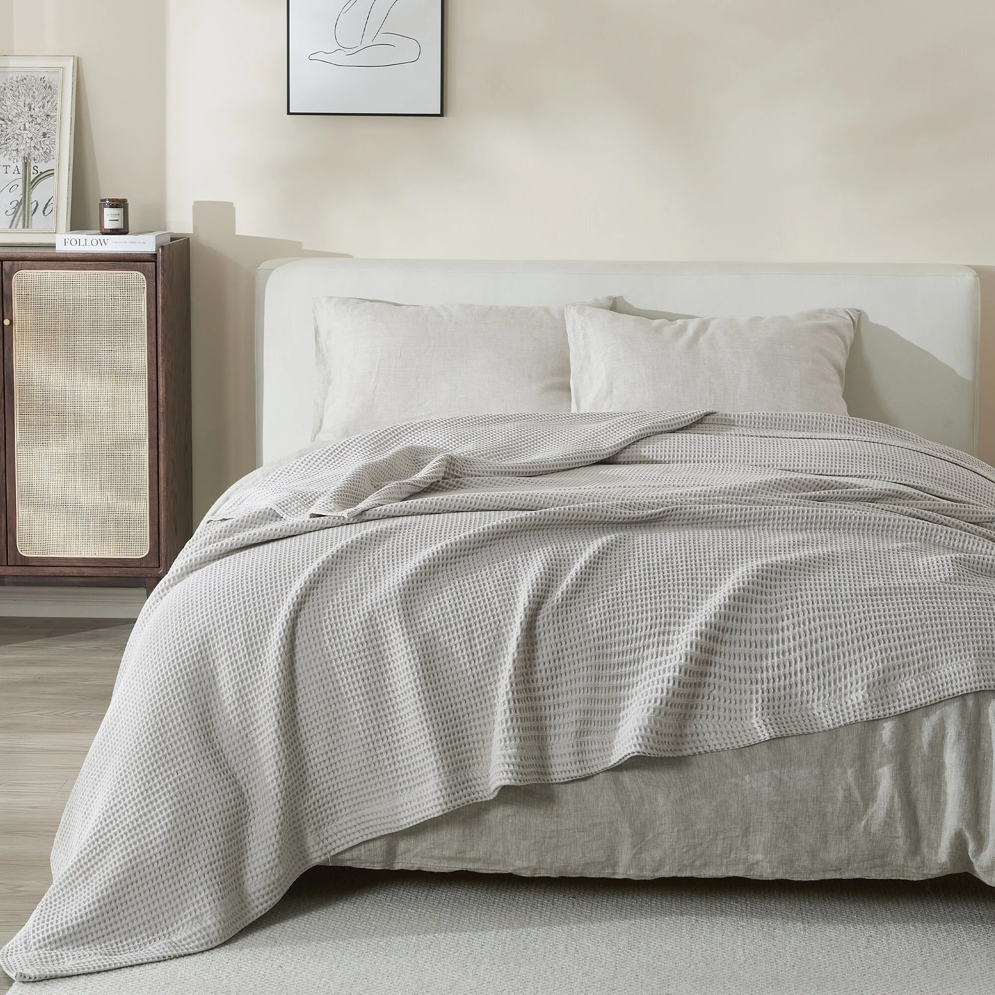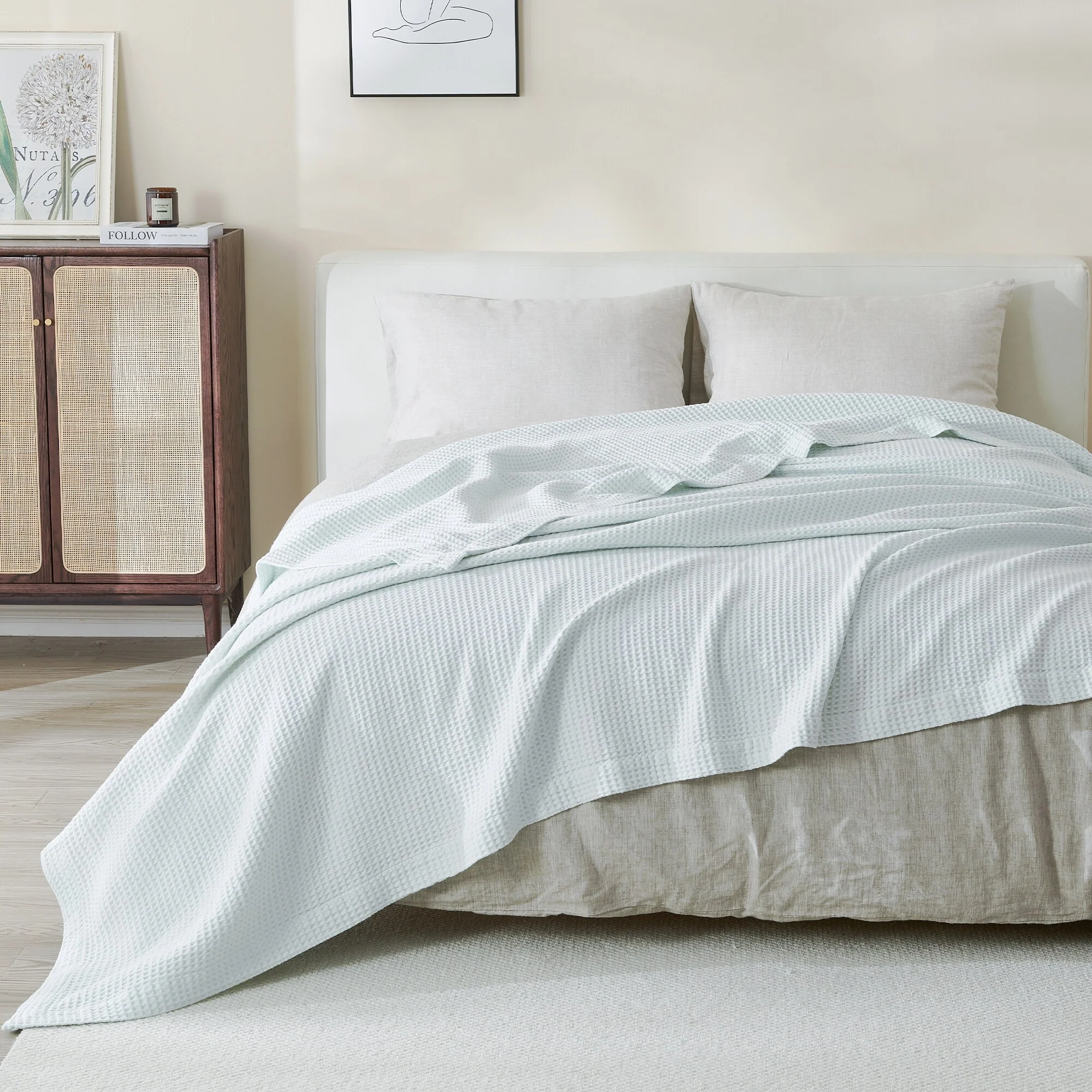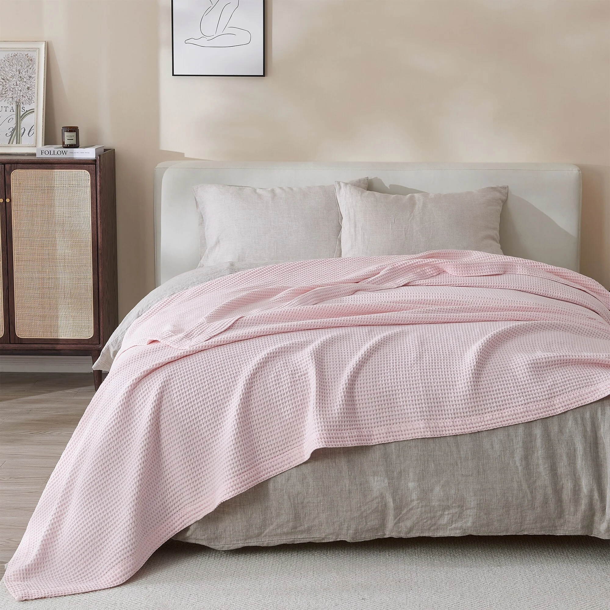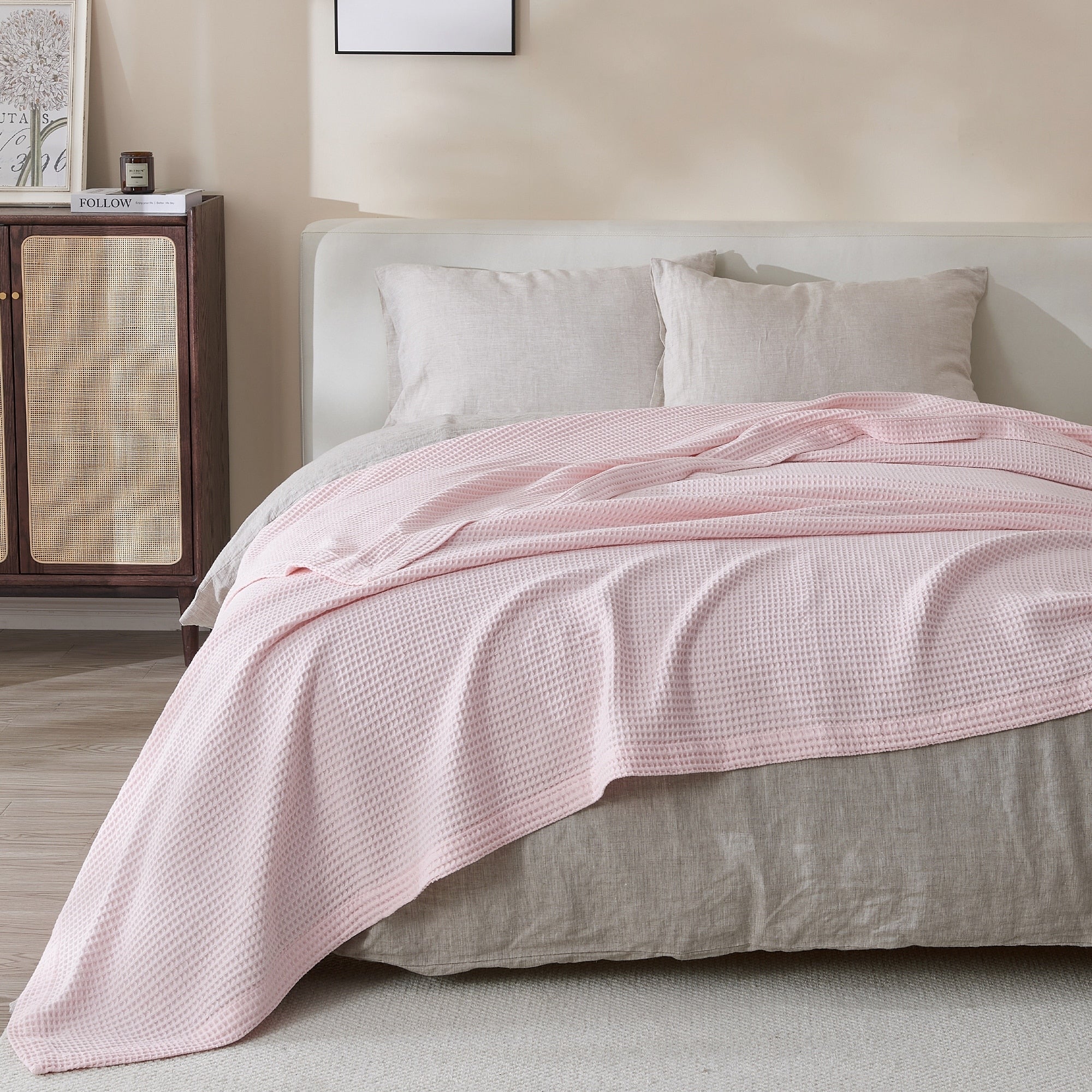 Add this blanket to your bed or couch and transform your versatile decor. This breathable waffle weave textures bed blanket is perfect for keeping you comfortable through every season. The modern color assortment will match your decor no matter the theme and will complement your style throughout every season. Use this cotton throw blanket for your couch or bed. Not only is this throw blanket versatile, but it's also easy to care for. This textured blanket is prewashed & preshrunk to enhance the cotton's softness and ensure the blanket stays the same size, even after washing.