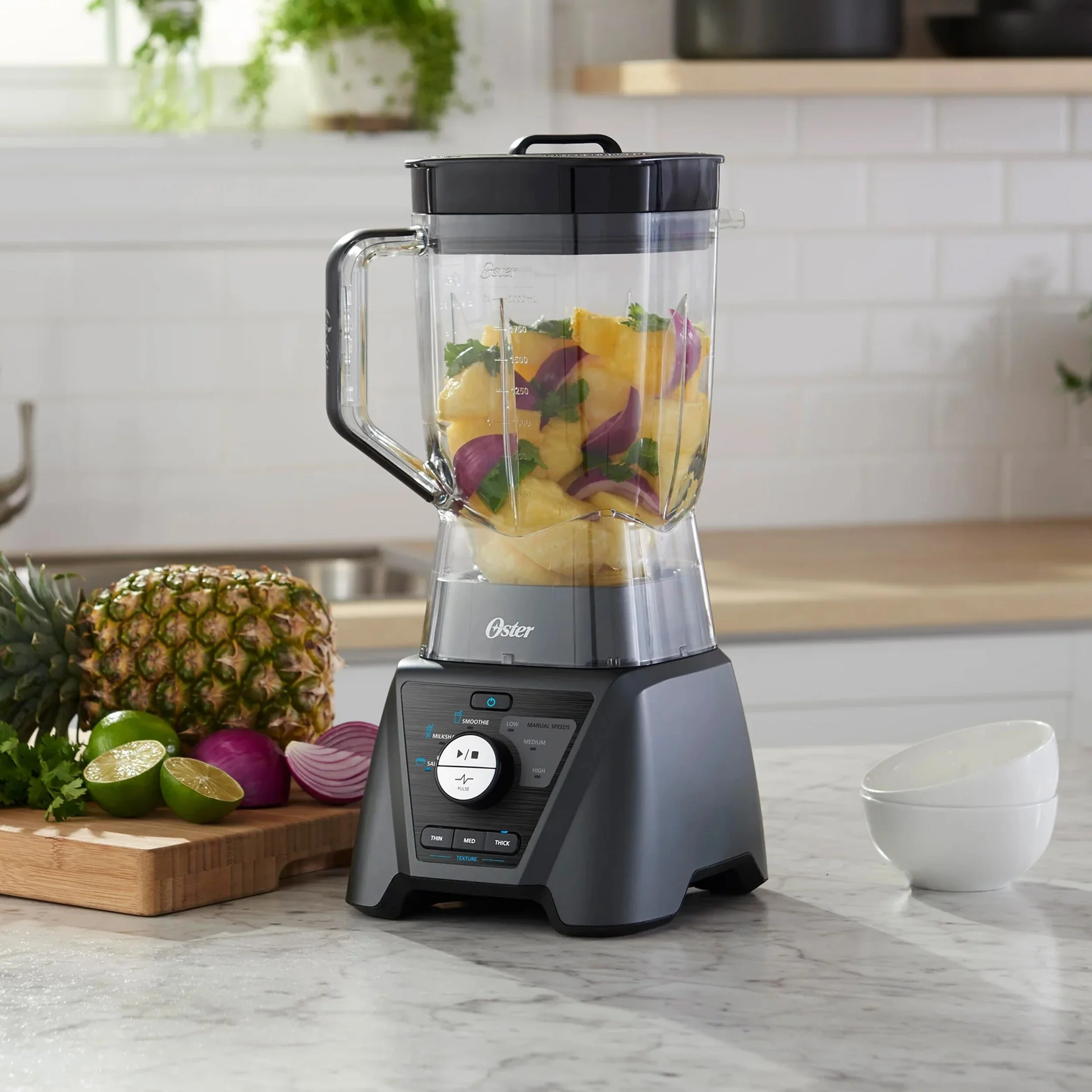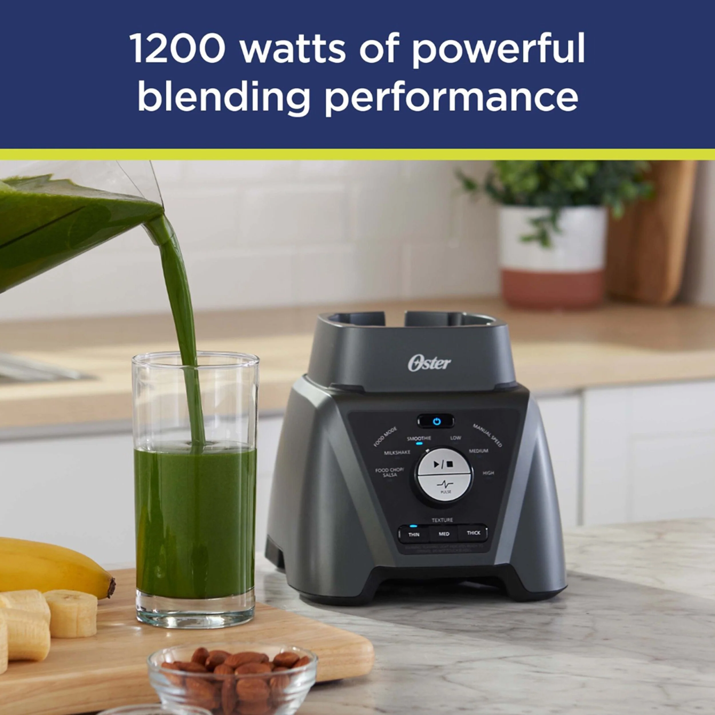The innovative Texture Select Settings of this Oster blender take the guesswork out of getting the perfect consistency from your blends. Texture Select technology lets you choose your thickness, from creamy smoothies and chunky salsa, to fine soups and juices, and everything in between. This powerful Oster blender offers 1200 peak watts of blending power, a 6-point stainless steel blade design, and Dual Direction Blade Technology. Pre-programmed settings automatically create smoothies, shakes, and salsas, and manual settings provide even more control and versatility. Item Dimensions: 14.20' x 11.40' x 10.00'Item Weight: 8.20lbs